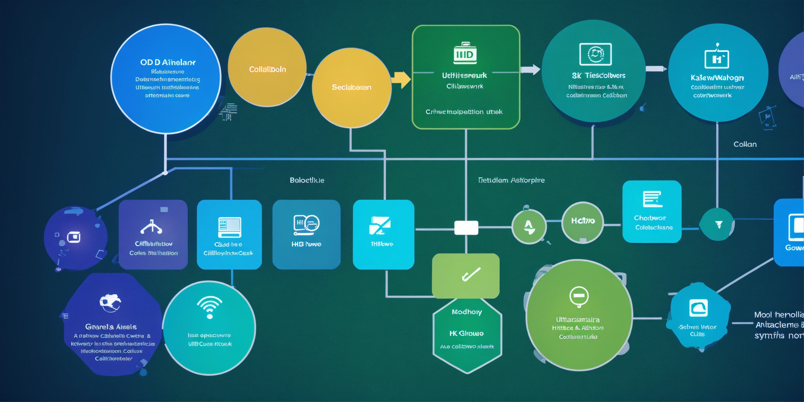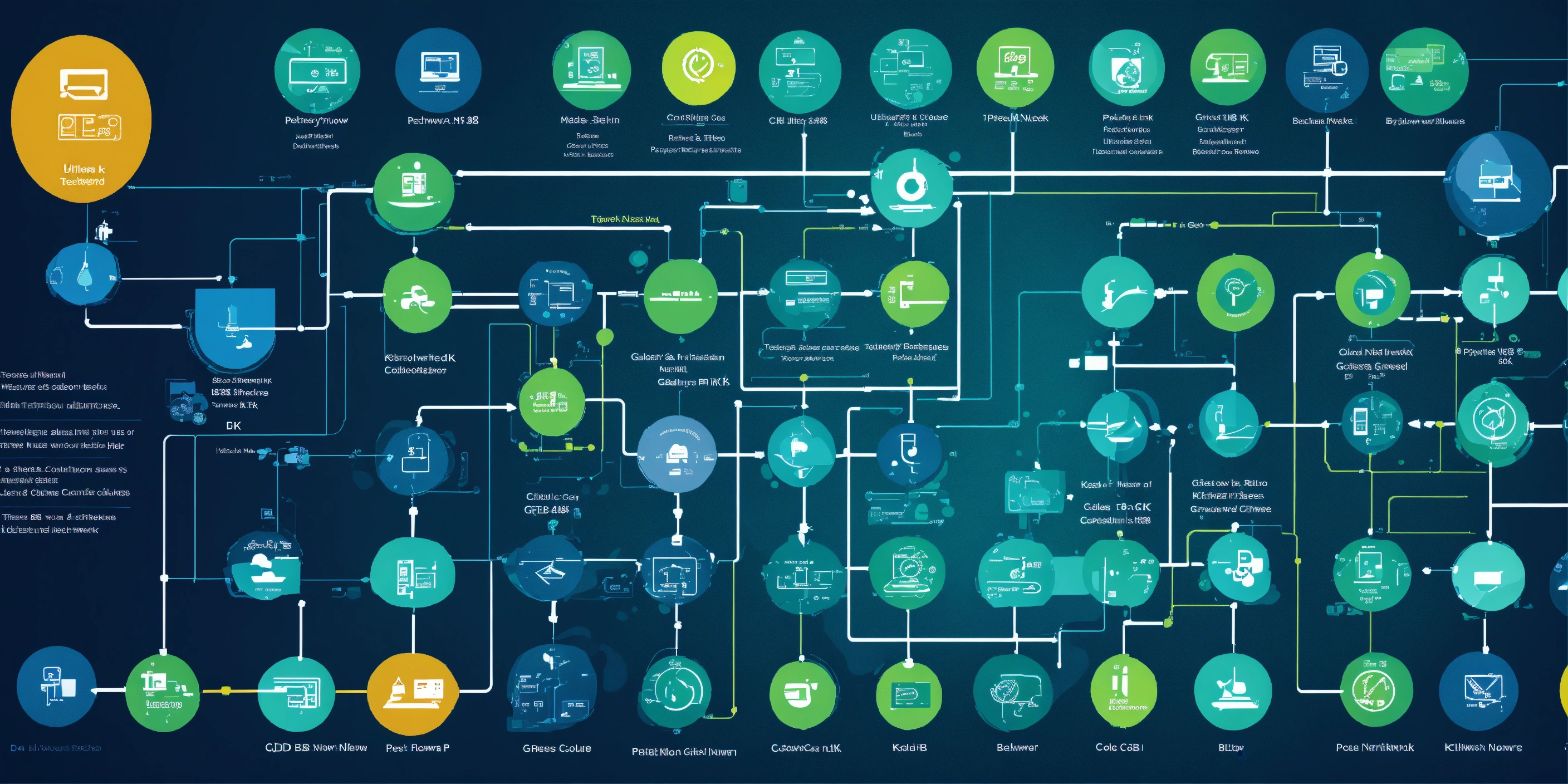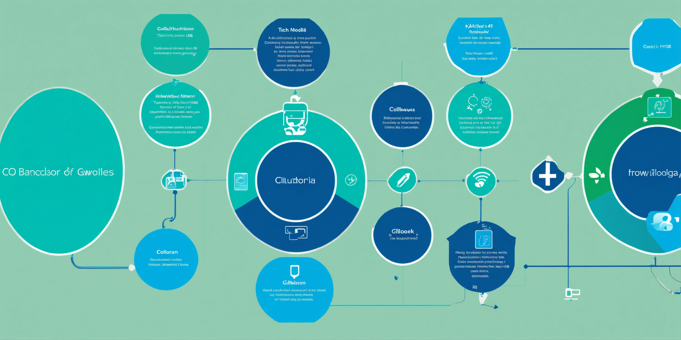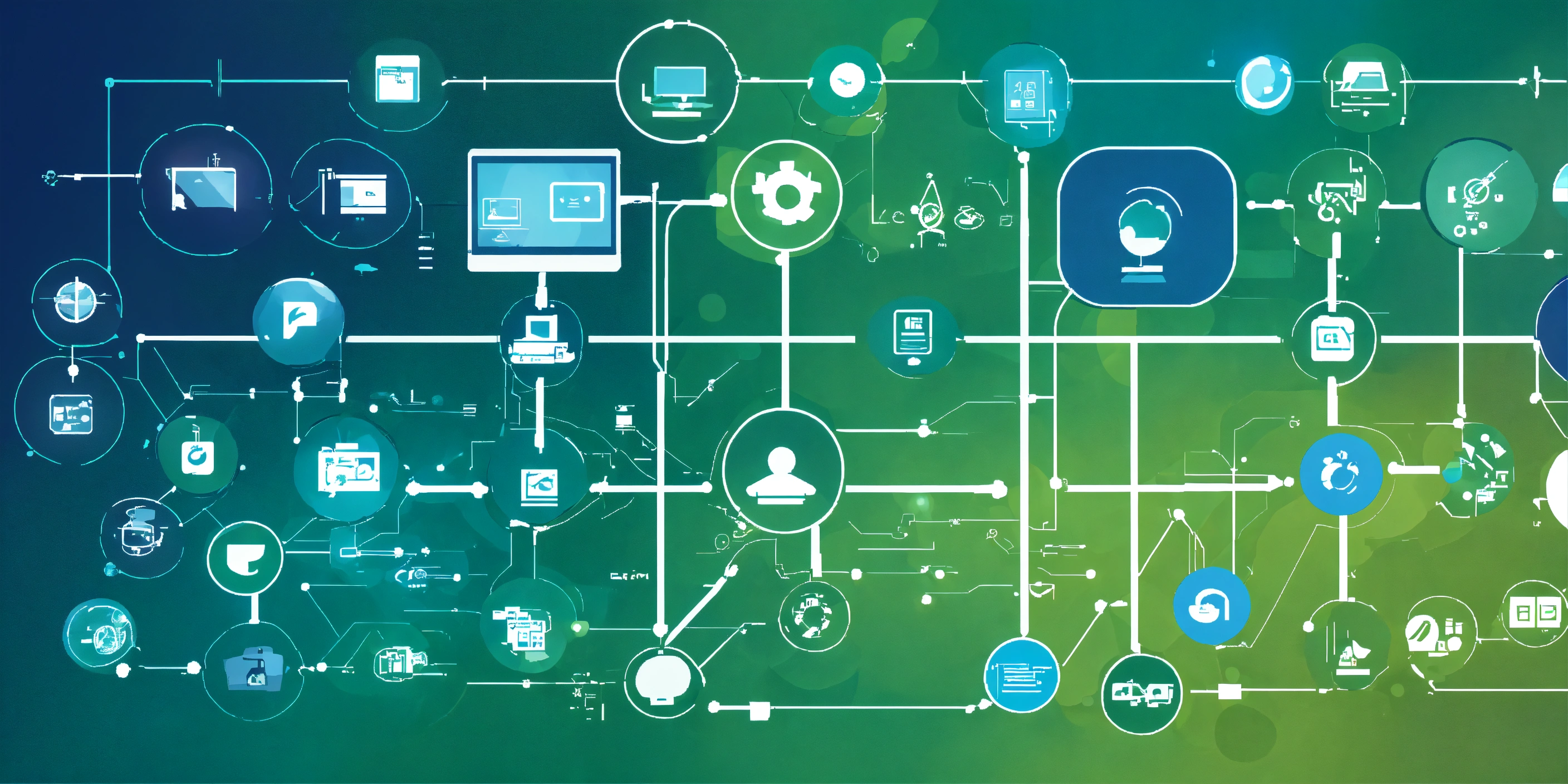 A simple flowchart of technology symbols that represents a collaboration network for use as a slide background. modern. brand colours are #024da1 and #37b884. blues and greens. ultrahd, kodak colour quality, 8k.