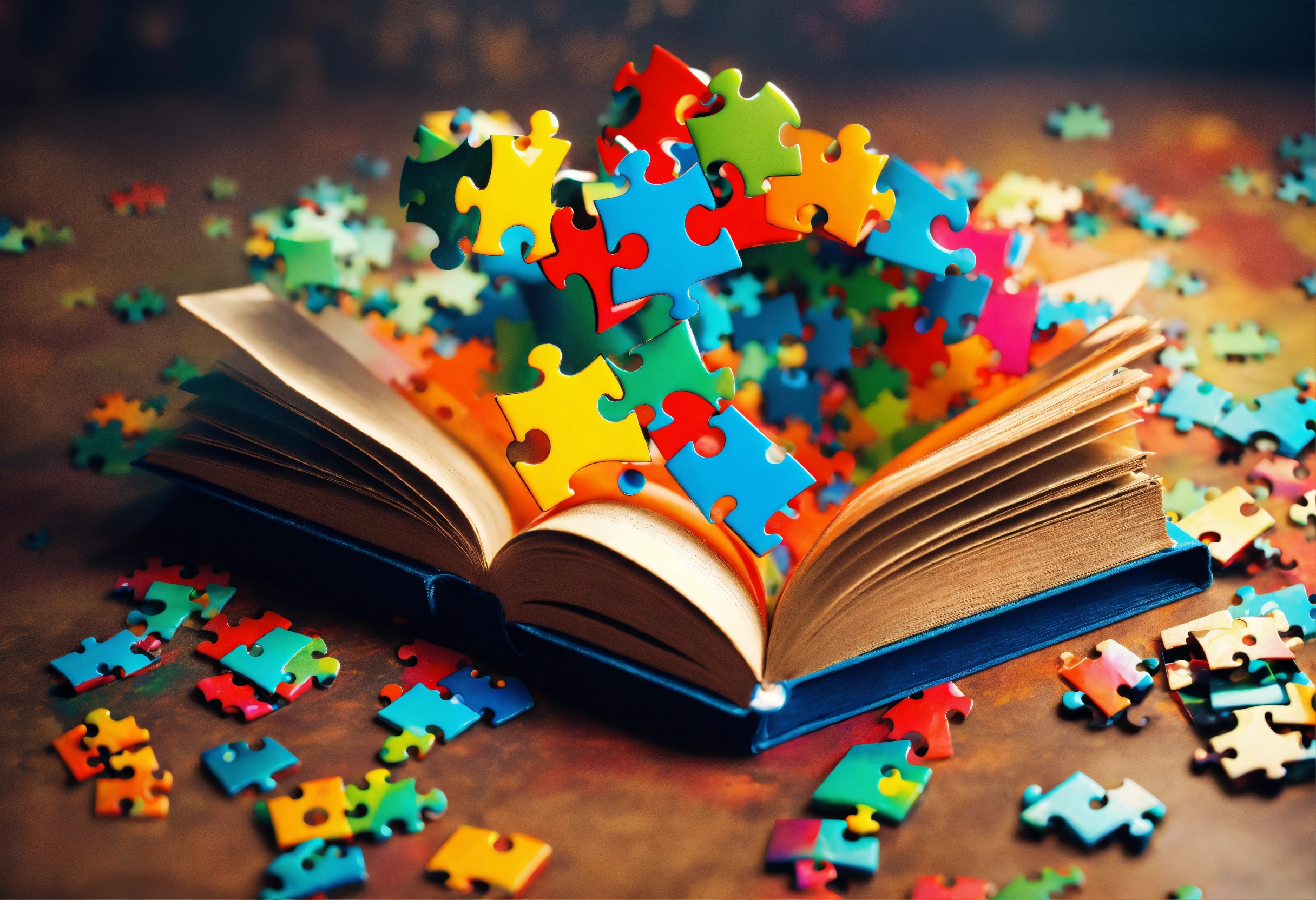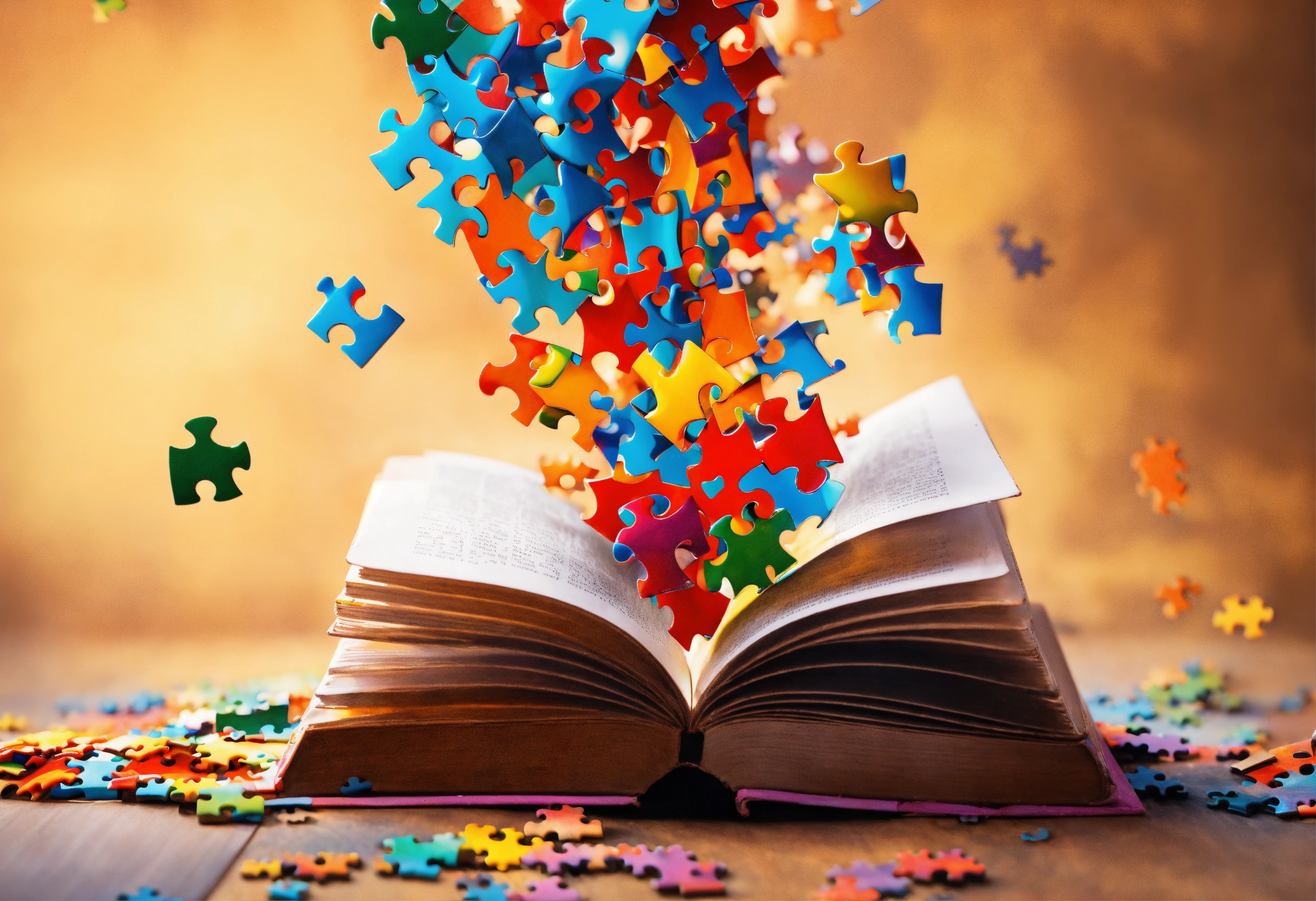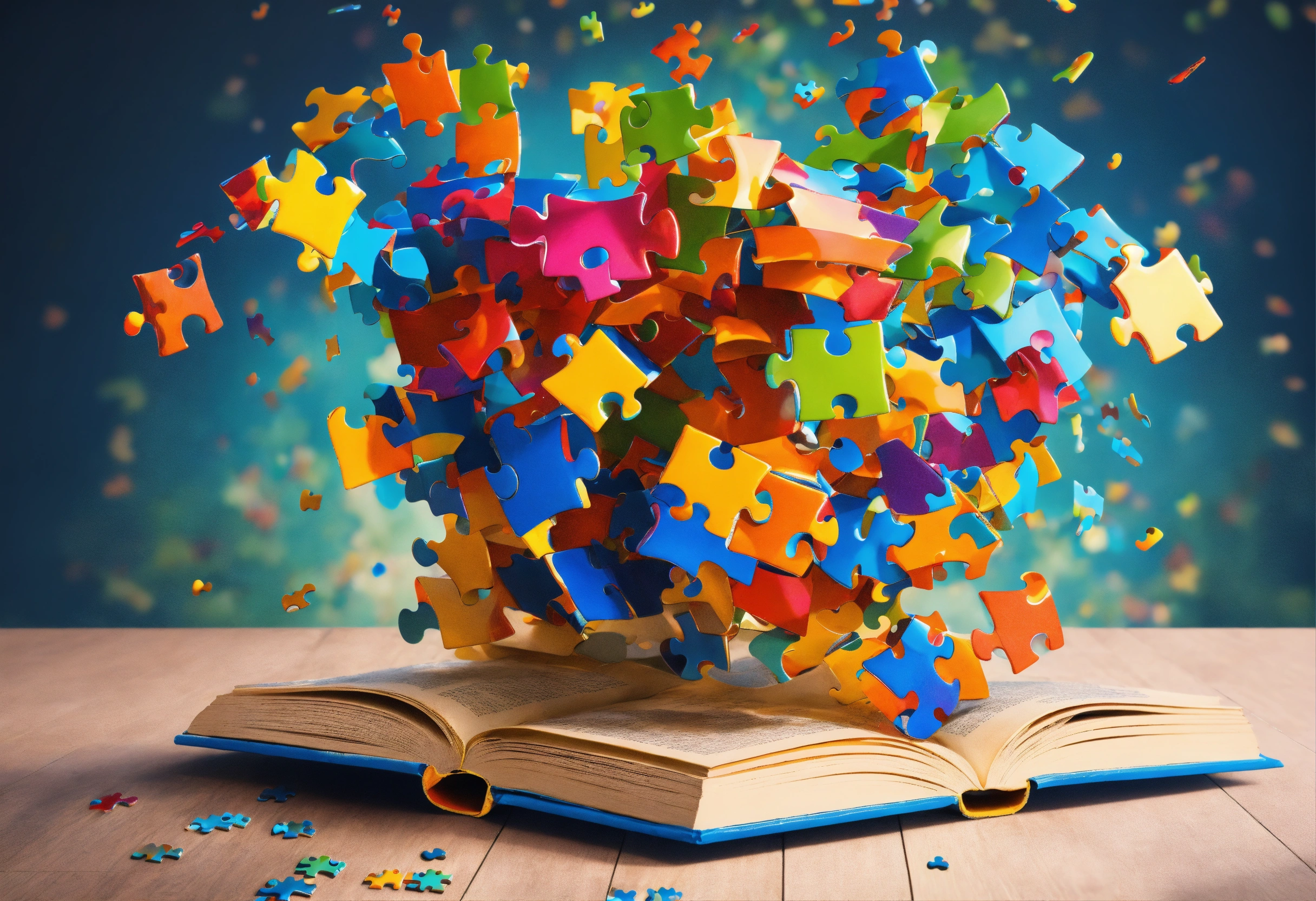 Book open fully, puzzle pieces flying out, colorful, creative, amazing art, puzzle pieces are very brilliant prime colors