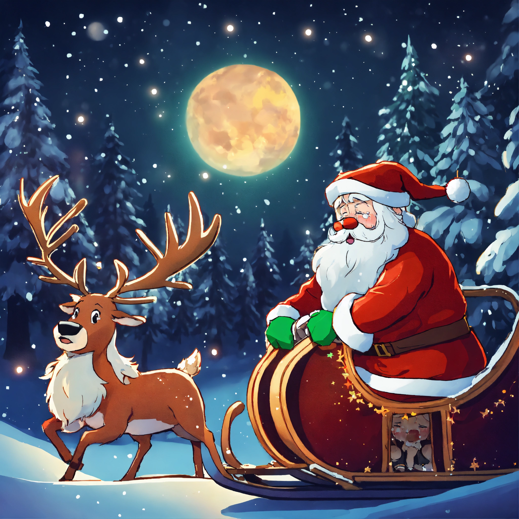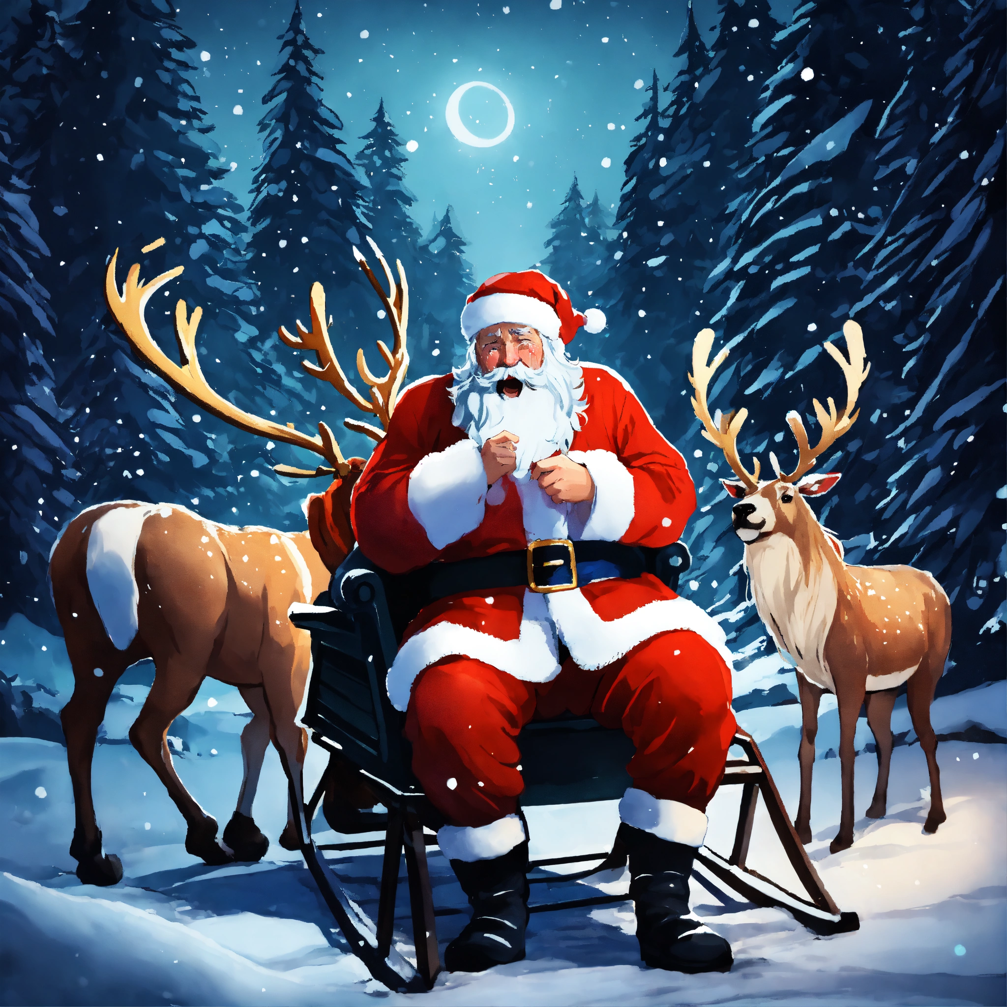 Santa claus crying in the snowy forest in the night, in front of his sleigh full of gifts, and his reindeer sick
