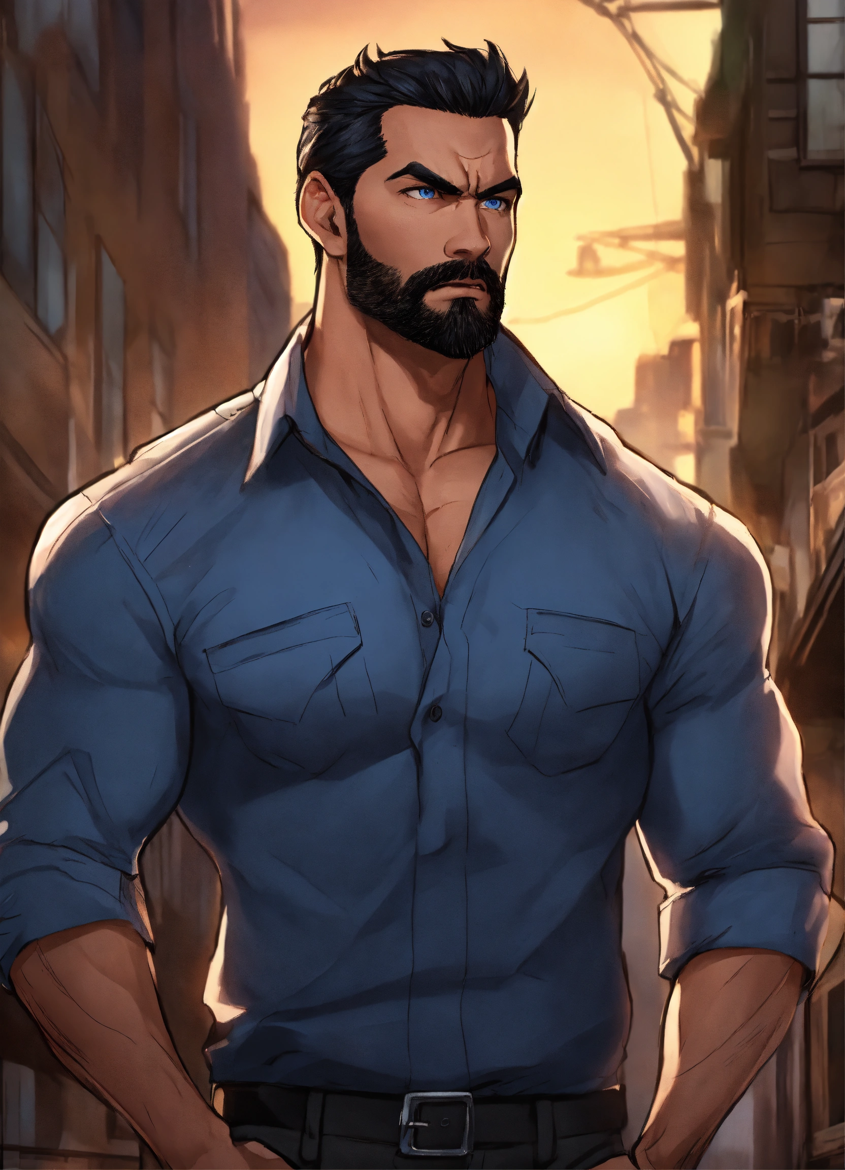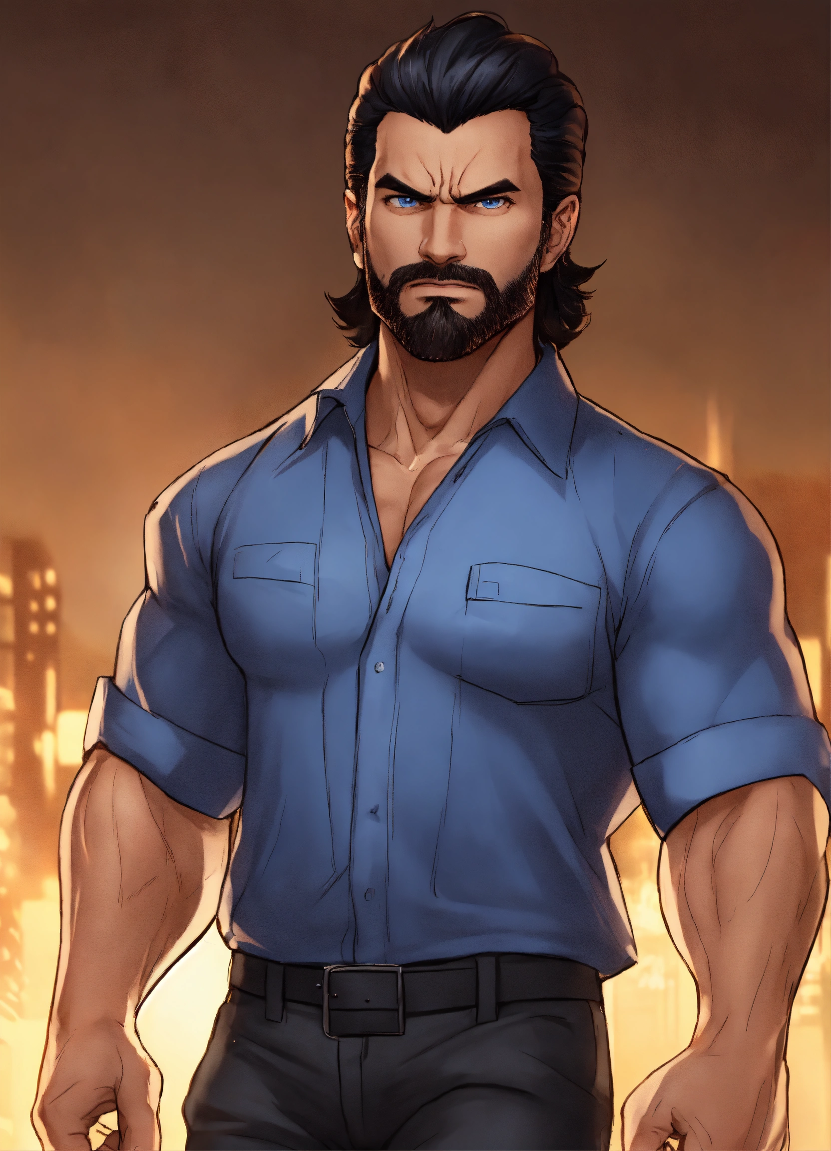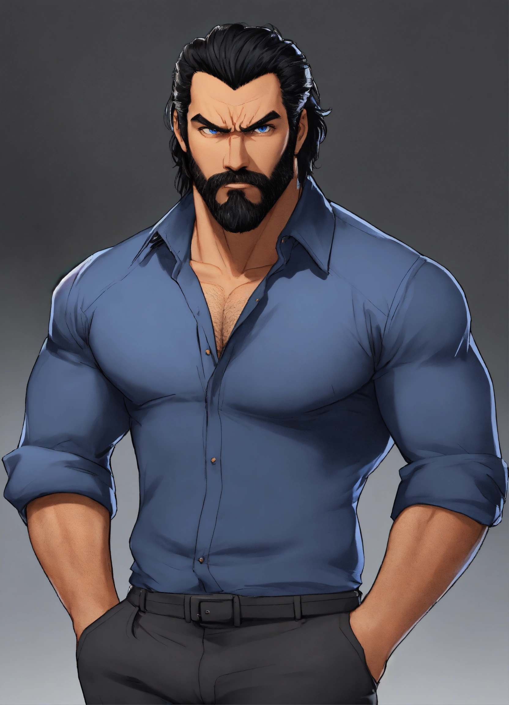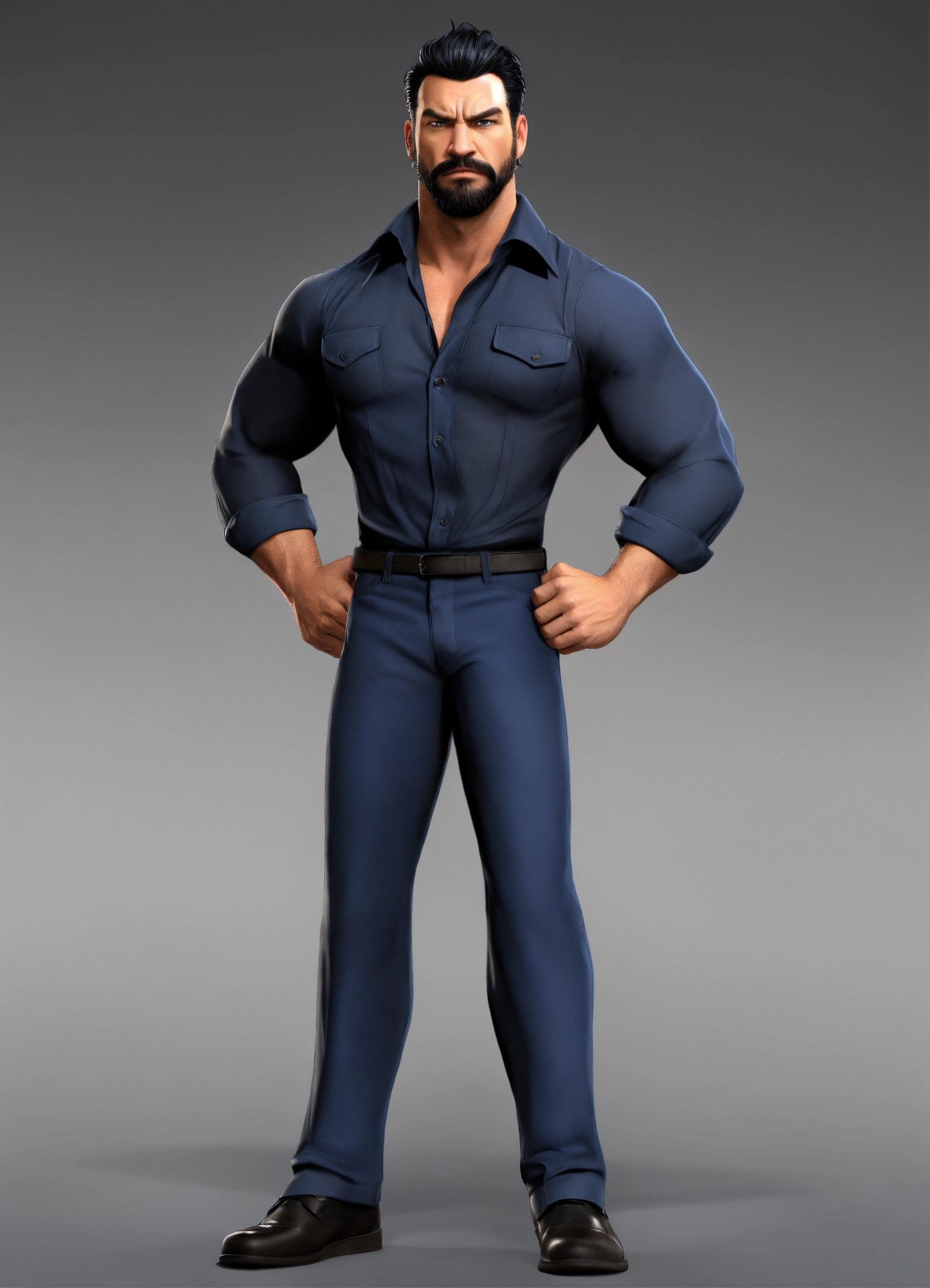 40-year-old male, black hair that sticks up, slight facial hair, blue eyes, tall, muscular, dark blue buttoned shirt, black pants, black shoes, animated, realistic, cartoon, angry