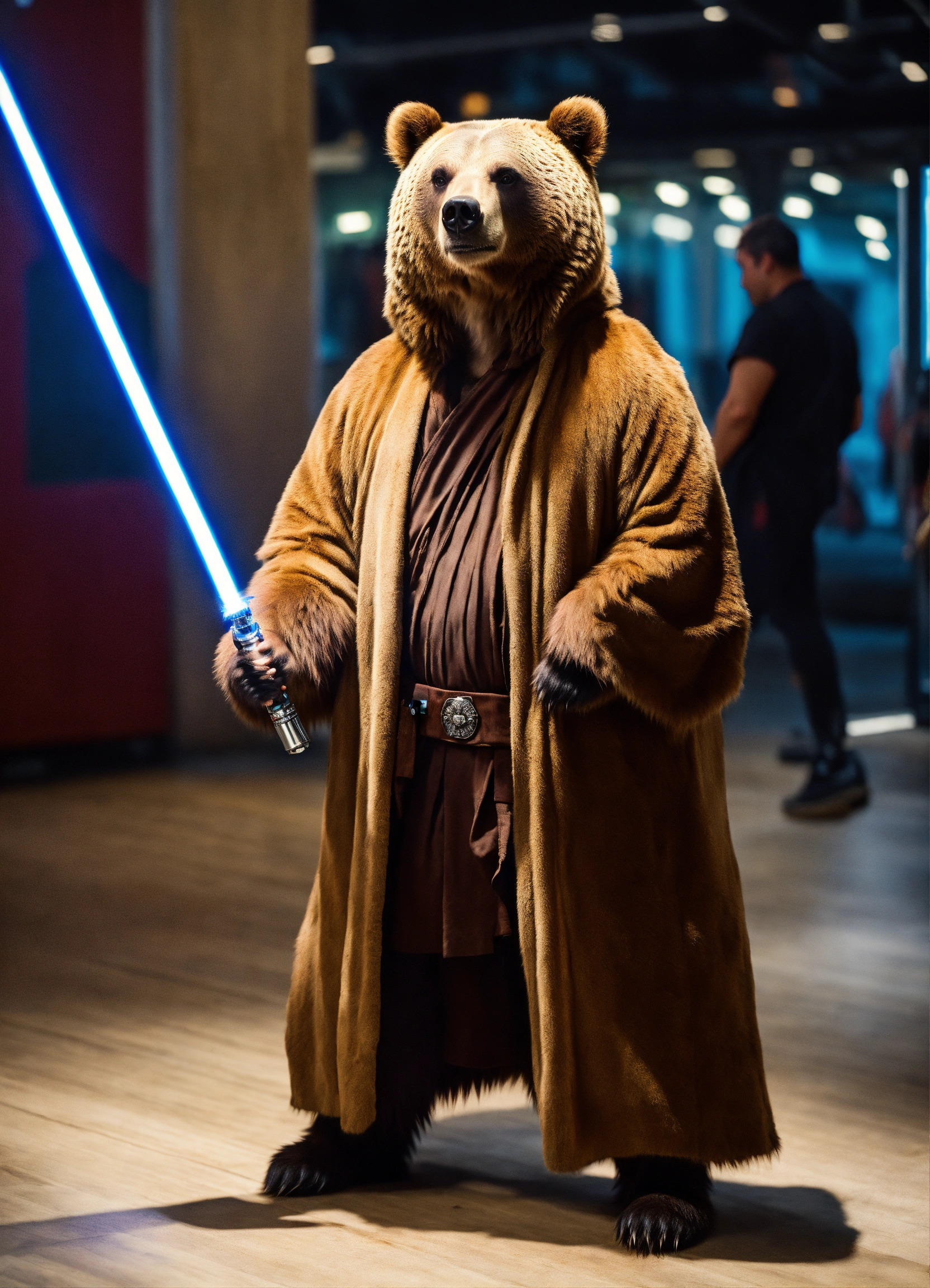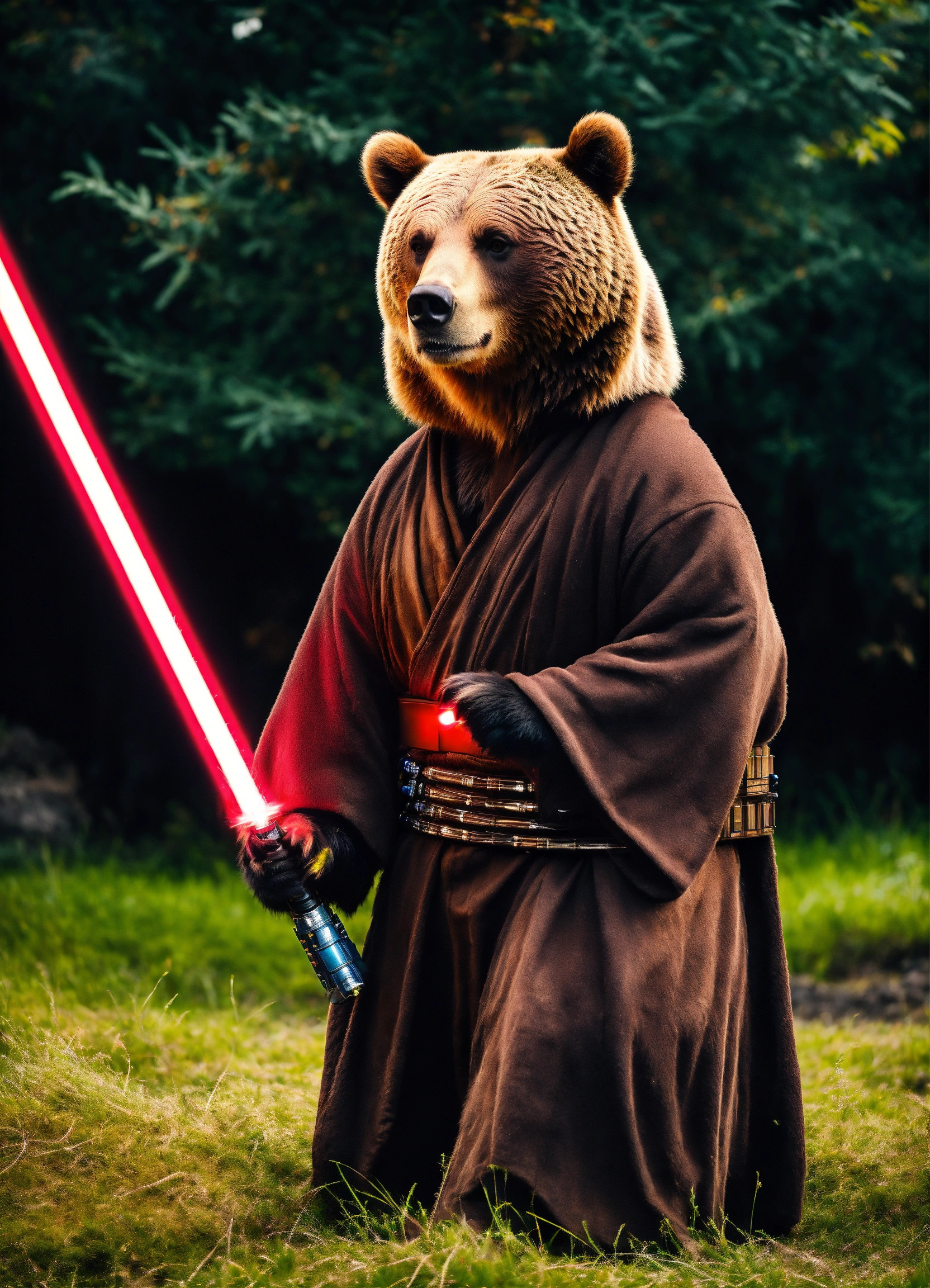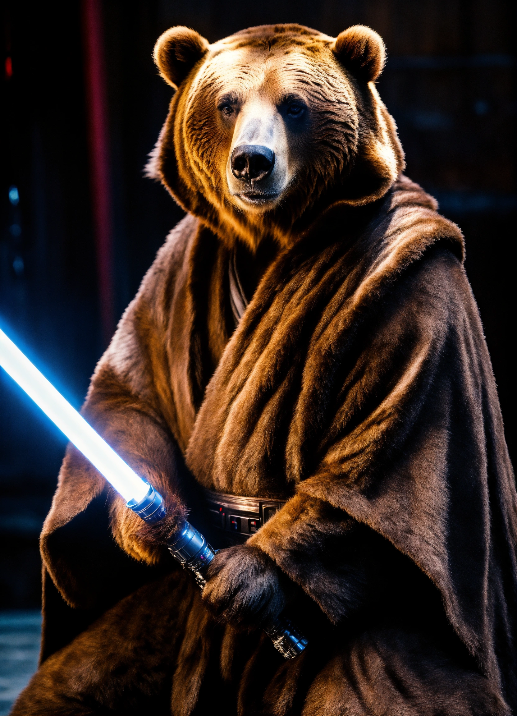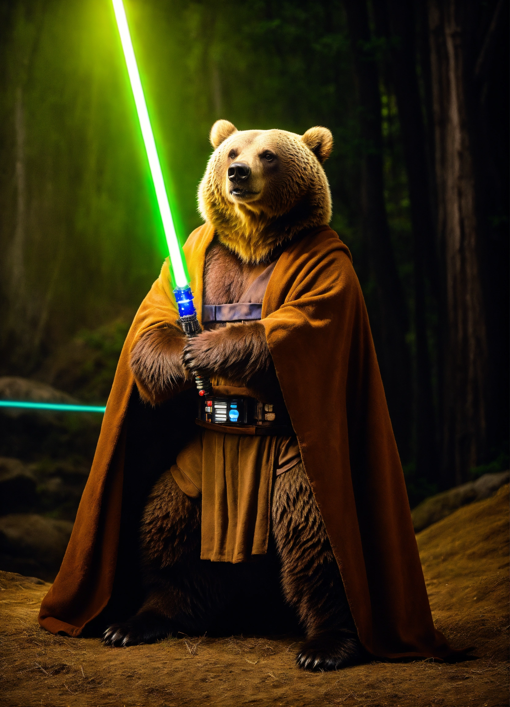 Grizzly bear dressed as jedi knight, lightsaber, best quality, real picture, intricate details, fujifilm xt3, raw photo, 8k uhd, film grain