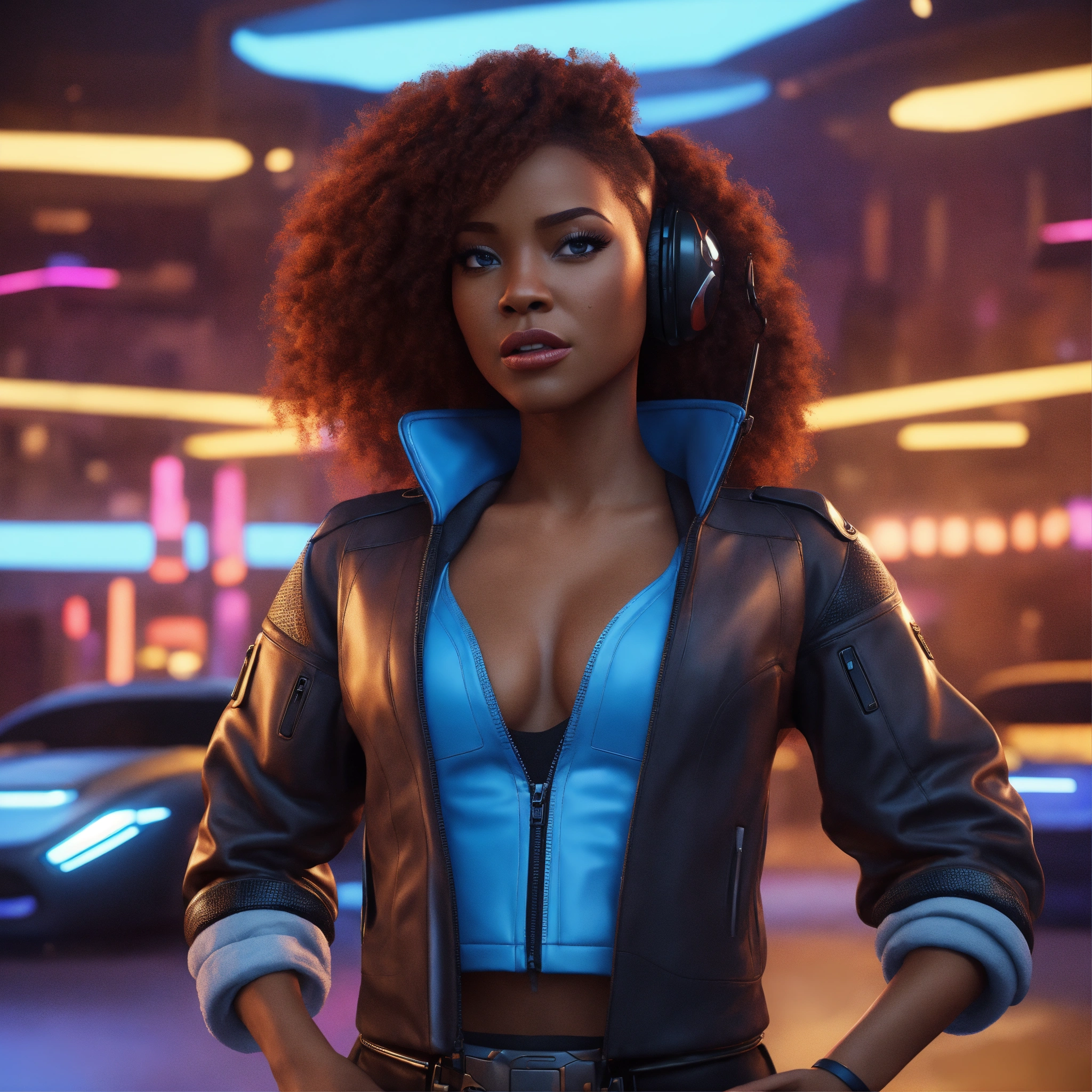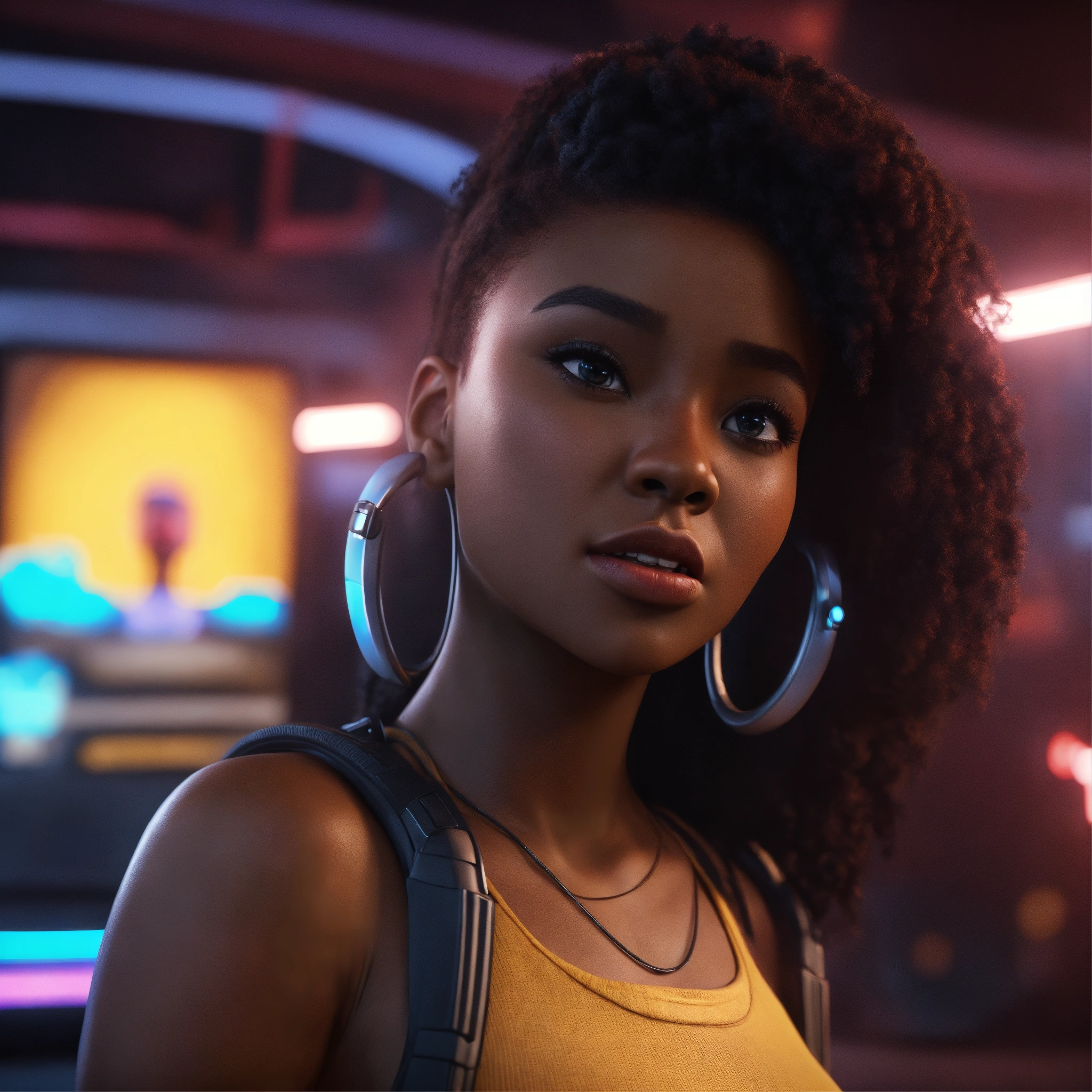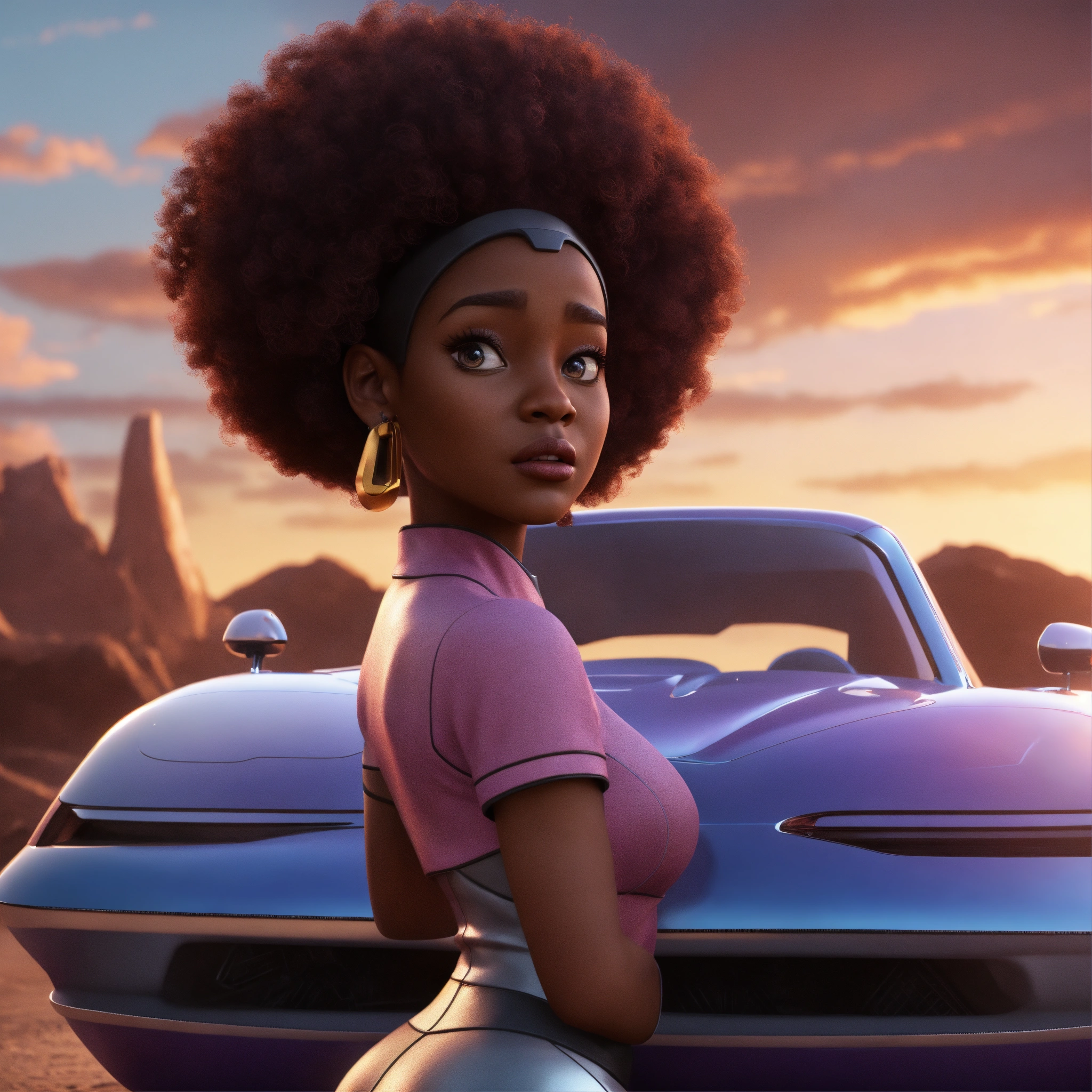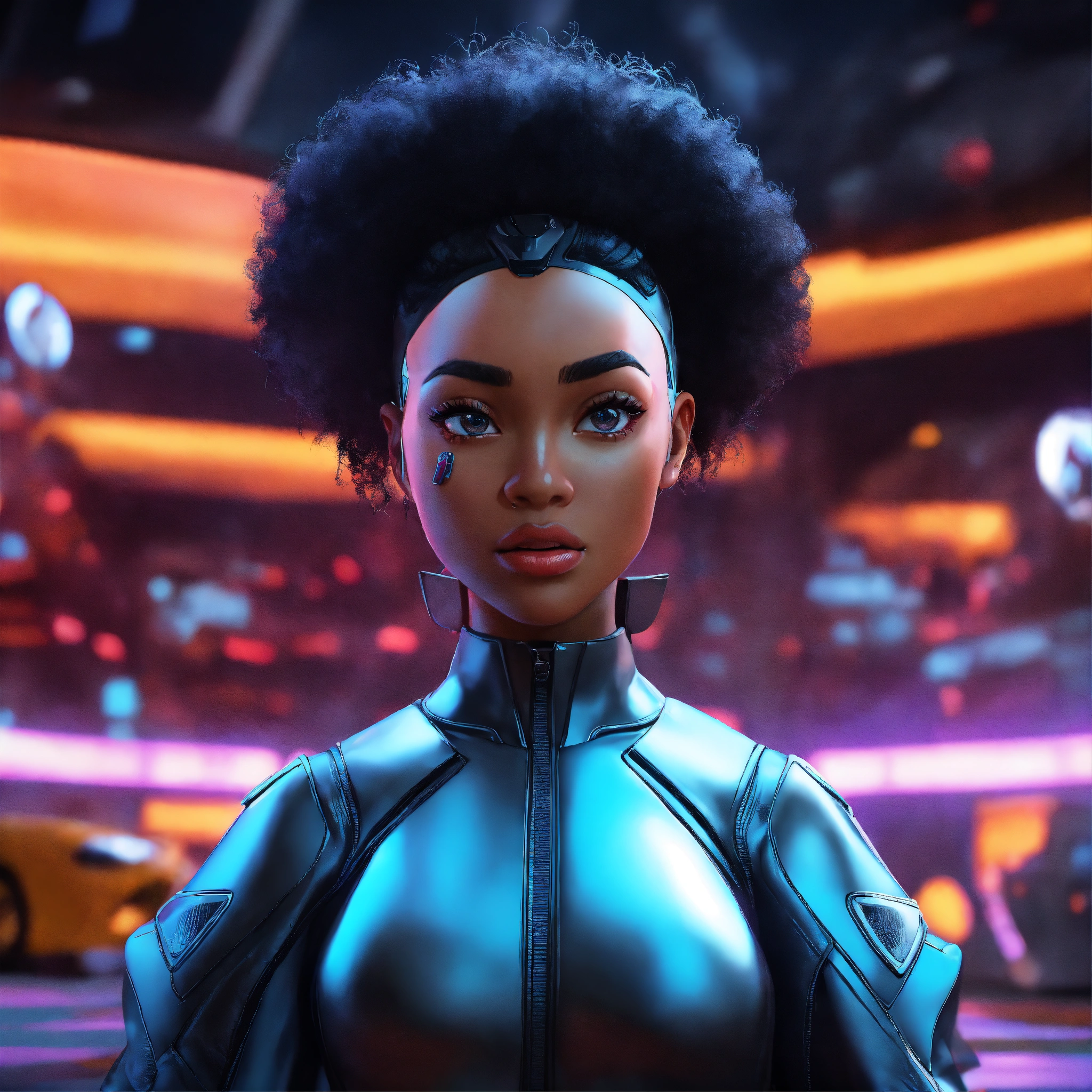 Screen with a cartoon expression like cars movie of a black female screen with attitude, realistic, futuristic, sci-fi, 8k, unreal engine
