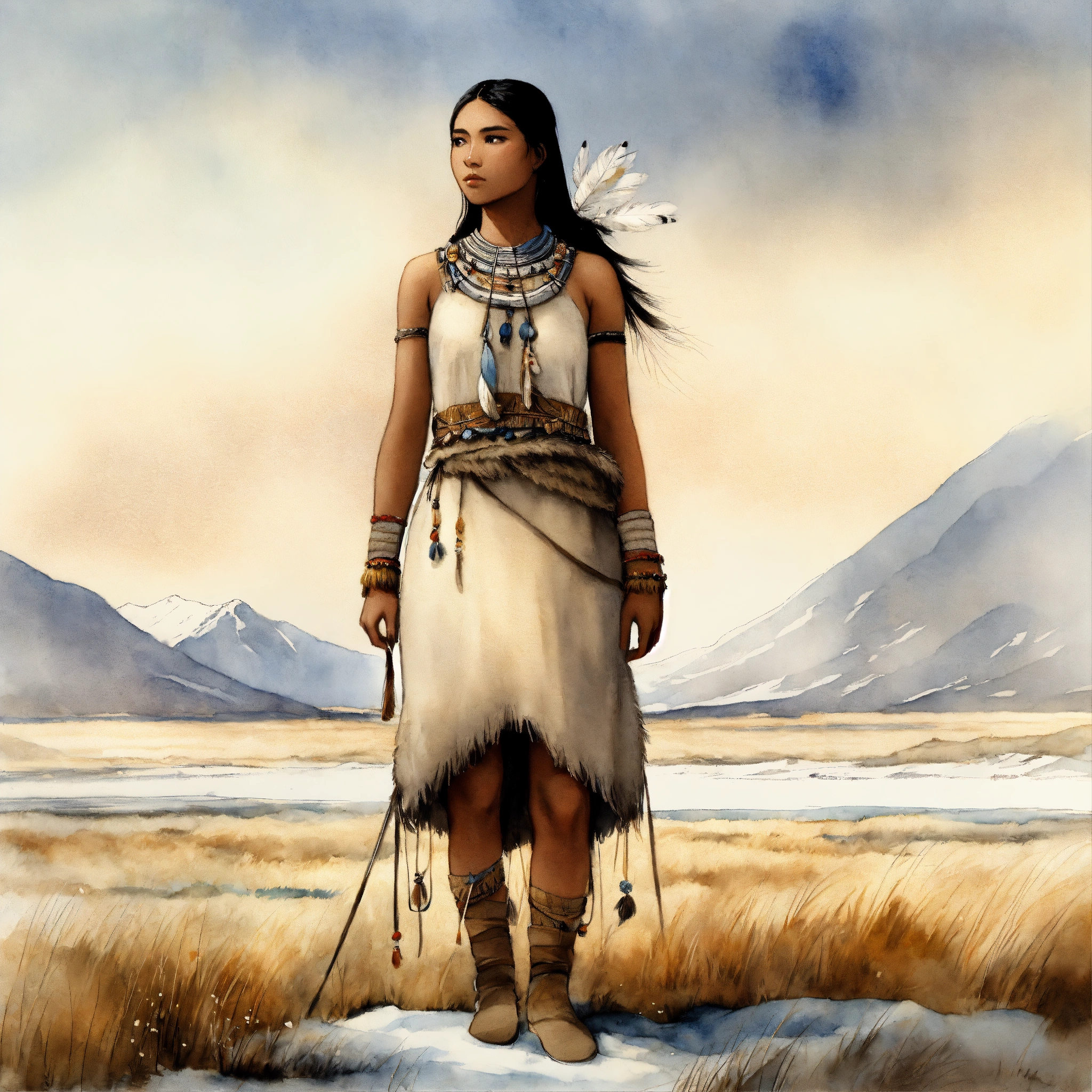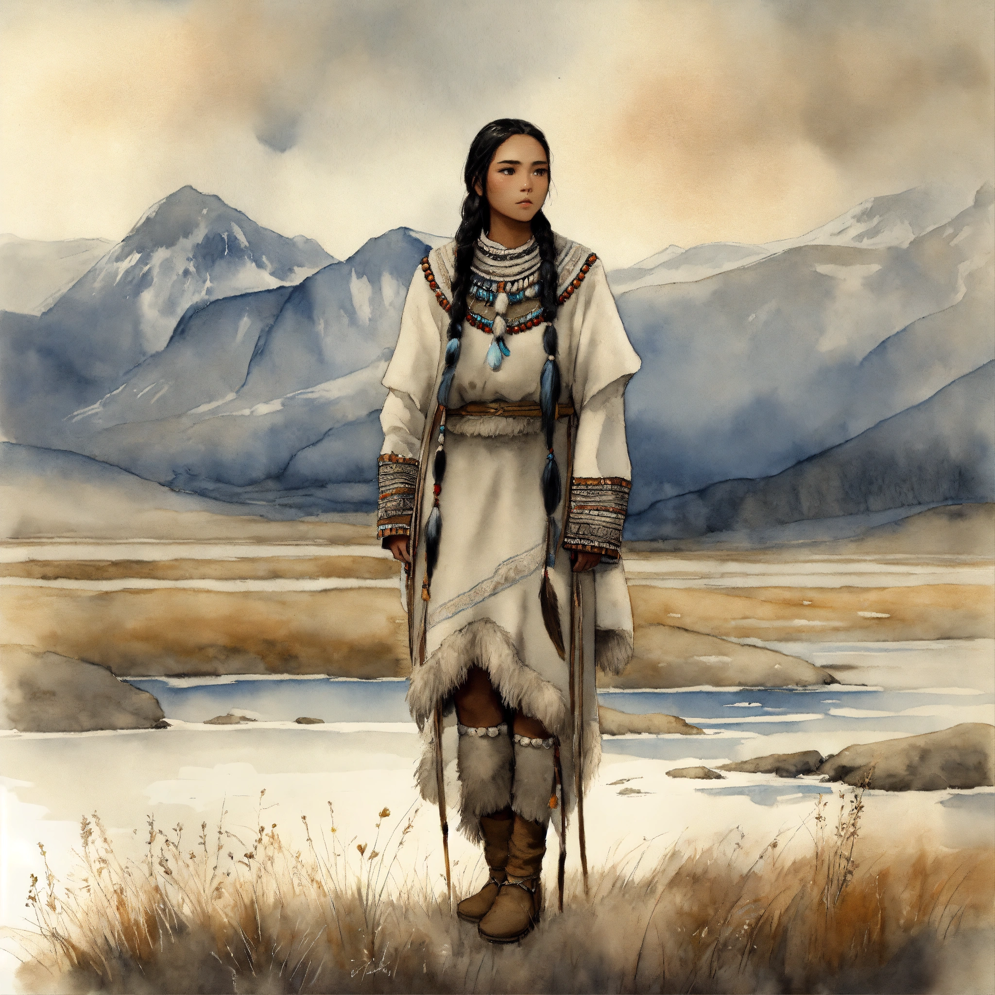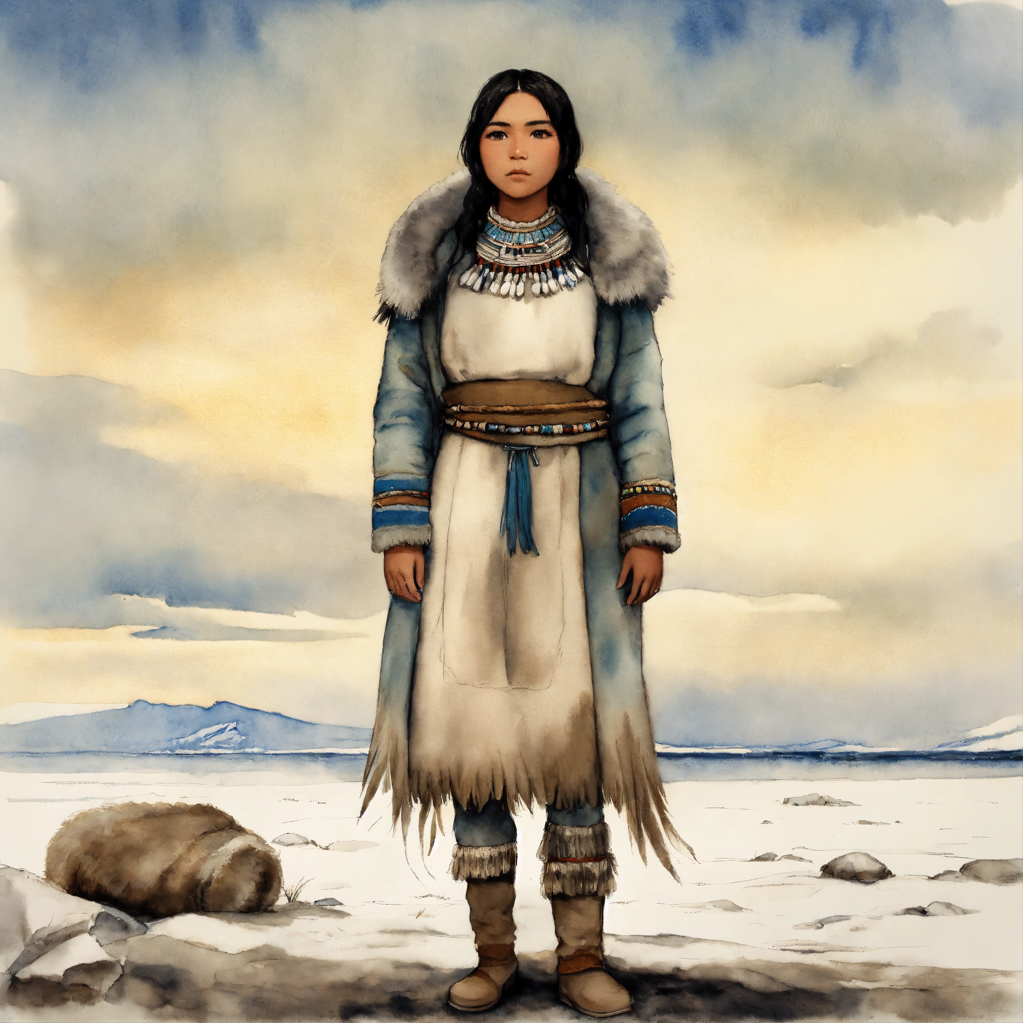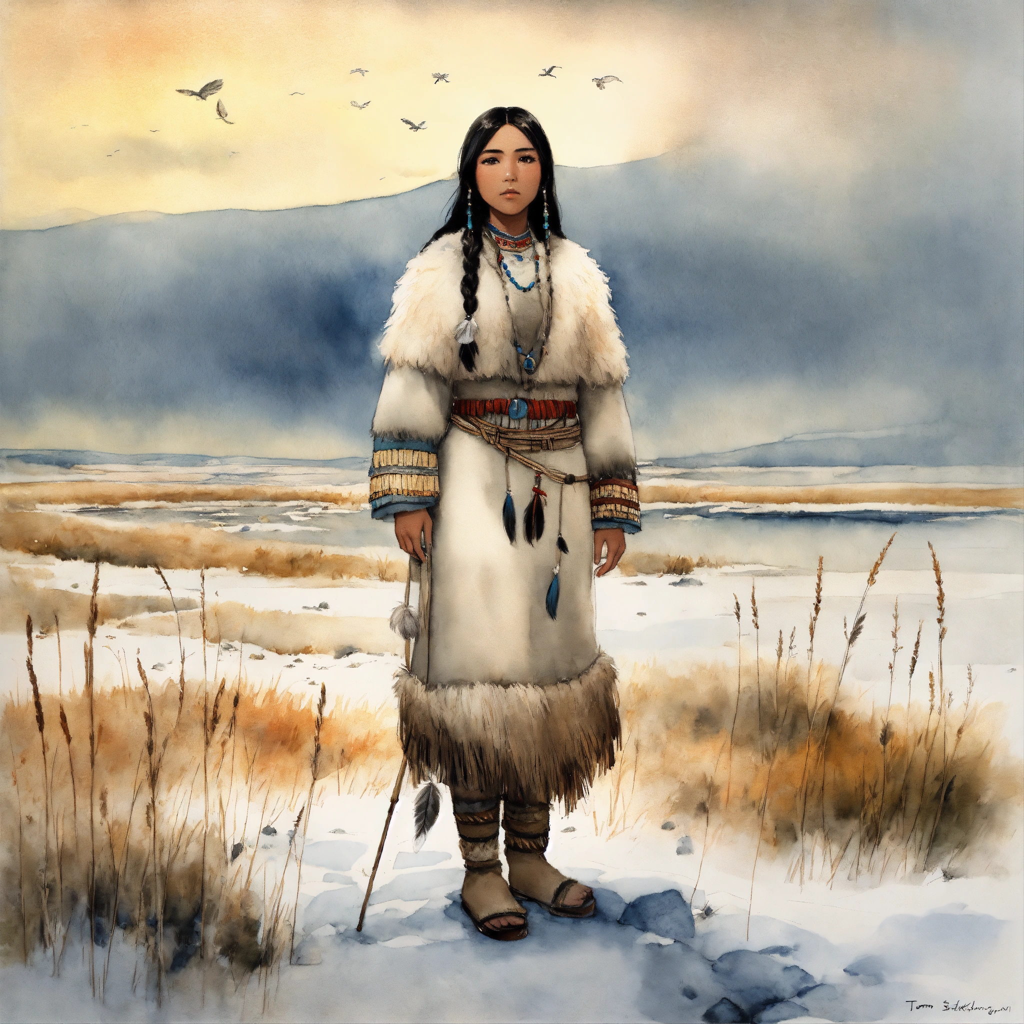 Full body illustration of an inuit woman, young, 18 years old, beautiful, native american phenotype, wearing stone age clothing made from natural fabrics like linen, cotton, or furs, adorned with feathers, beads and shells, stading on the steppe tundra landscape, watercolors, gloomy and depressing ambient, artwork by tom björklund