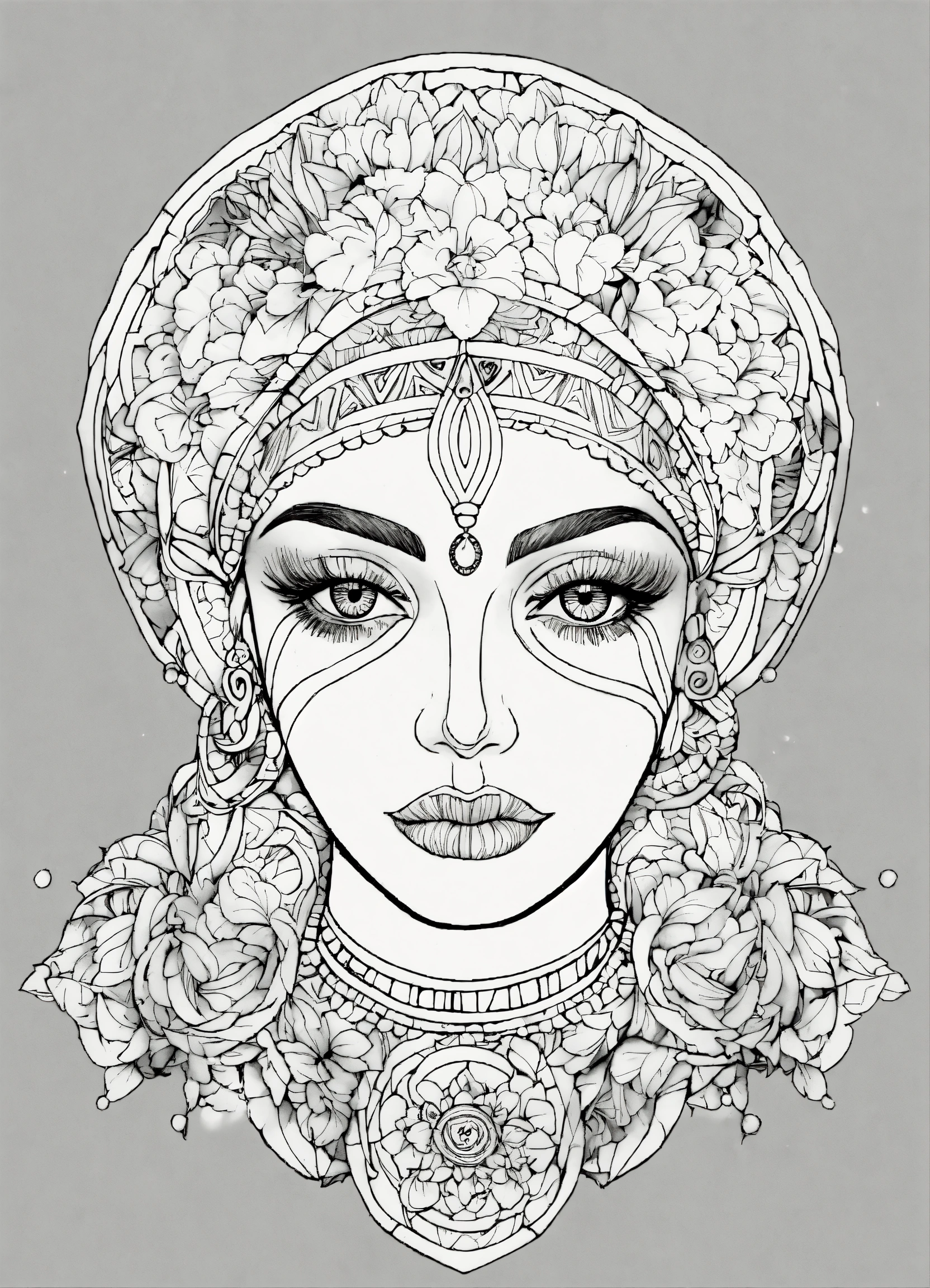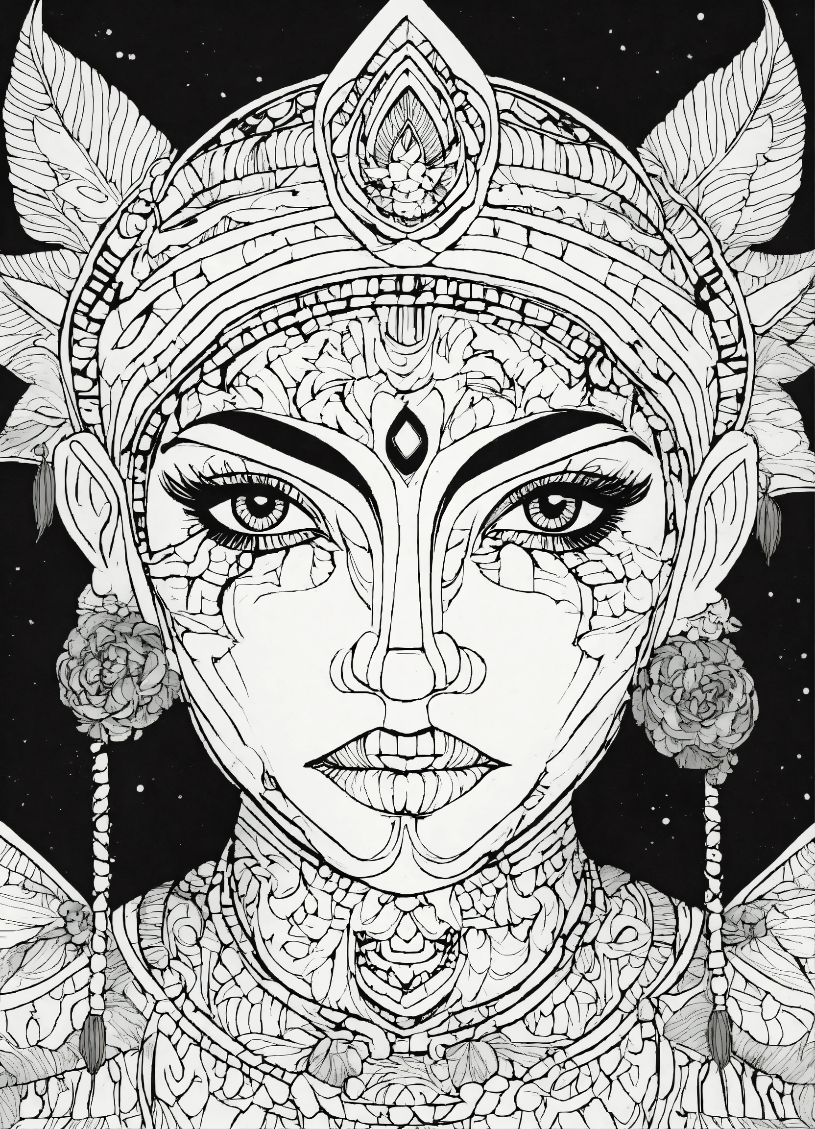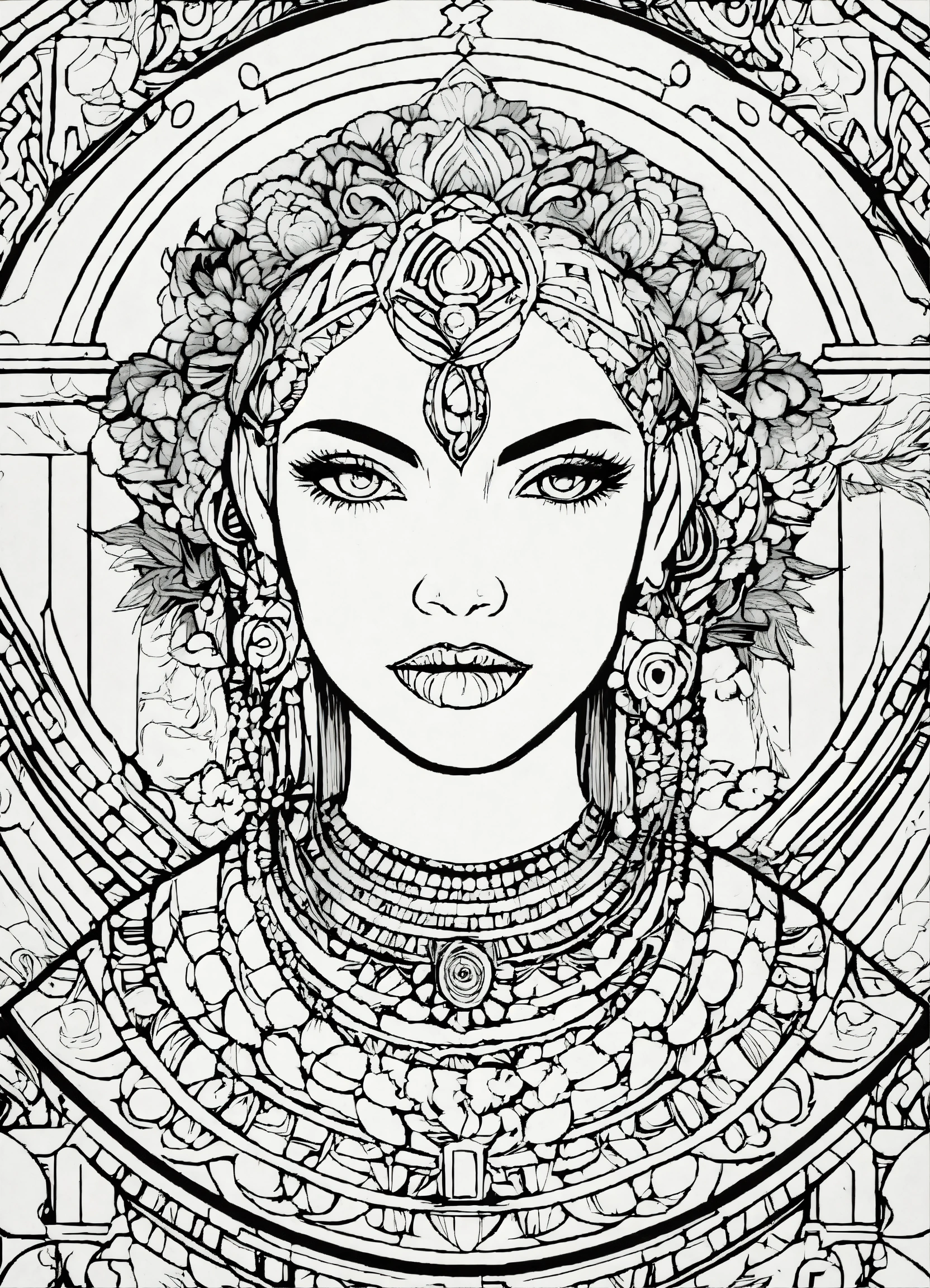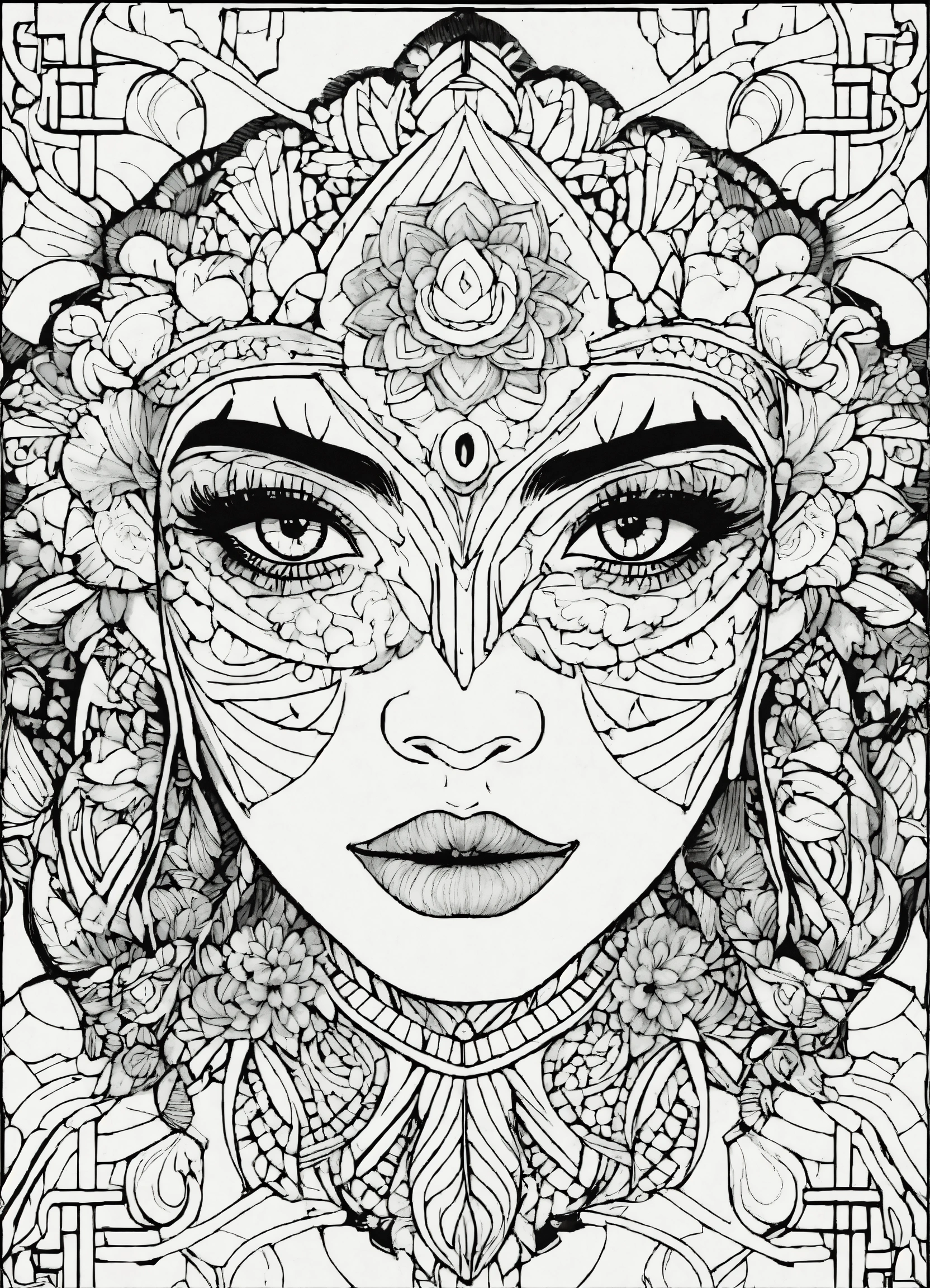Coloring page for adults, bold lines, dark lines, mandala bust image, mandala mad magazine character face, white background