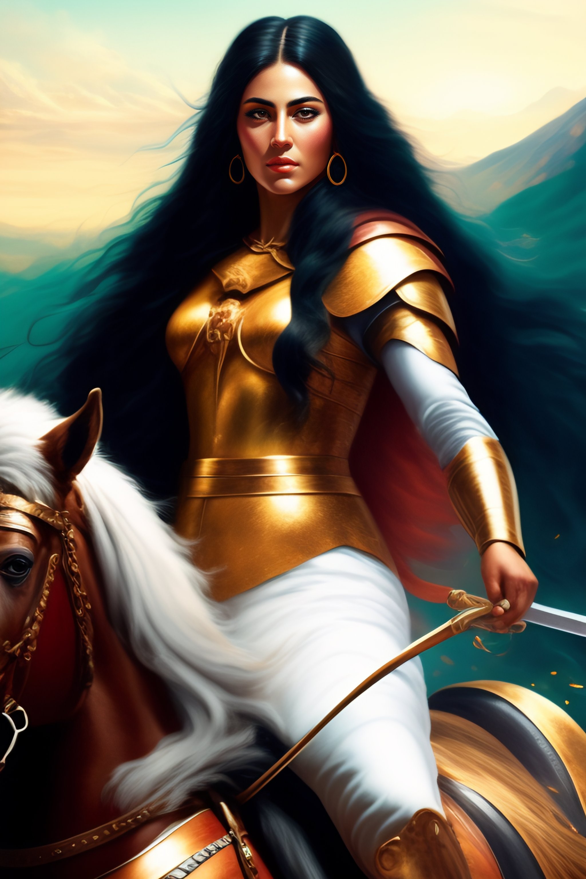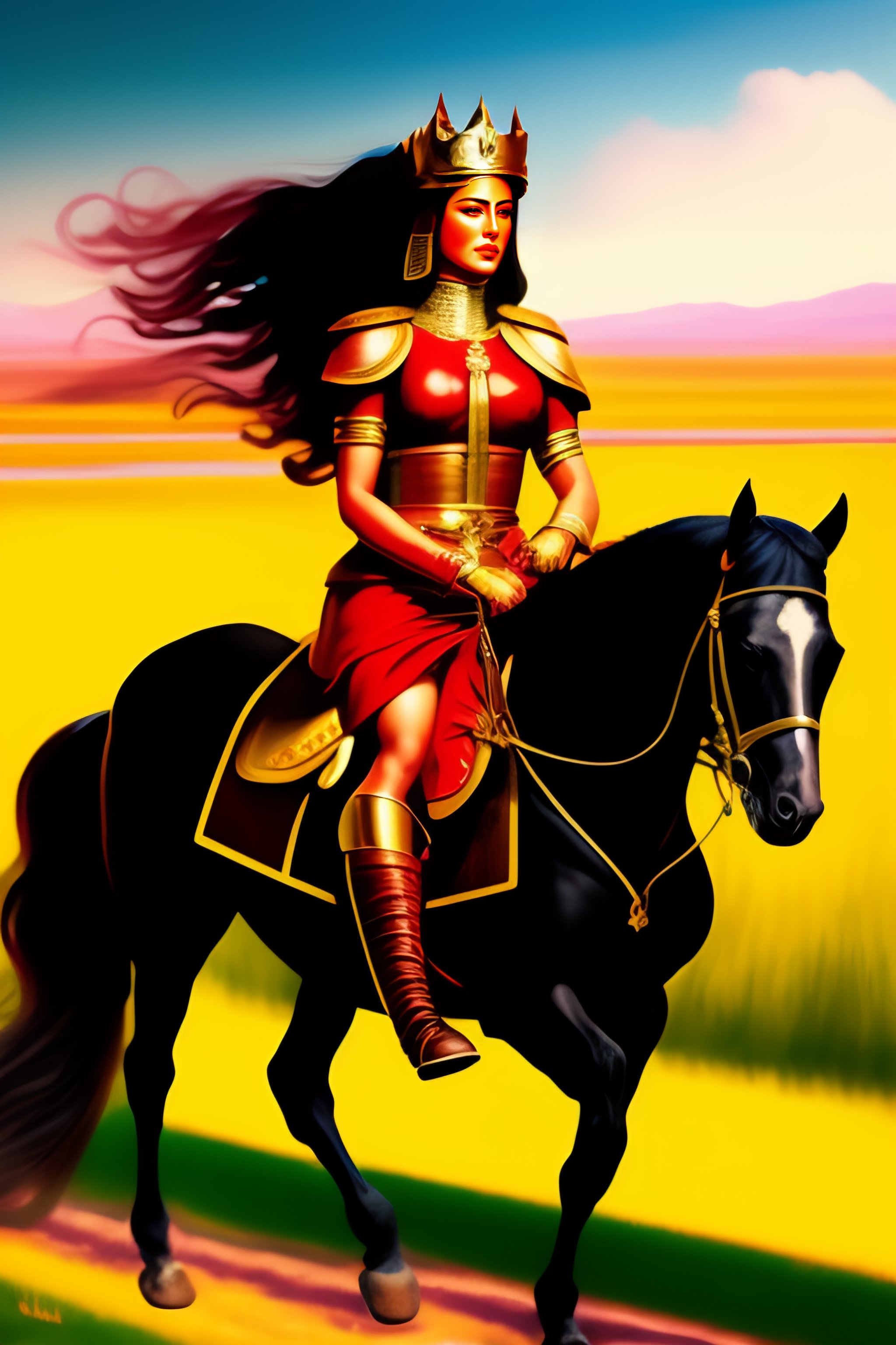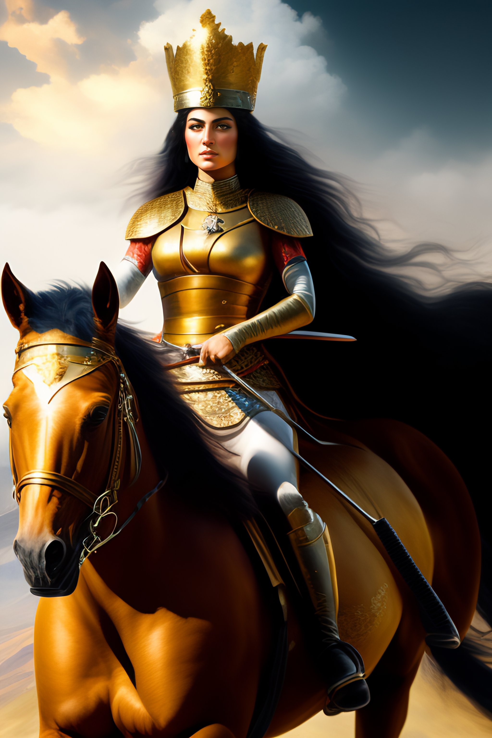 Achaemenid commander woman, persepolis, straight and long hair, riding a horse, persian beautiful face, power, determination, leading people, freedom, poetry, a hero, queen of iran, crown of king of iran, tarot card, queen of sword, achaemenid clothes