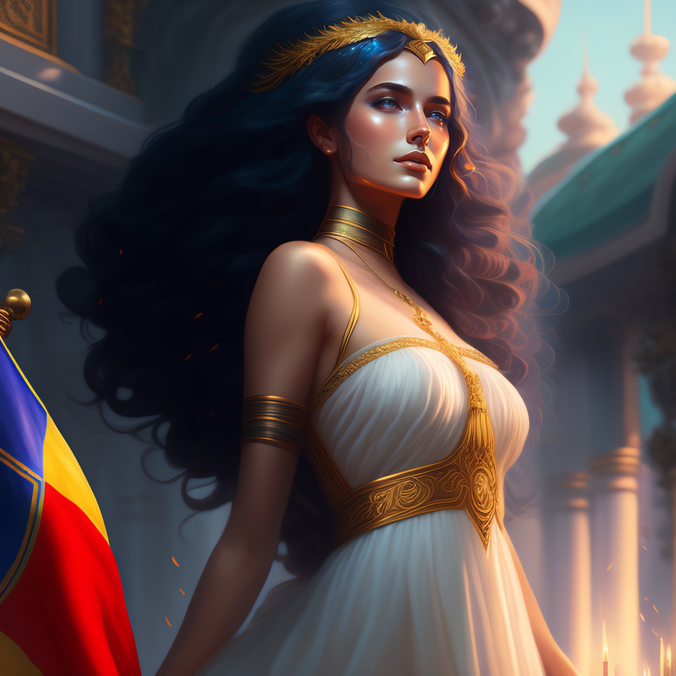 Highly detailed full body of eurydice greek mythology, wearing a romanian flag dress, stephen bliss, unreal engine, fantasy art by greg rutkowski, loish, rhads, ferdinand knab, makoto shinkai and lois van baarle, ilya kuvshinov, rossdraws, tom bagshaw, global illumination, radiant light, none environment