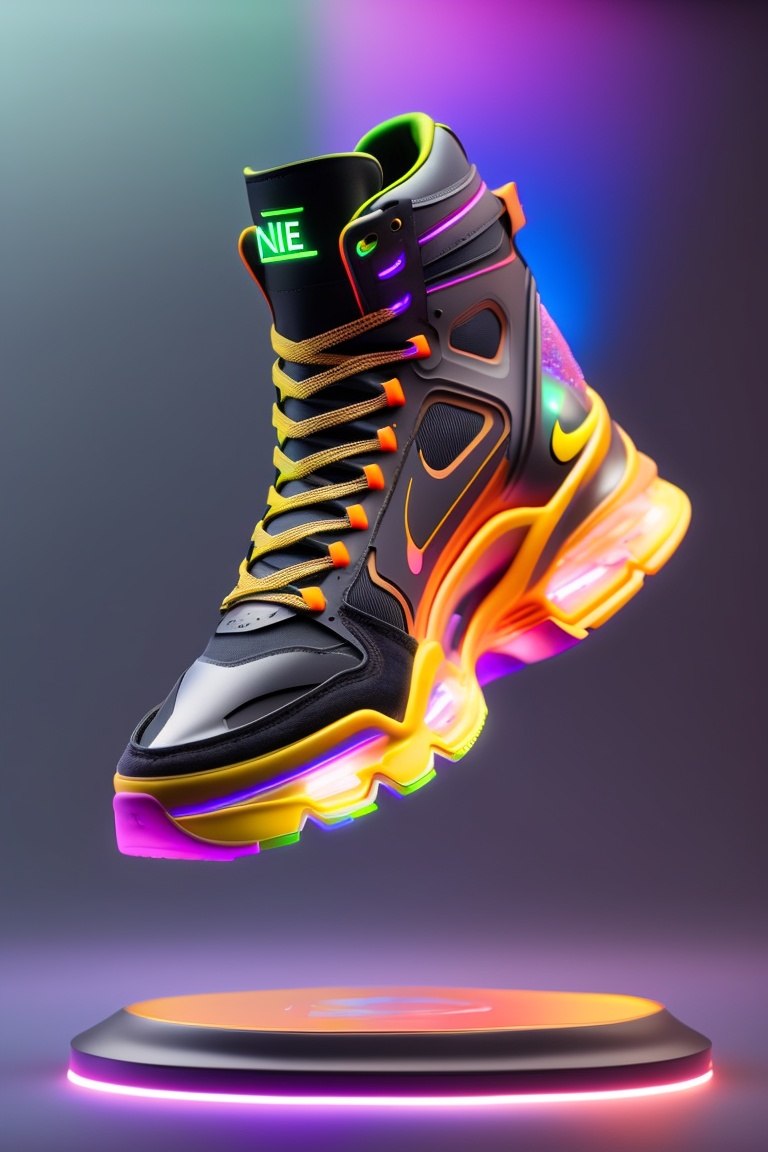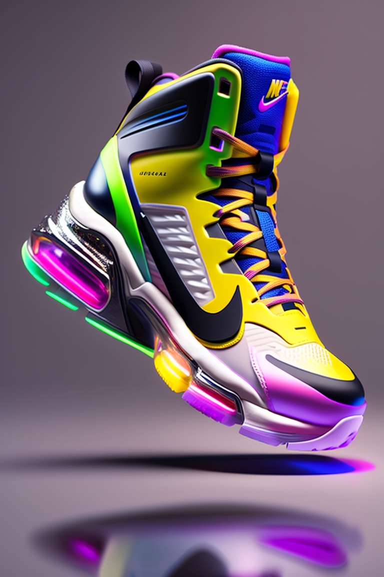 Step into a cyberpunk realm where advanced technology and street fashion collide. create a visual representation of a unique pair of nike shoes, incorporating elements of high-tech gadgetry, holographic details, and bold, eye-catching colors. emphasize how these shoes cater to the needs of the cyberpunk generation, enabling them to navigde the ever-changing urban landscape with style and ease