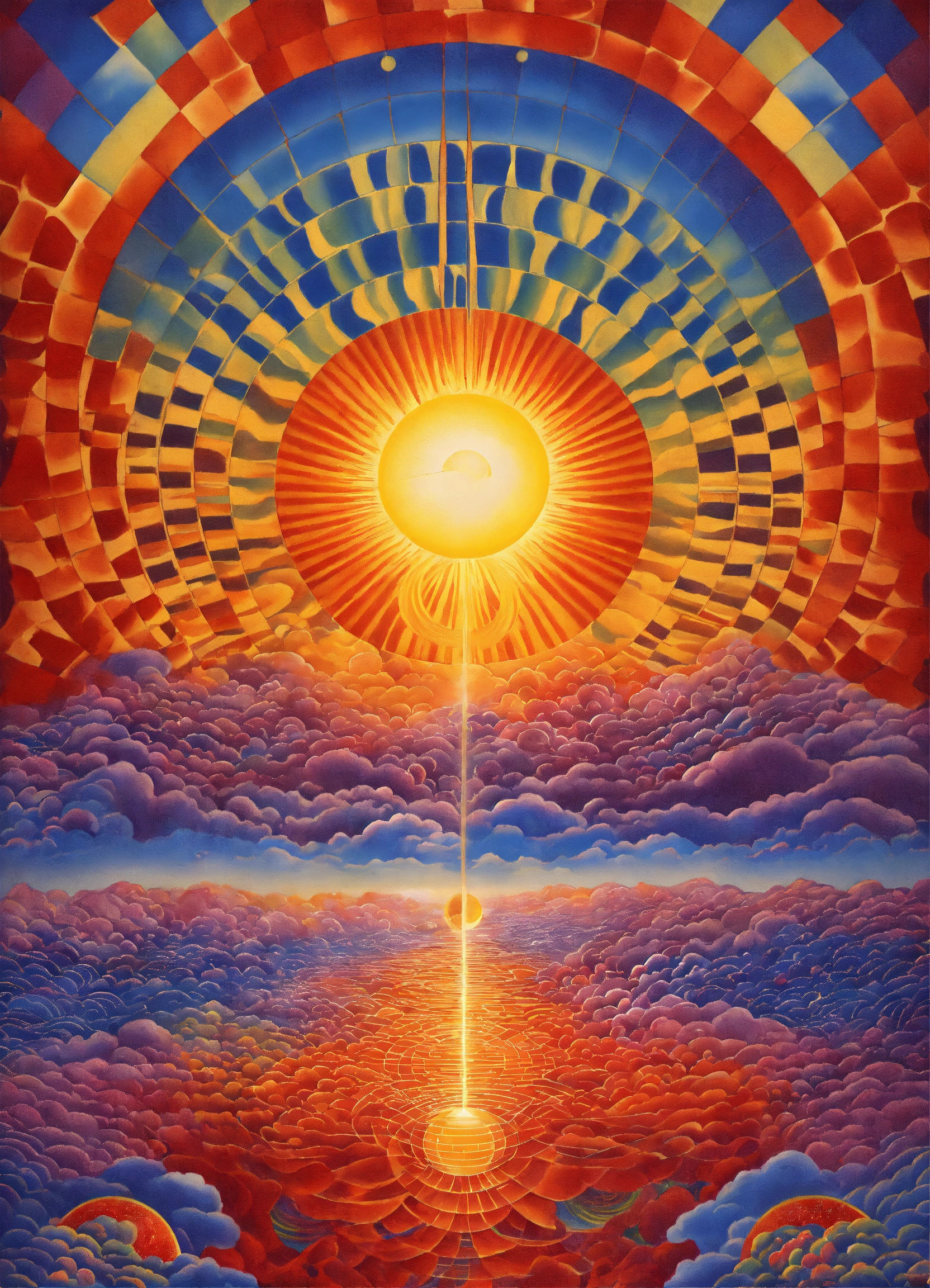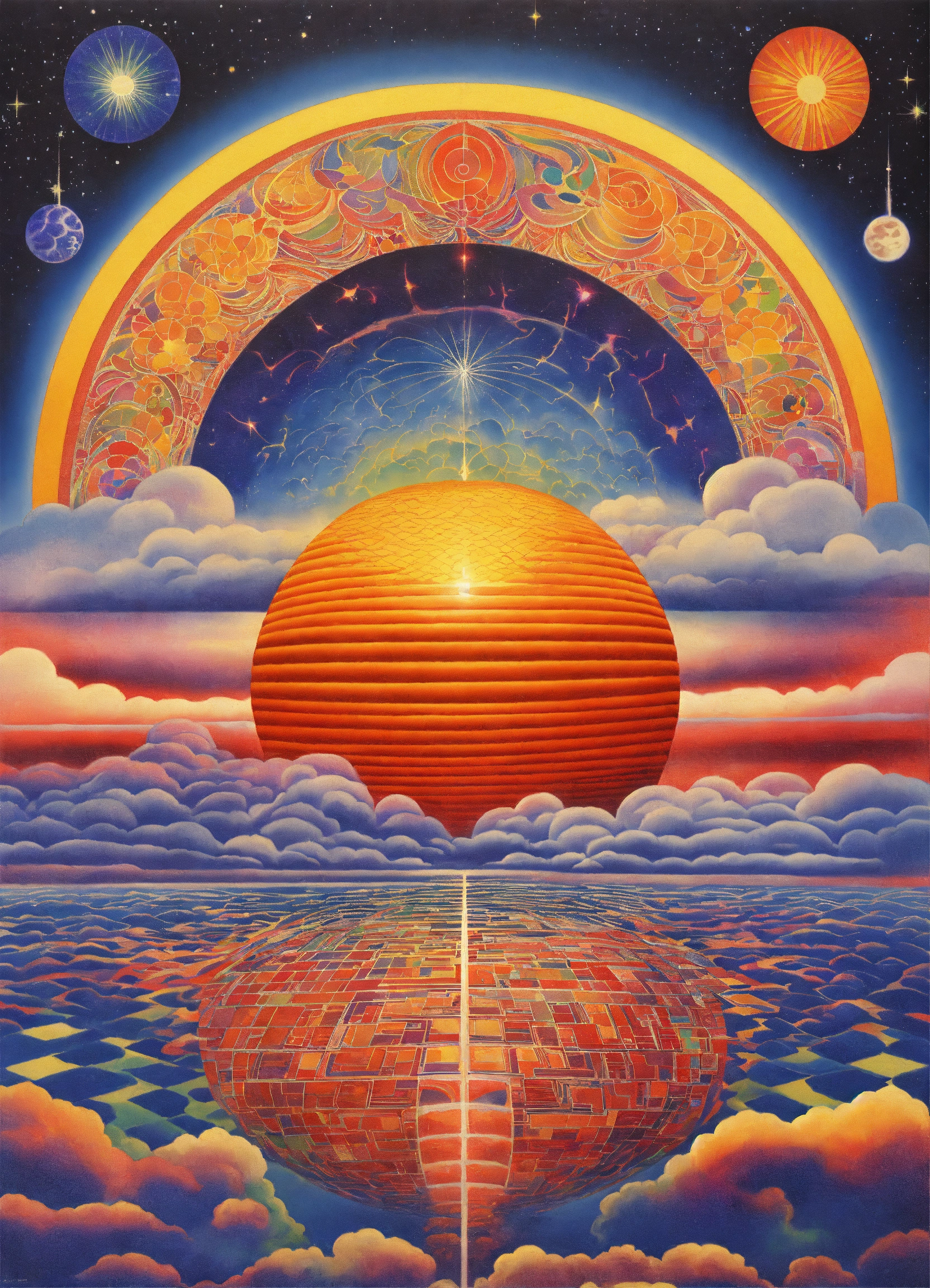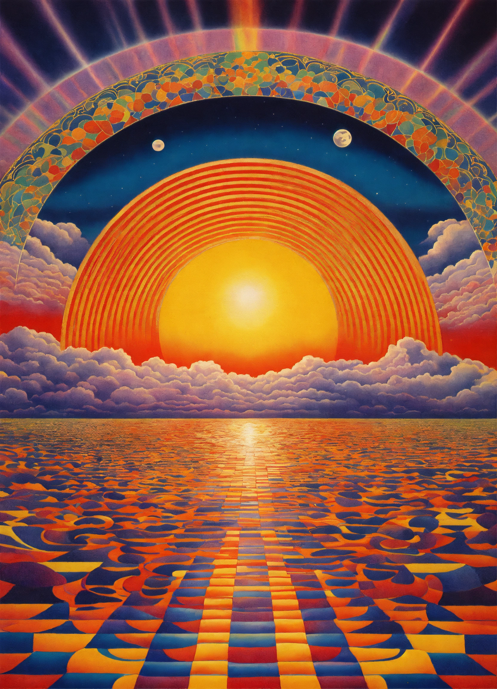Japanese vintage poster, oriental, sun merging into moon, geometrical clouds, dream dimension, psychedelic, nebula, cosmic frontier, rainbow checkerboard patterns by alex grey