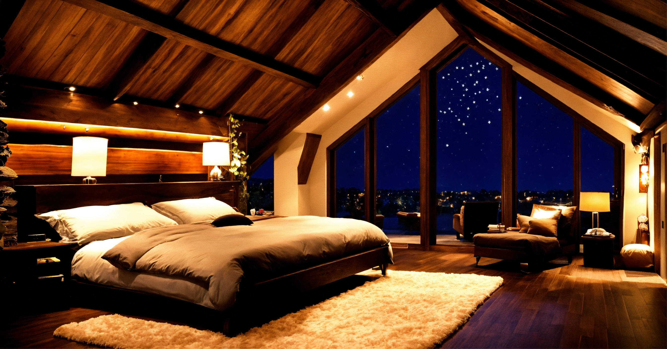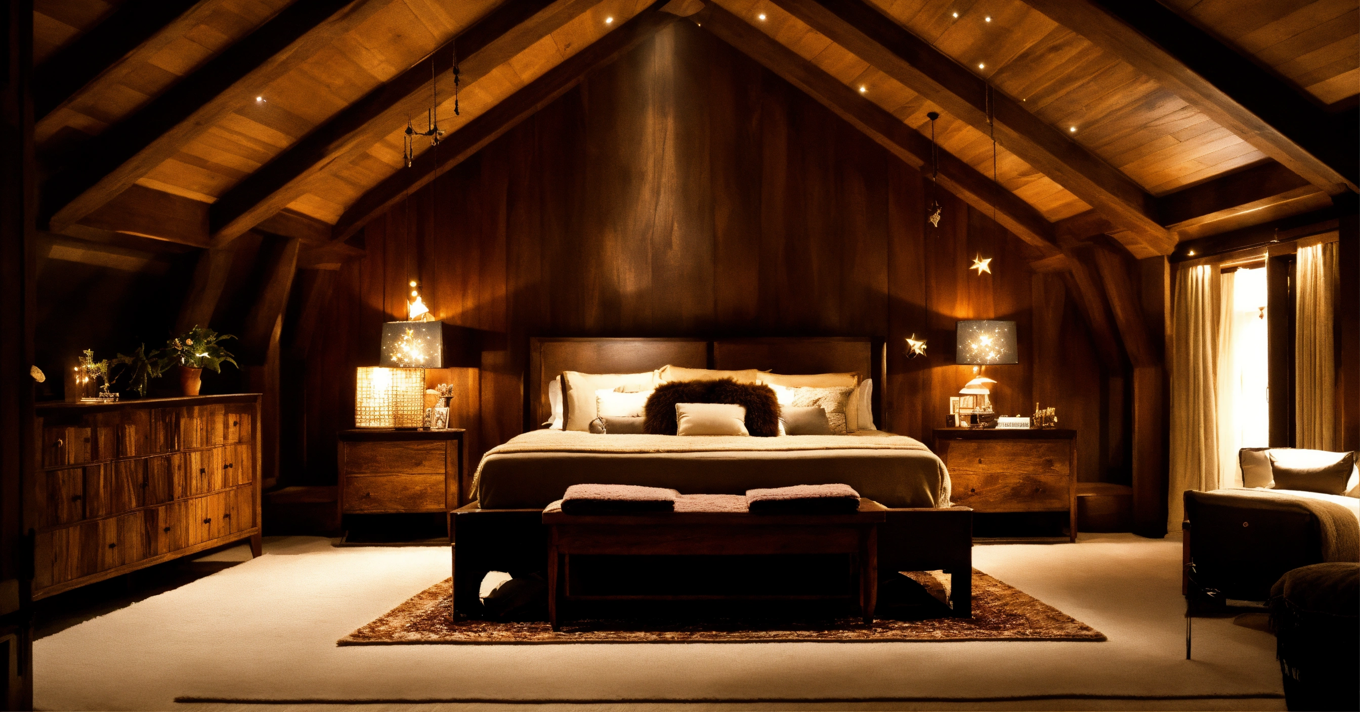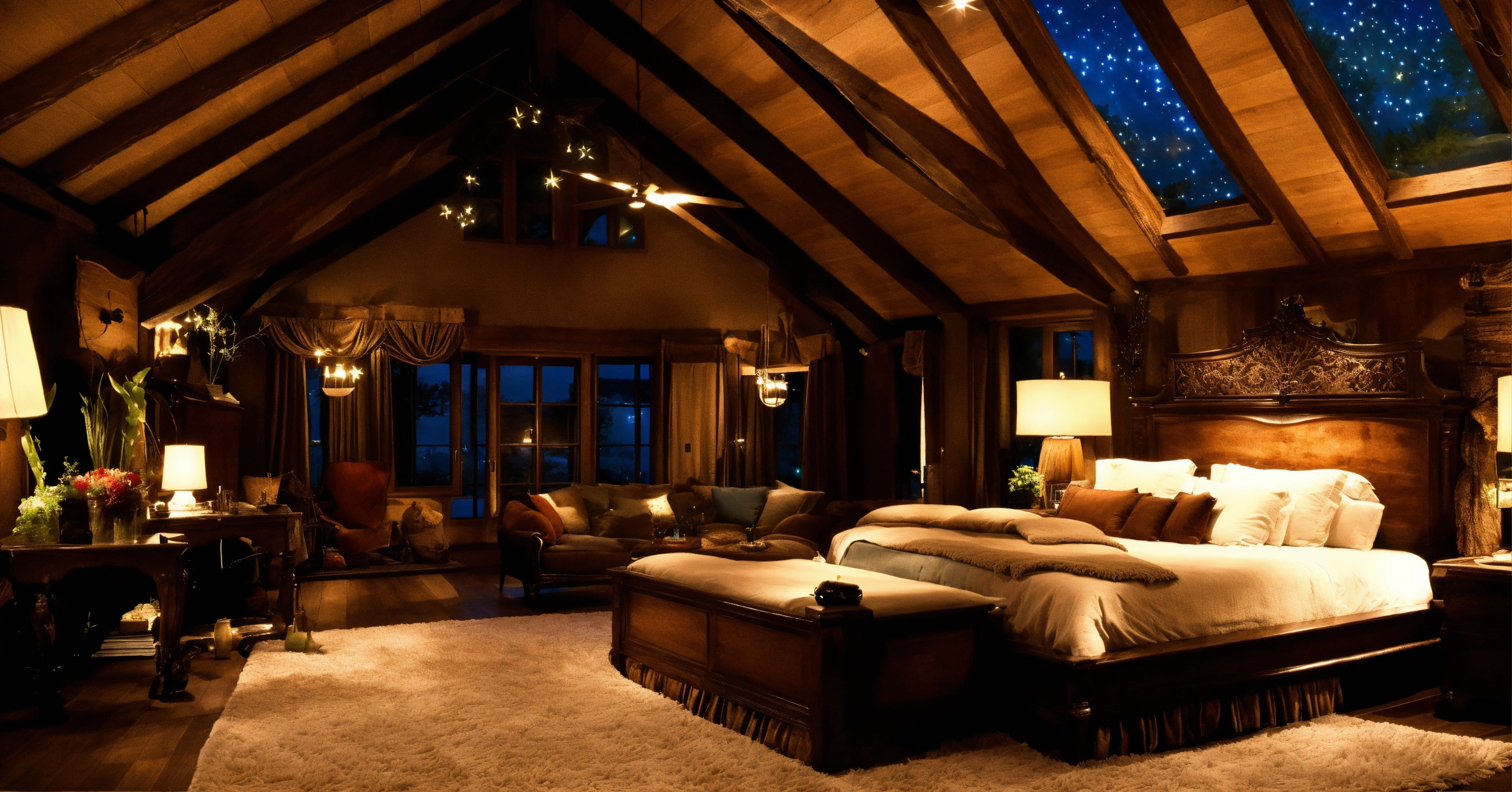 Romantic bedroom, dark wood, vaulted ceilings, fluffy rug, night time stars, bed hanging ceiling, fish tank
