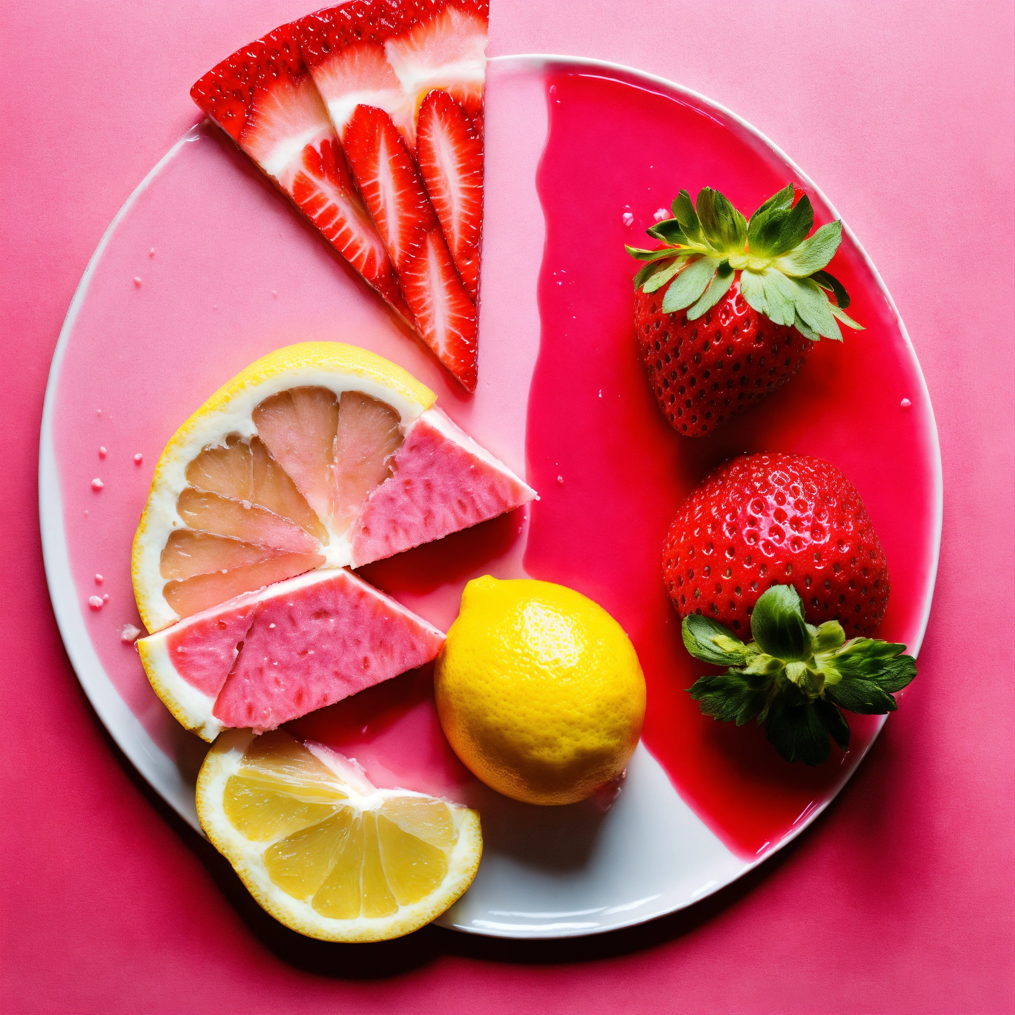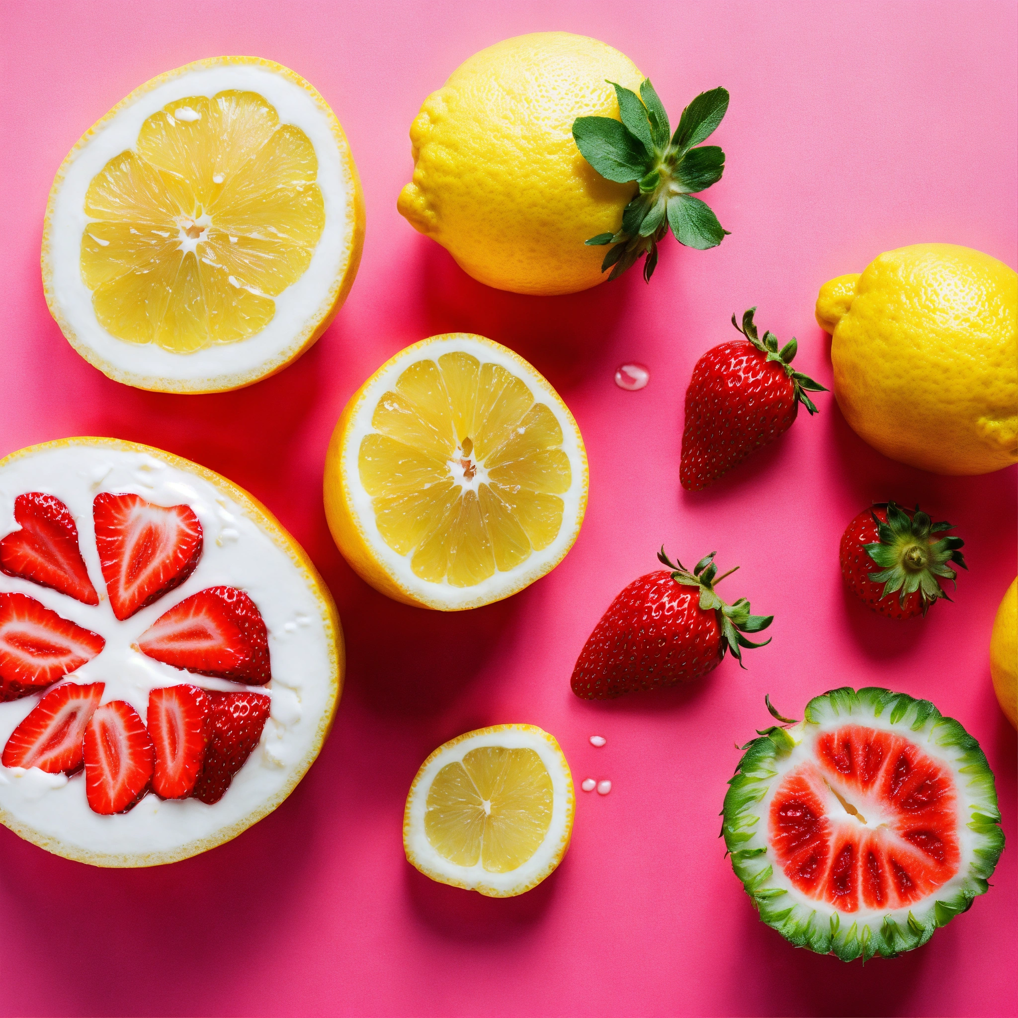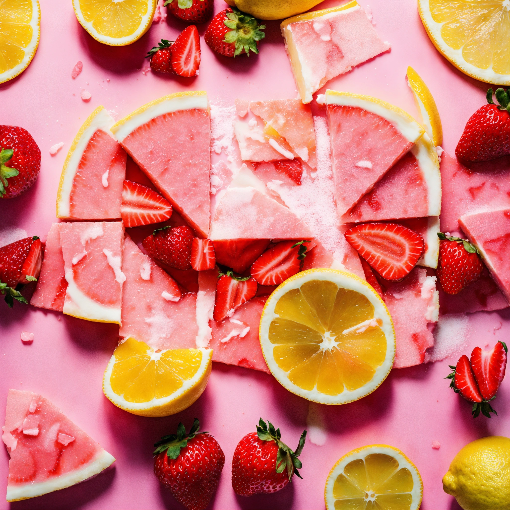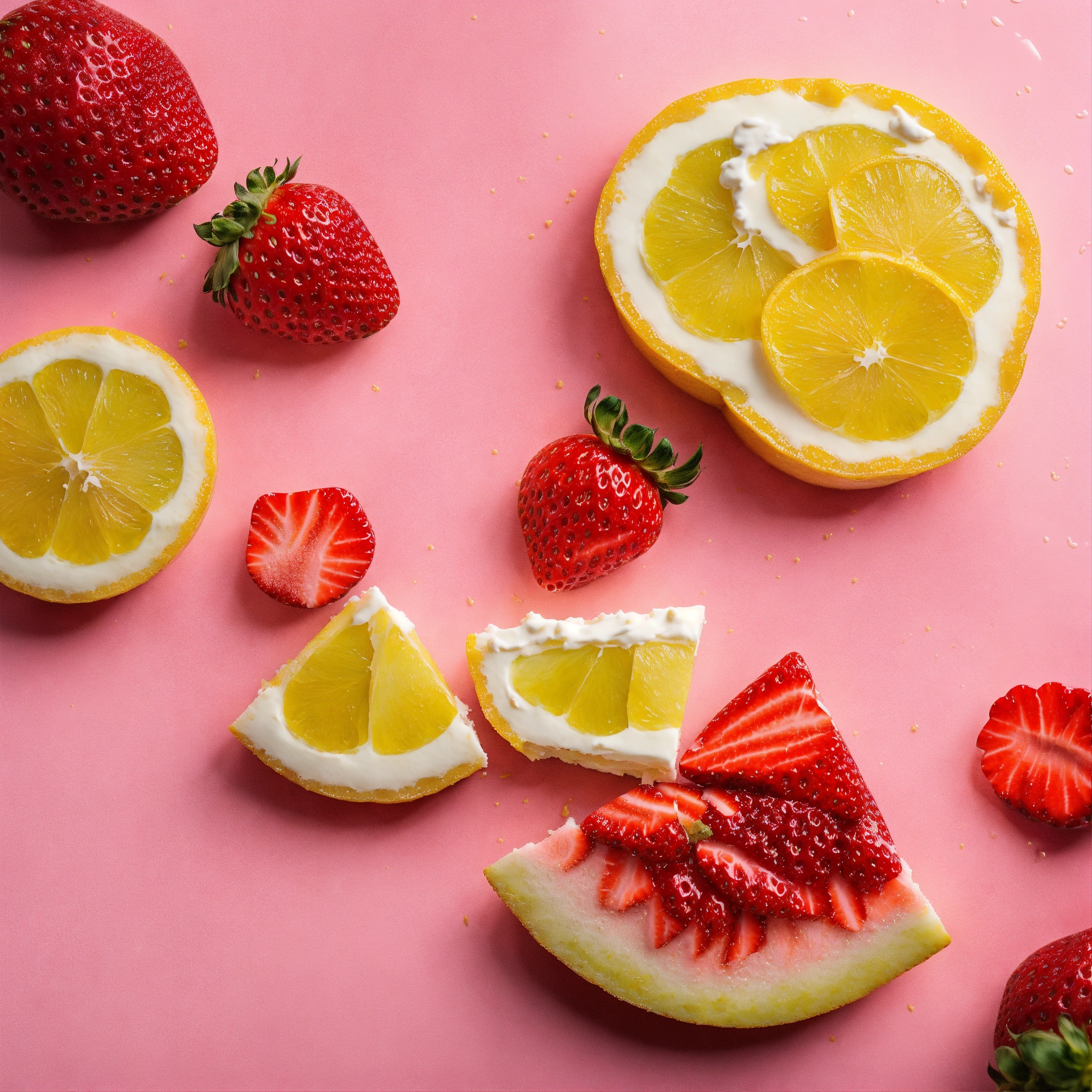 Horizontally half split background, one half is pink one half is white, divided by lemon slices, strawberries scattered around