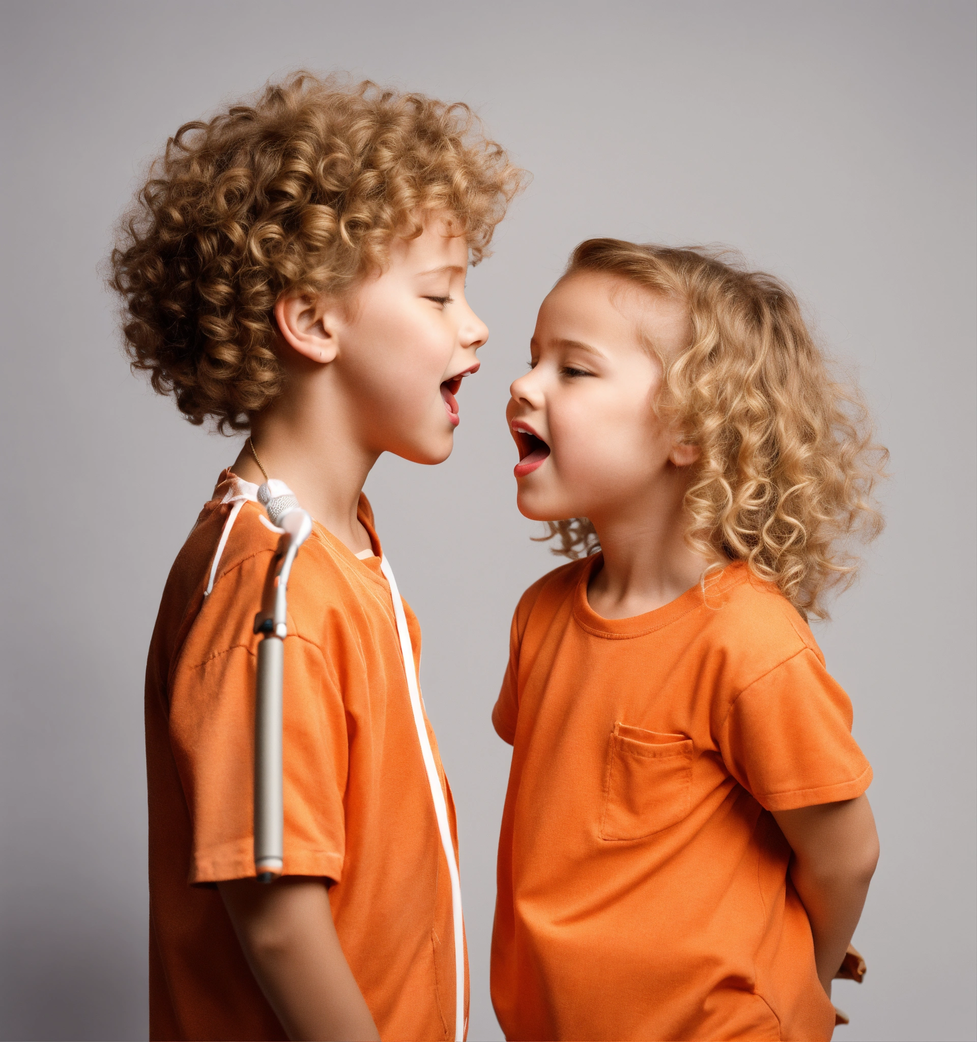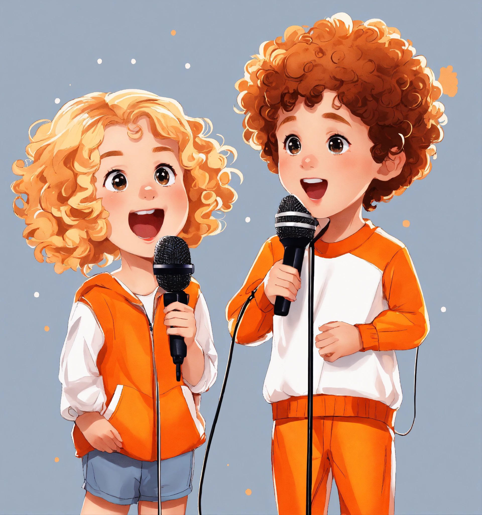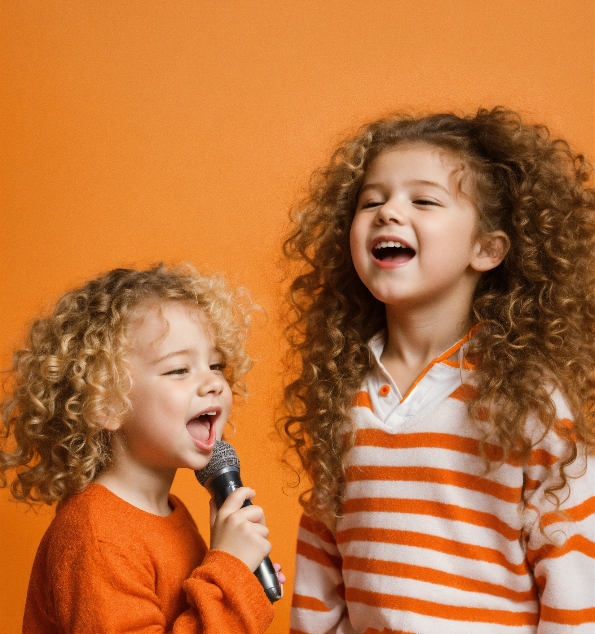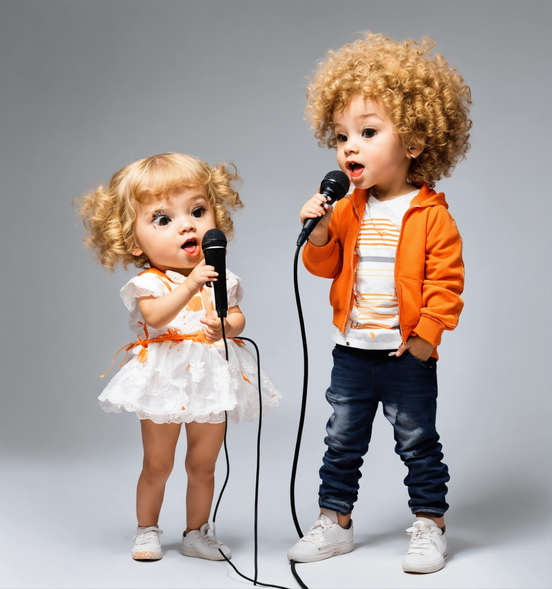 A small blond girl with curly hair and a boy singing in the microphone in the orange and white clothes on the white background