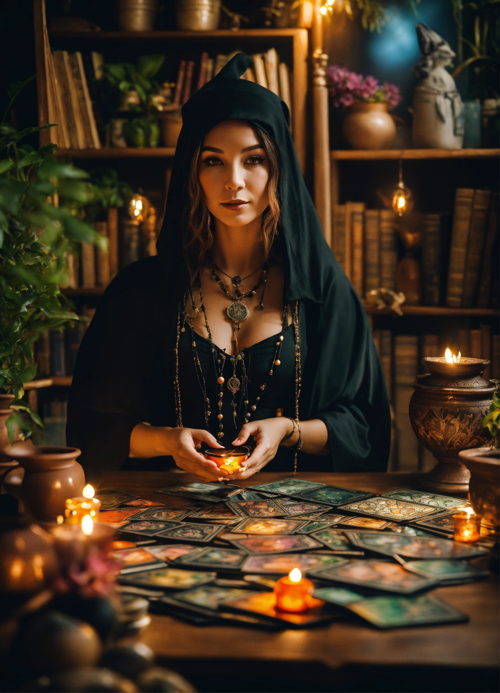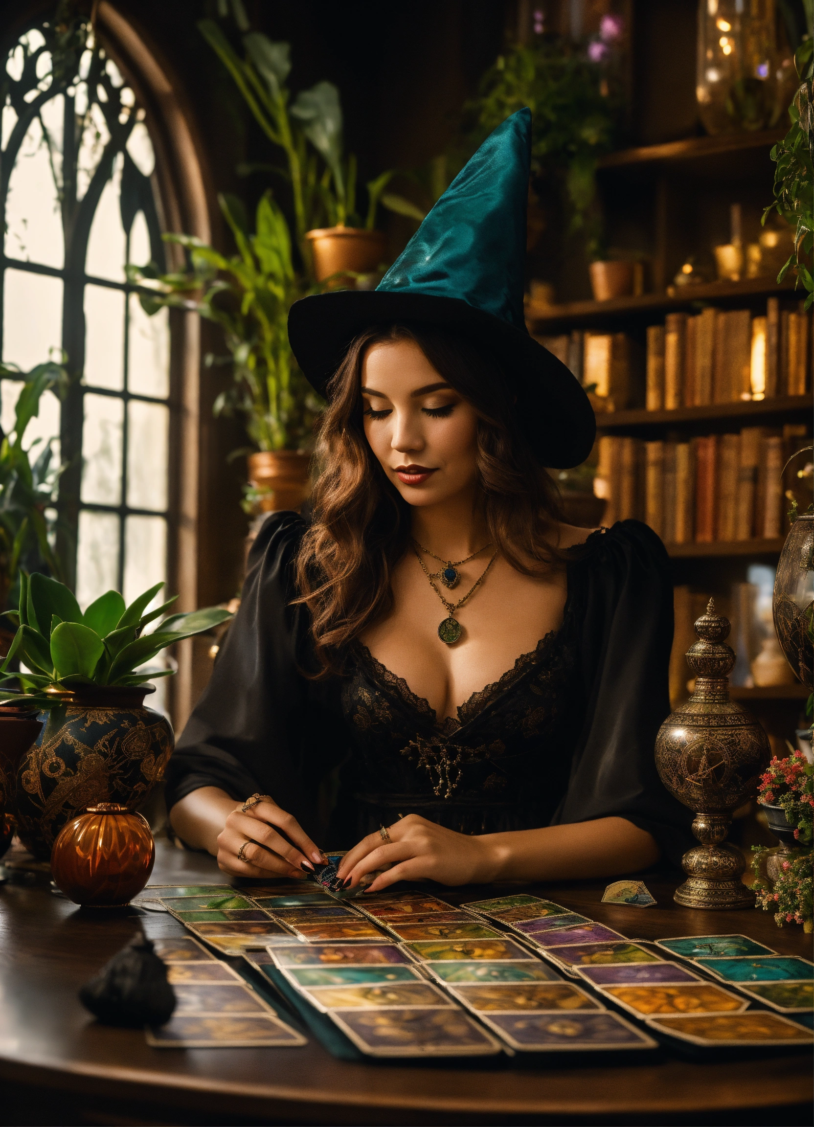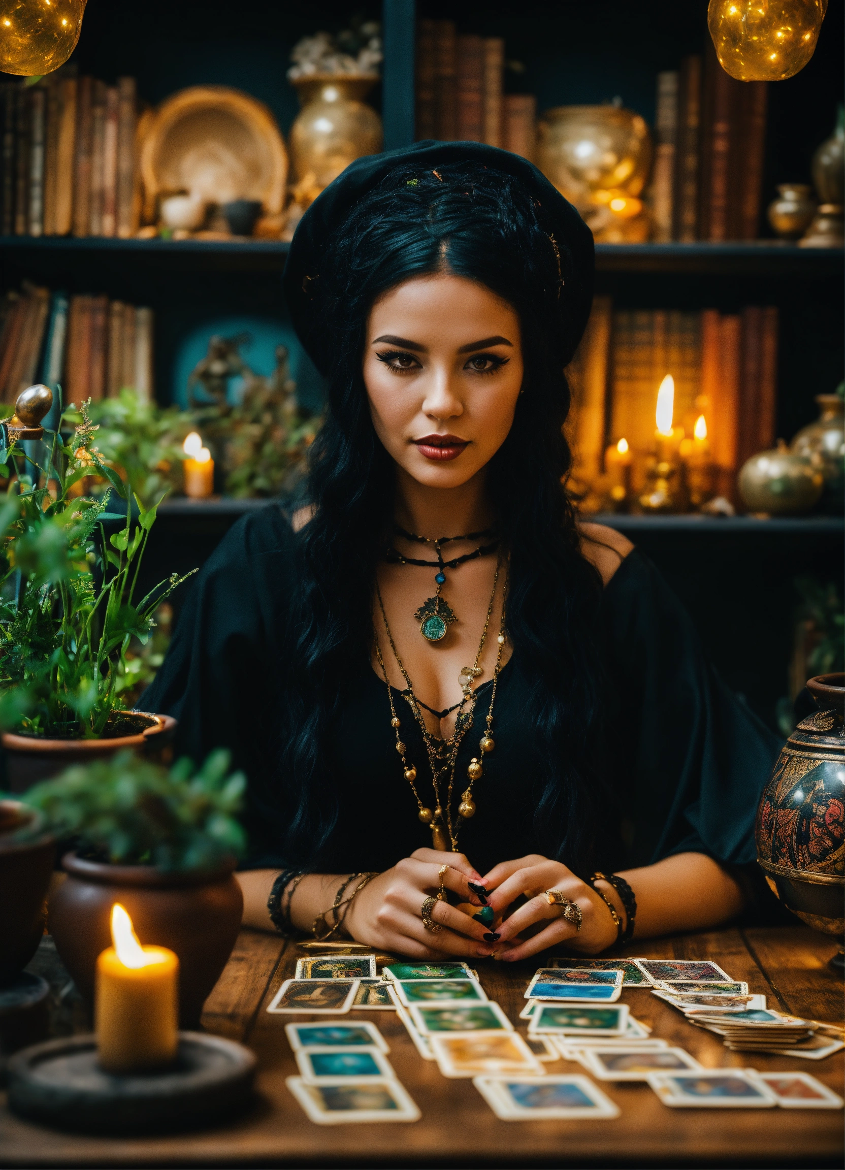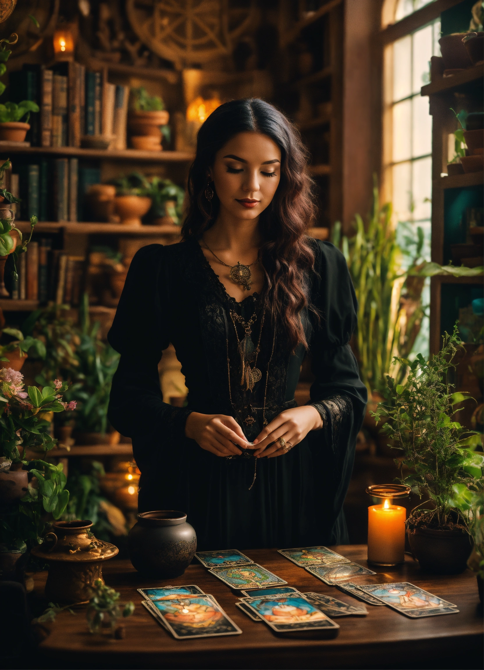 Eye-catching colors. fantasy fortune teller witch dressed all in black, looking at tarot cards on the table, with a tarot card in her right hand, inside a magical room with pots of plants surrounding it and light coming through. bookshelves behind her.