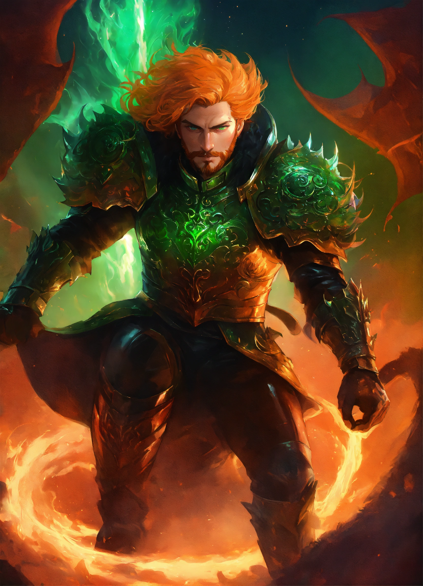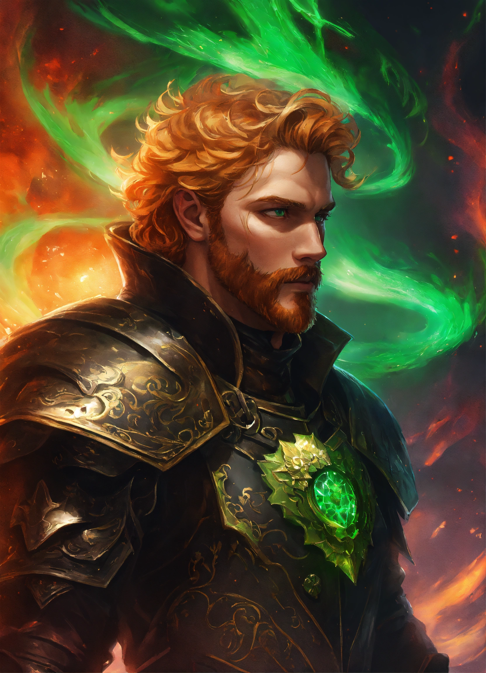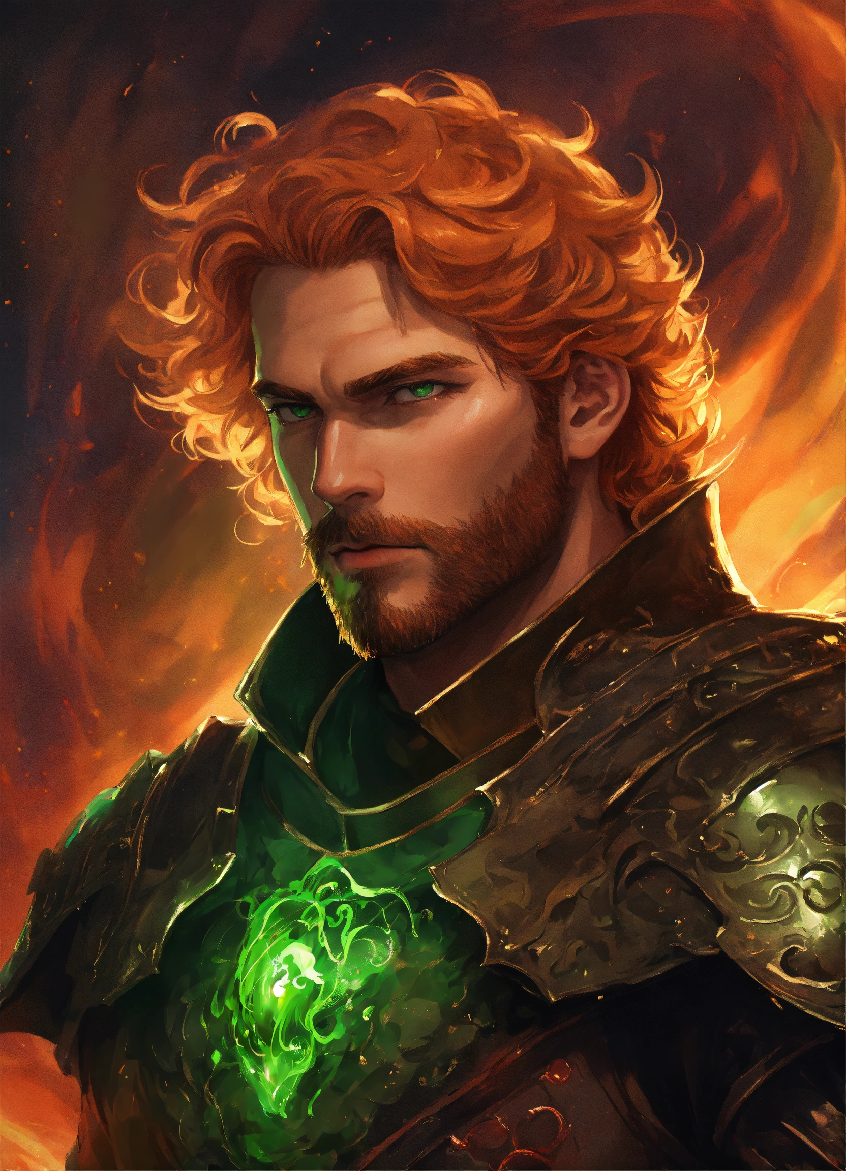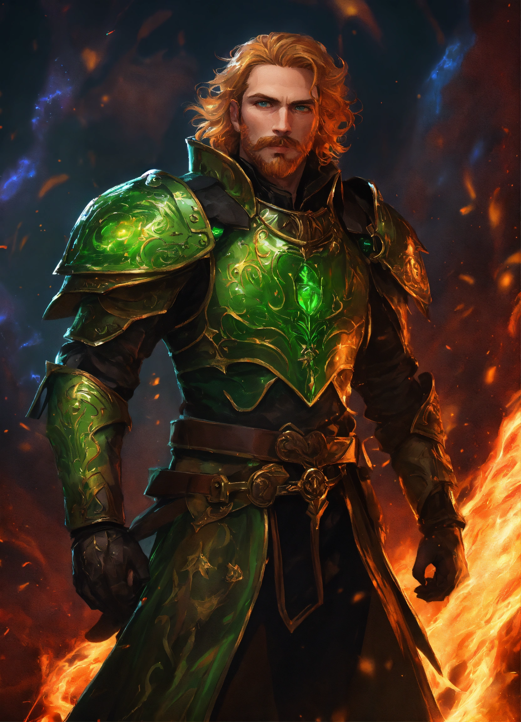 The king of hell. male with a rounded jawline, bright green eyes, and wavy strawberry-blonde hair that flows down past his shoulders. he is in his 40s with stubble facial hair. he is wearing black leather armor with a fur collar. he stands in hell with a cosmic swirl around him. d&d, fantasy, cinematic.