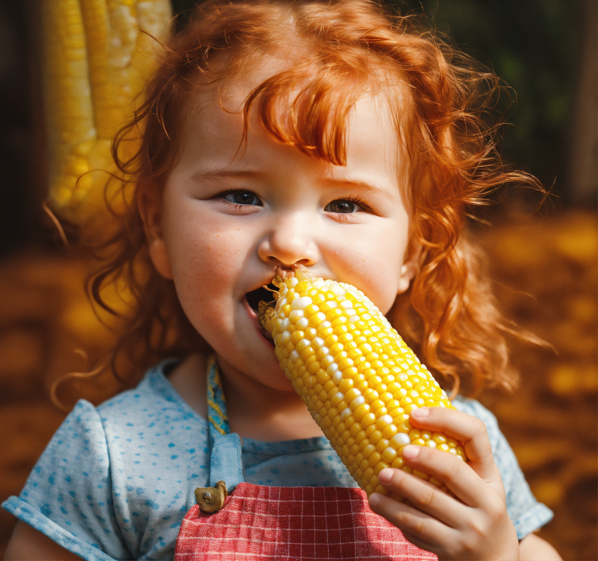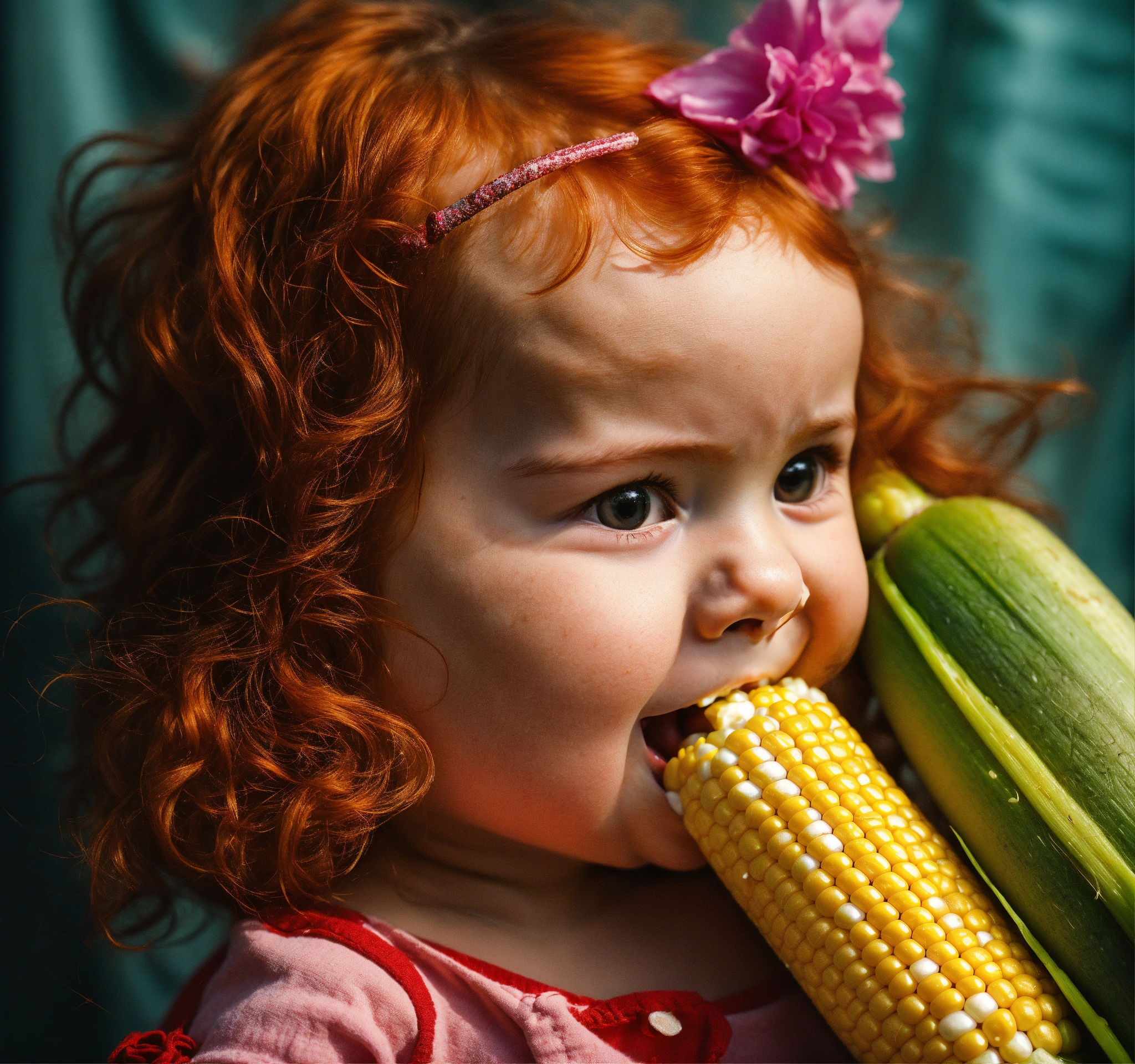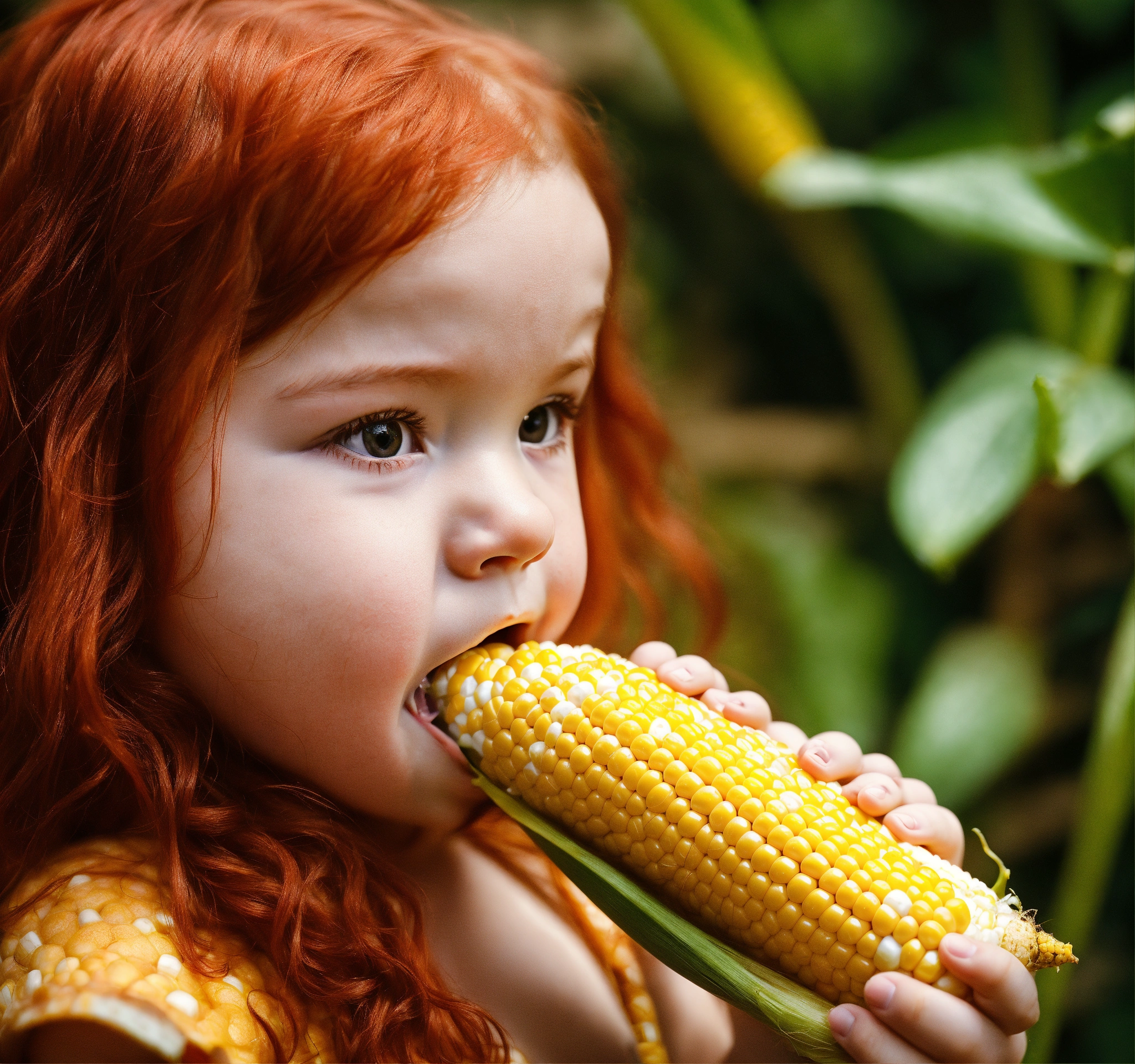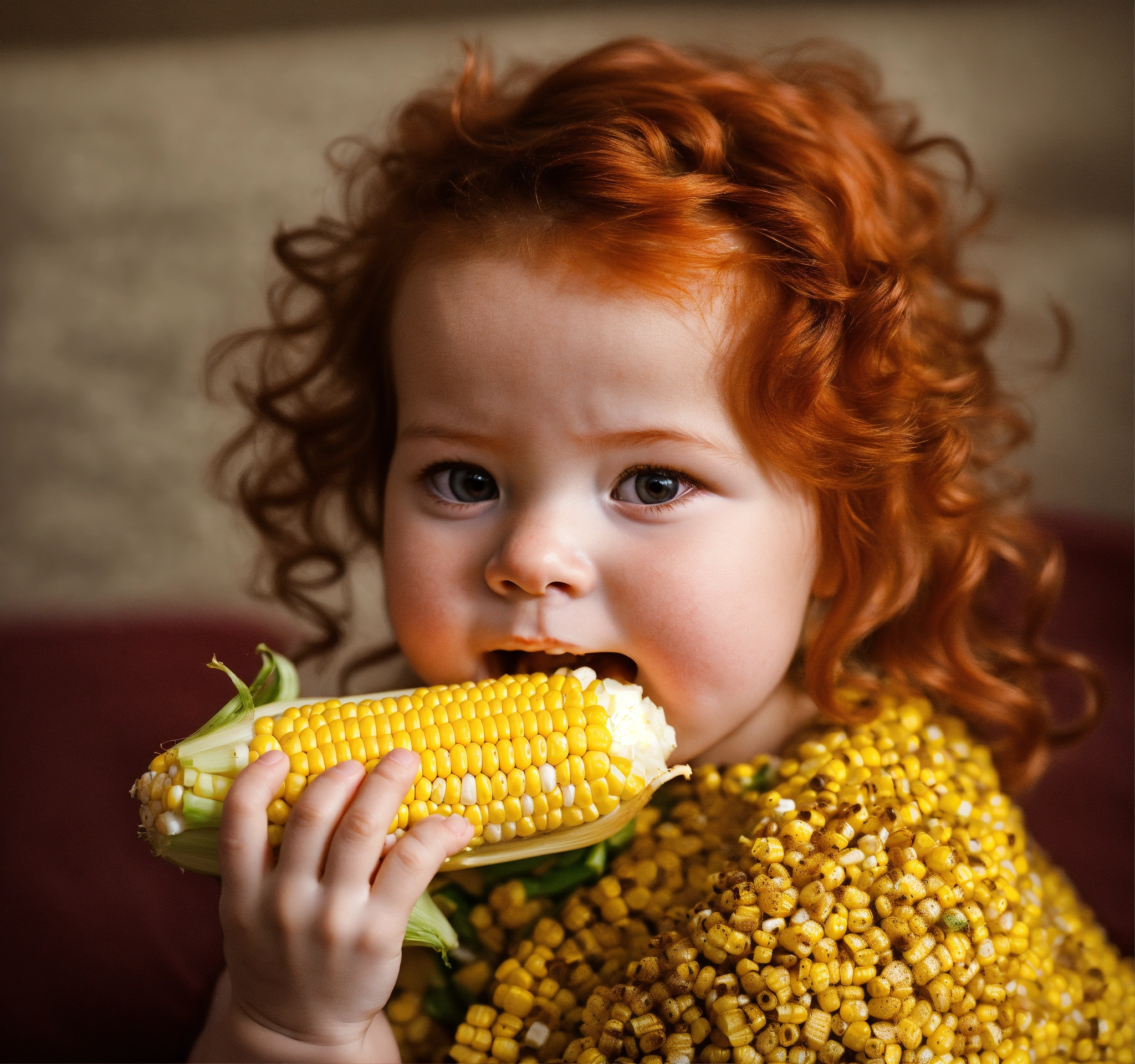 A red-haired baby girl with a corn on the cob sideways in the mouth