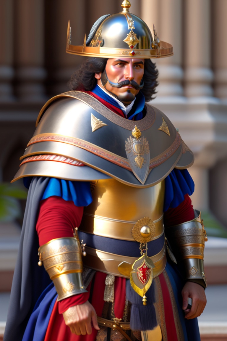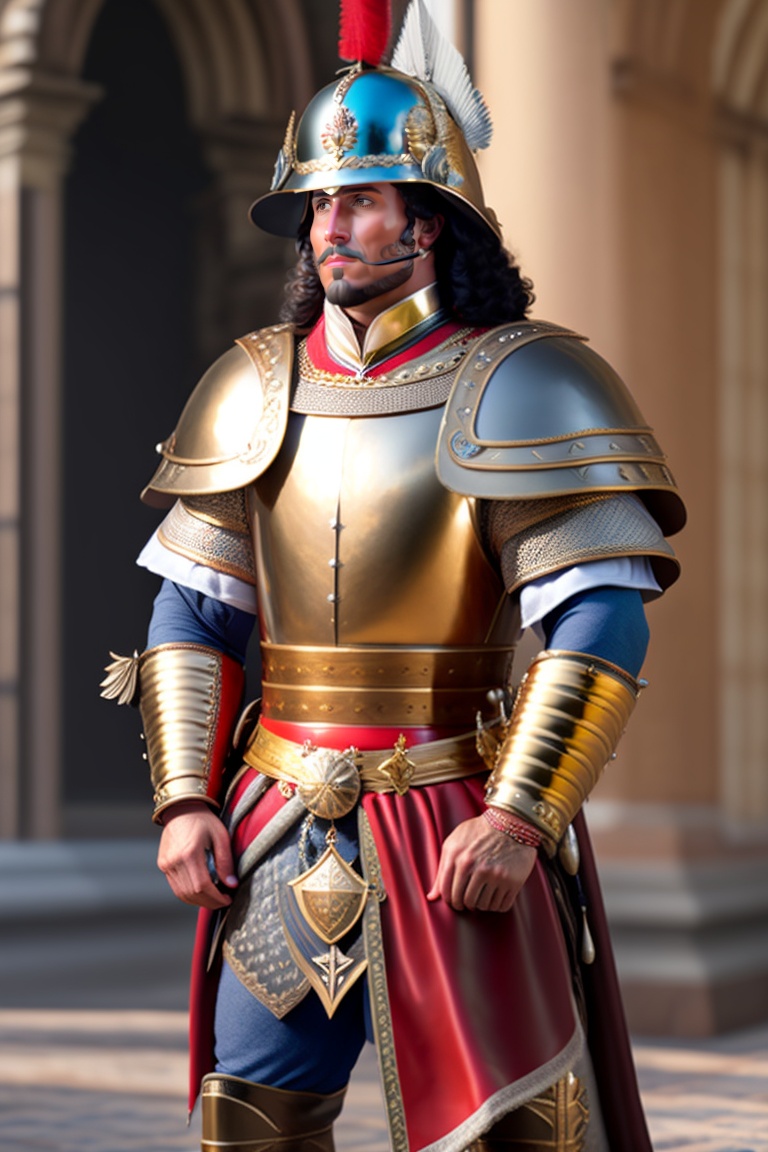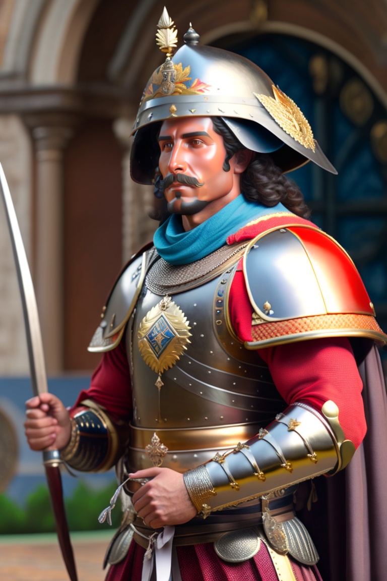 4k, hyperrealistic portrayal of juan de cavallón y arboleda, the spanish mayor of nuevo cartago and costa rica. cavallón is shown in full spanish conquistador armor, his face under a metal helmet reflecting resolve and ambition. one hand rests on the hilt of a spanish rapier, while the other holds a document, symbolizing his administrative role. the digital artwork captures the spanish influence on the era, with attention to detail on the armor and clothing typical of 16th-century spain.