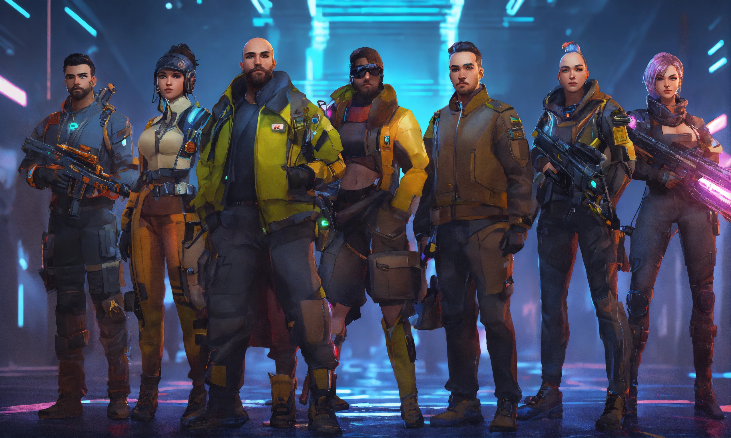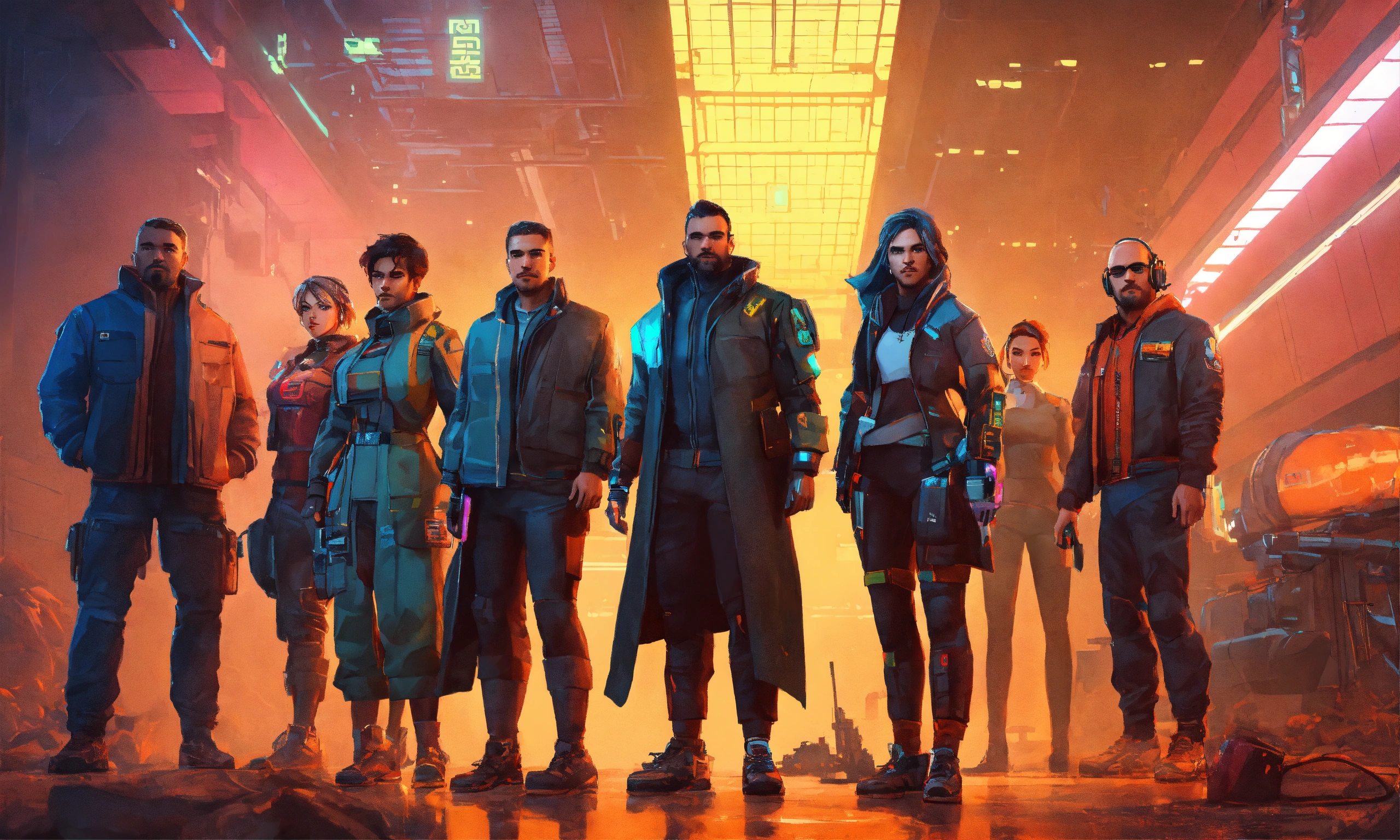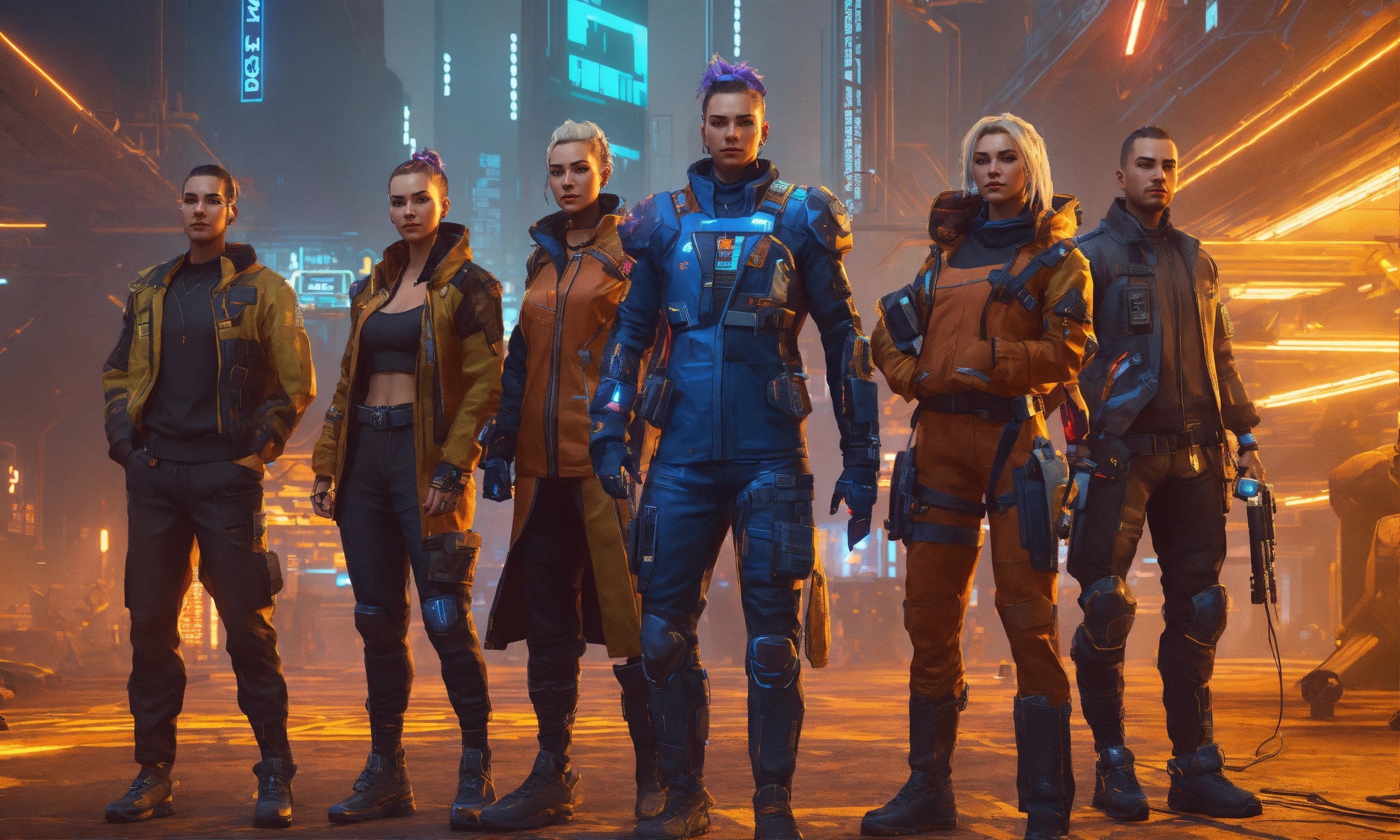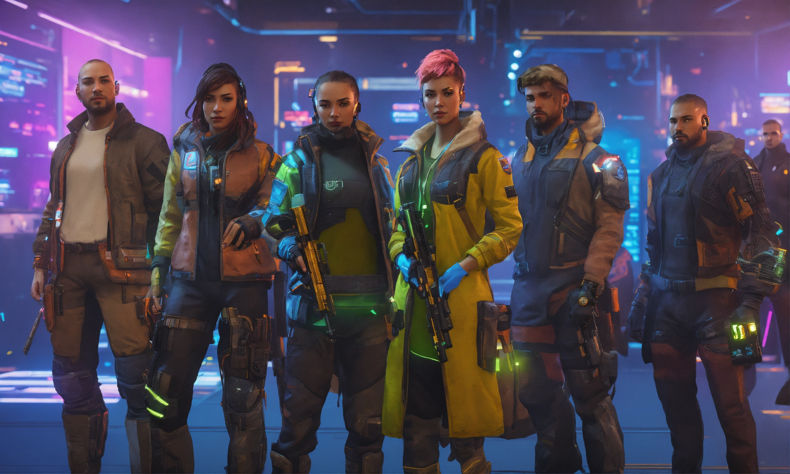 Startup dream team, indie devs, artists, boss ceo center, game characters, workforce, lineup of people, diversity, future, cyber punk, 2077, 4k, highly detailed, artstation