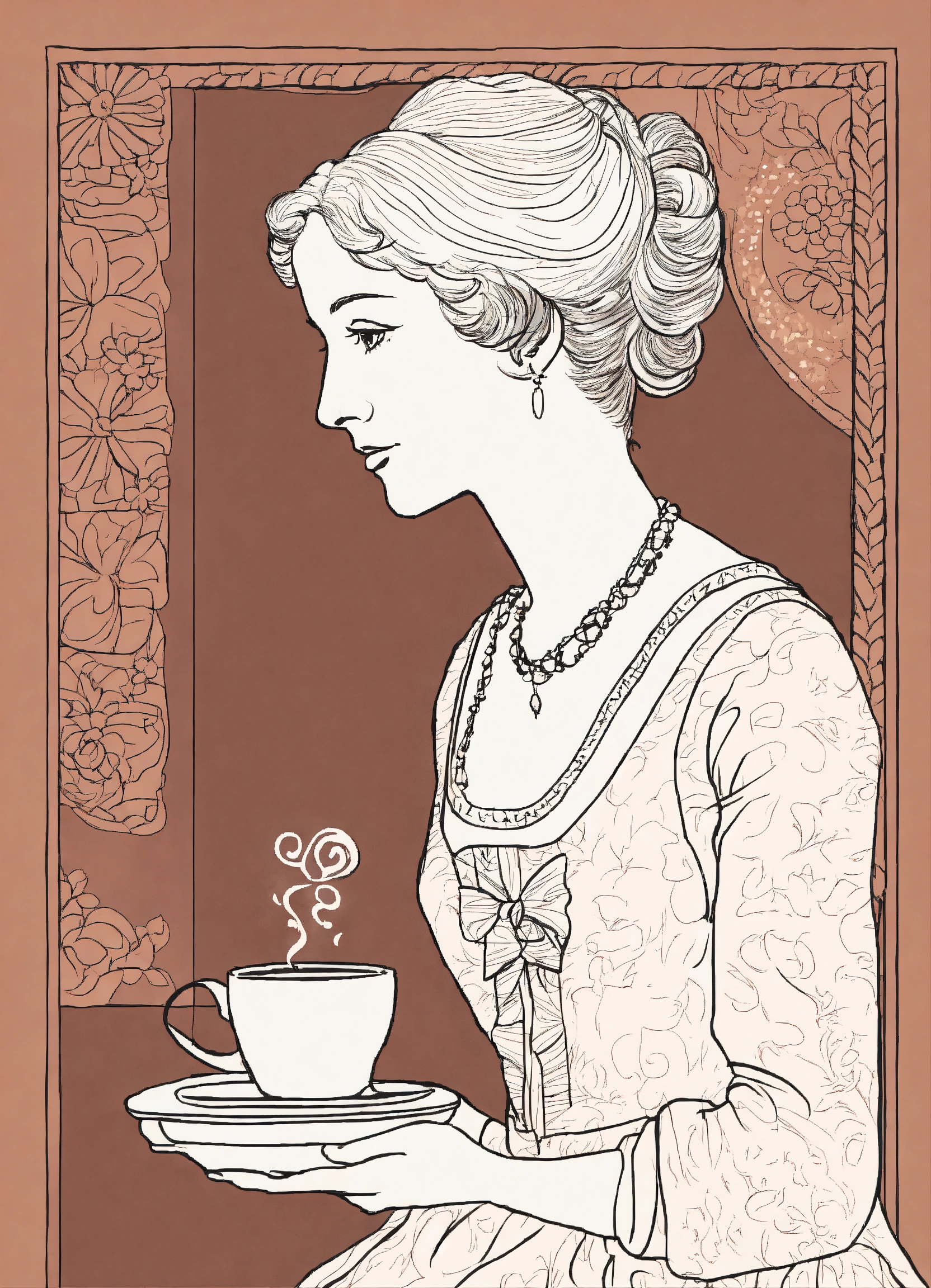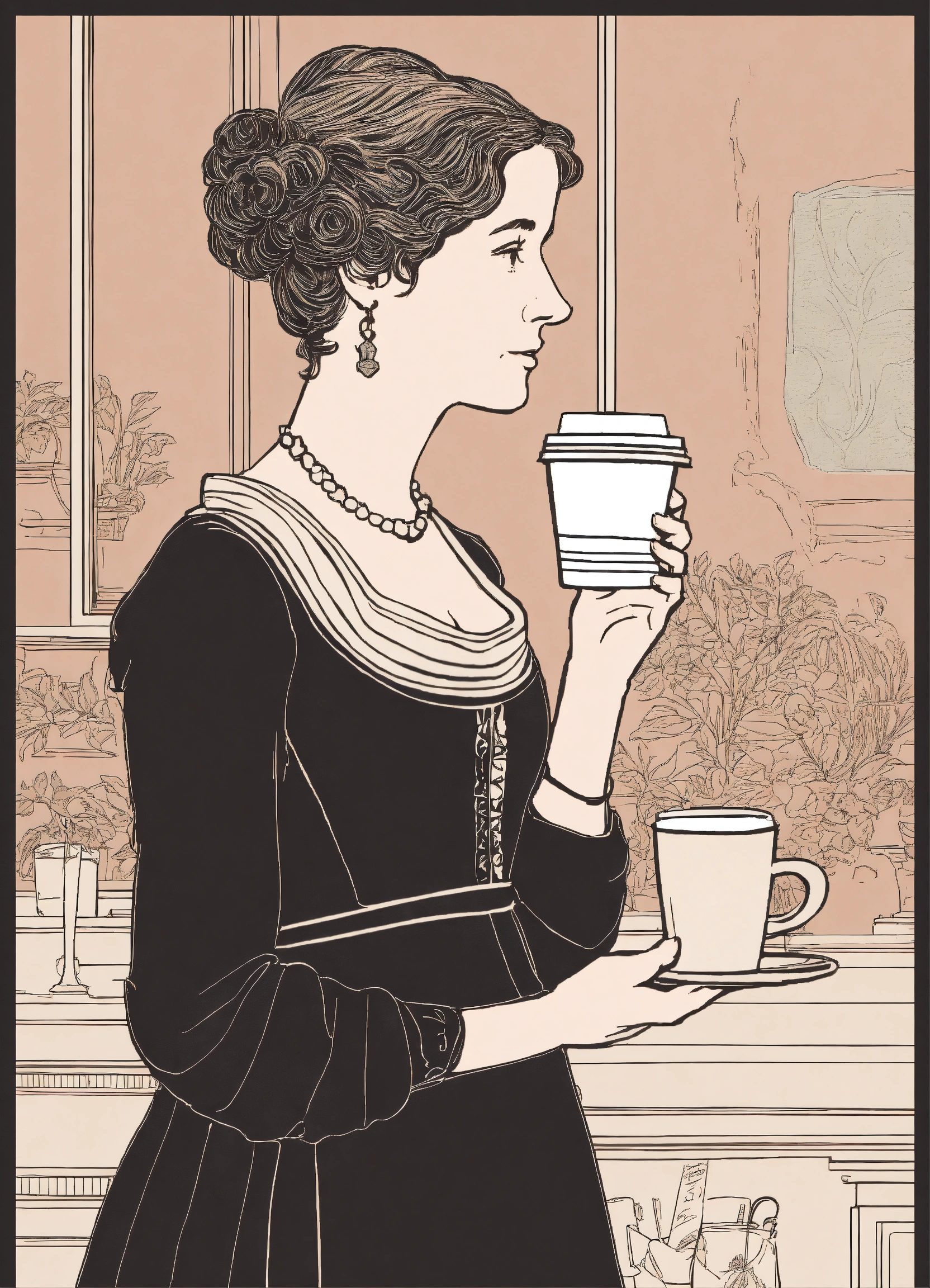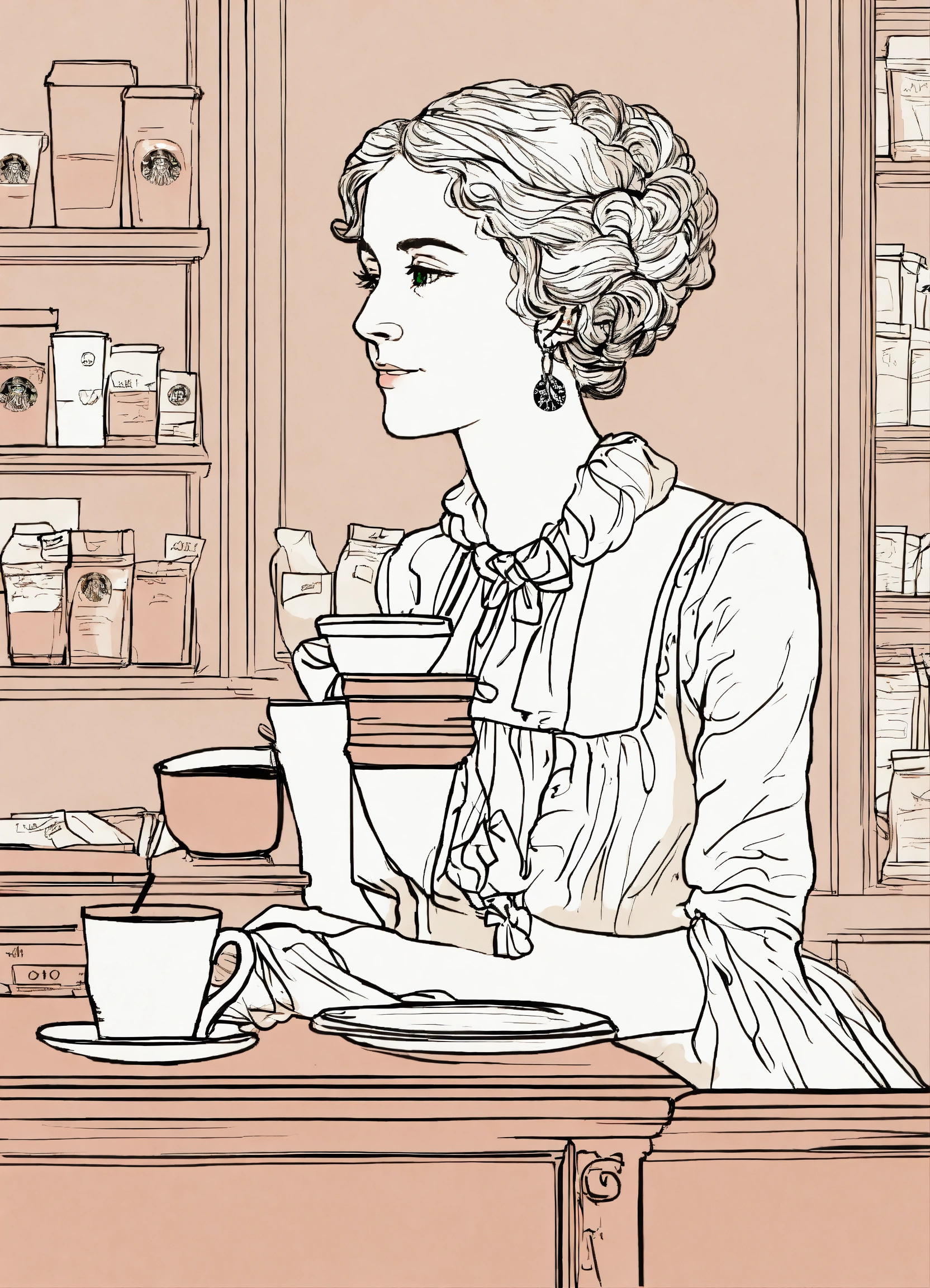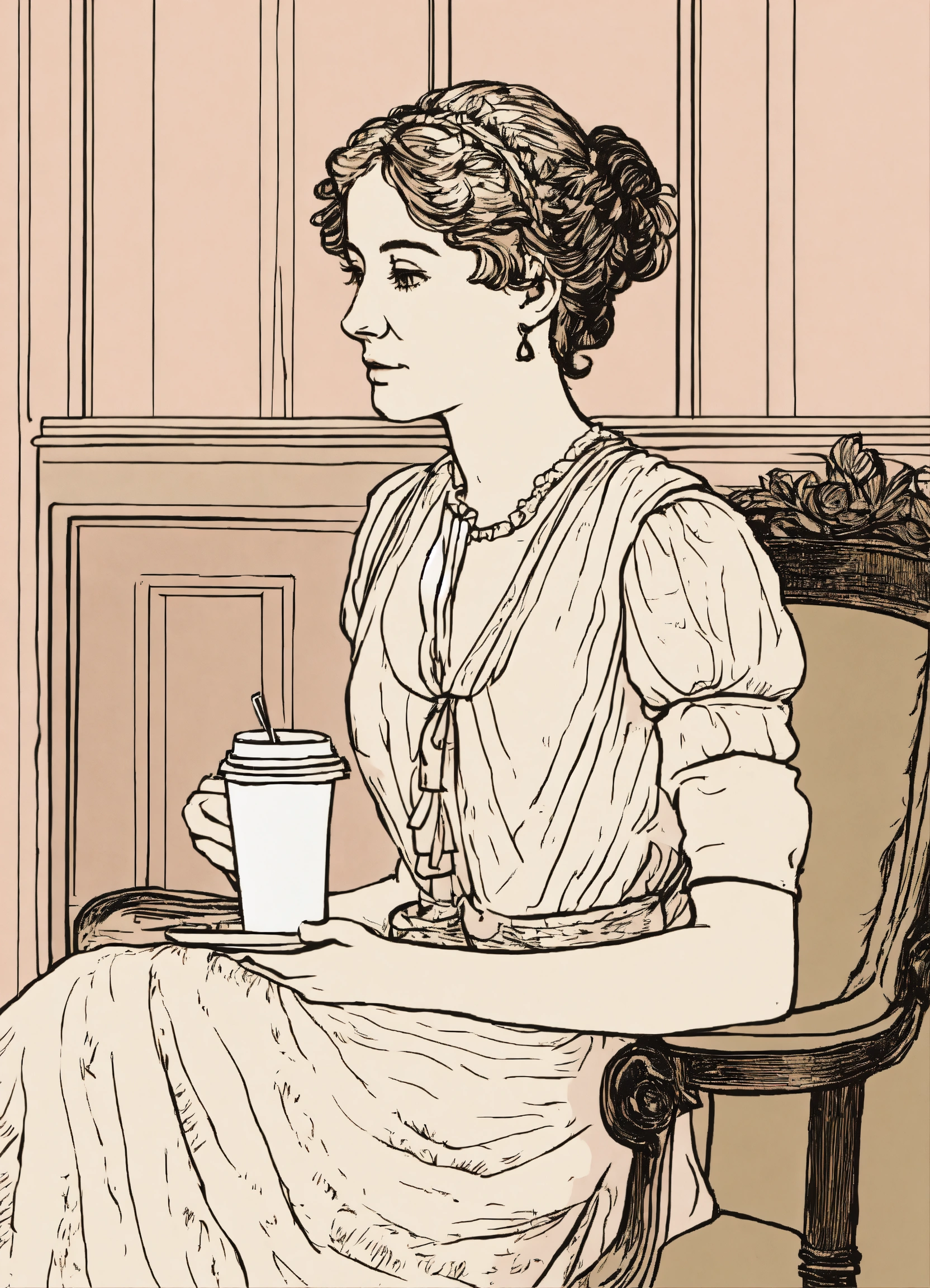 Jane austen sipping a large starbucks coffee line drawing minimalist