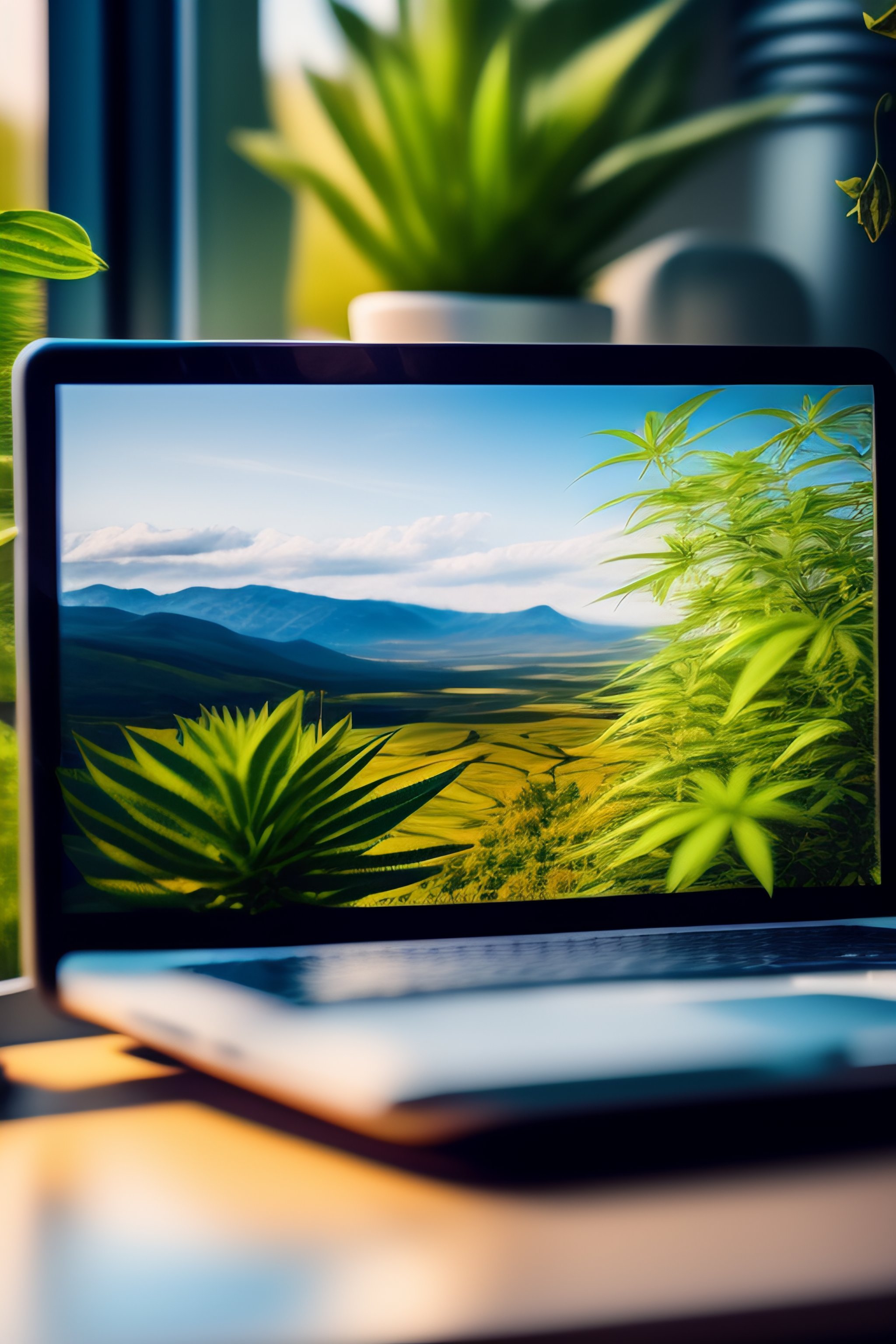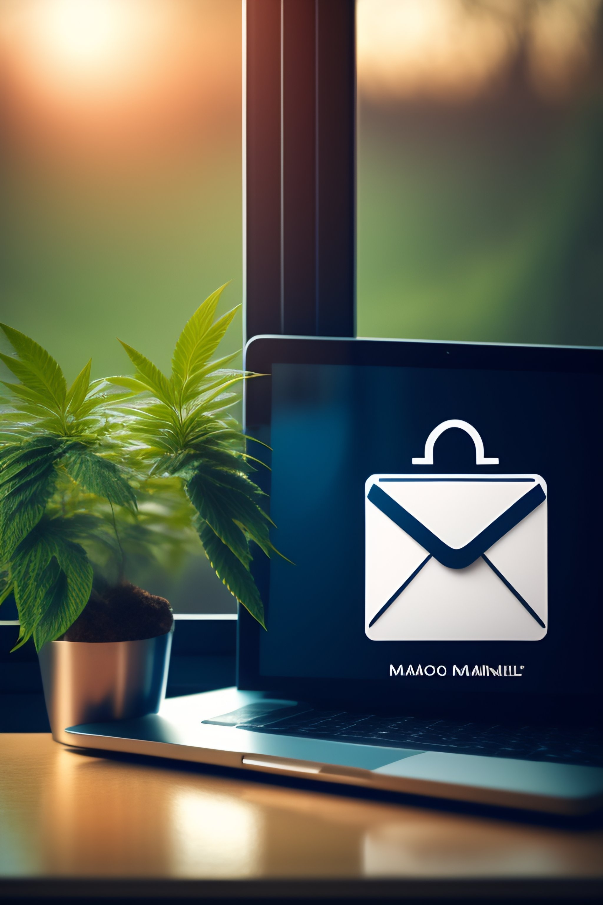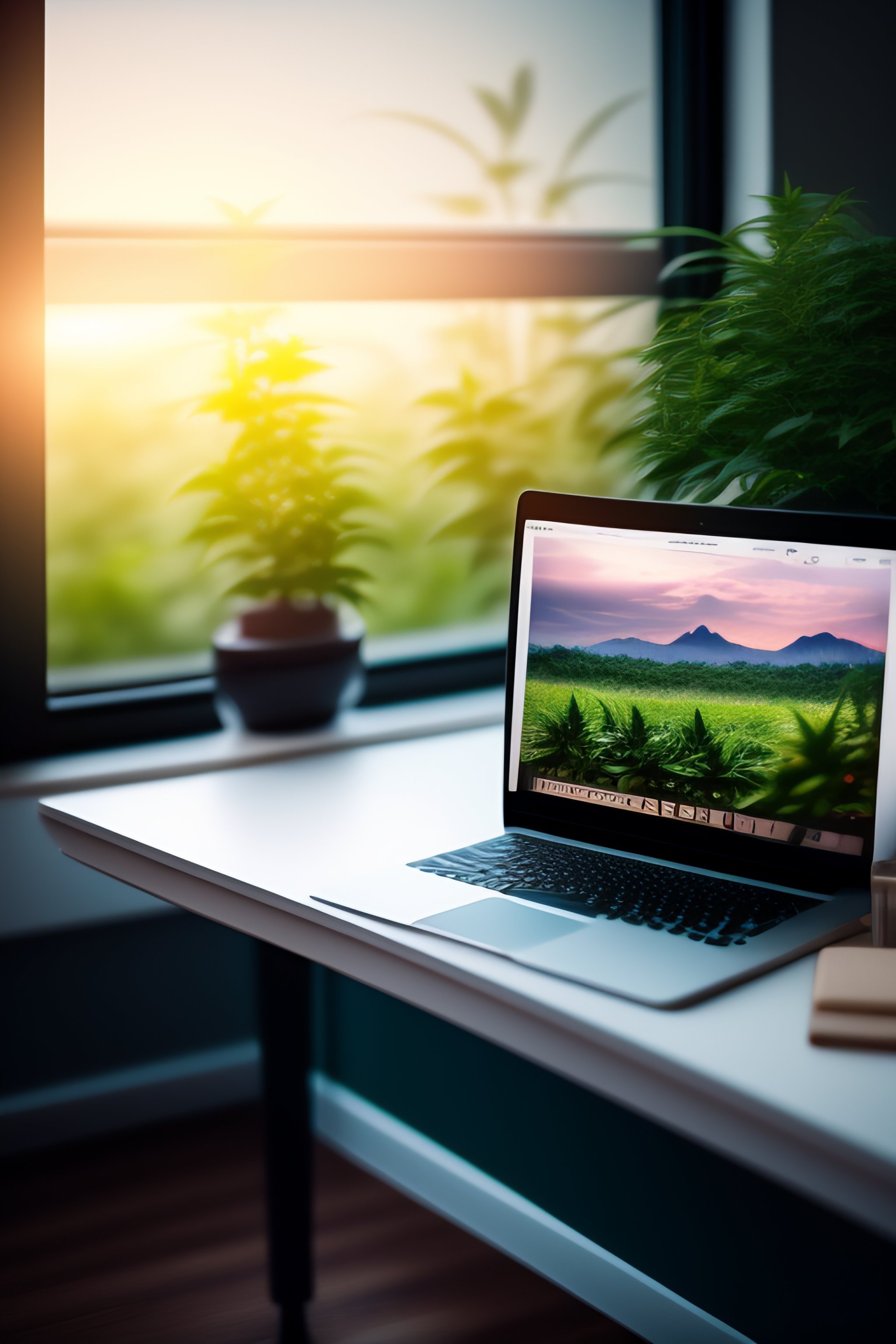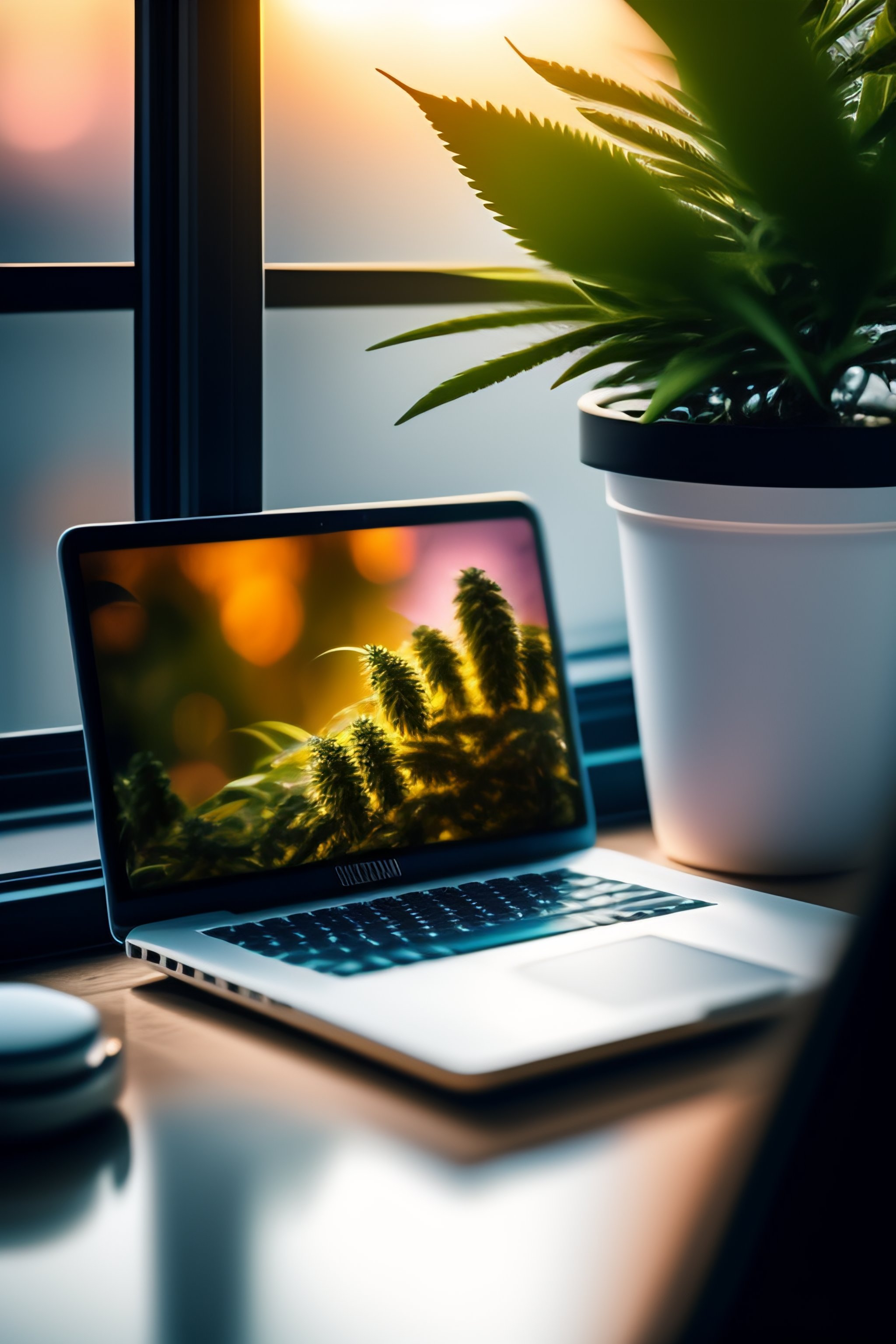 Detailed photo of email marketing laptop sitting on a desk next to a window, marijuana plant next to laptop