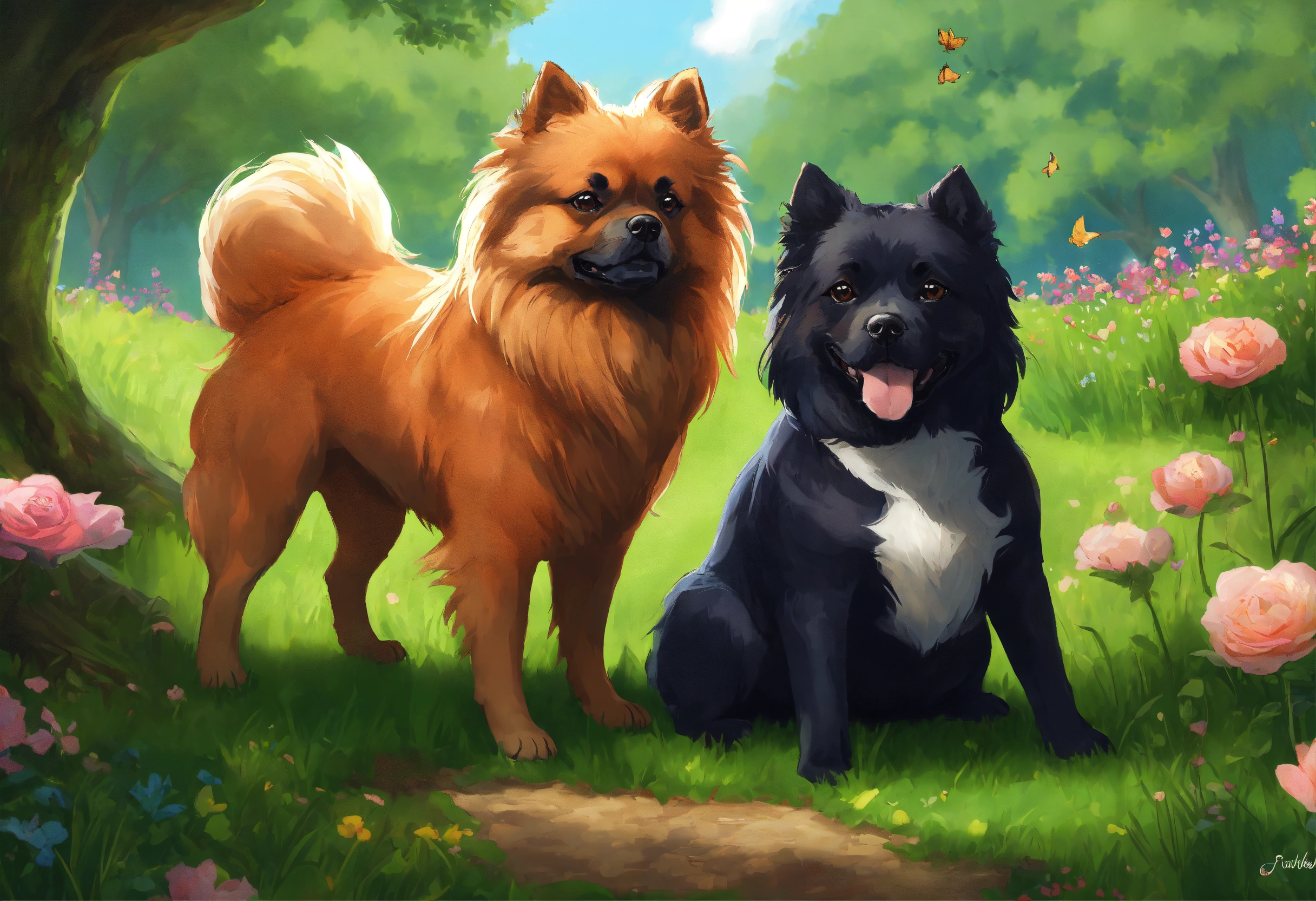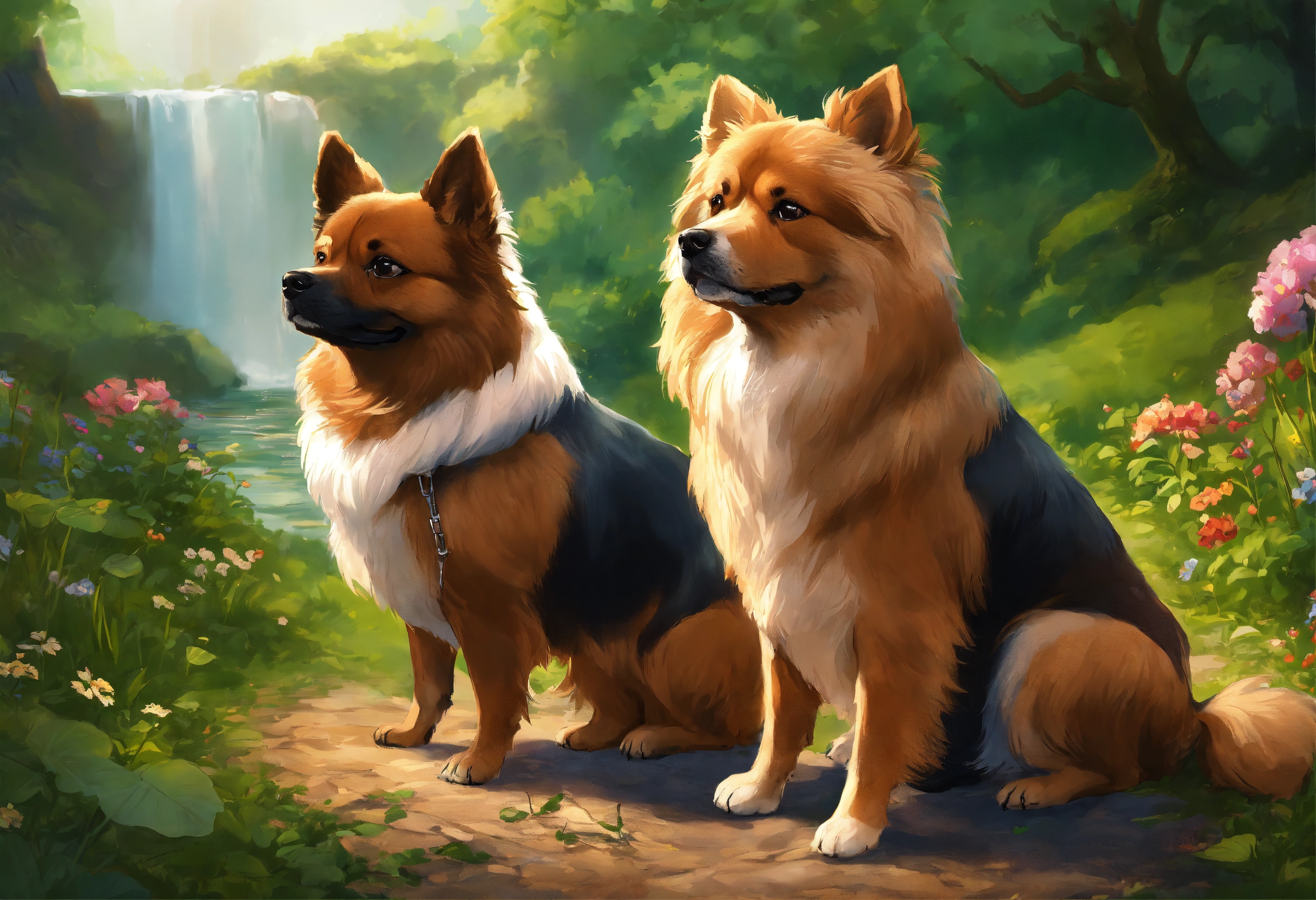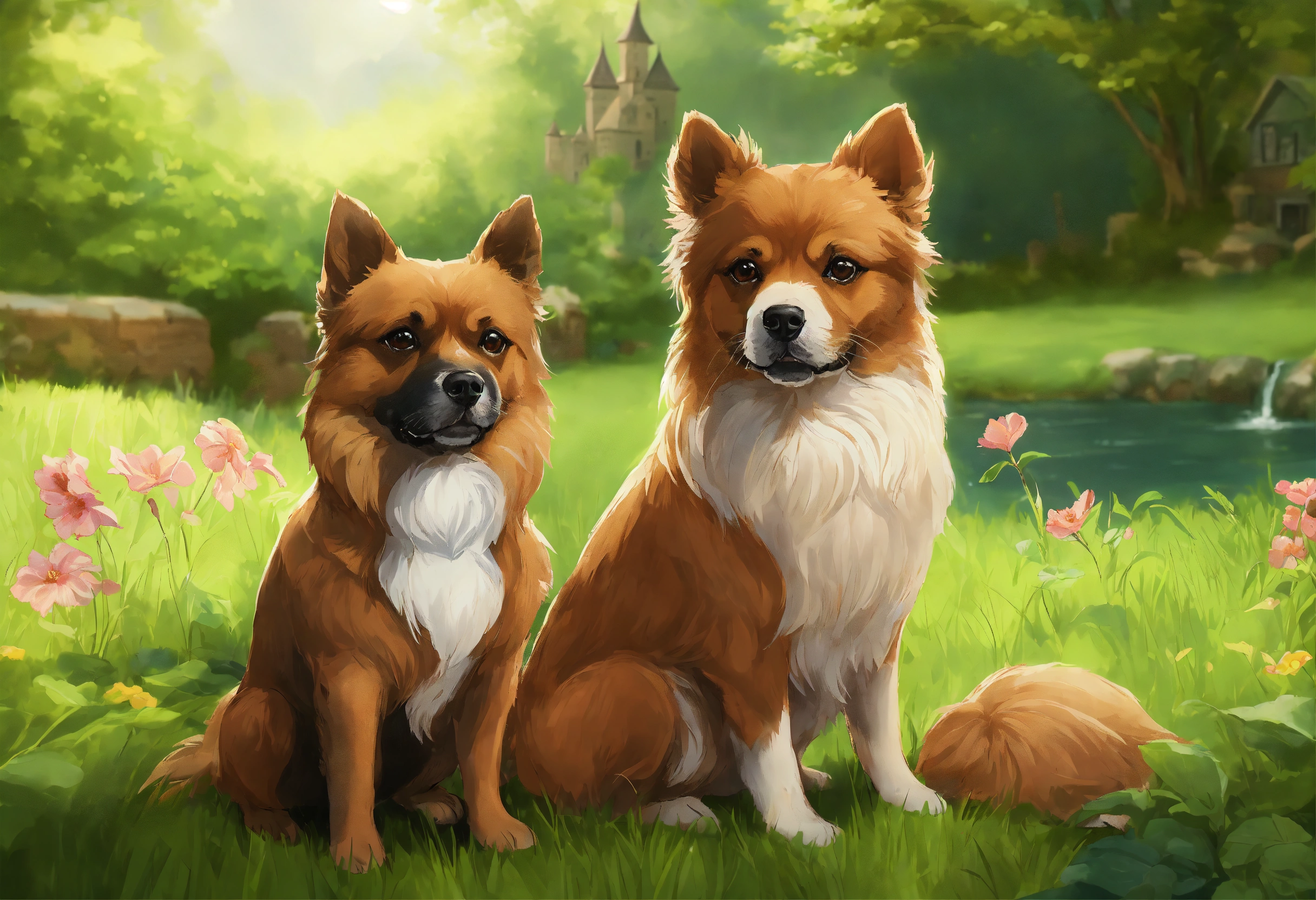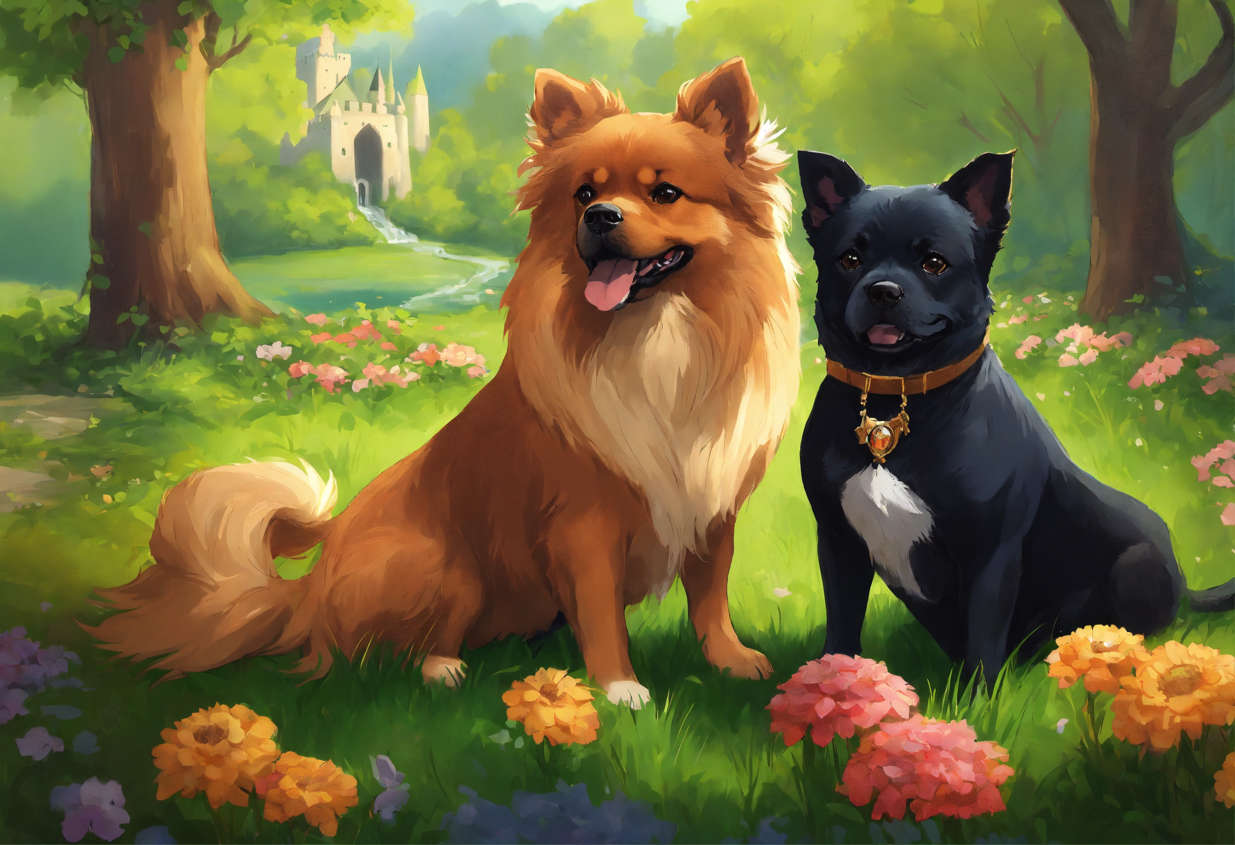 In a beautiful, lush kingdom, generate an auburn-colored pomeranian and a black staffordshire bull terrier side by side, with the two dogs holding each other's paws. in the picture, they should be looking towards us from the middle of a green meadow. the pomeranian should be dressed in a princess fluff costume, and the background should feature a castle perched above a dangerous waterfall. the castle should have large colorful windows and ivy covering its arched facade.