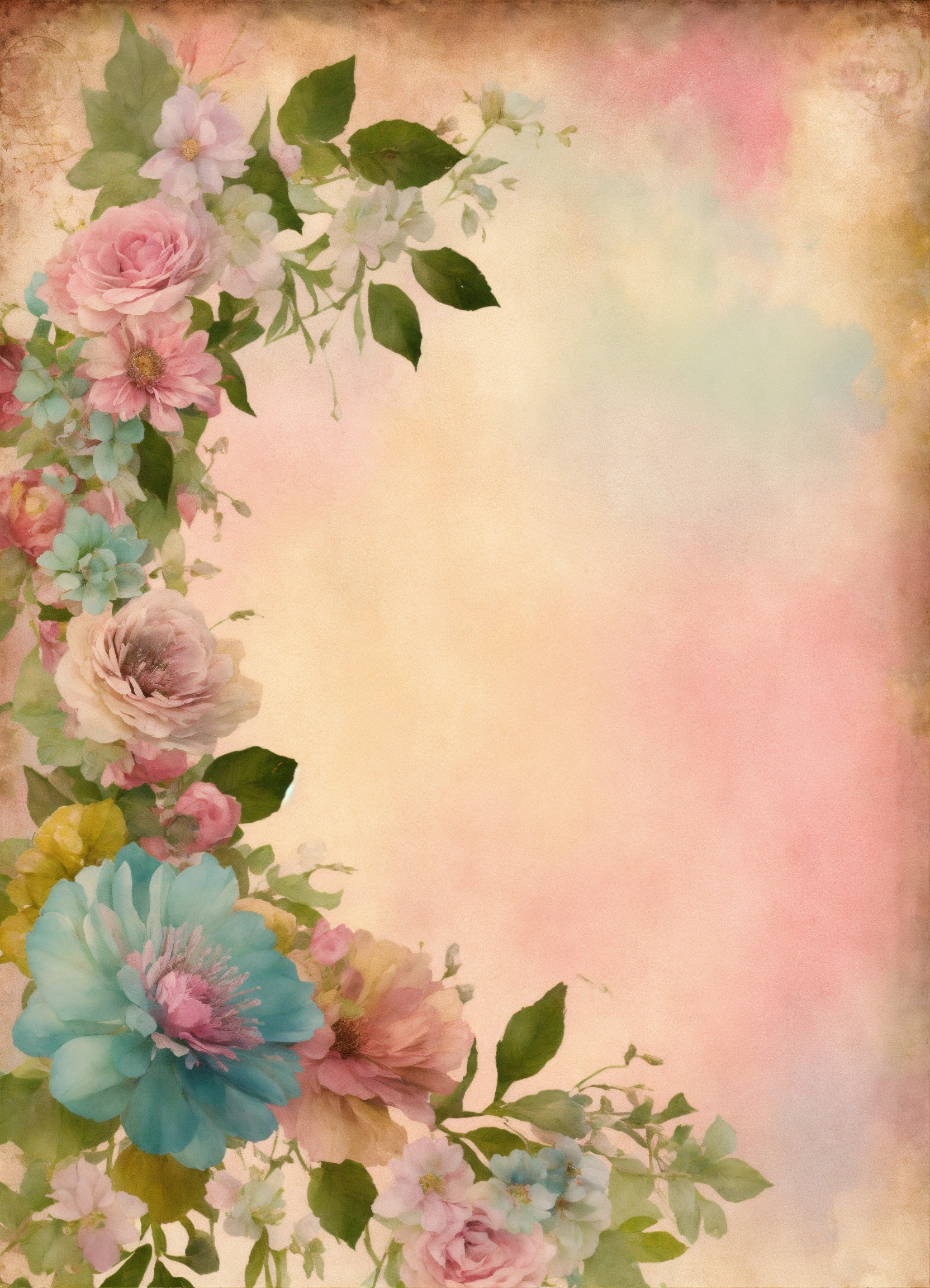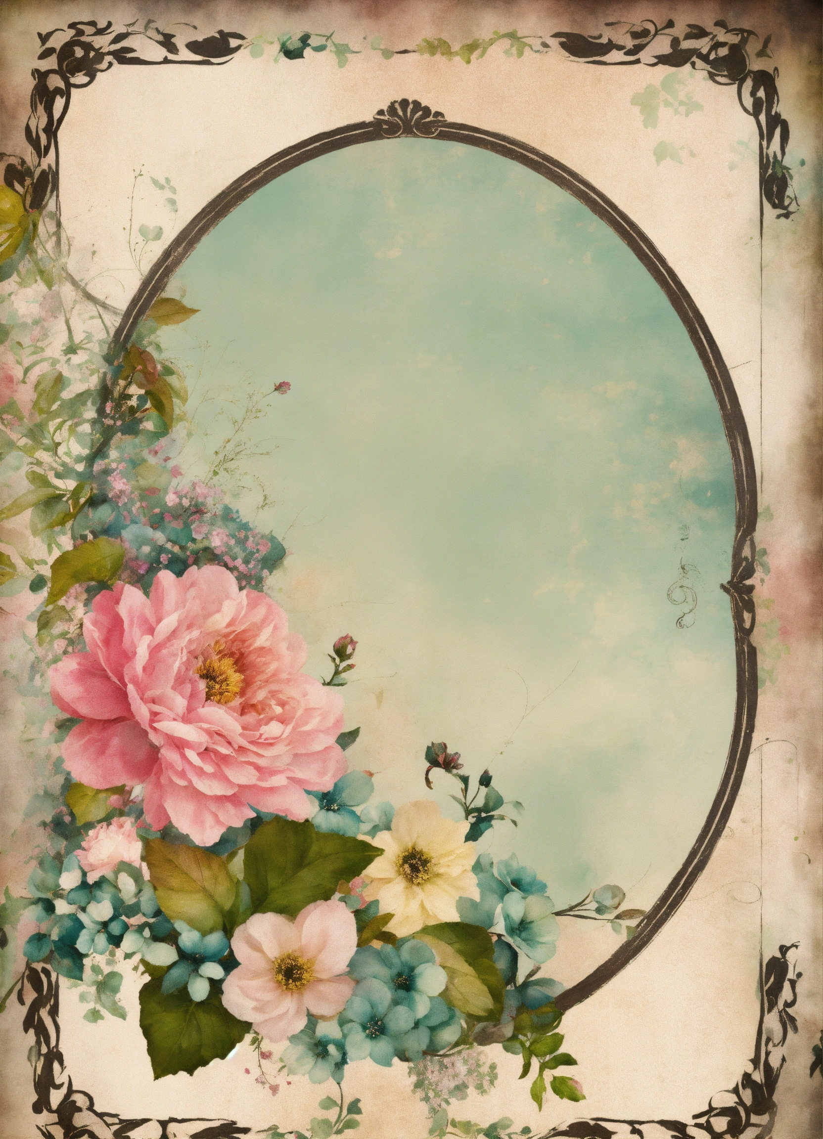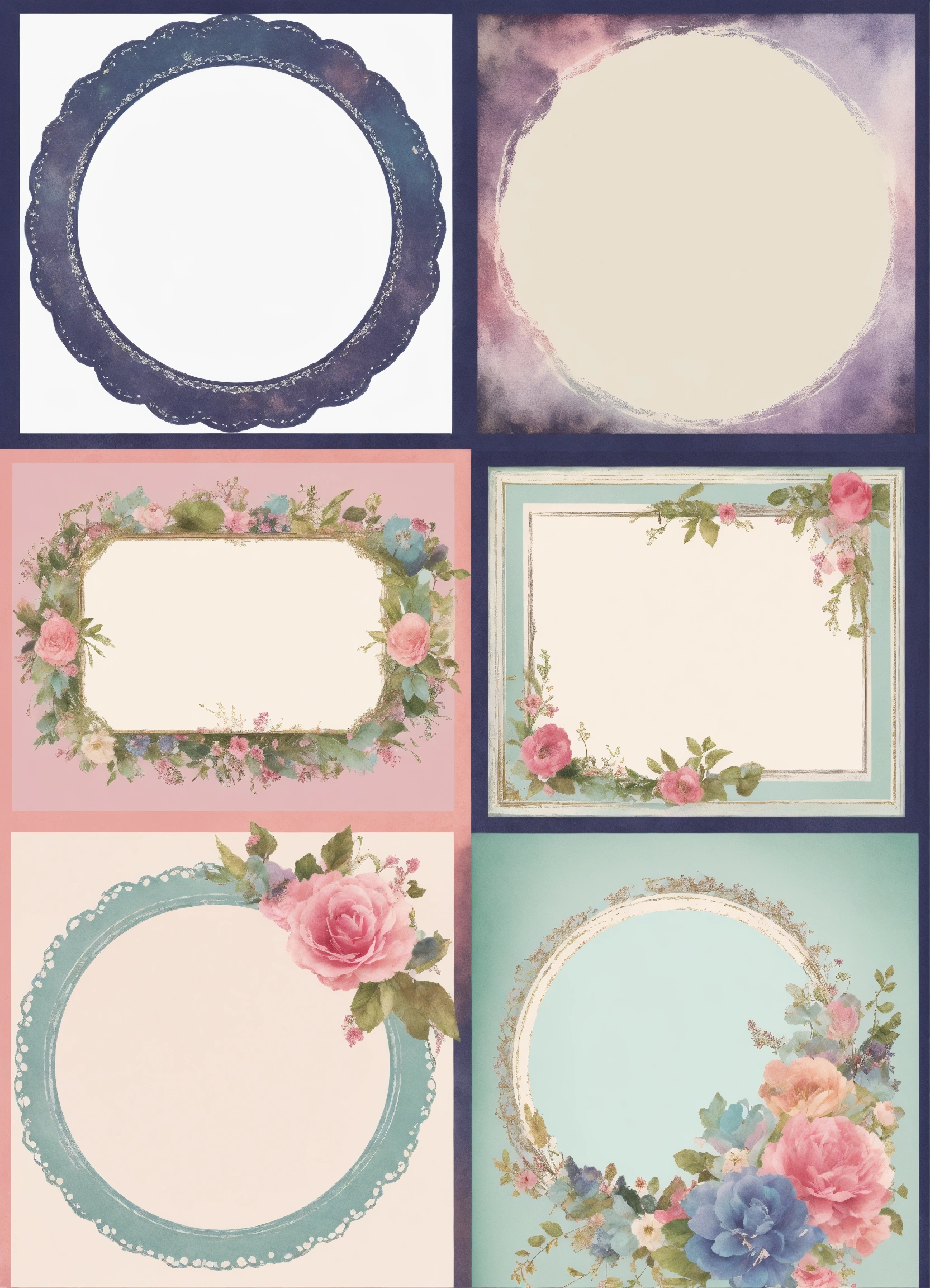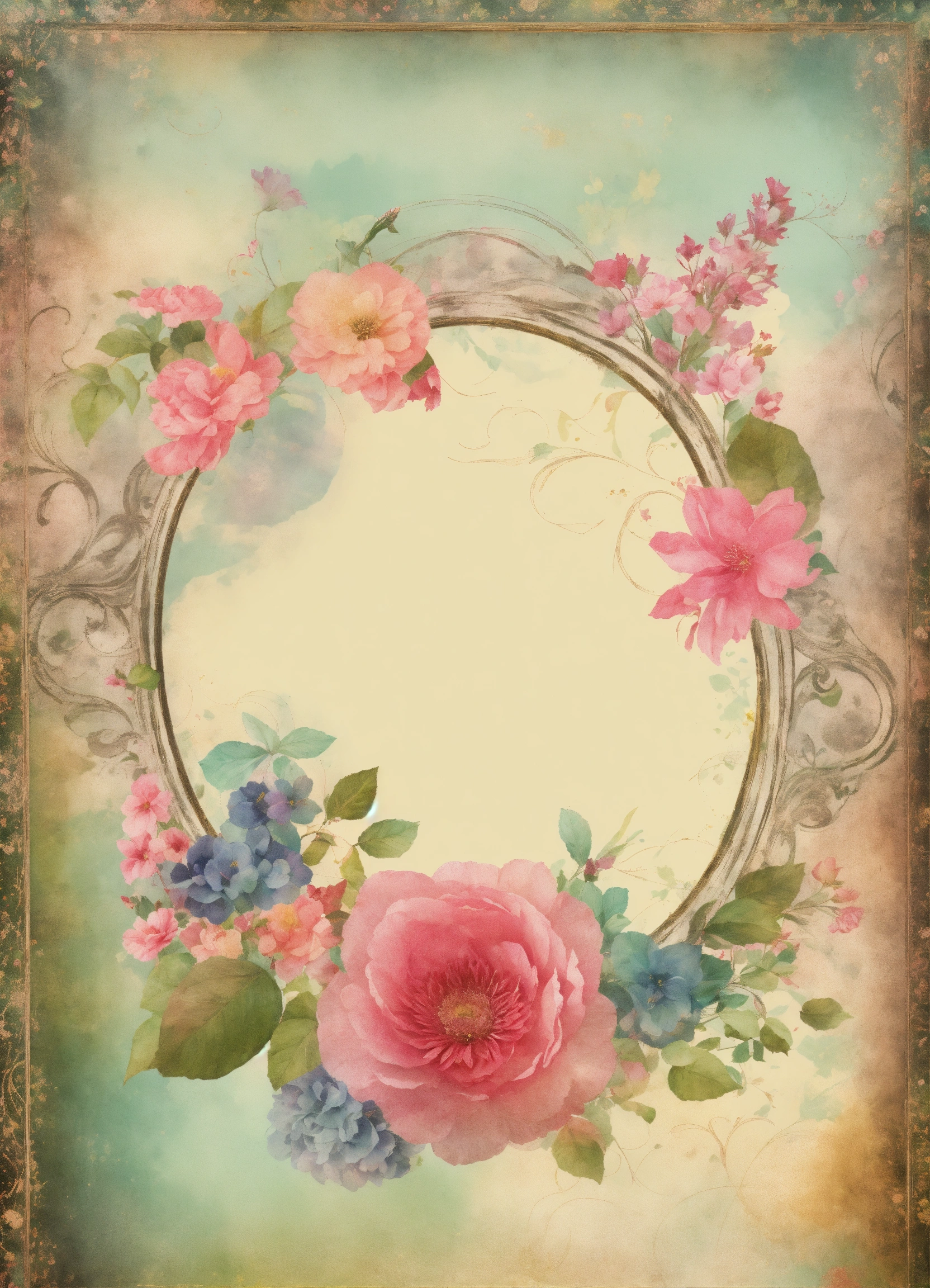 Shabby chic dreamy mist pastel junk journals "generate ten unique wreath frames with a dark floral theme for a junk journal kit. these frames should be printable and suitable for use in grunge-style scrapbooking projects. each frame should feature retro flower designs and have a vintage feel. ensure that these digital frames are provided as printable, high-resolution files, and can be used for commercial purposes." swirling magical fairytale abstract art style