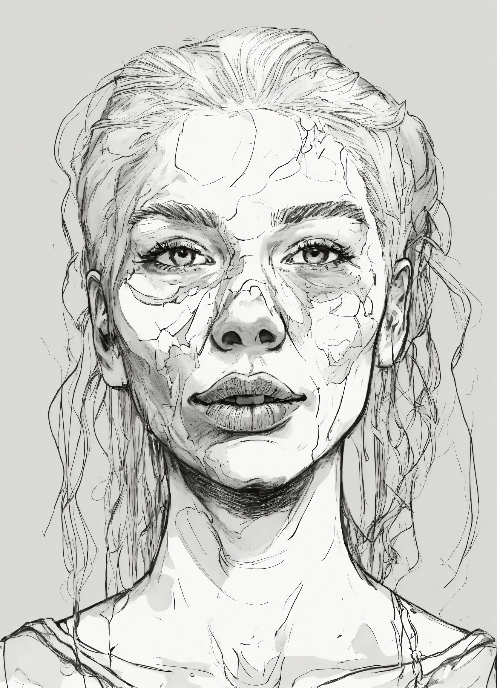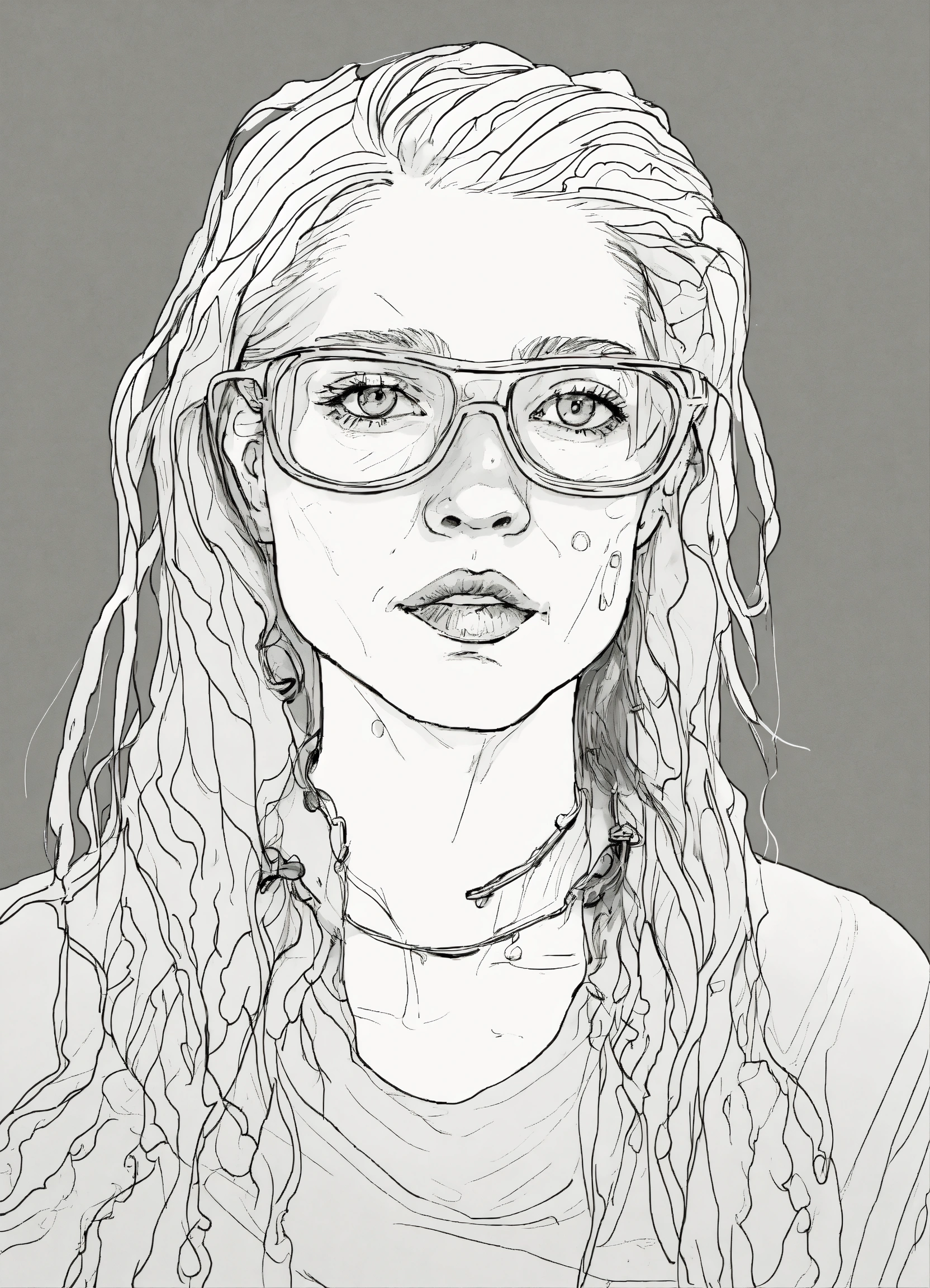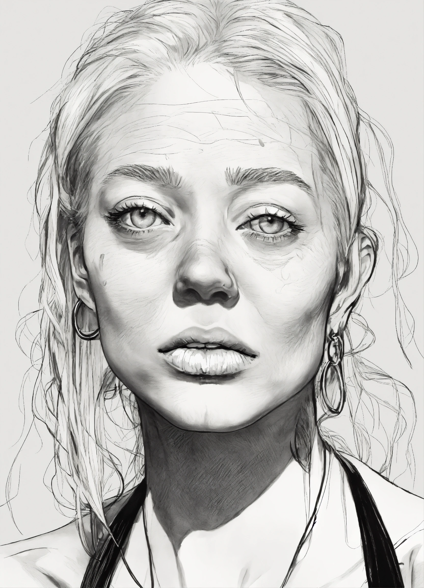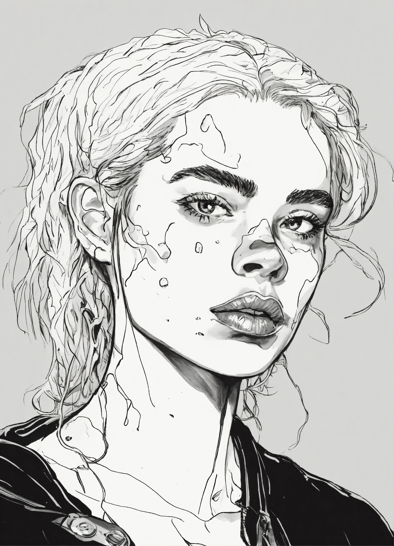 Black and white line drawing of ugly gross woman, white trash, upper body, white background, clip art, straight flat thin shiny hair, thin small lips