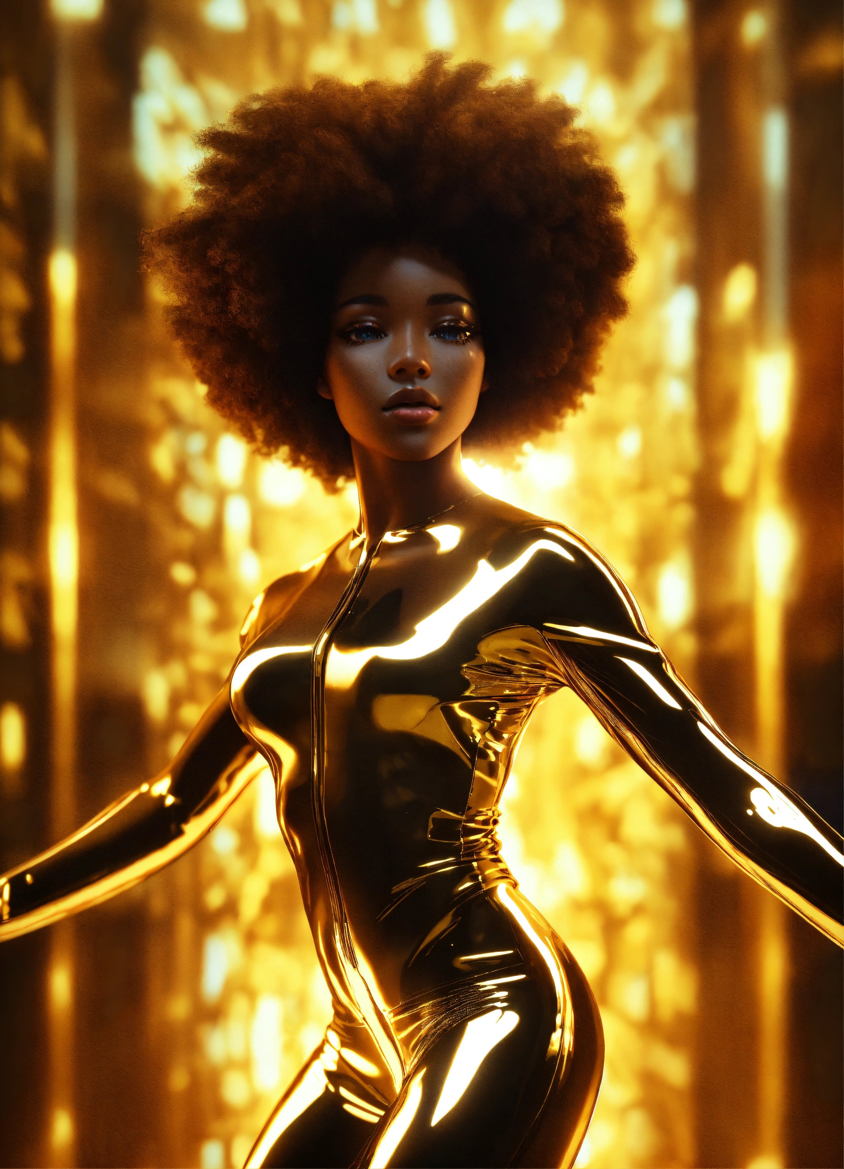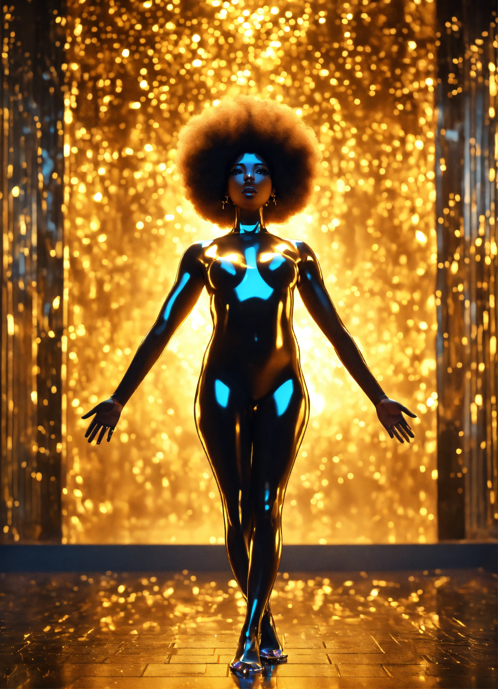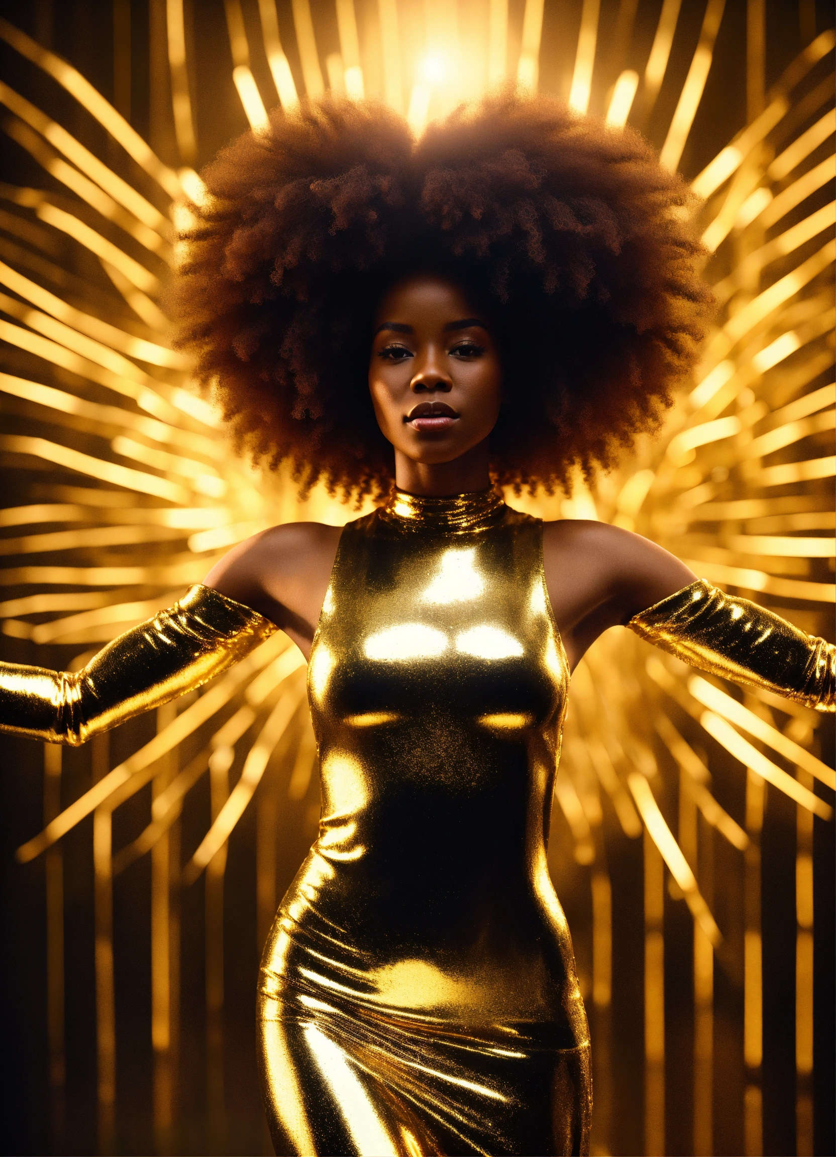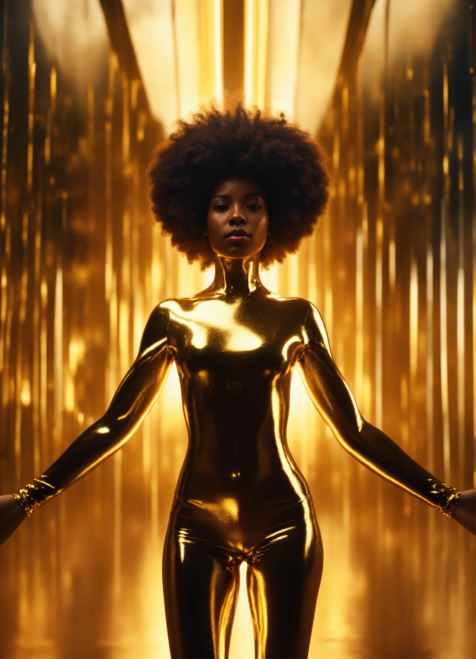 3d render of black woman with afro made entirely of glass, full body shot, standing, arms outstretched to sides in welcoming, palms up, eyes open looking directly into camera, liquid gold flows through her entire face and body, illuminating her form from within. taken on medium format camera, ambient lighting, zeiss distagon t* 50mm lens.