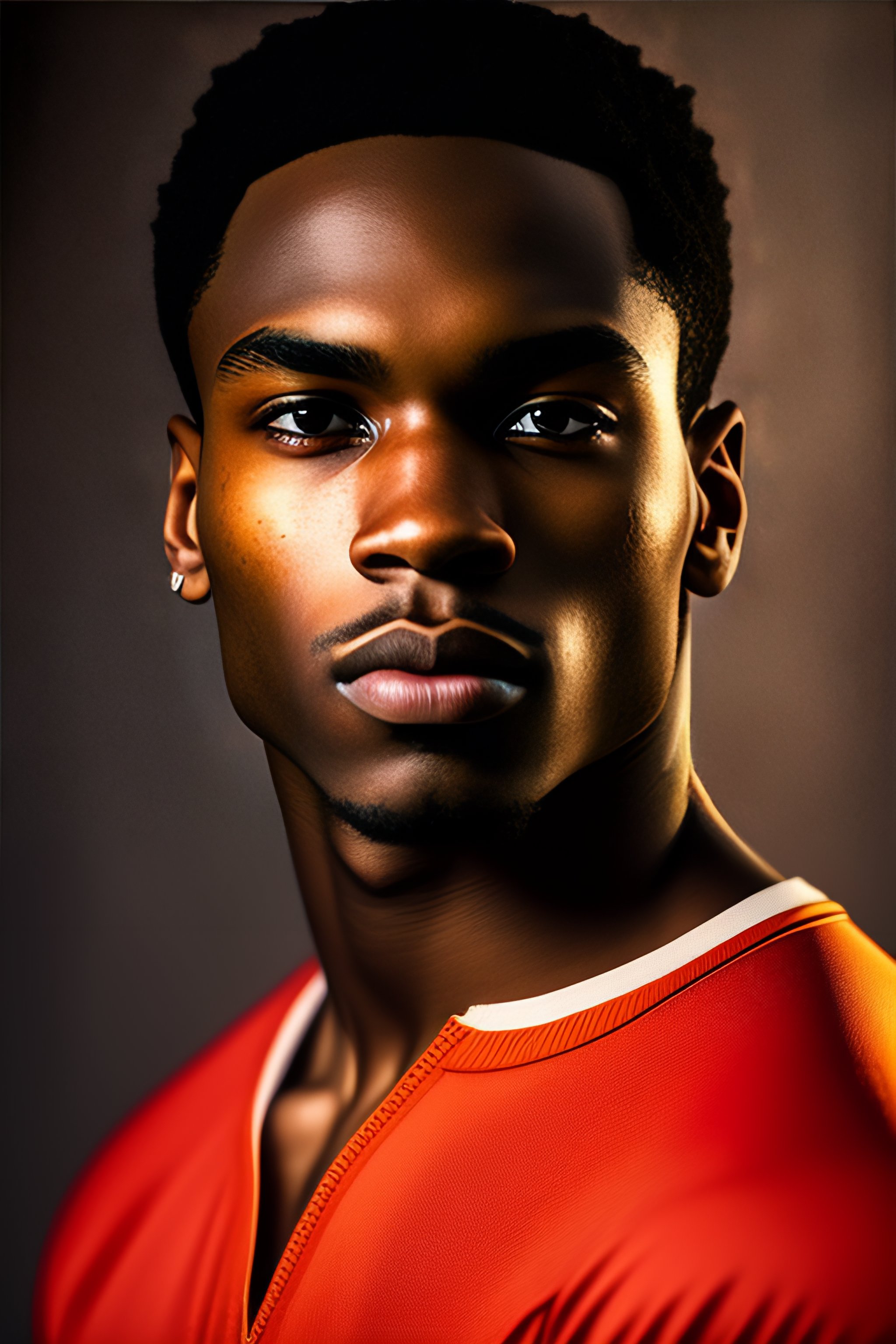 Portrait of a 20 year old black guy, not ugly, backward receding hairline, beautiful eyes, slightly babyish face, serious look, cinematic studio lighting