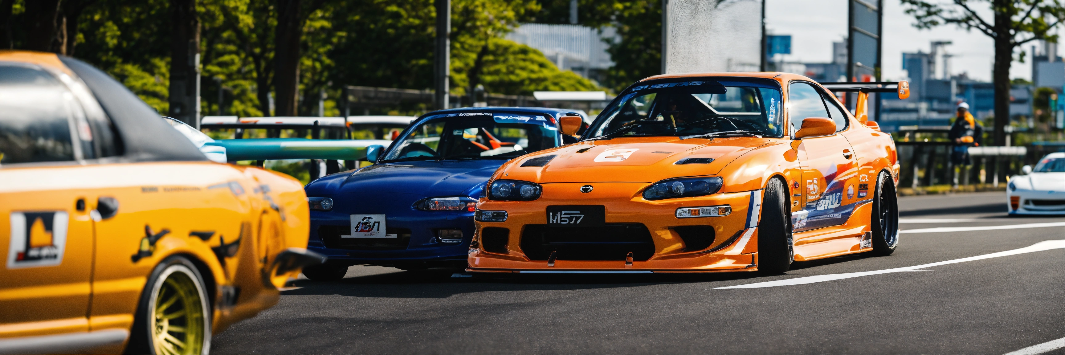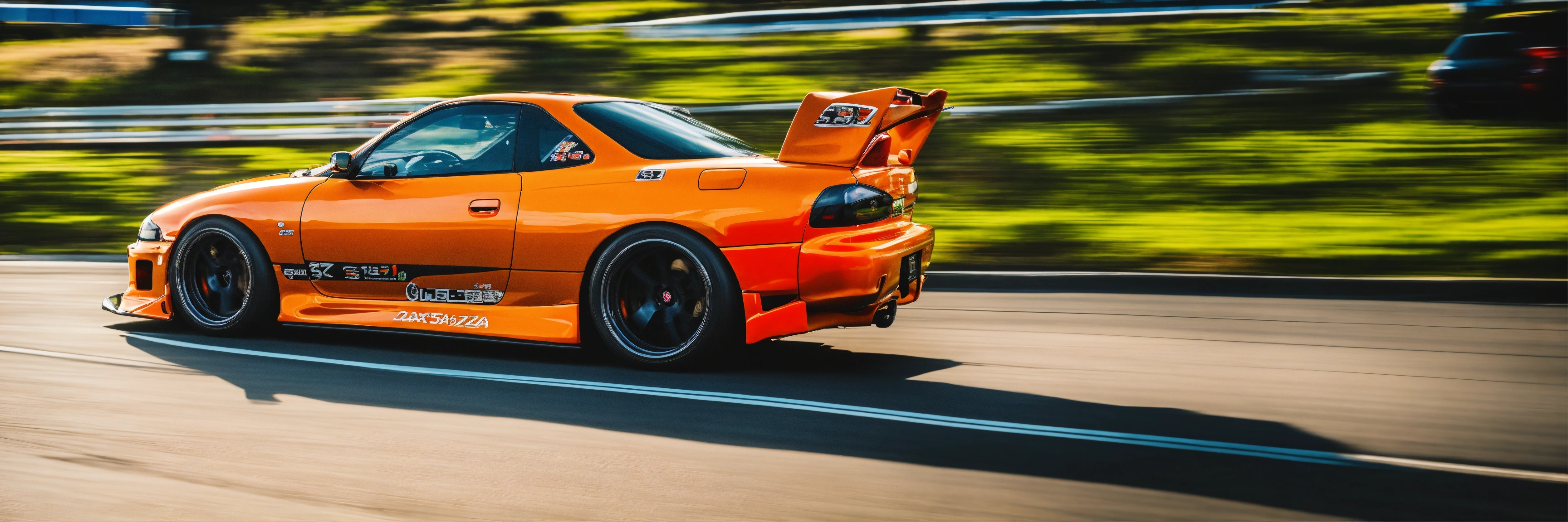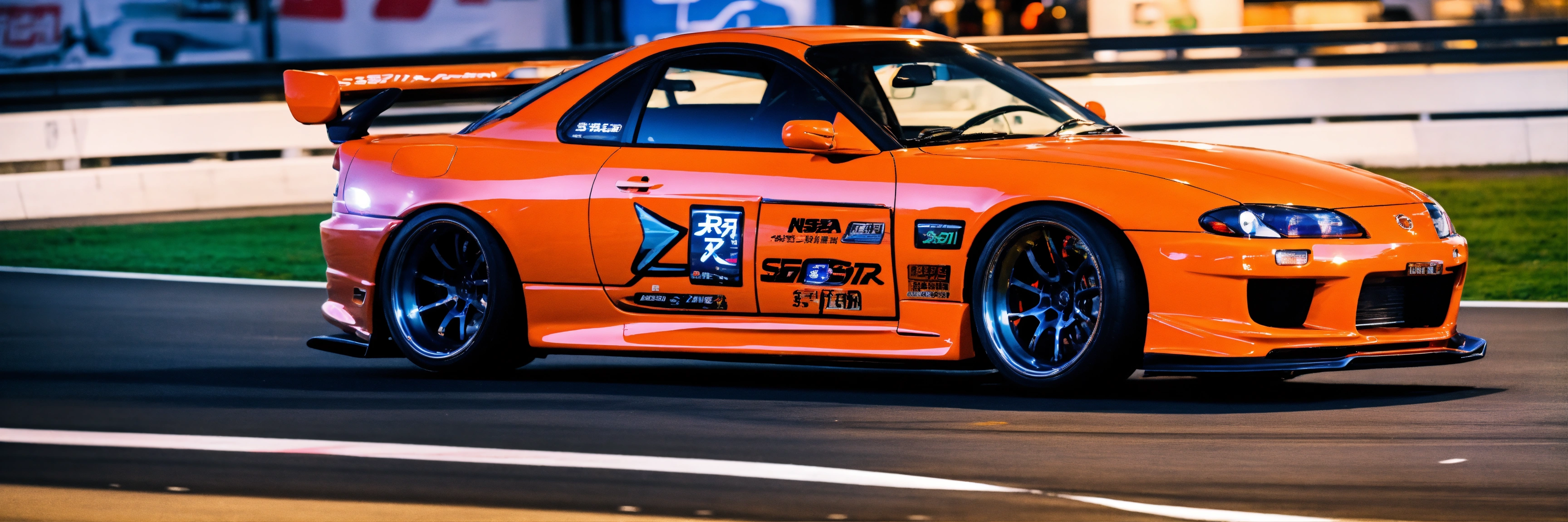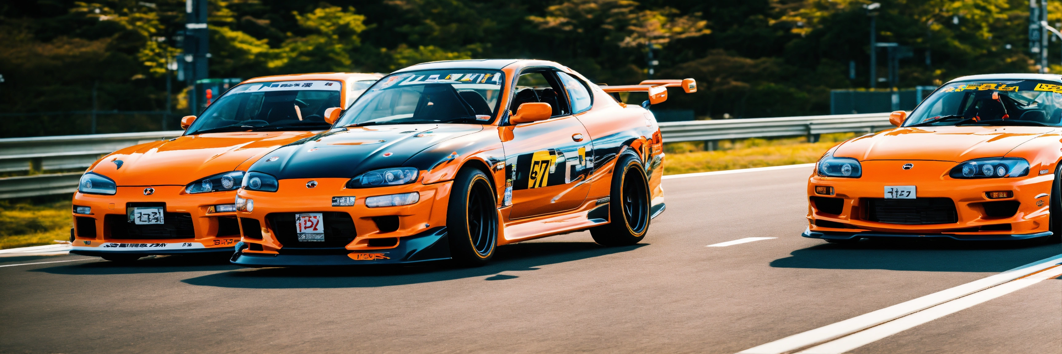 A colorful orange nissan silvia s15 with a wide-body kit racing a white mazda rx7 in tokyo highway