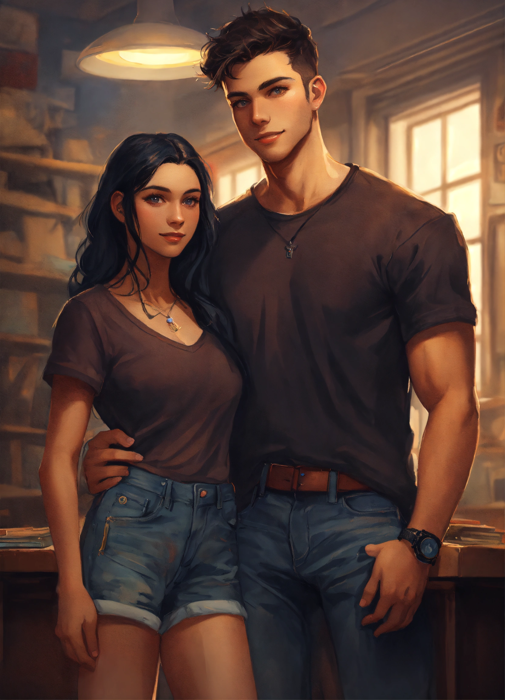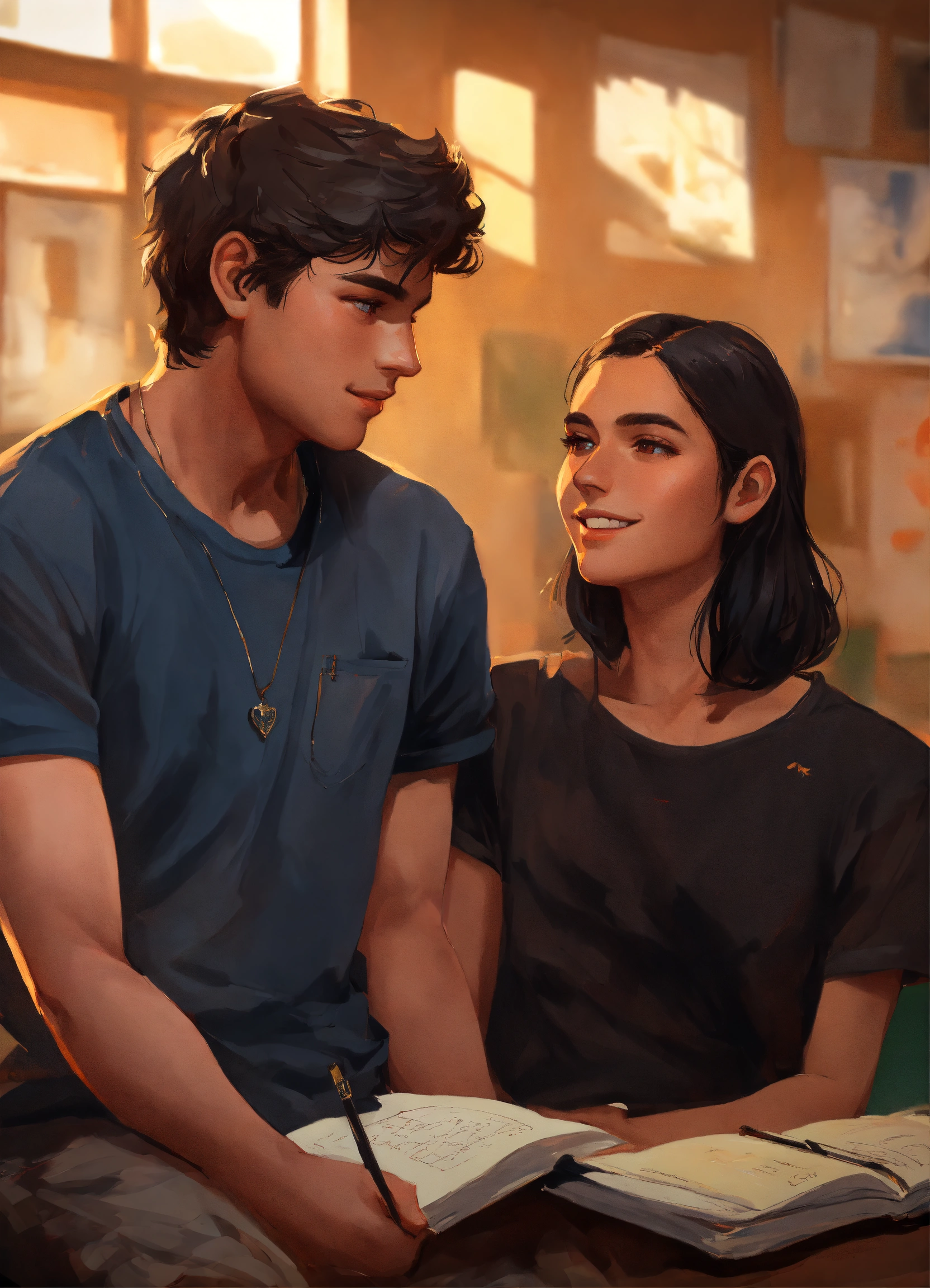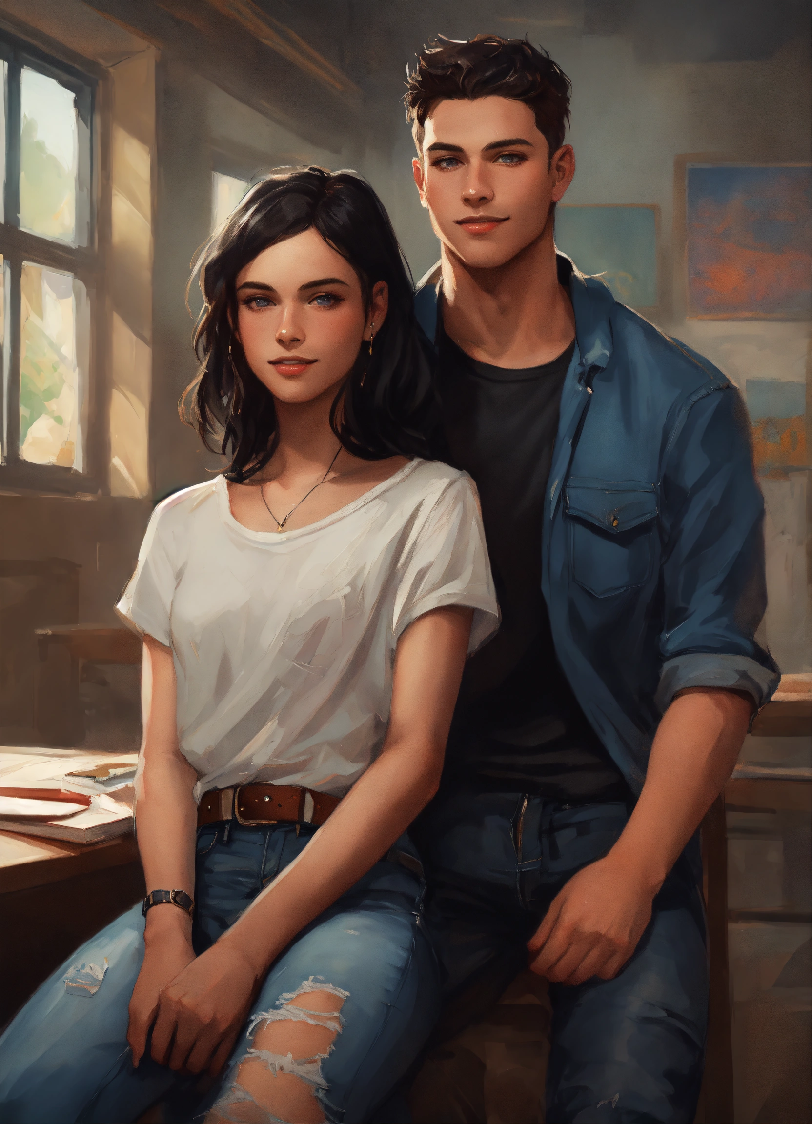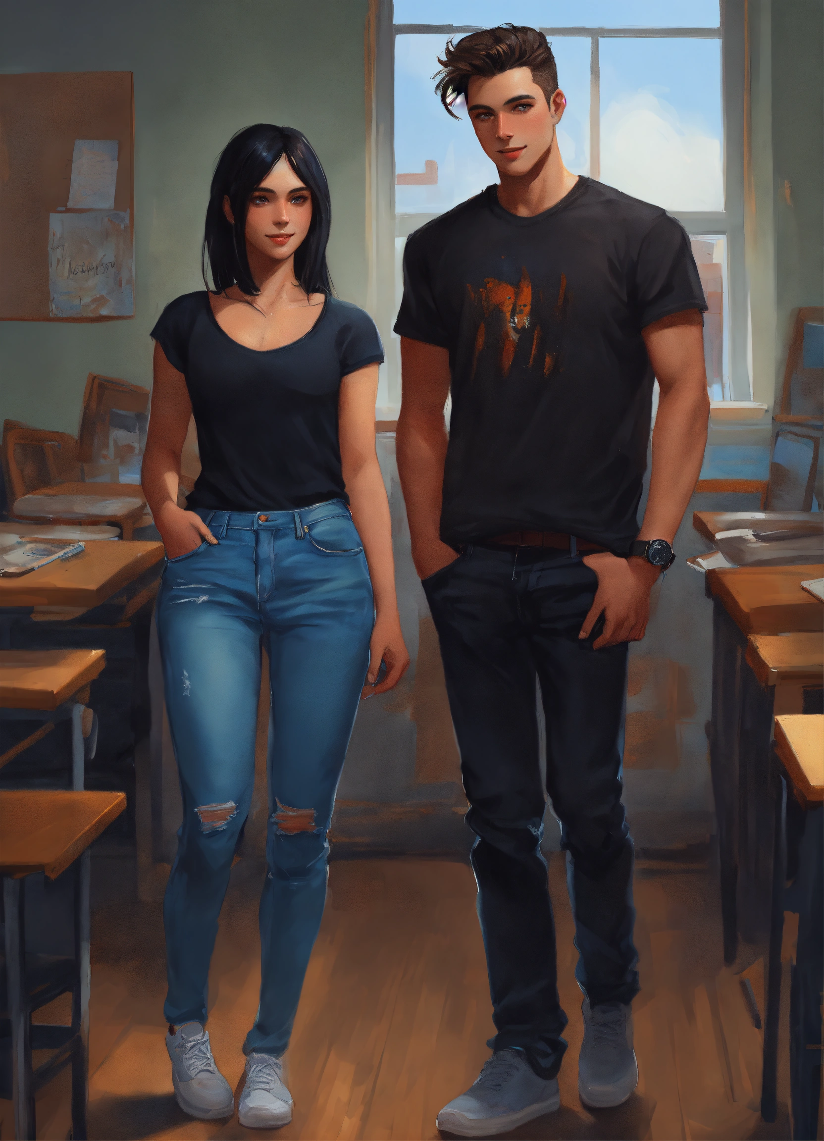 A detailed full body portrait romantic european 20 years old couple of a man looks like moritz hau with a sacarstic smile wearing a black t-shirt and a dark haired girl looks like katy miro, with a jeans. they are look at other romantic. contemporary, backgroud of a college classroom, illustrator, by justin gerad and greg rutkowski, digital art, realistic painting, dnd, character design, trending on artstation, medium shoot