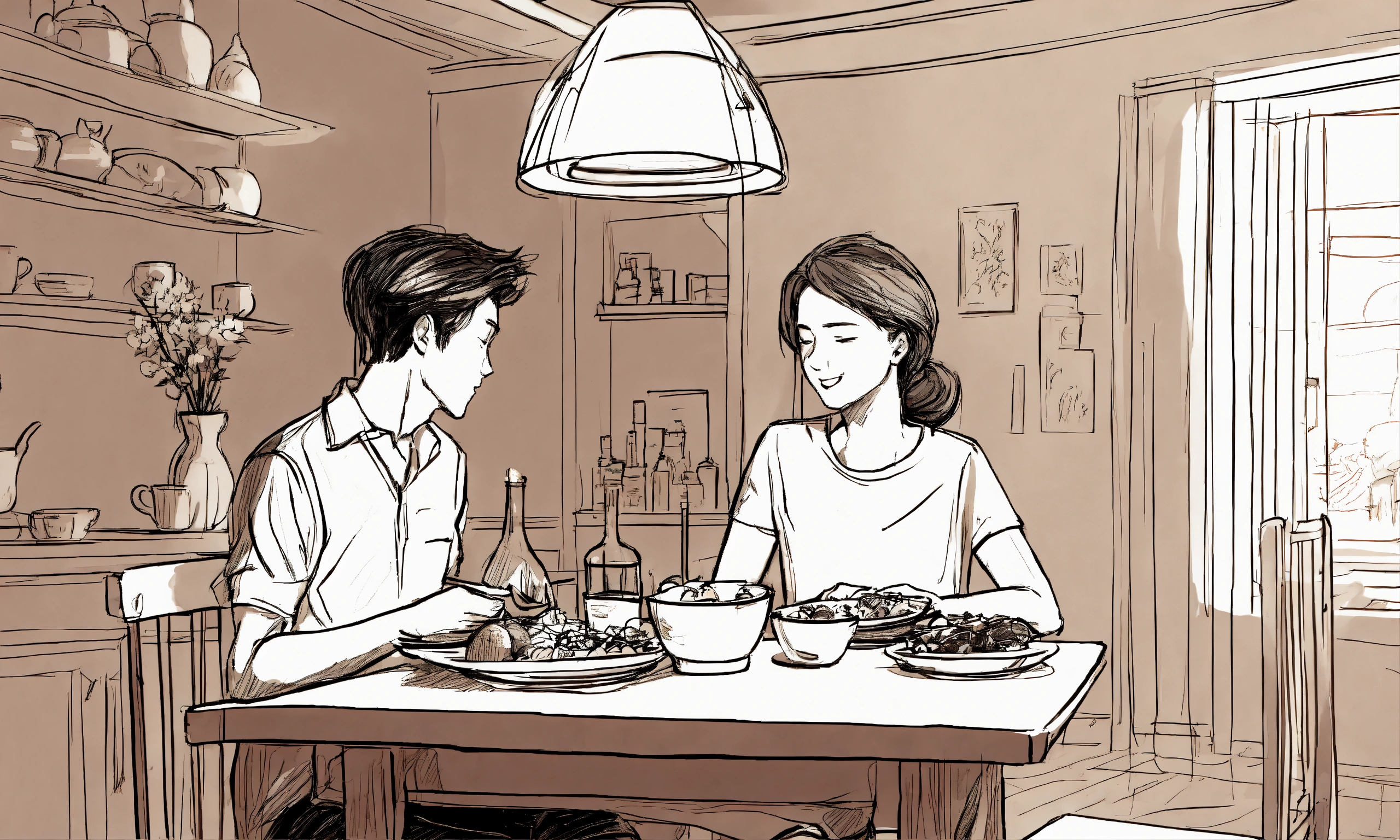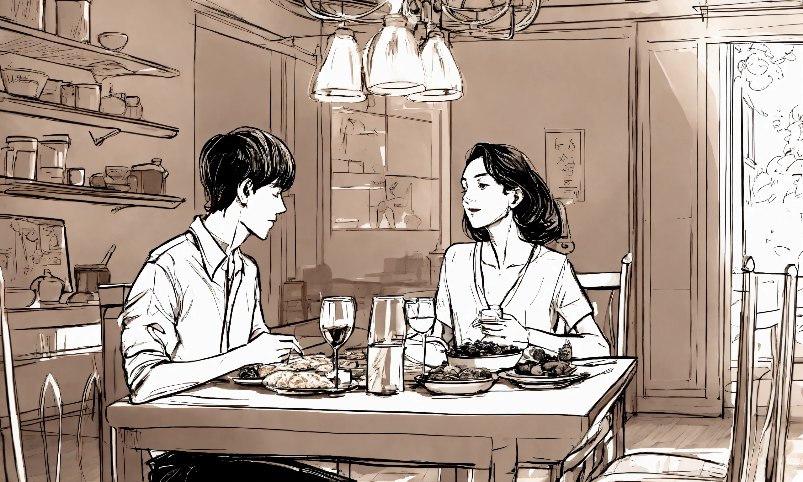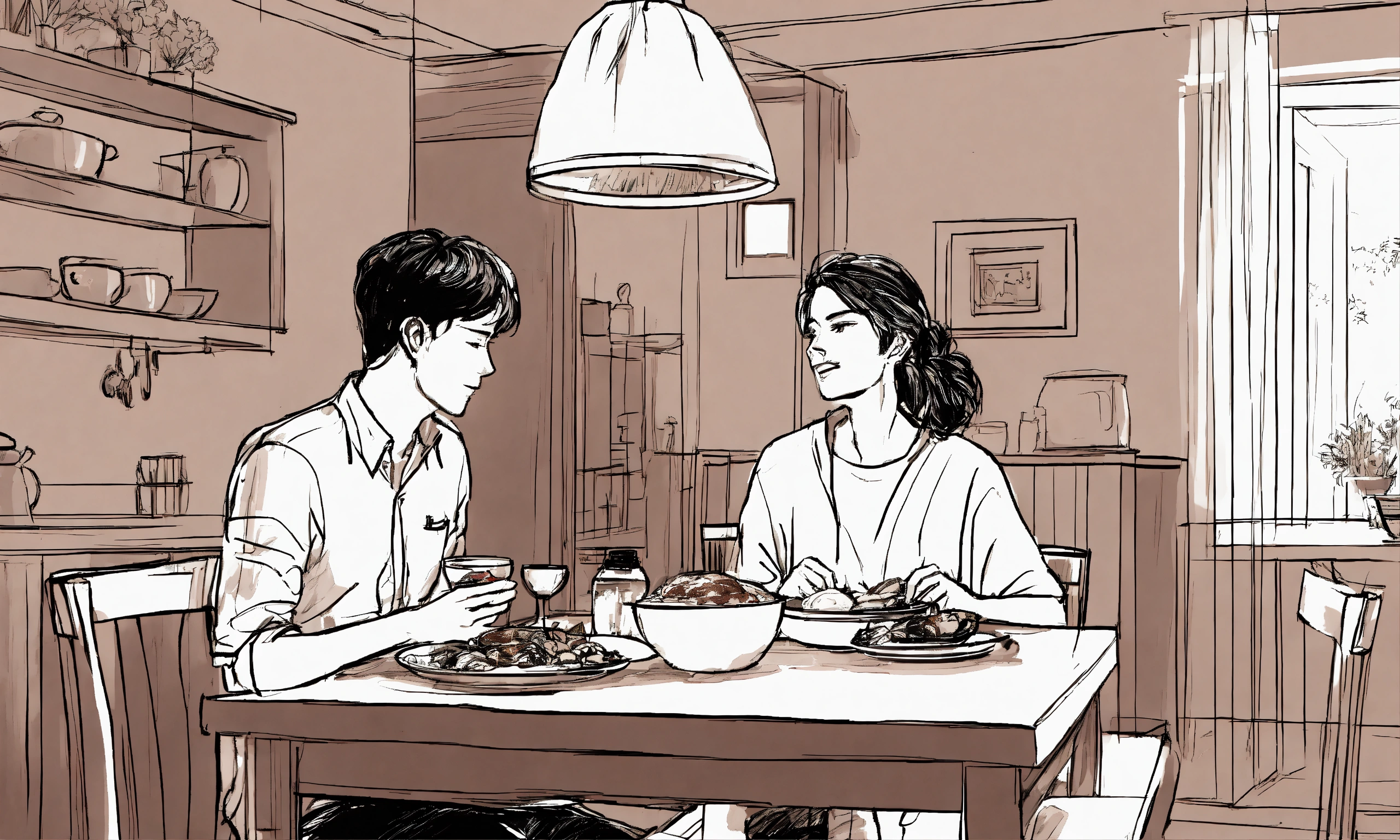 Sketch style, line art, long shot, front view, a healthy boy sitting with his classy mom on the dining table and eating