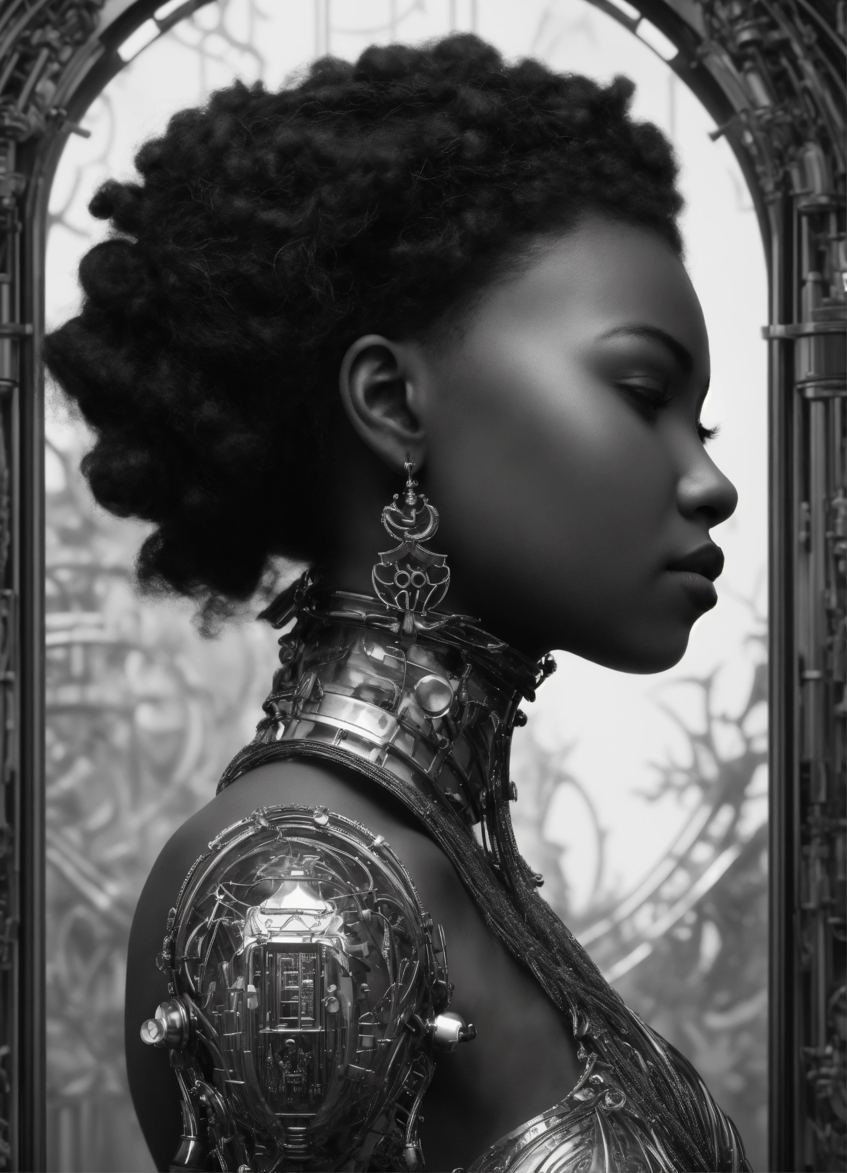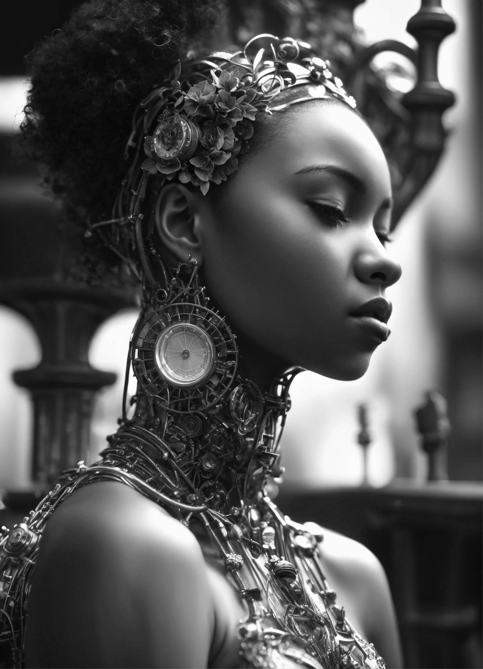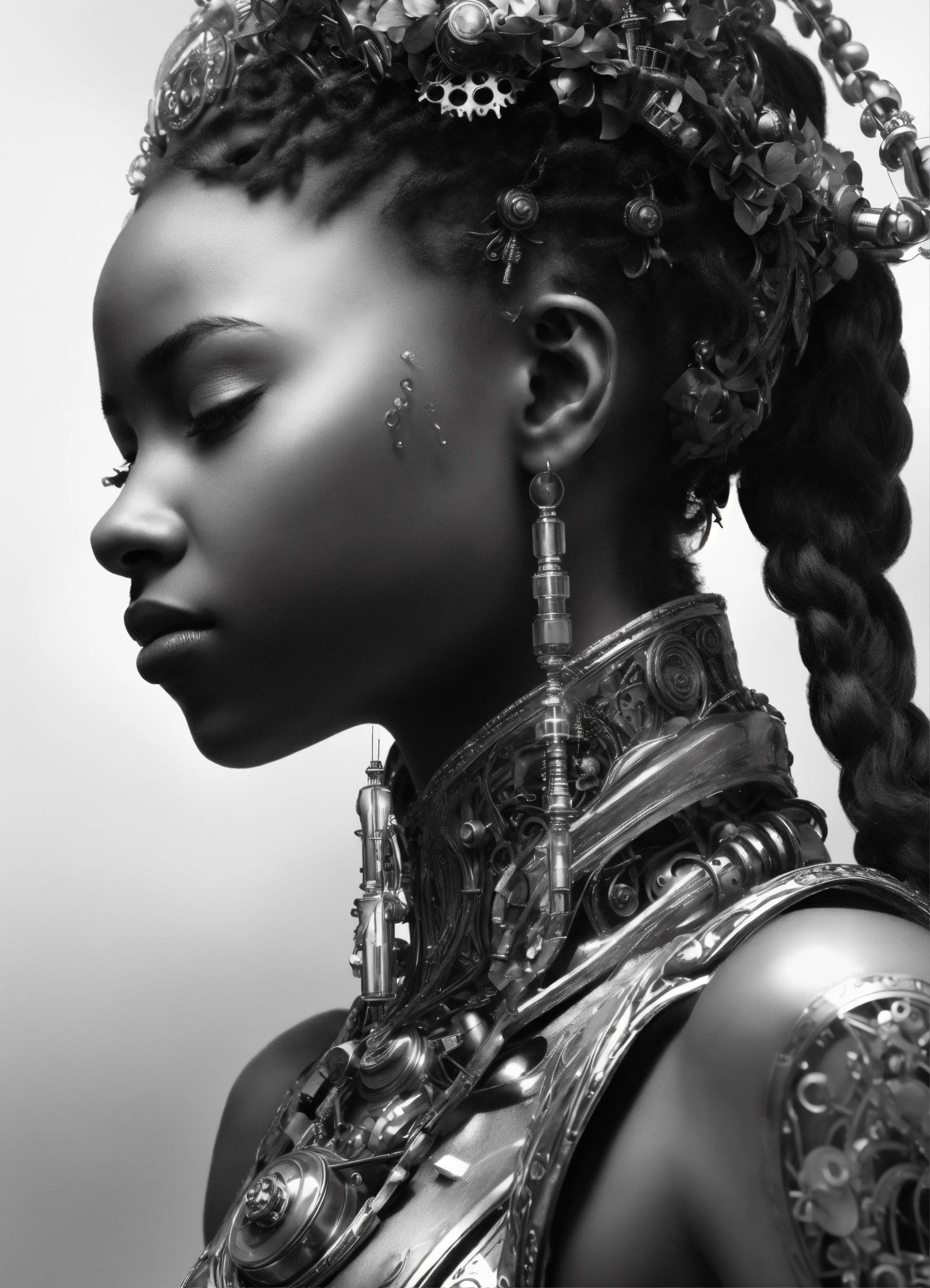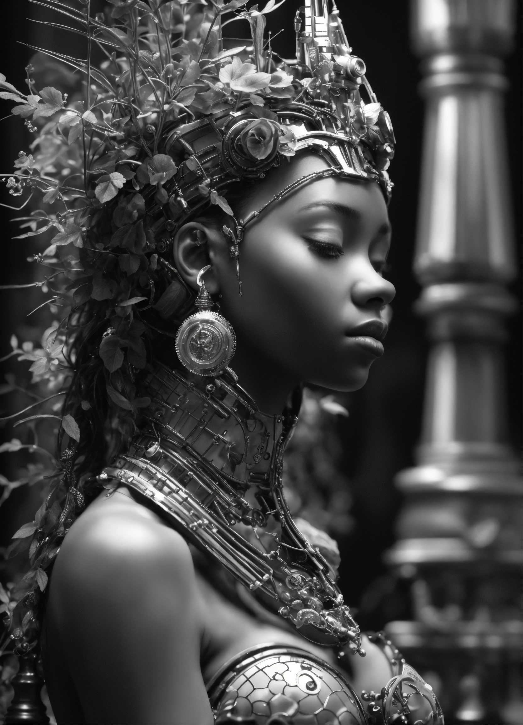 Mythical dreamy black and white organic bio - mechanical spinal ribbed profile face portrait of black girl praying, praying hands detail of translucent steampunk chess beautiful intricate monochrome angelic - human - queen - vegetal - cyborg, highly detailed, intricate translucent ivy jelly ornate, poetic, translucent microchip ornate, 3d render, digital art, octane render, 8k artistic lithography, over the shoulder shot
