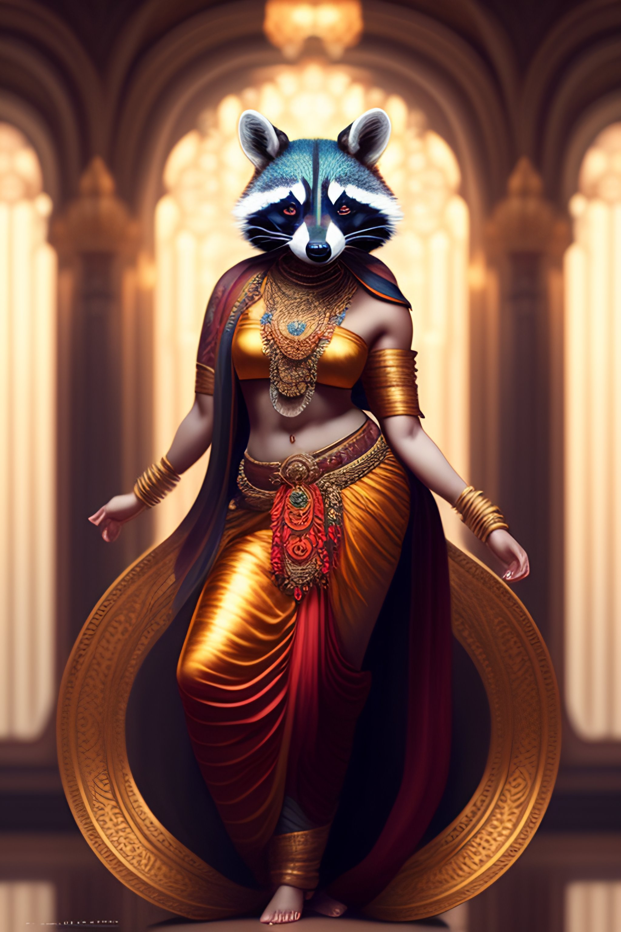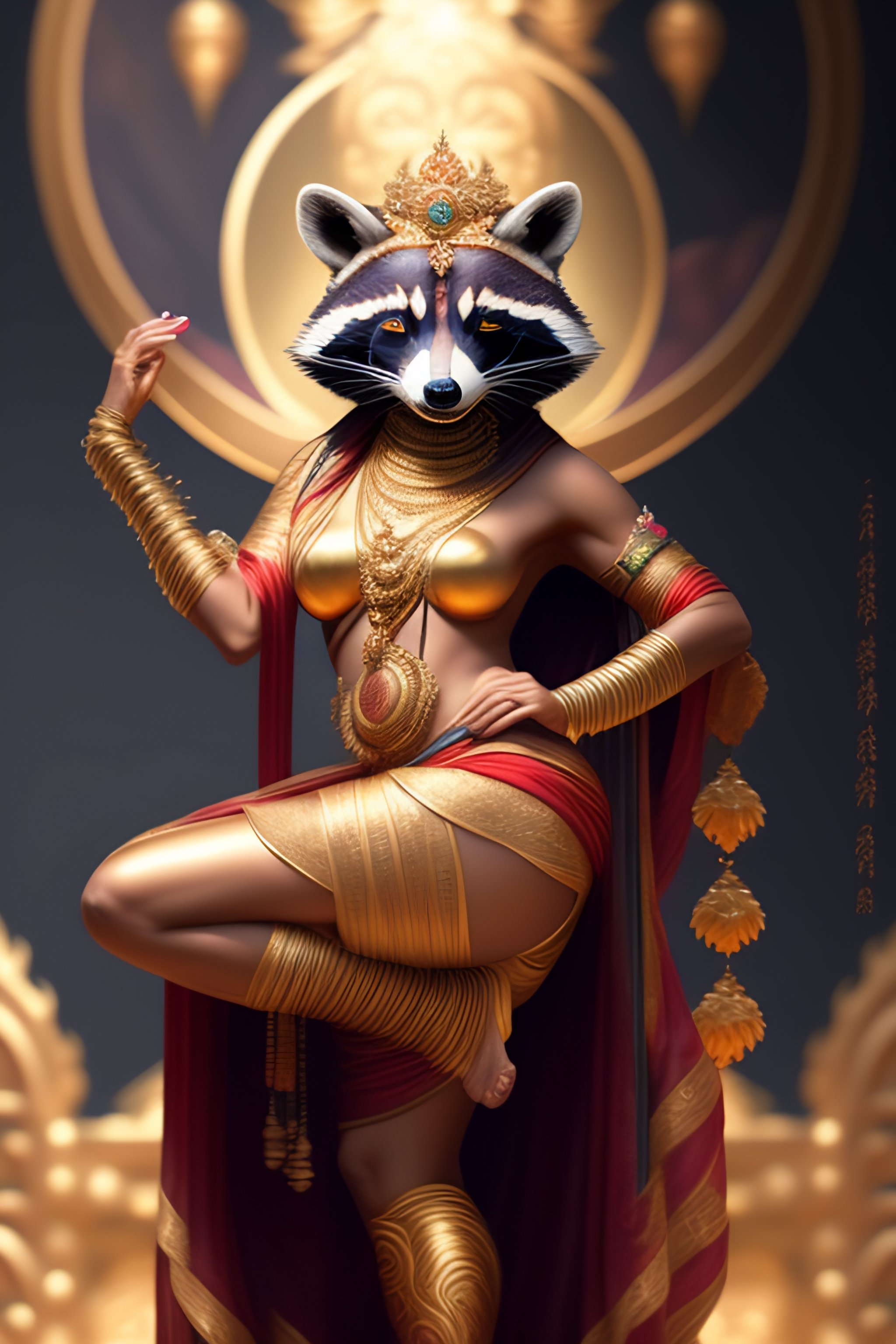 Photo of raccoon dancing bodhisattva, beautiful, renaissance, fantasy, intricate, elegant, hindu, highly detailed, digital painting, artstation, concept art, smooth, sharp focus, illustration, art by artgerm and greg rutkowski and alphonse mucha