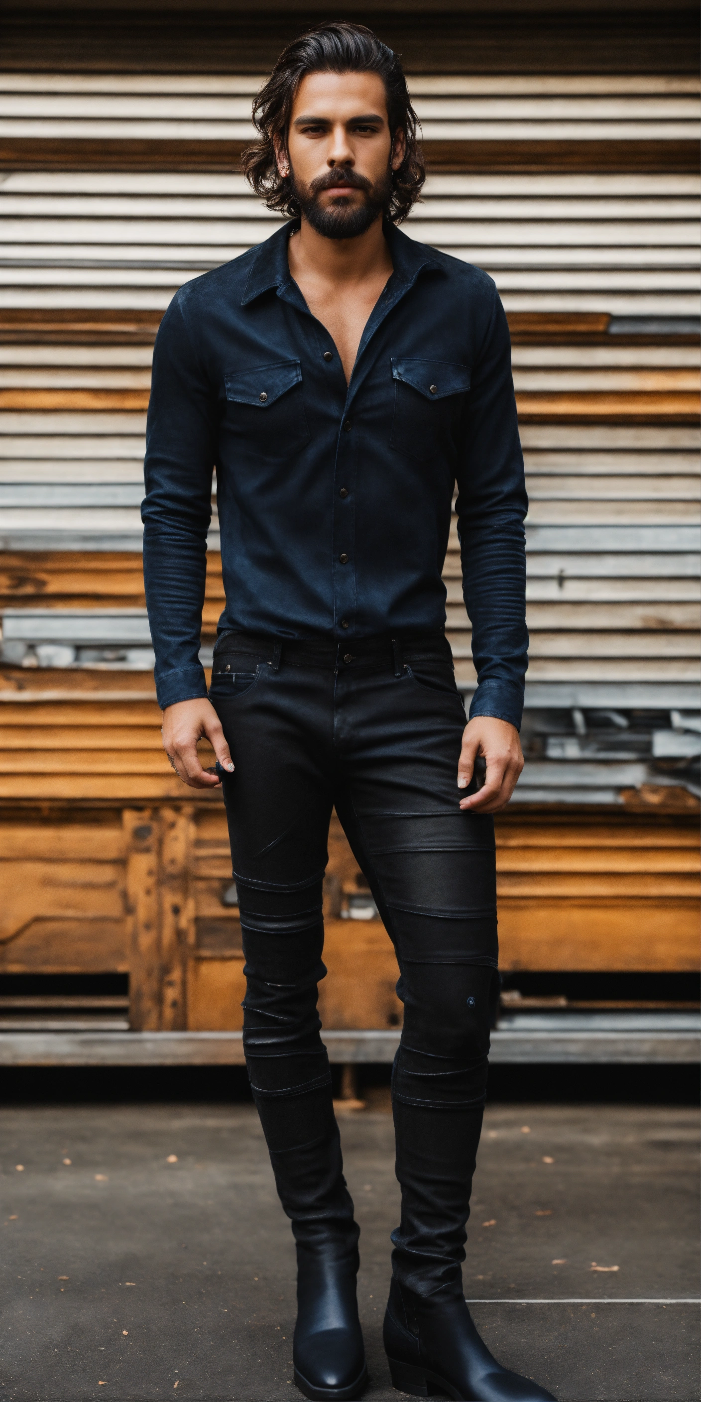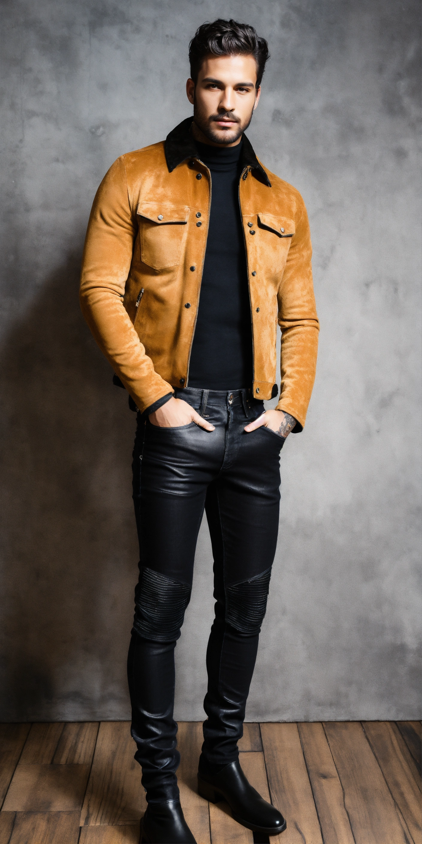 Ultra realistic full body photo of well lit novelty interesting complex black waxed jeans with suede details