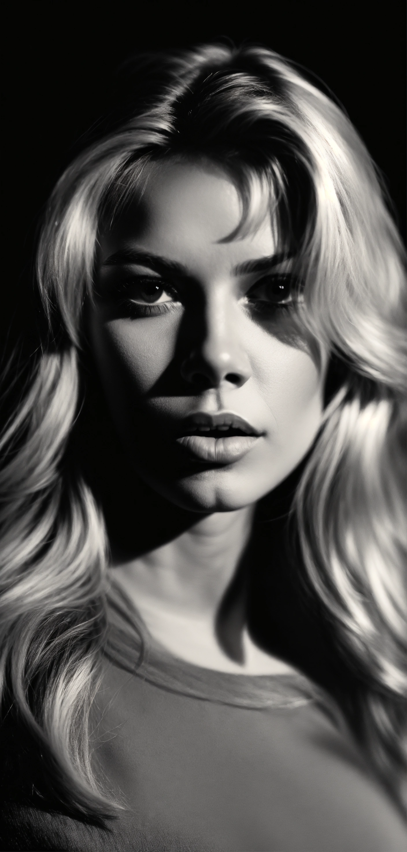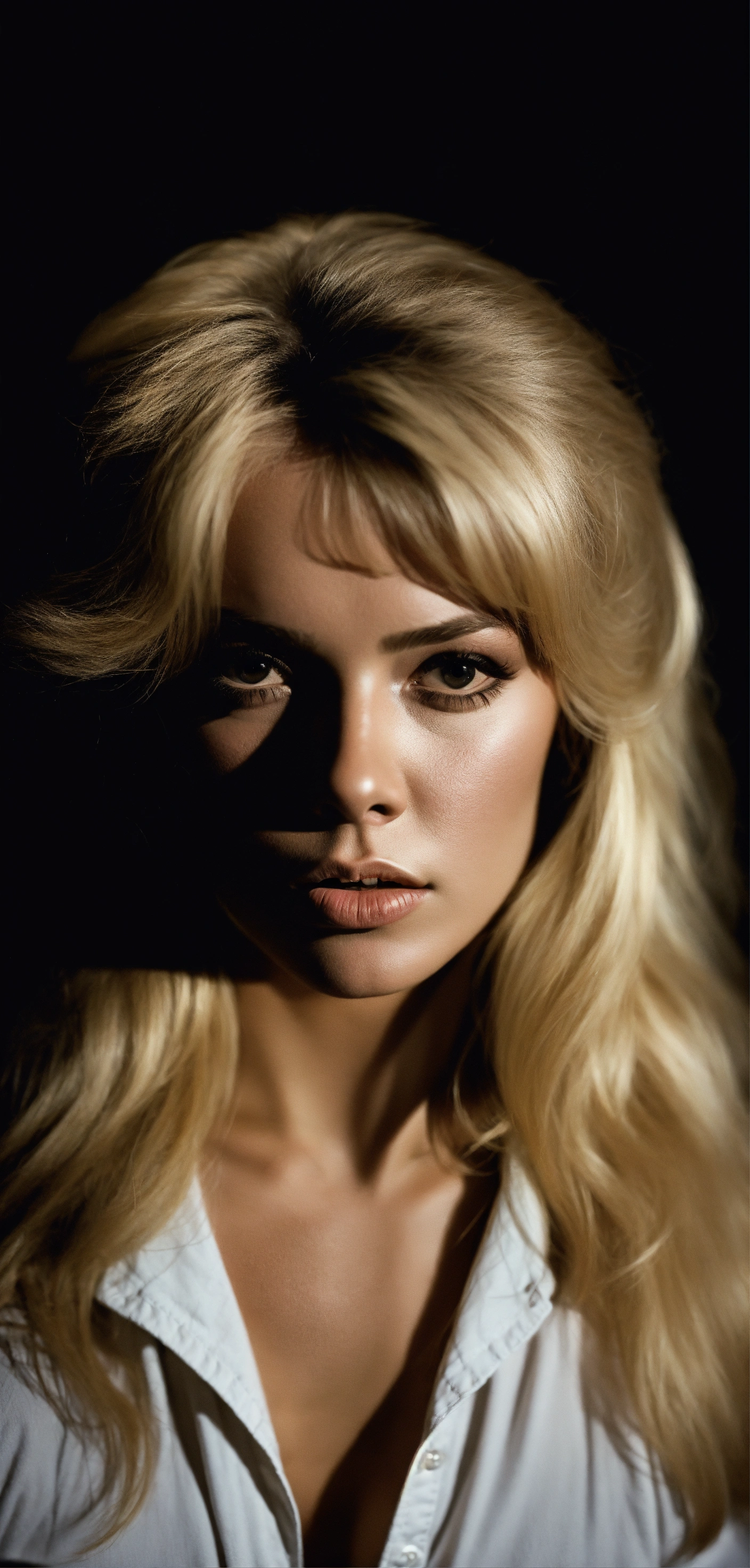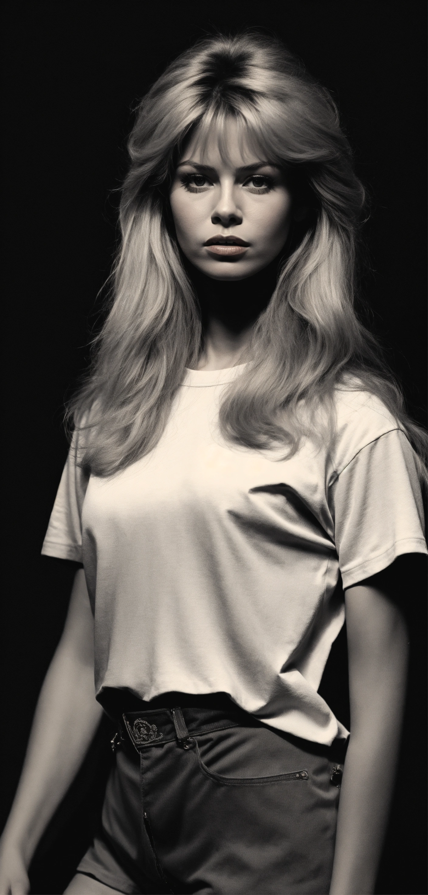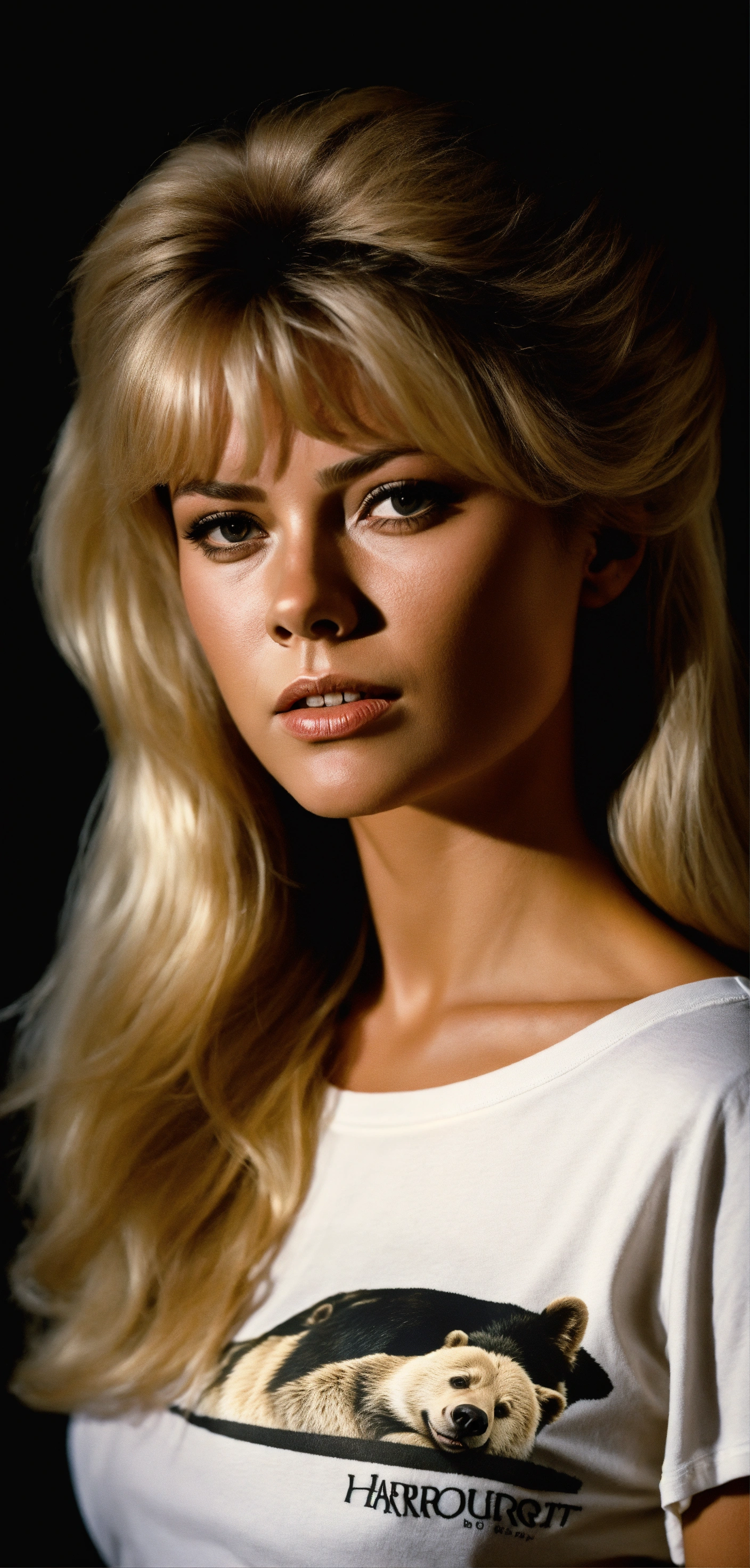 Buste portrait, brigitte bardot young, bear body, tee shirt white, black background, harcourt style, dark lighting, realistic, photography, 8k
