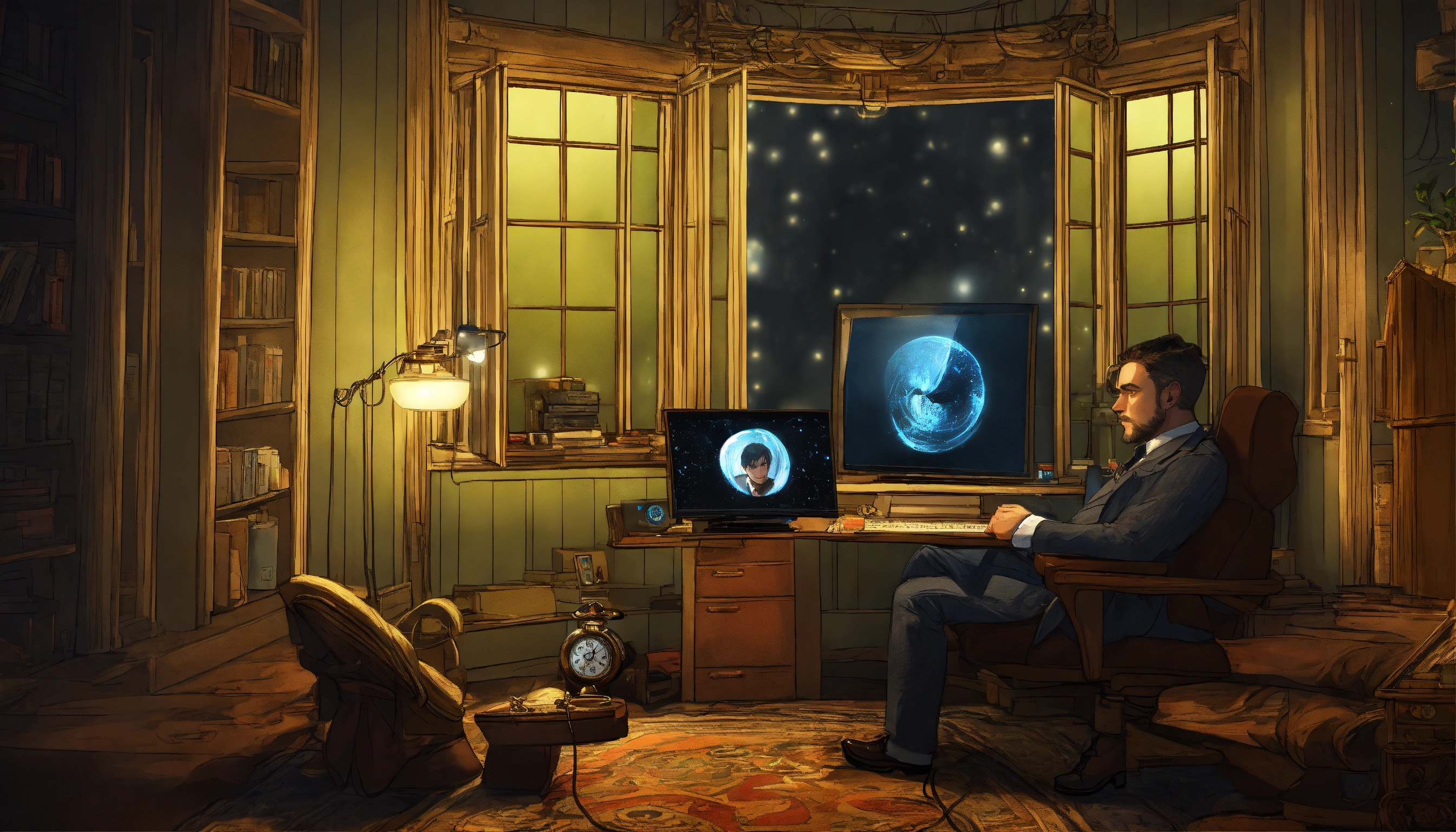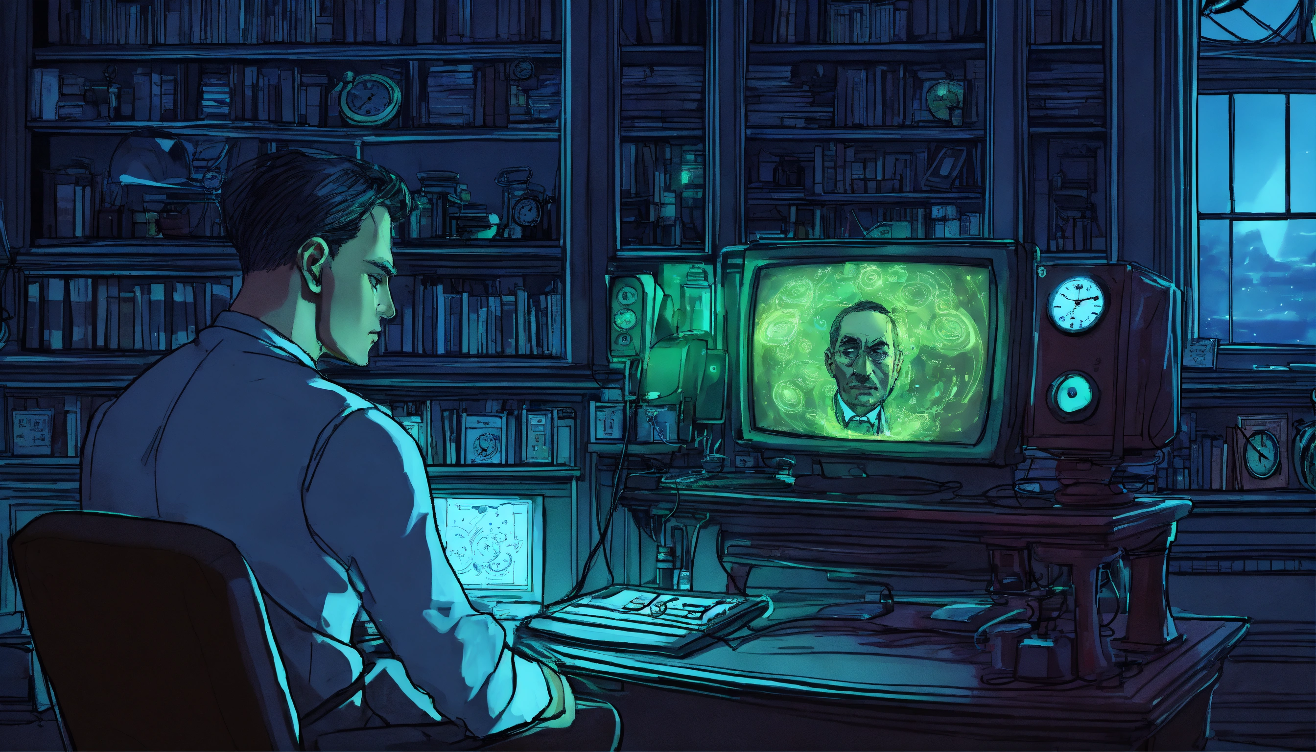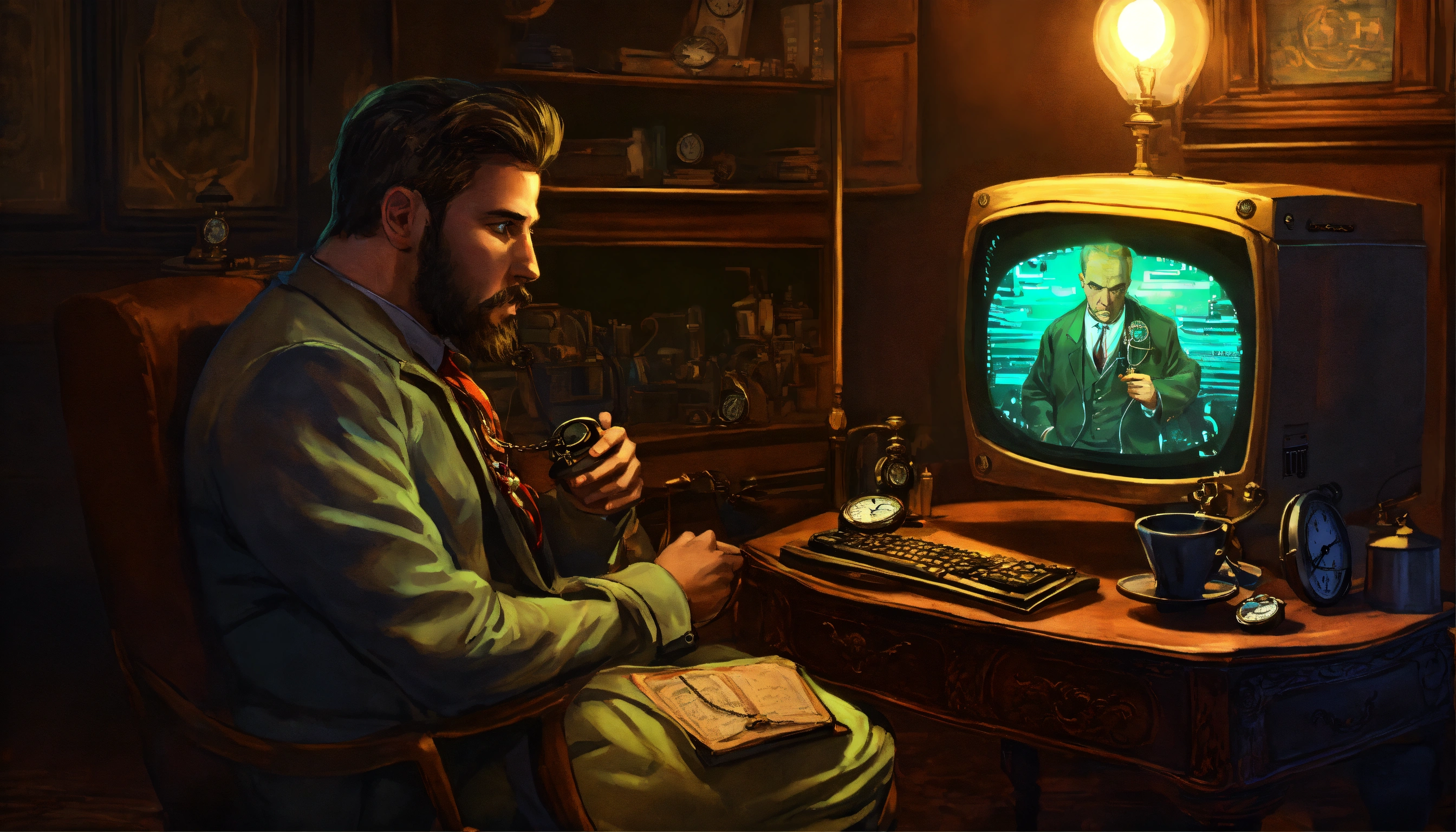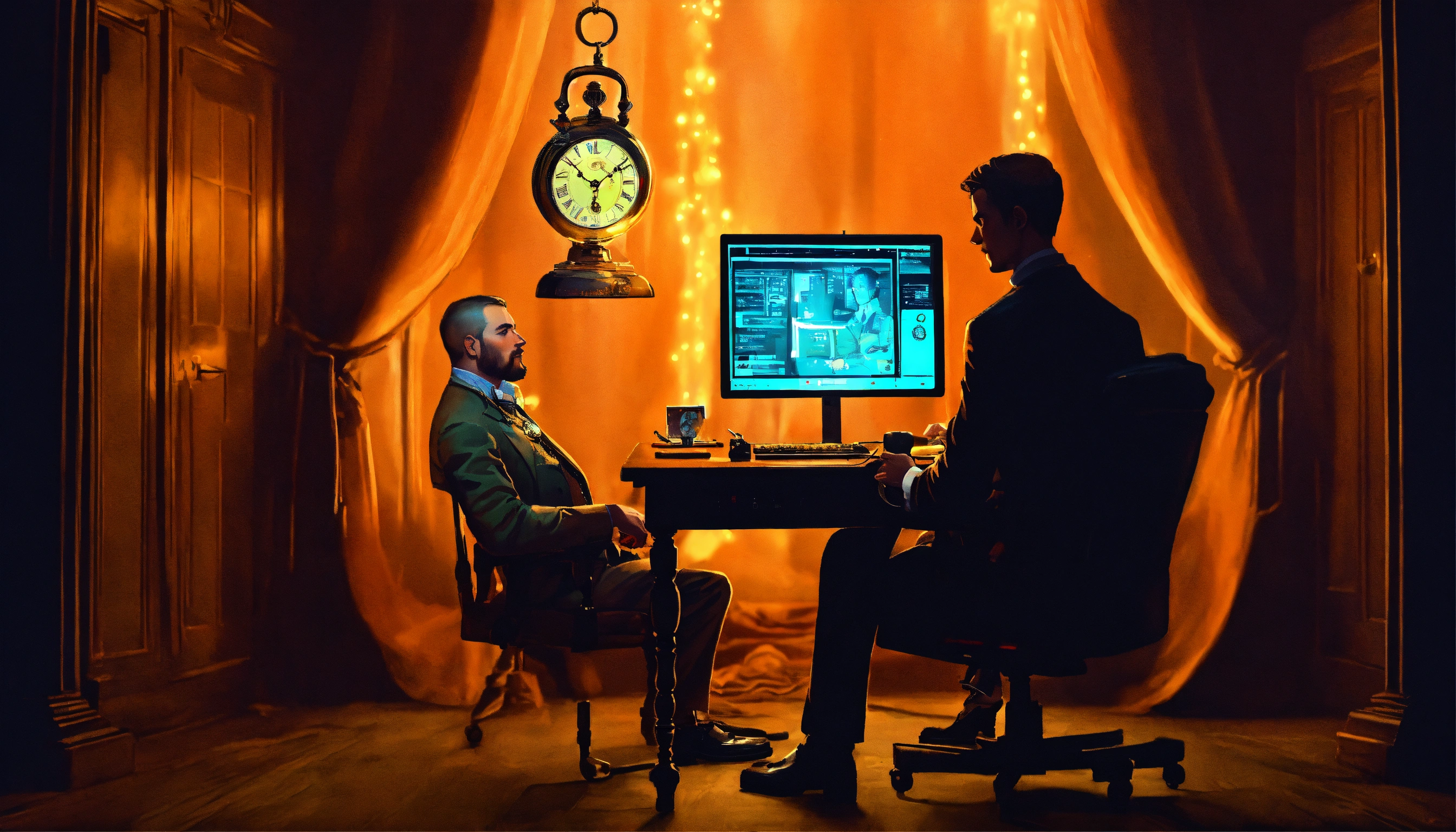 A computer as a person hypnotizing a man in a chair with a pocket watch, lights off, computer screen glow, caricature, ominous and eery, inspired by apollyon, highly detailed and realistic, pc hypnotizing a person