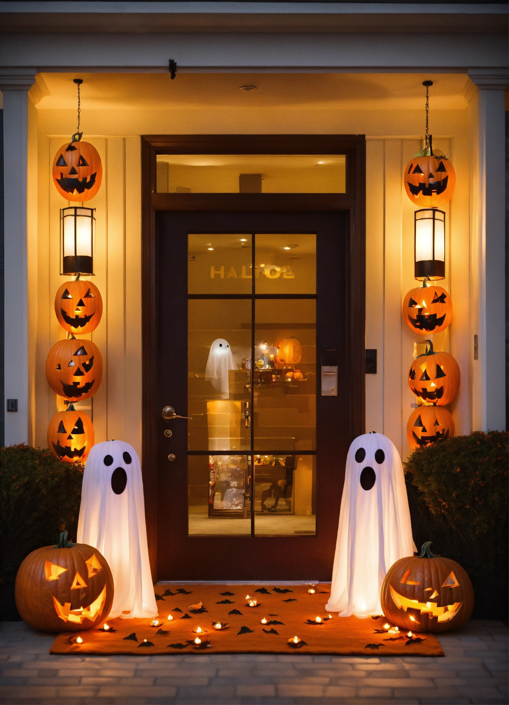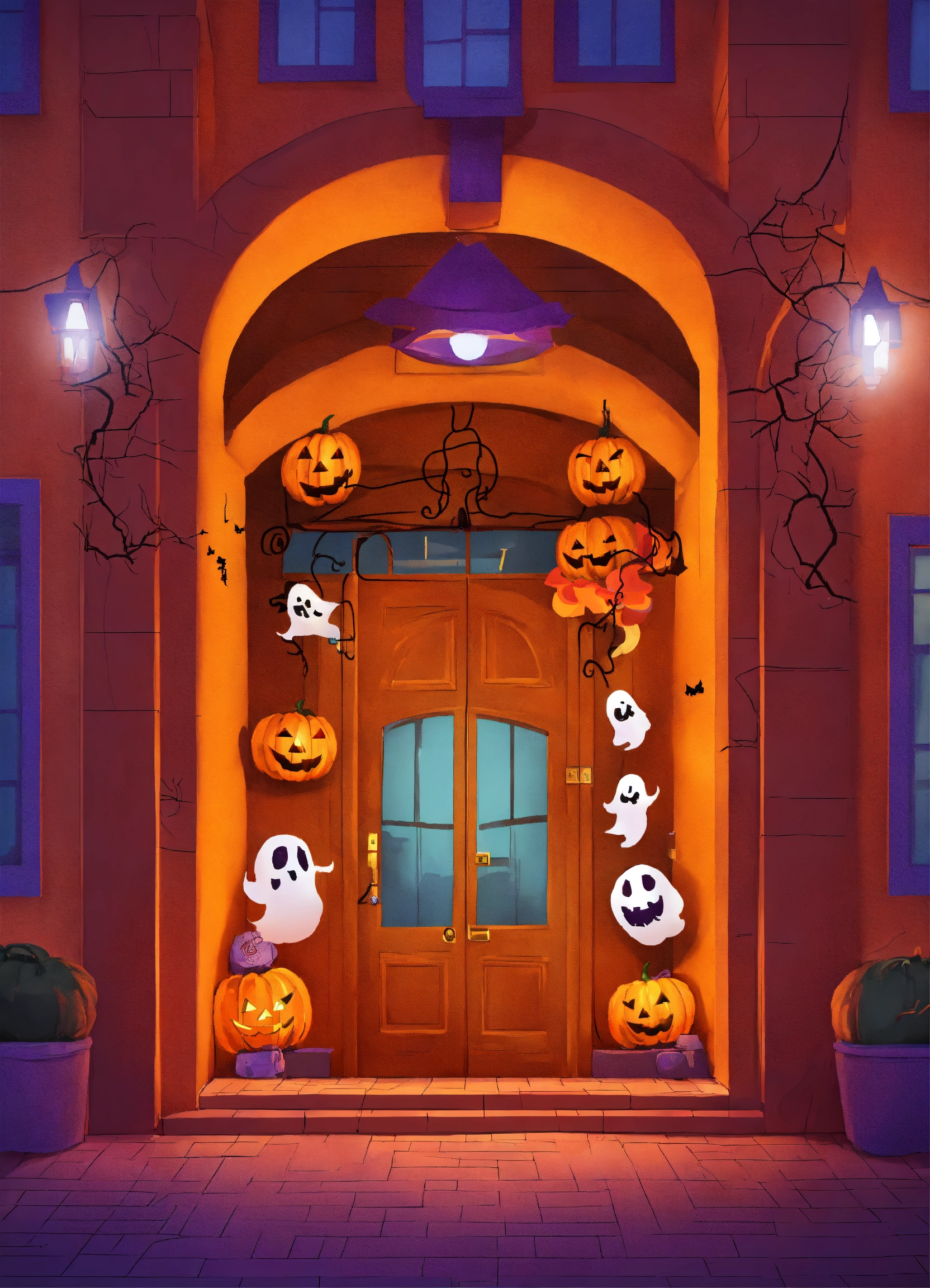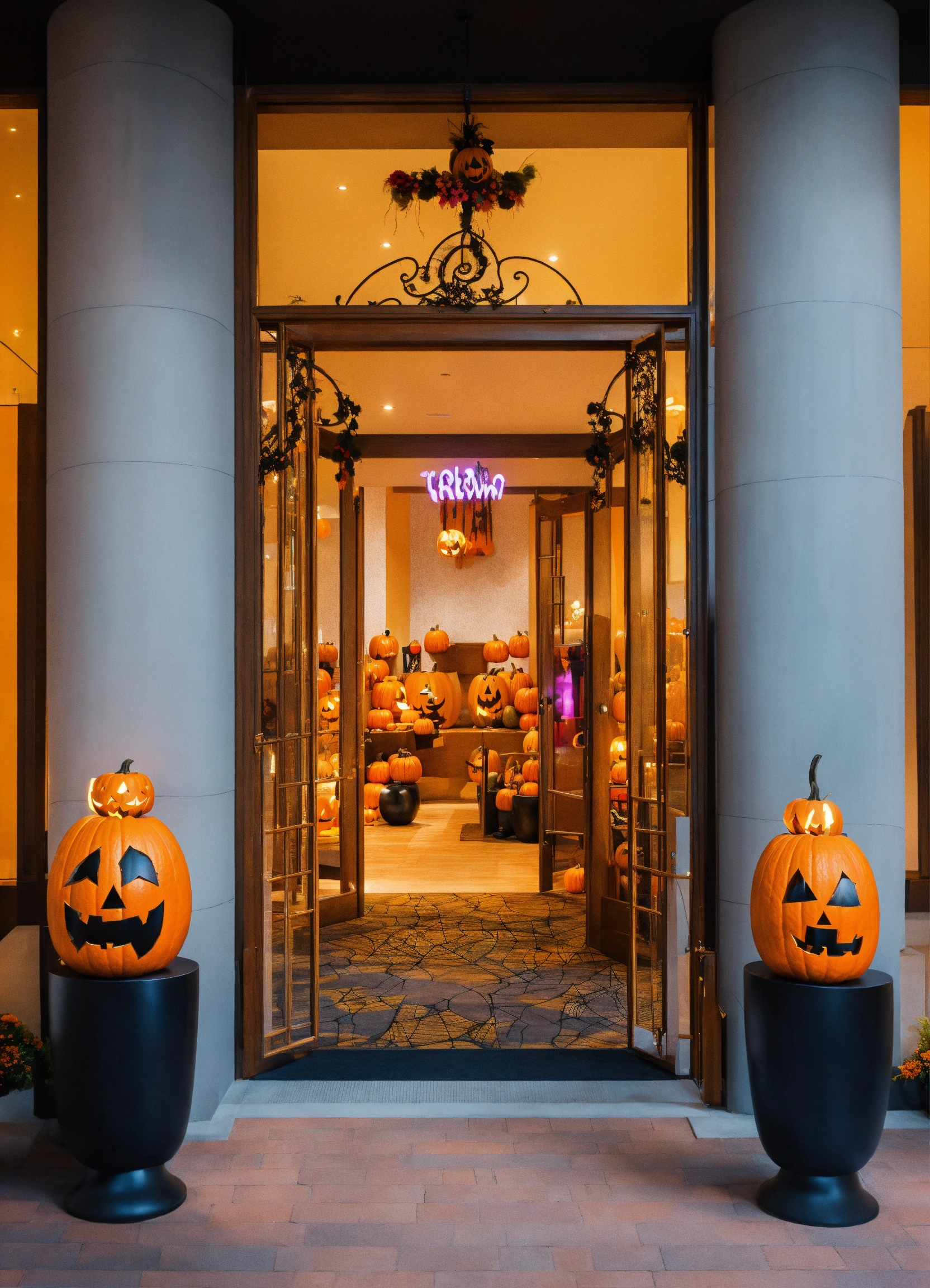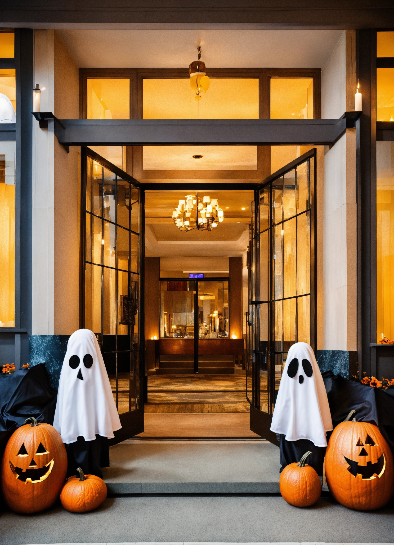 A hotel entrance whit a funny and cute hallowen decoration for kids, cute ghosts, treat or tricks panels