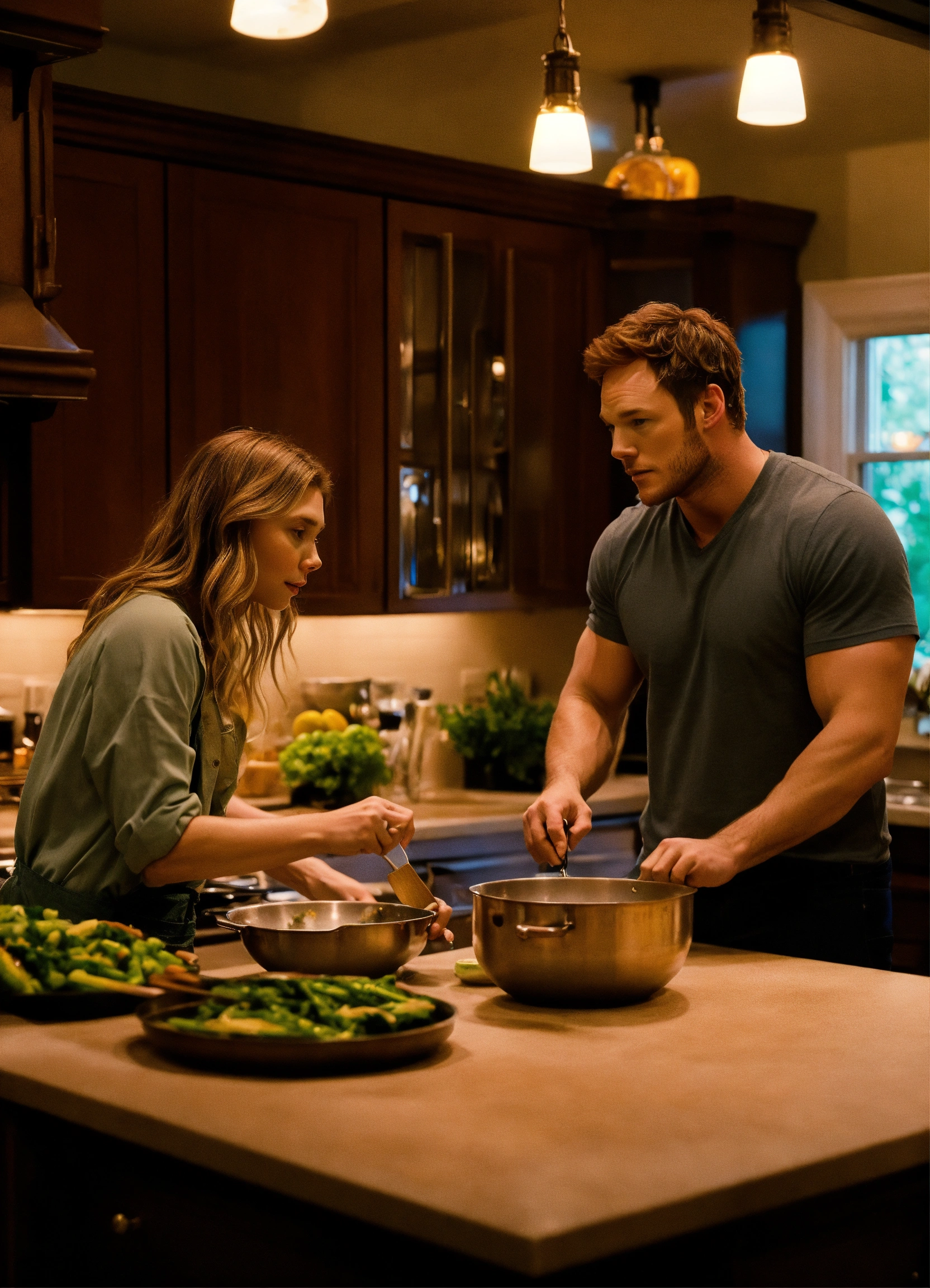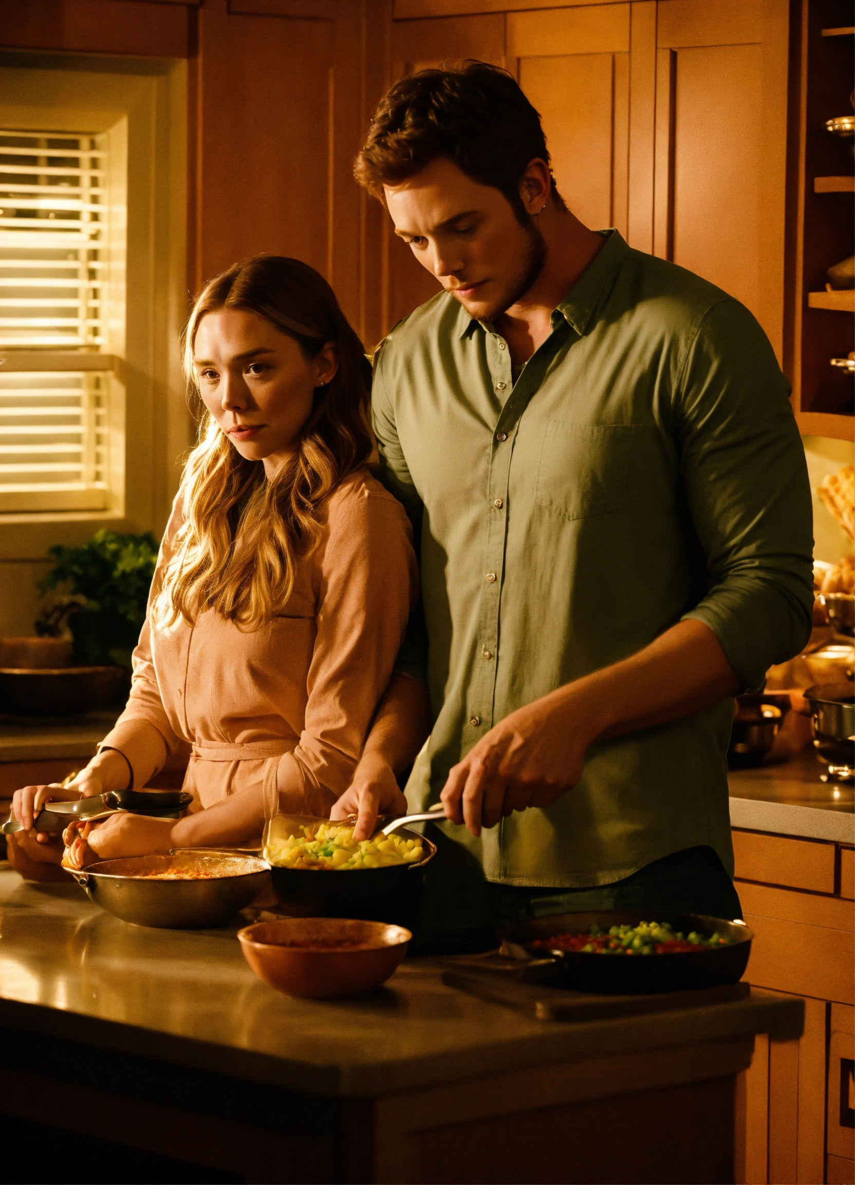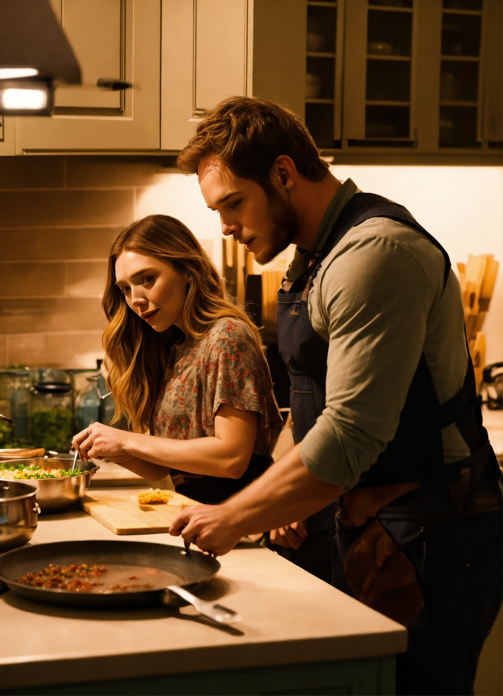 Elizabeth olsen and chris pratt is a couple in the kitchen, they are cooking, it's night out there, the kitchen is old and rusty