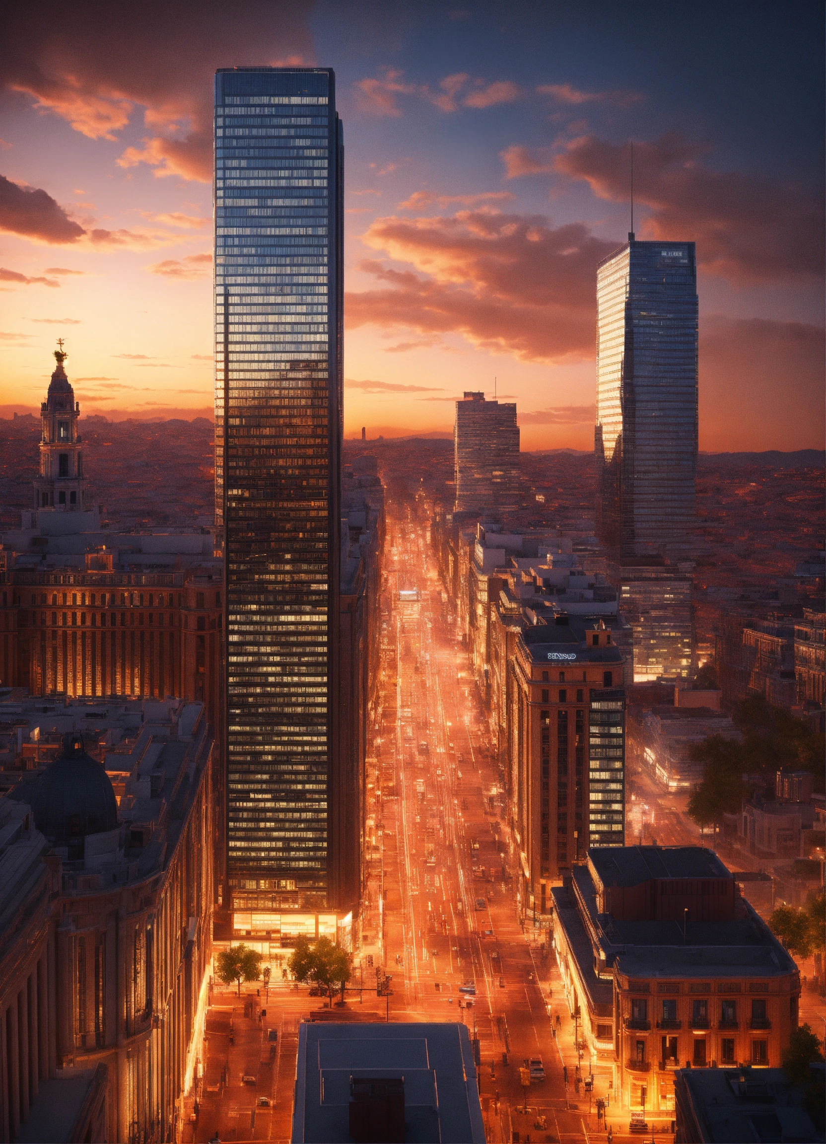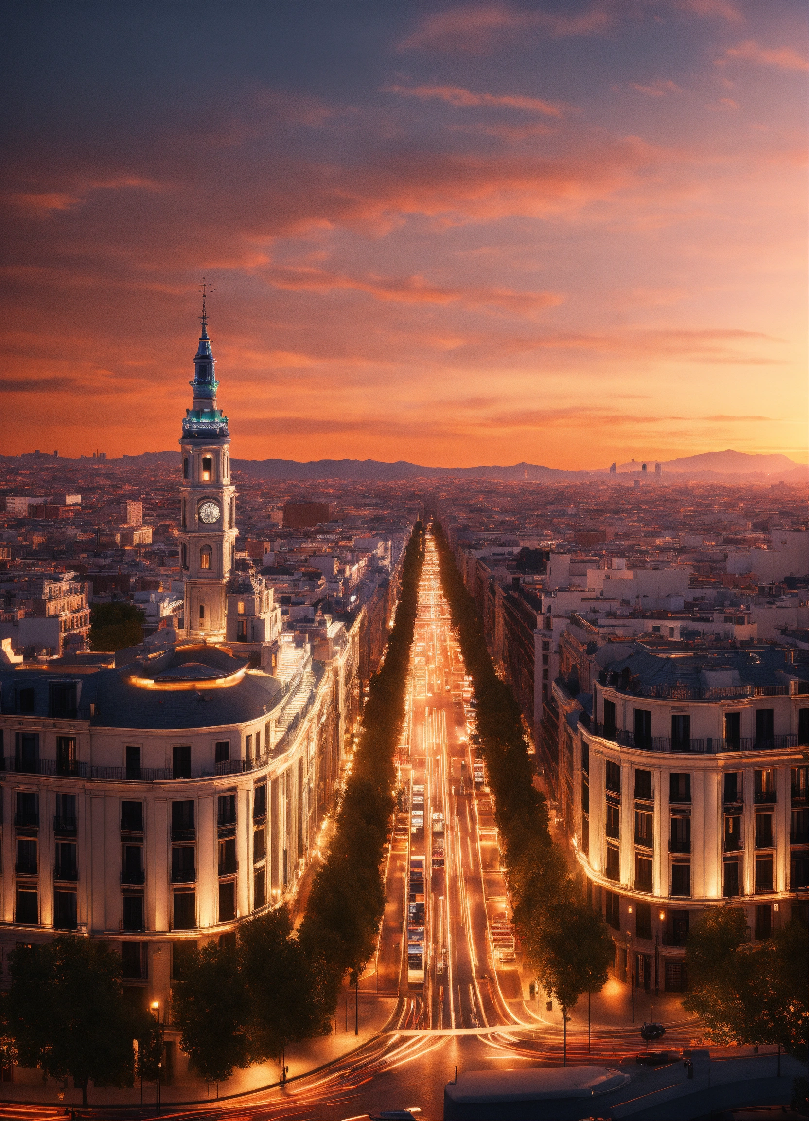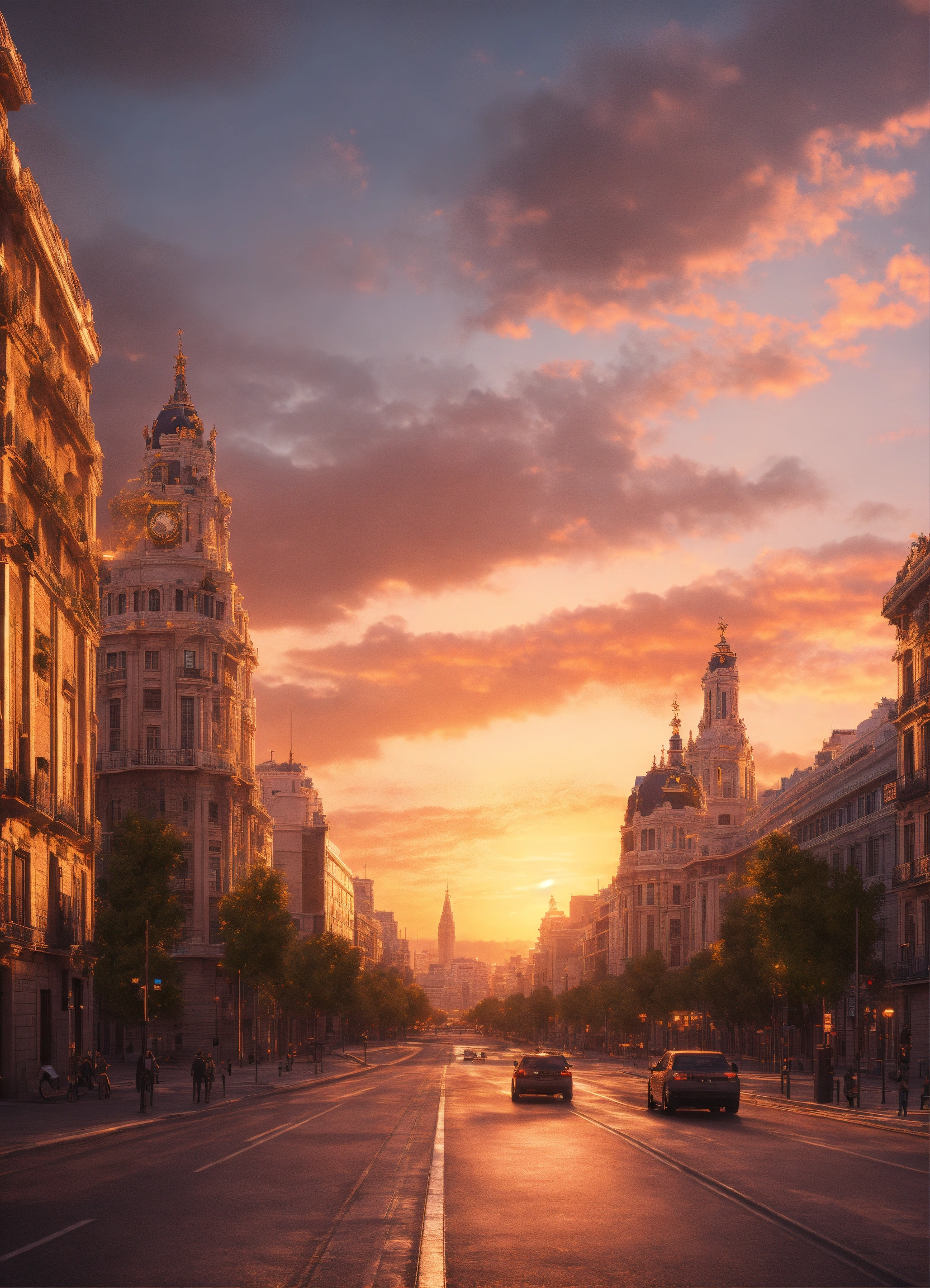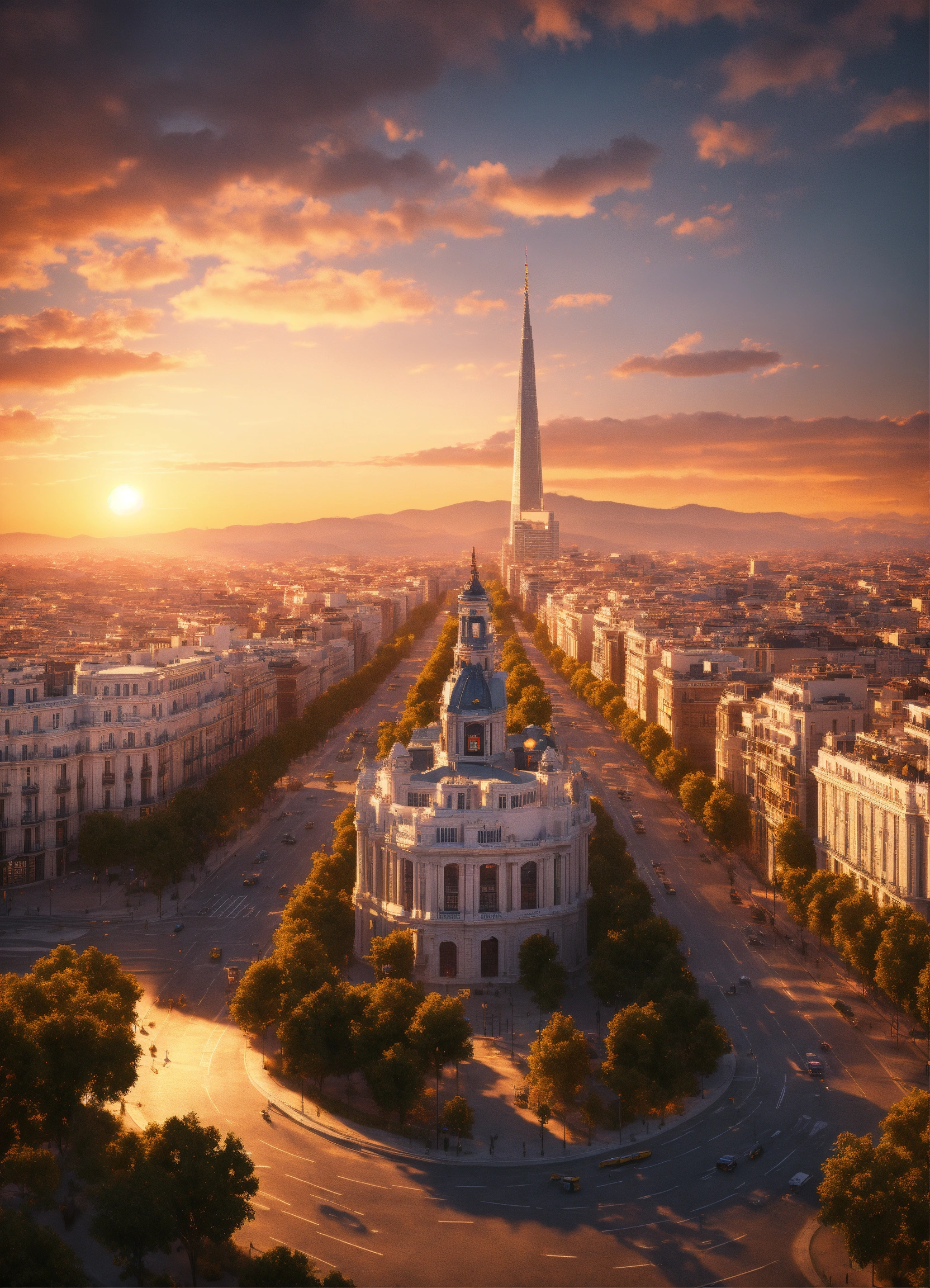 Skyline of madrid, sunset, photorealistic design poster, romantic, 4k, epic composition, stunning realism, long shot, unreal engine 4d
