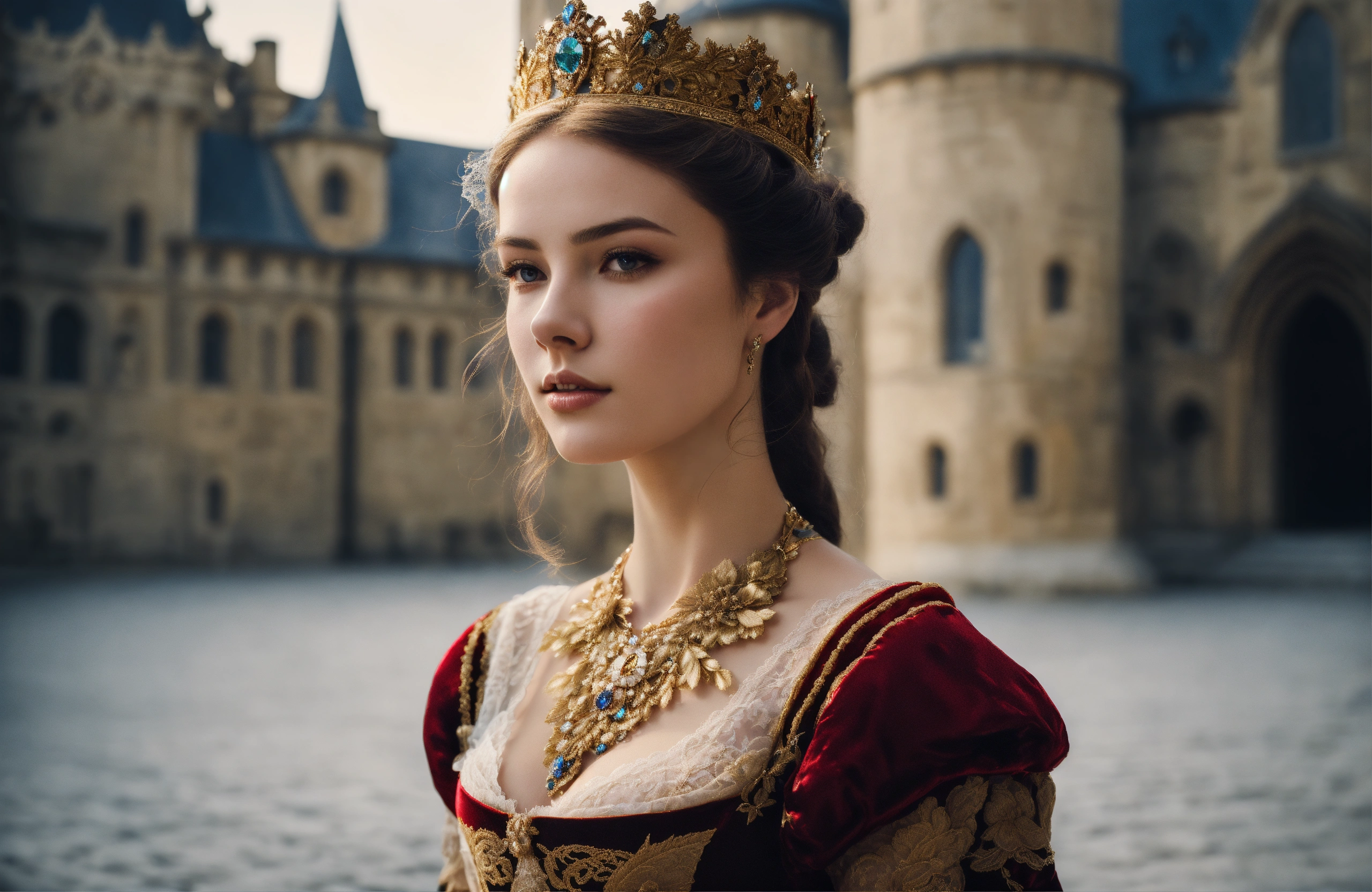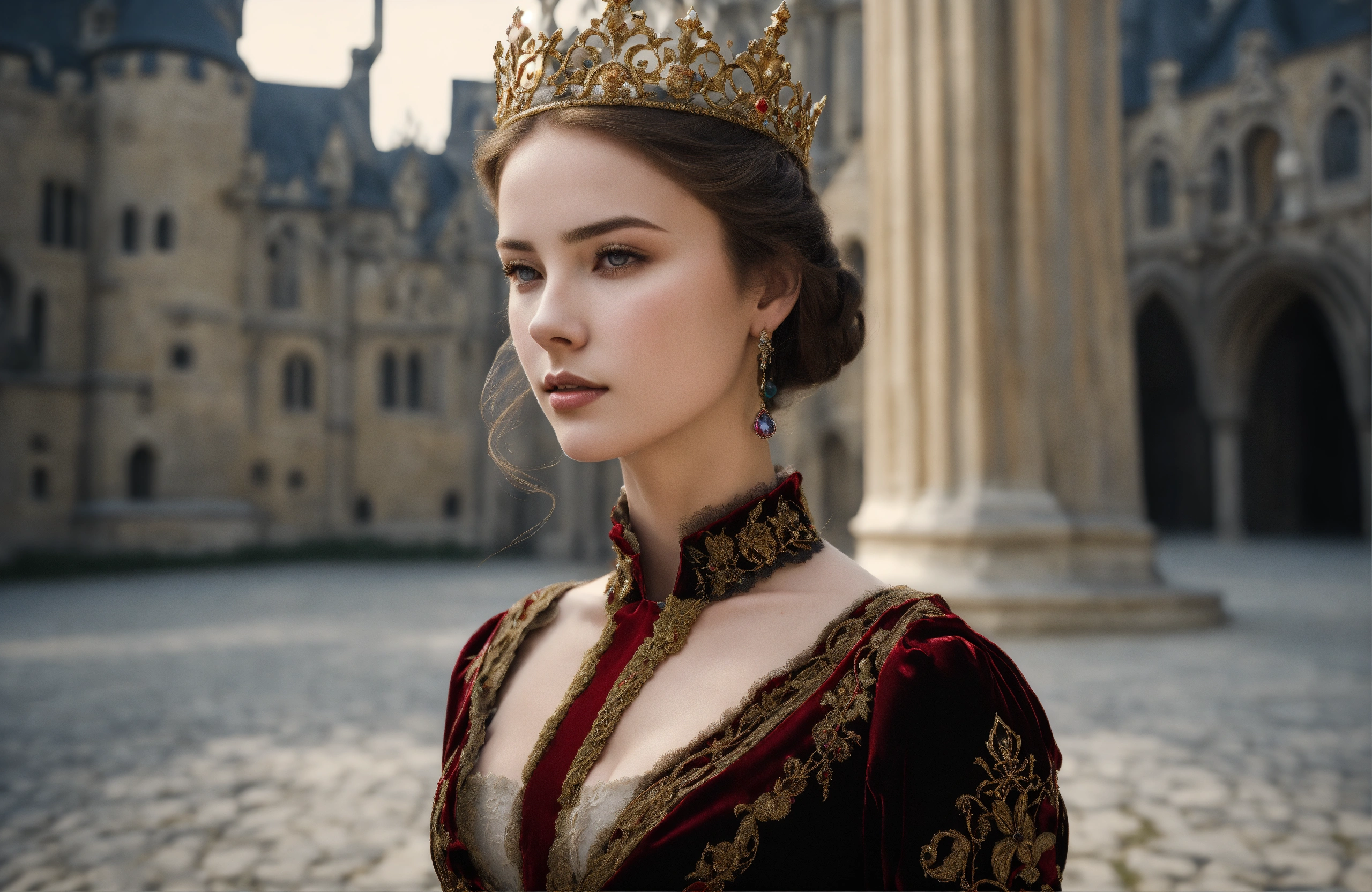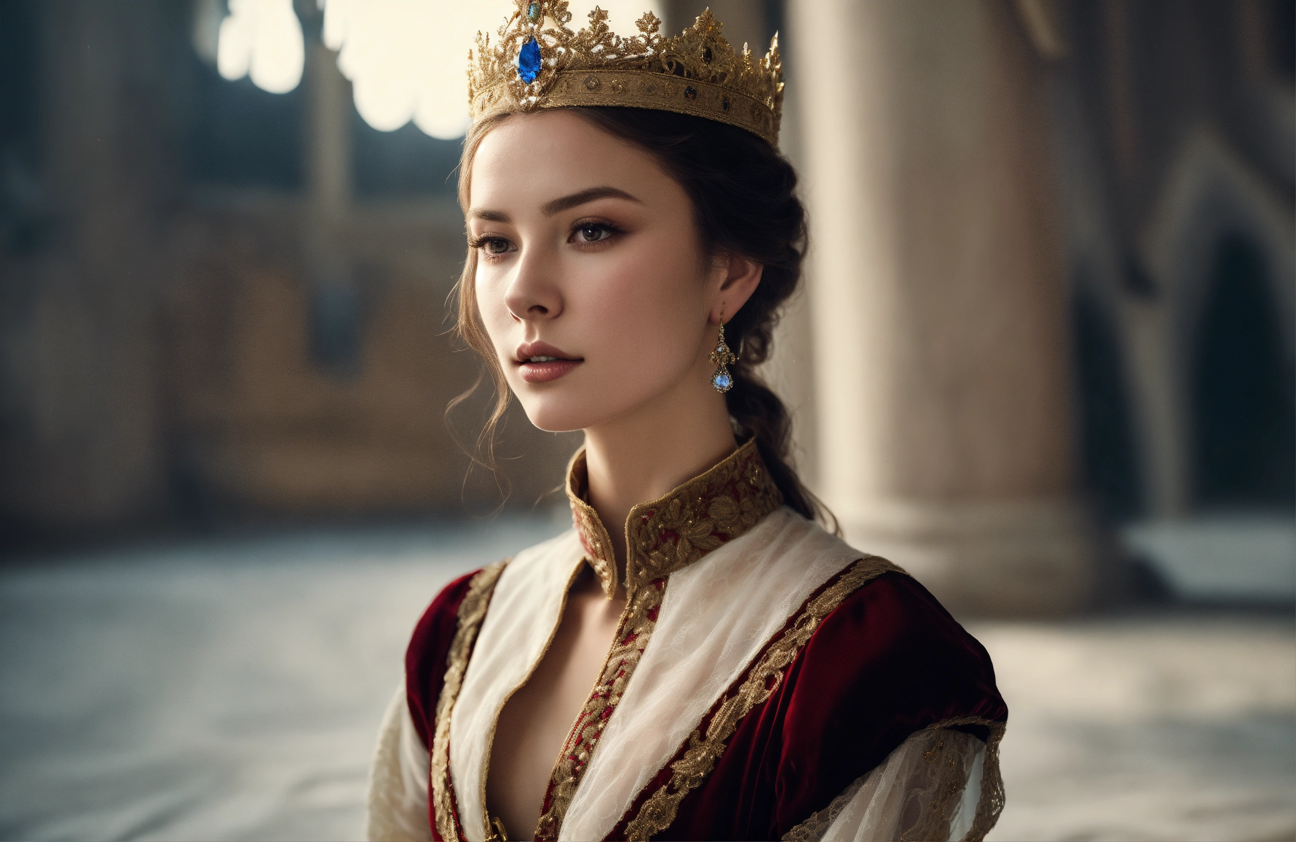 Fine art portrait photography, medieval setting, full body, very slim juvenile noble baroness, very young and juvenile apperearence, 18 years old, beautiful face, very childish appearance, stunningly beautiful, beauty in perfection, lordly, darkblond hair, narrow cheeks, ultra slim, ultra fragile build, ultra slim body, very flat bust, emaciated and thin, she seems ultra fragile, flawless skin, charmful, very narrow face, very pale, bright eyes, noble and elegant narrow medieval lace silk dress with very low-cut decollete and trumpet sleeves, underneath a tight corset, ultra expansive and deep neckline, magnificent finely chased baroness crown richly set with gemstones and a veil, choker, brocade coat, body portrait, intimate, she sits in a noble pose on a throne in a castle, photo realistic, 8k, soft light, volumetric lighting, highly detailed
