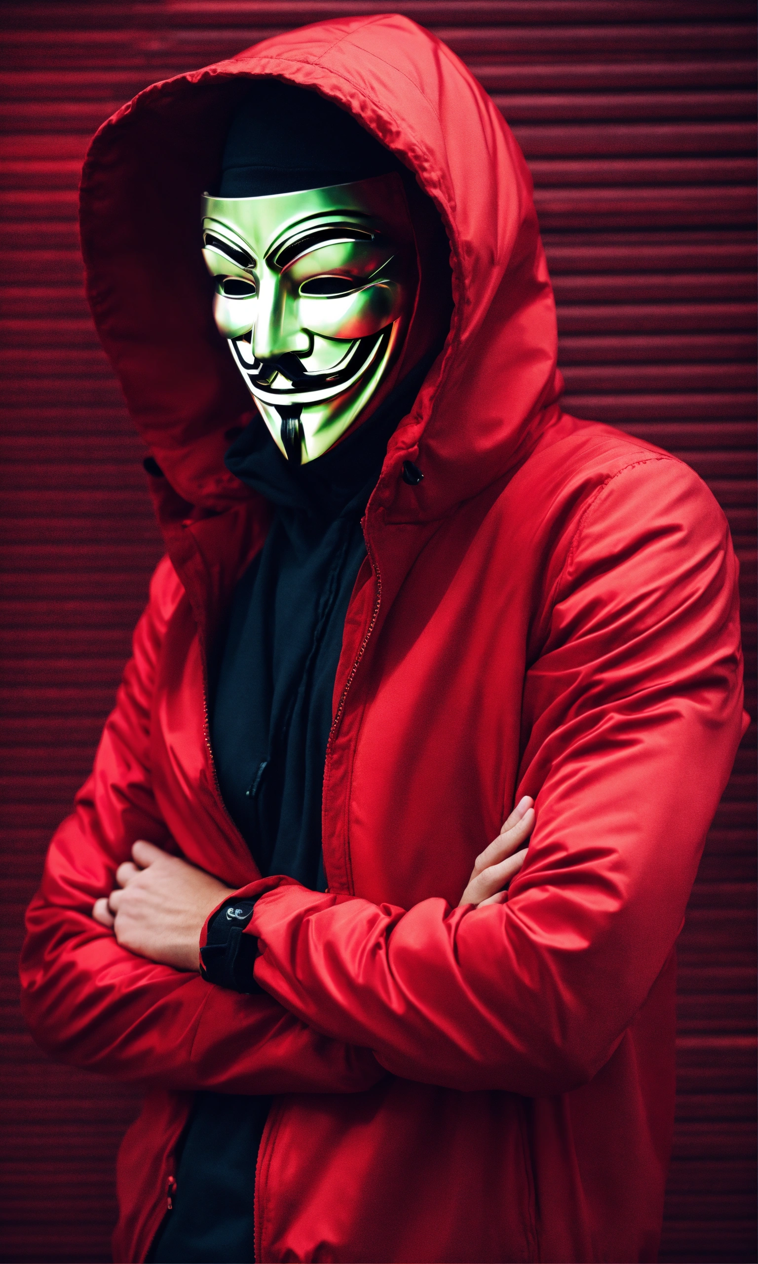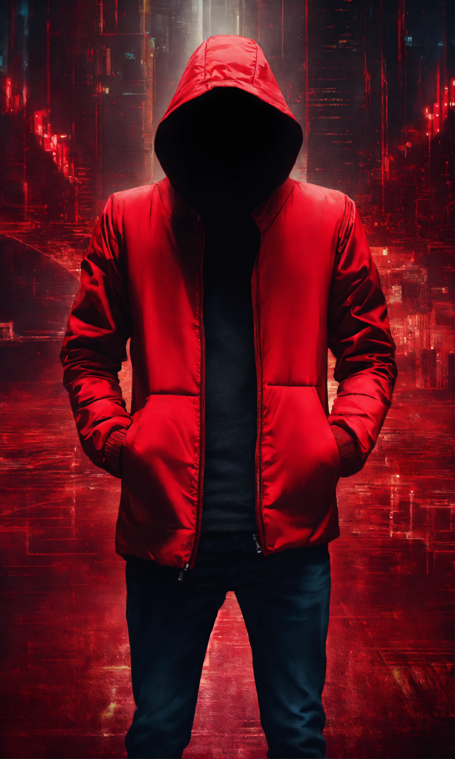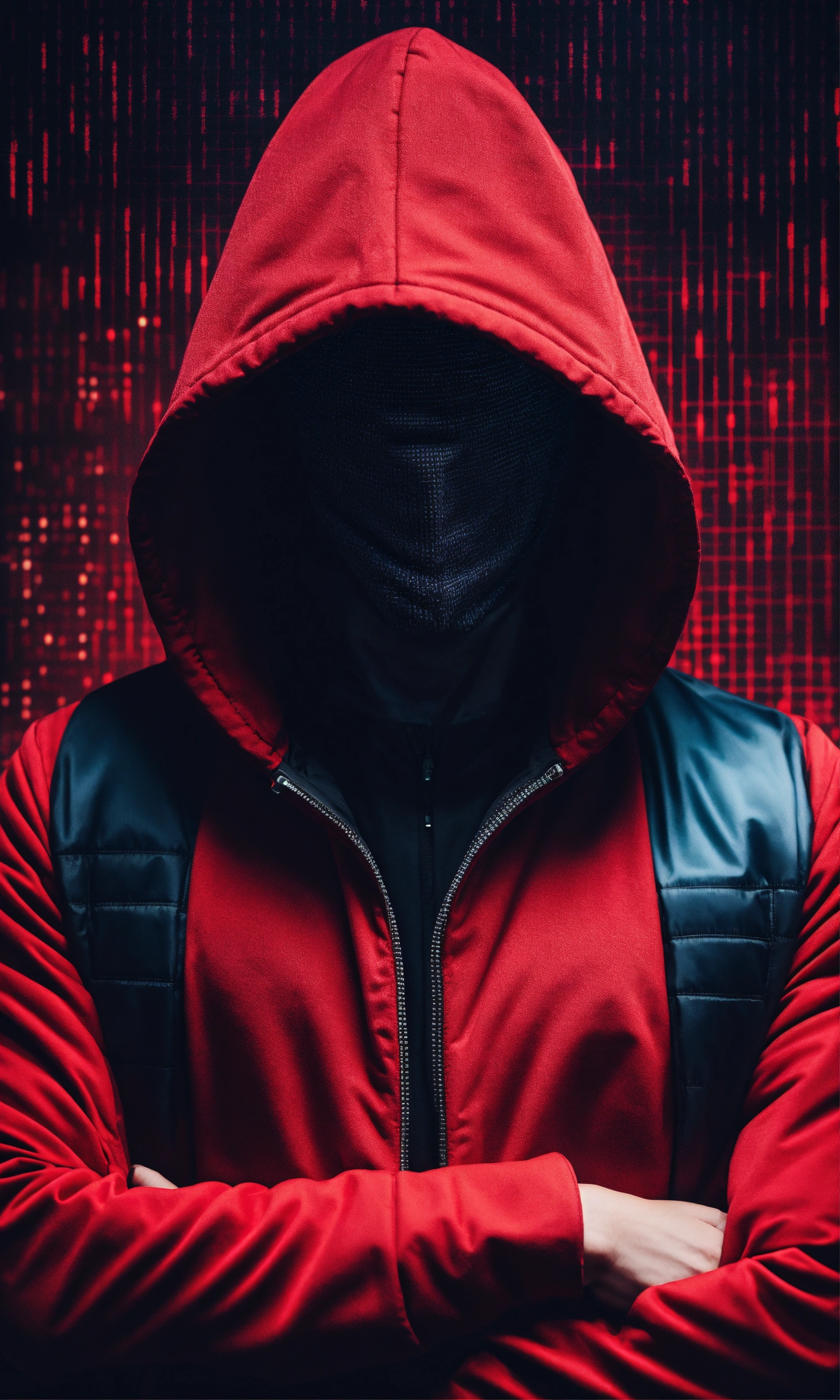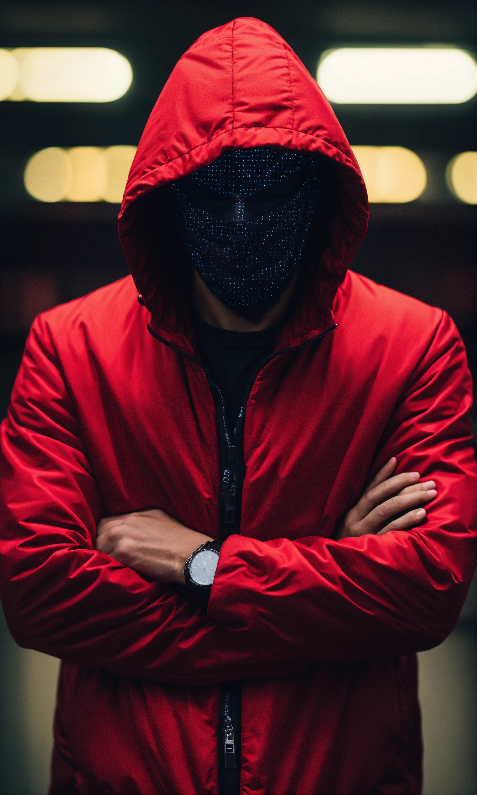 Anonymous hacker in red jacket with hidden face with arms crossed