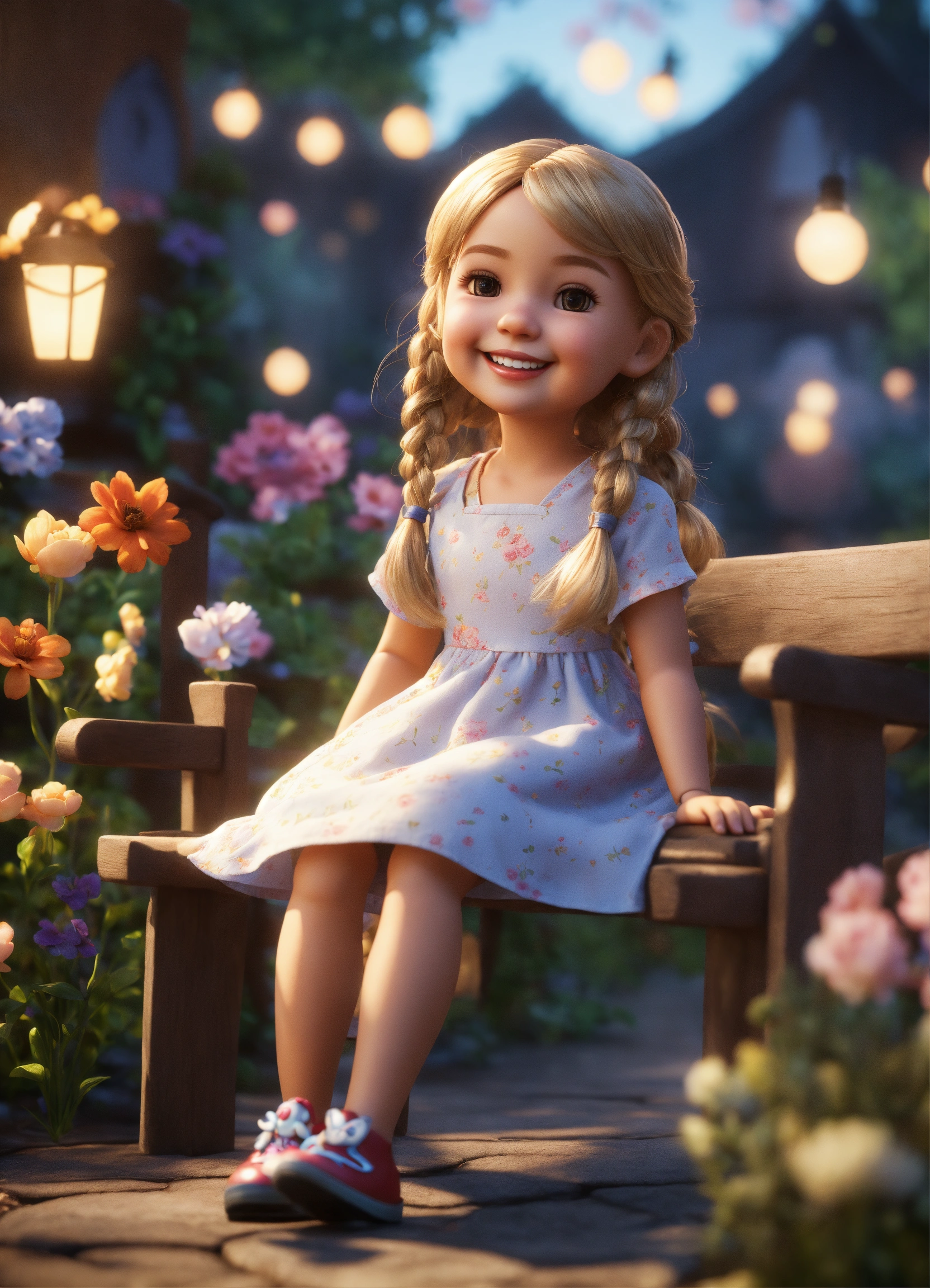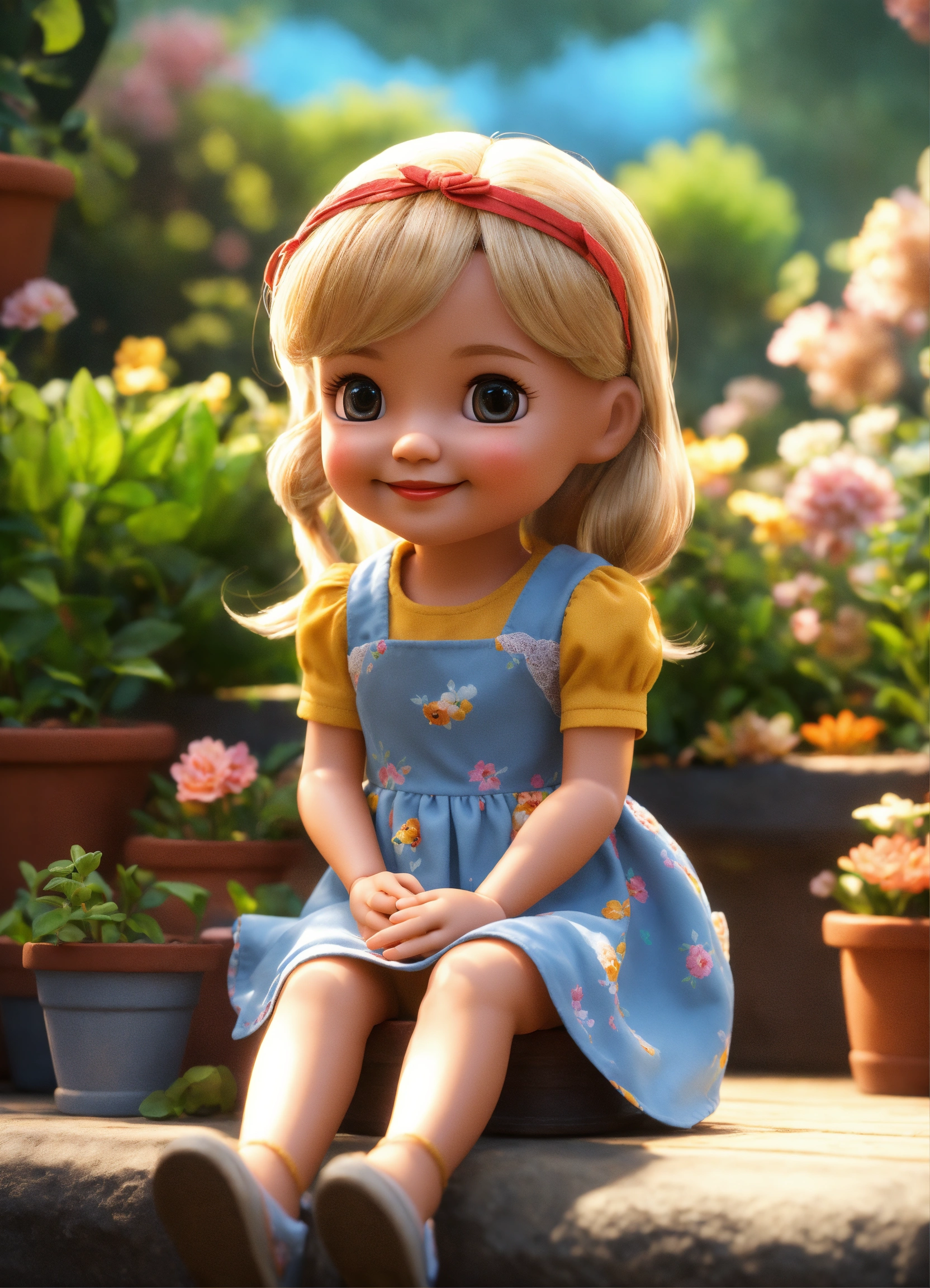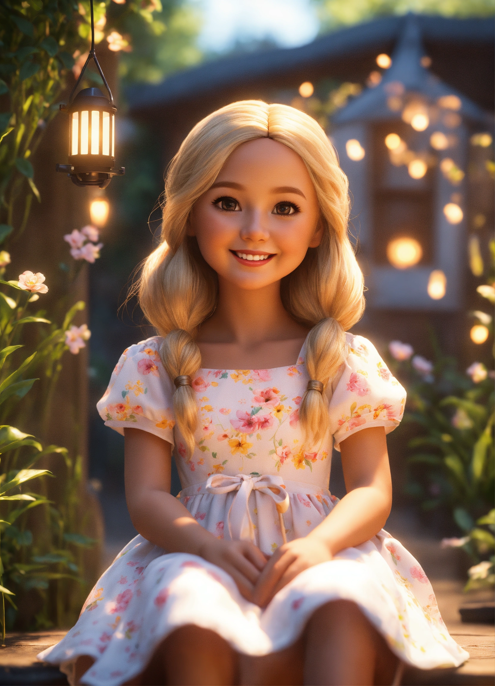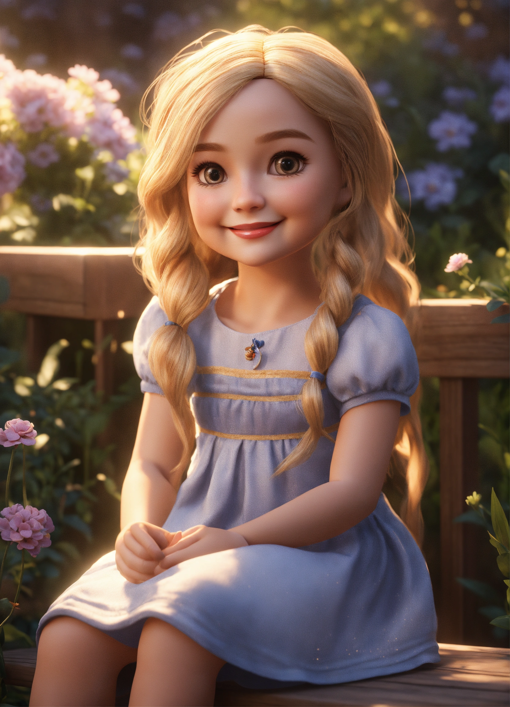 Cute adorable doll style tiny girl smiling greeting me, long blond hair, she wears a summer dress, unreal engine, she is seated, outdoor garden lighting, art station, detailed digital painting, cinematic, character design by pixar, unreal 5, daz, hyper realistic.