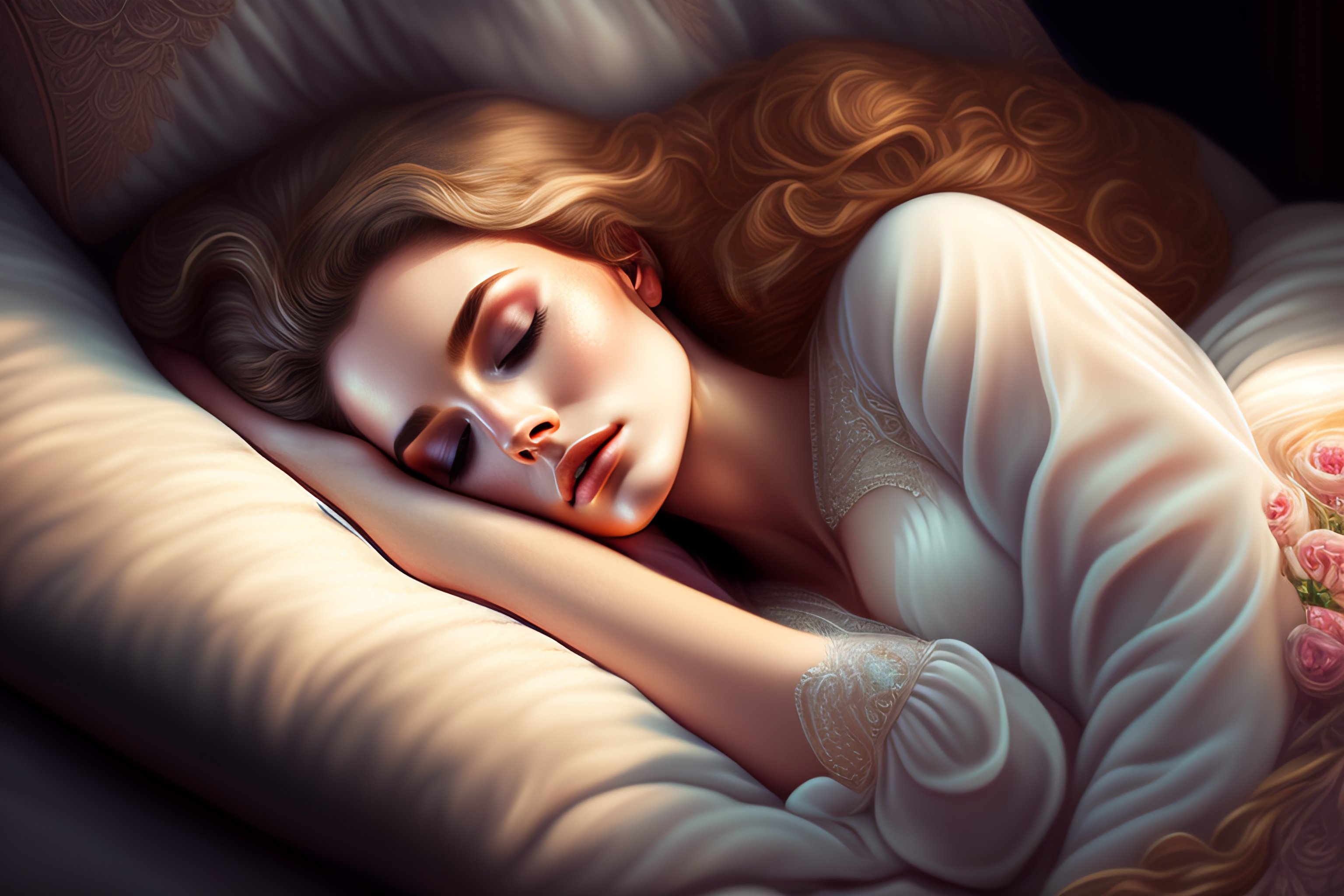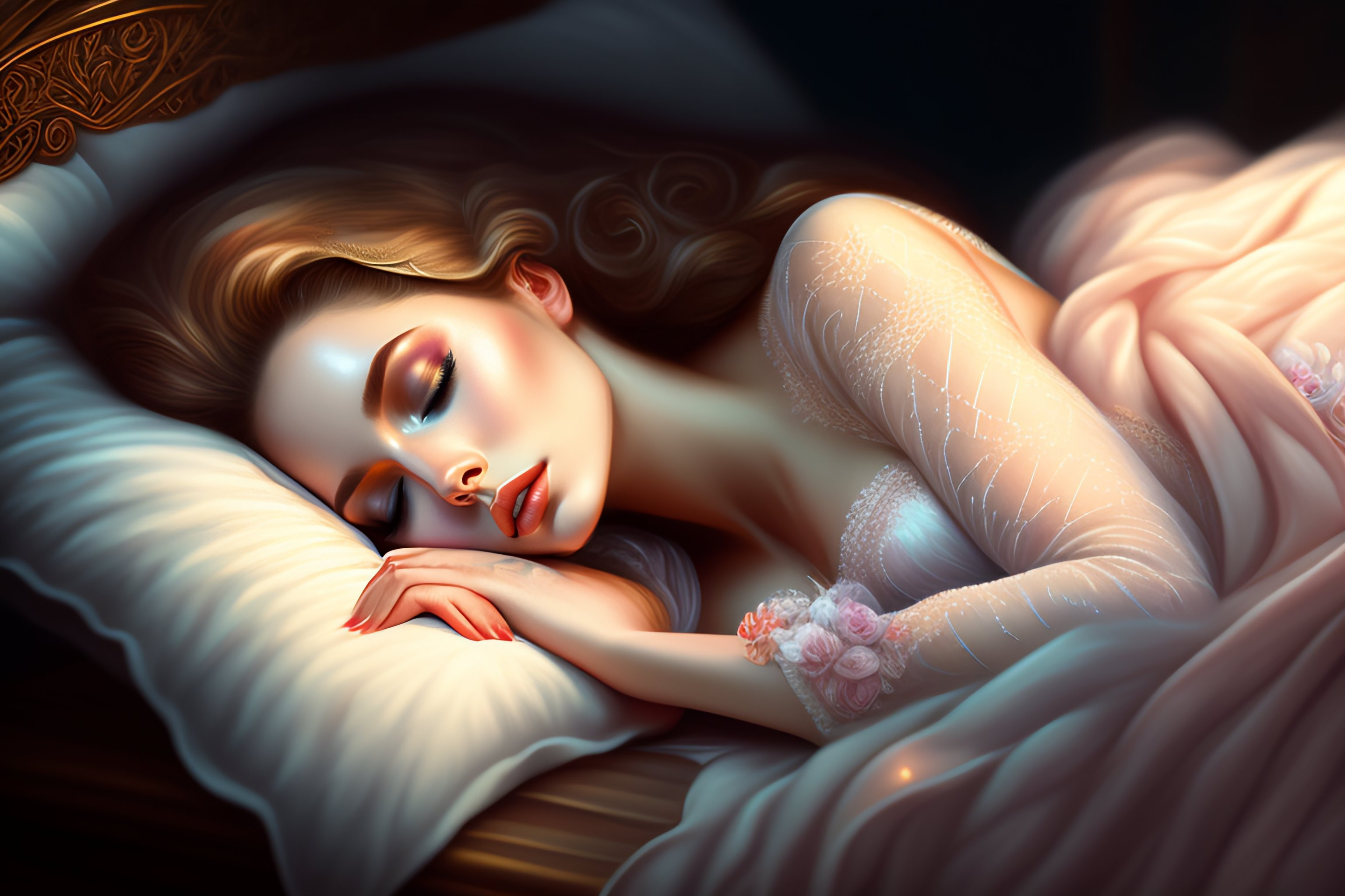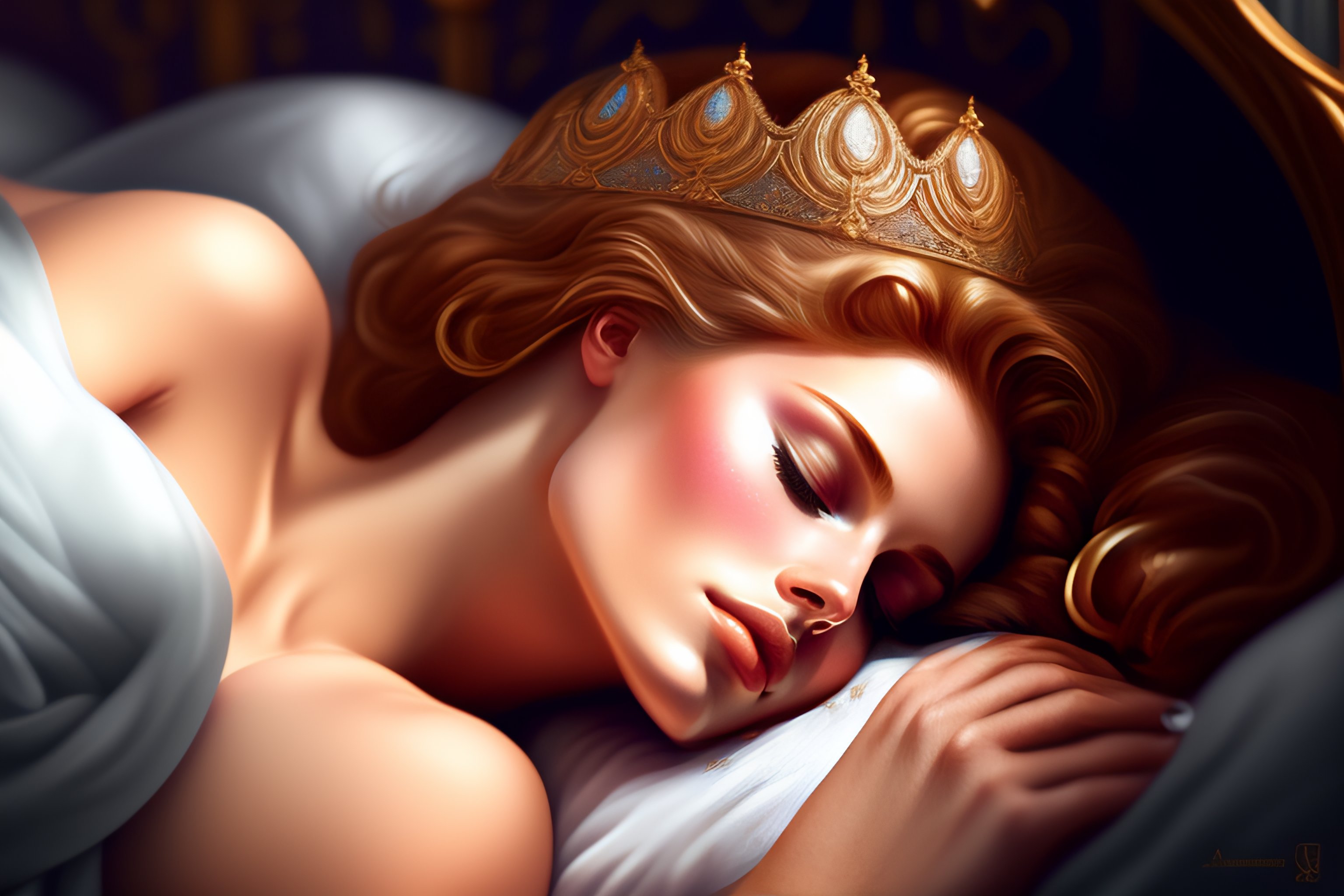 Sleeping beauty, lying on a bed, asleep, intricate, elegant, sharp focus, illustration, highly detailed, digital painting, concept art, matte