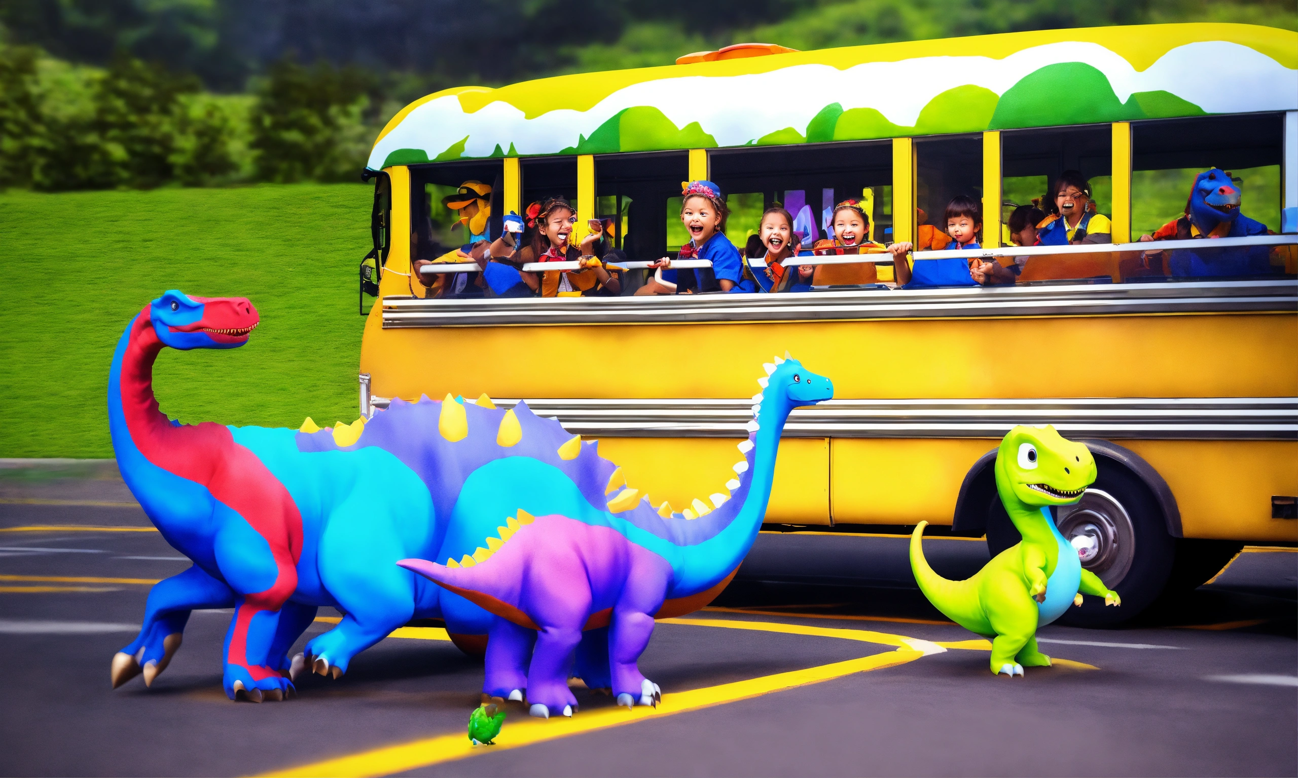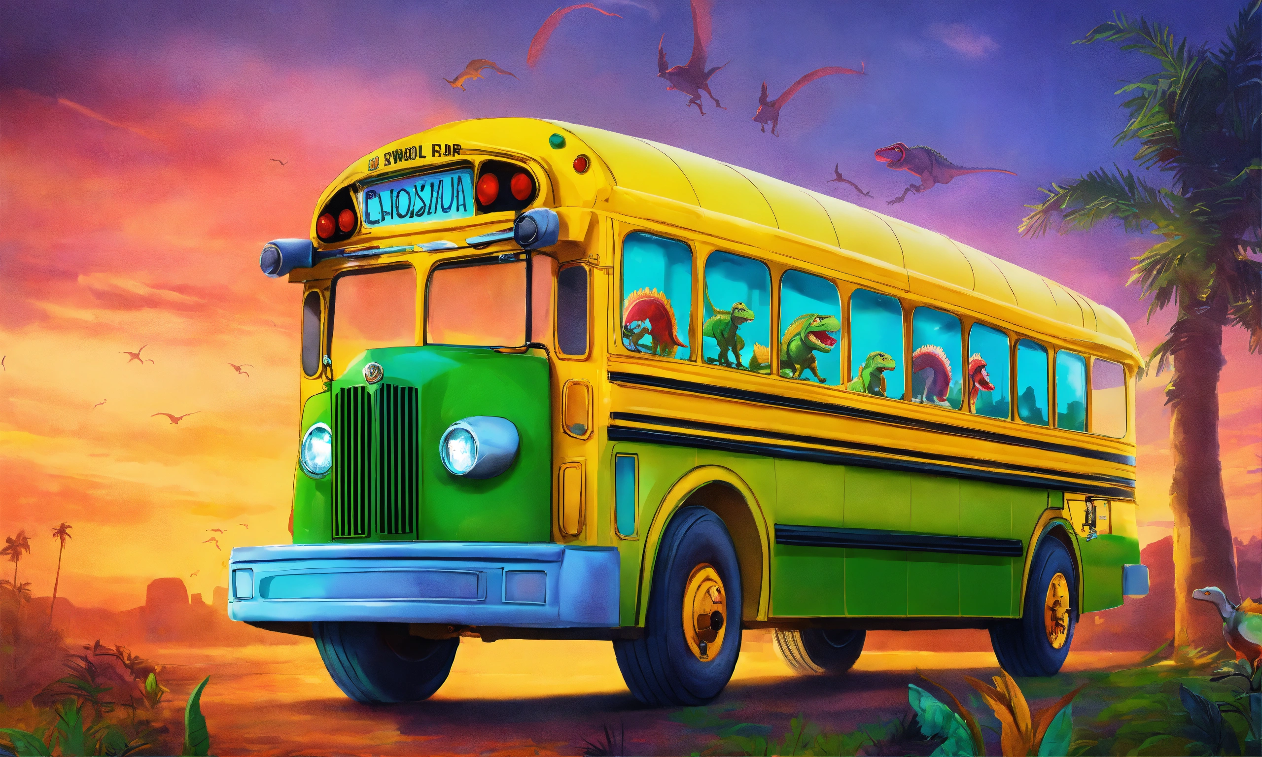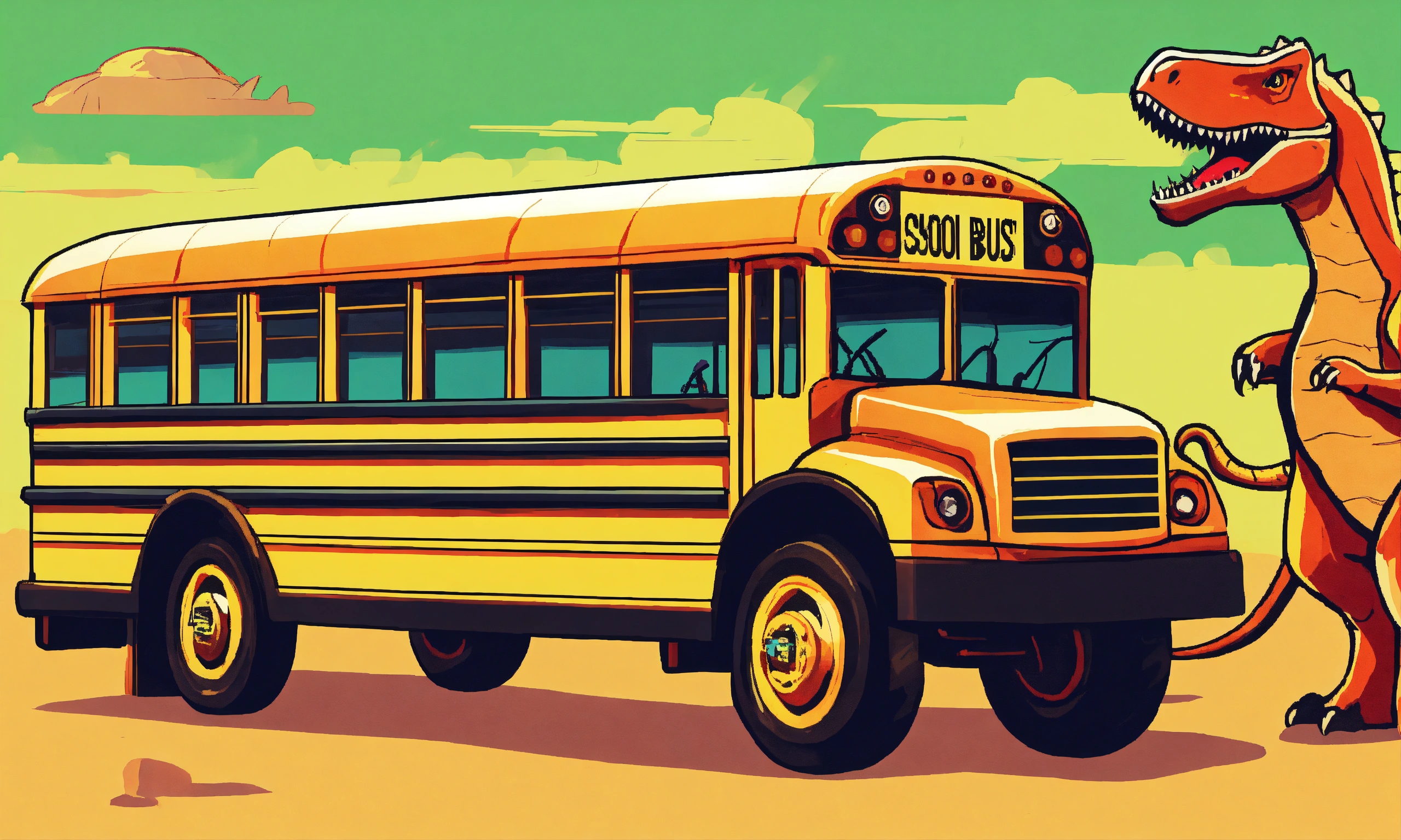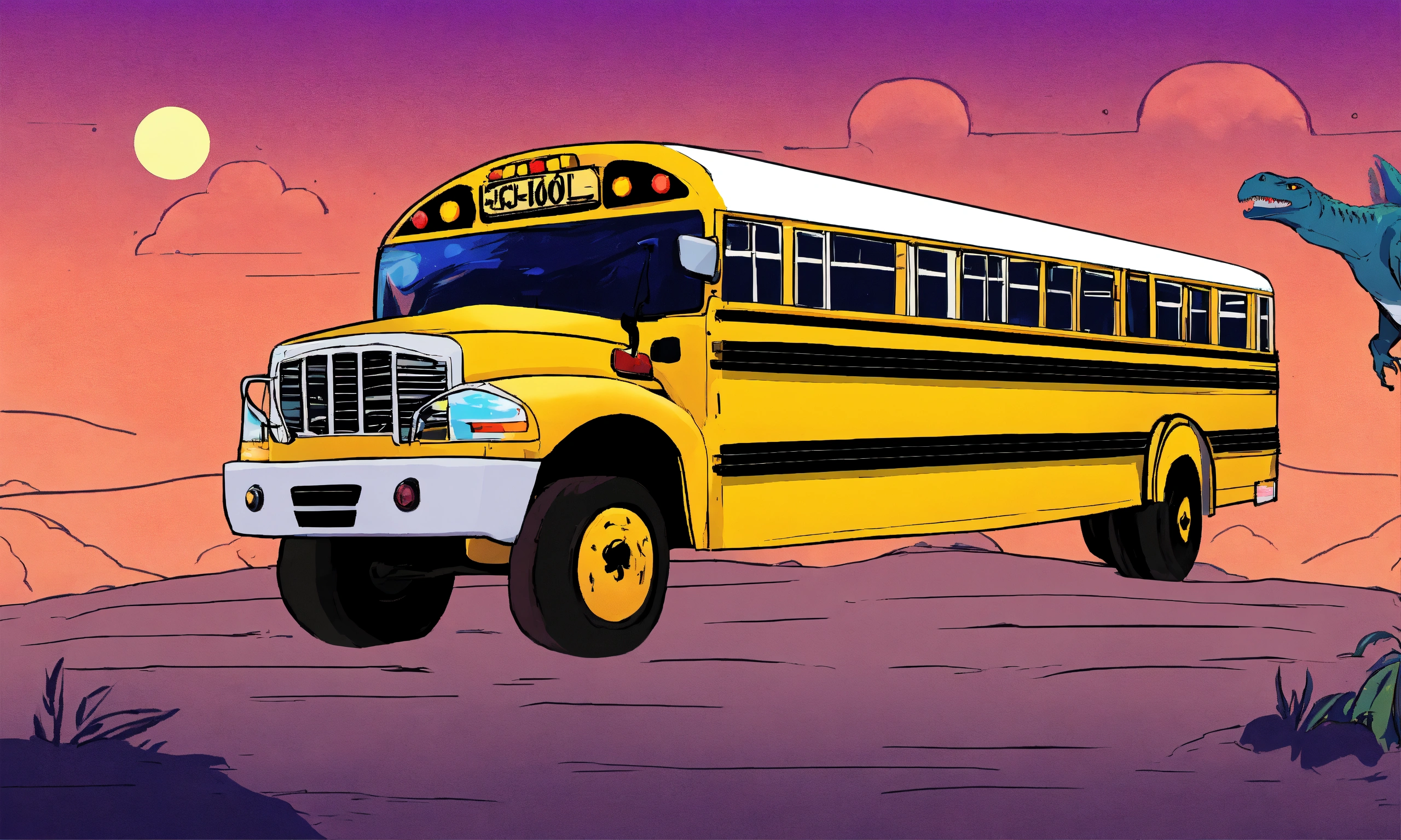 Create a unique image of a dinosaur school bus. i would like the dinosaur to look like a bus and have a white outline around it. please make the image creative and vibrant, so it looks fun and appealing