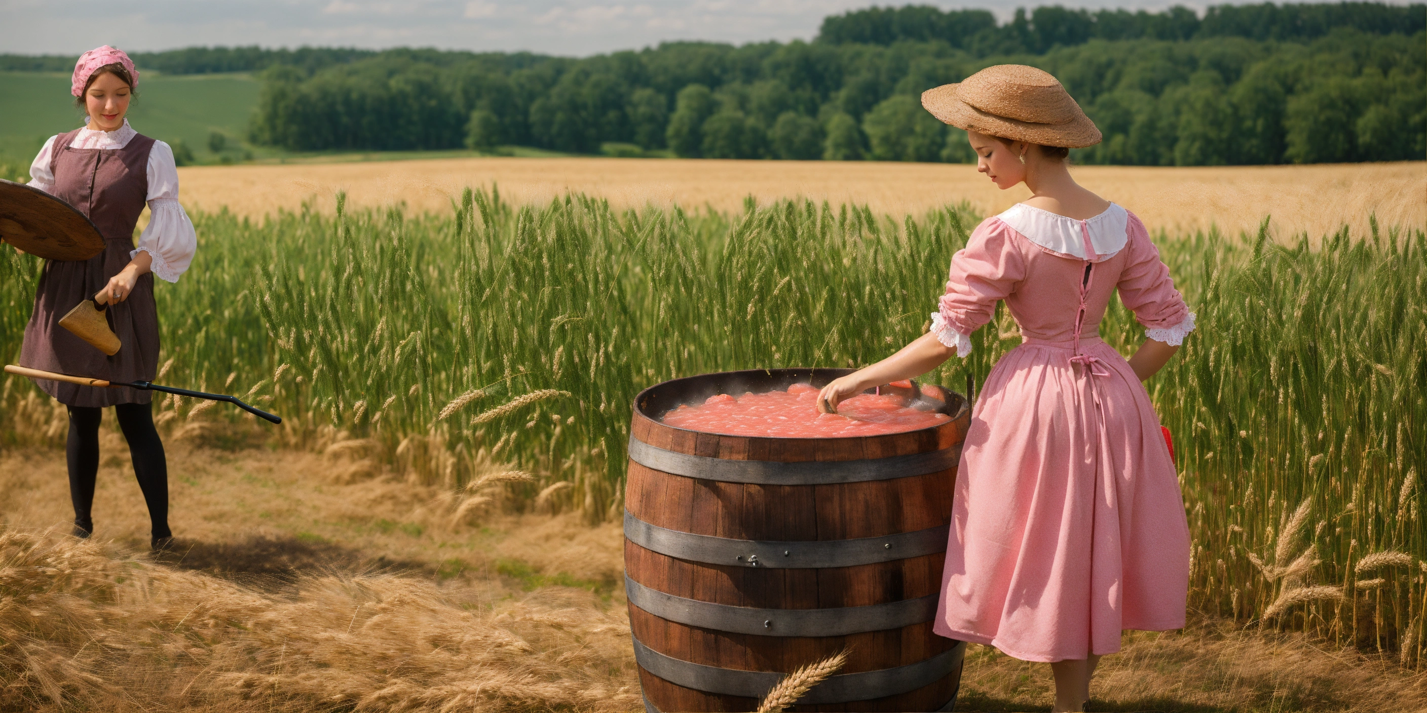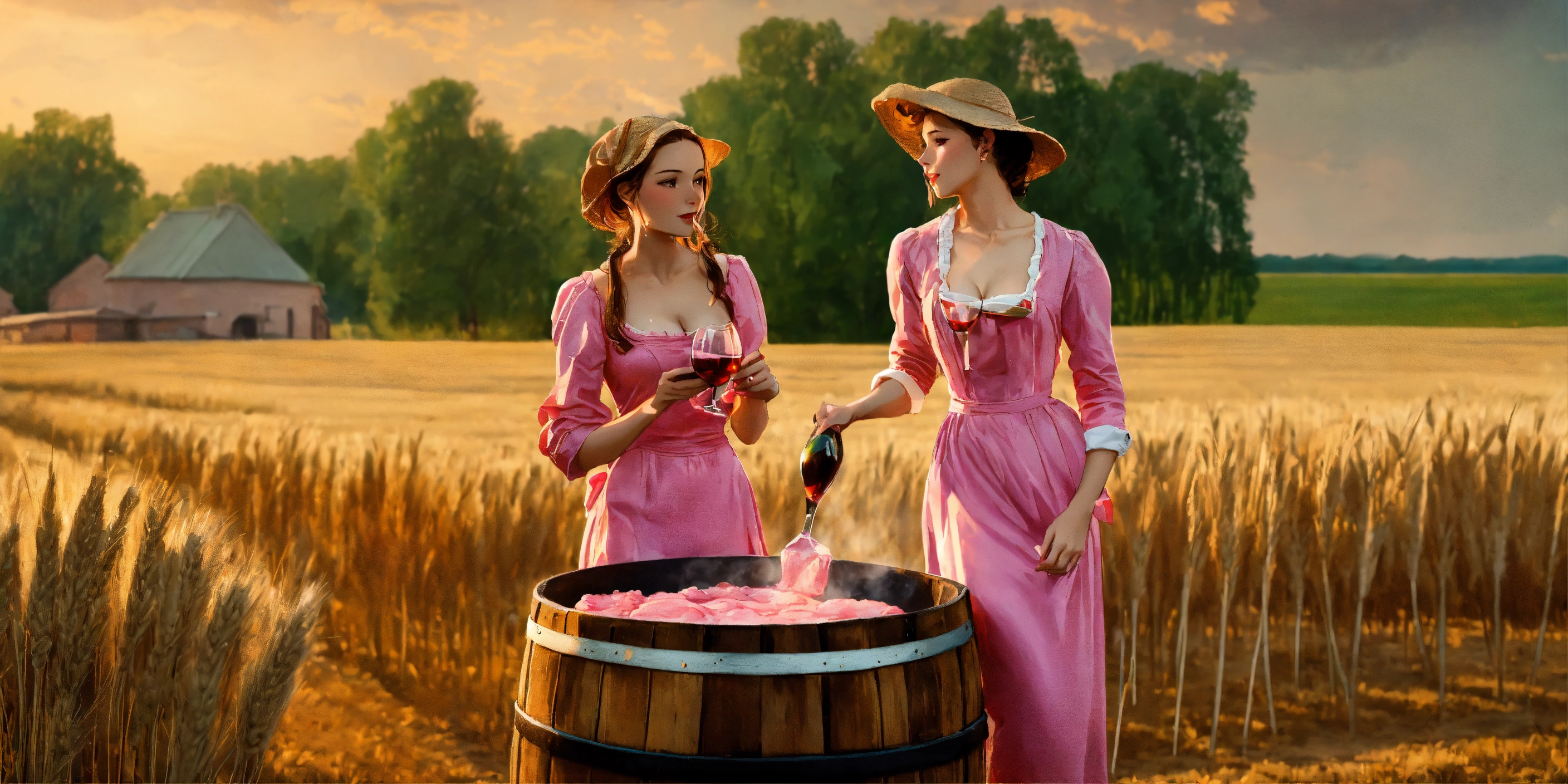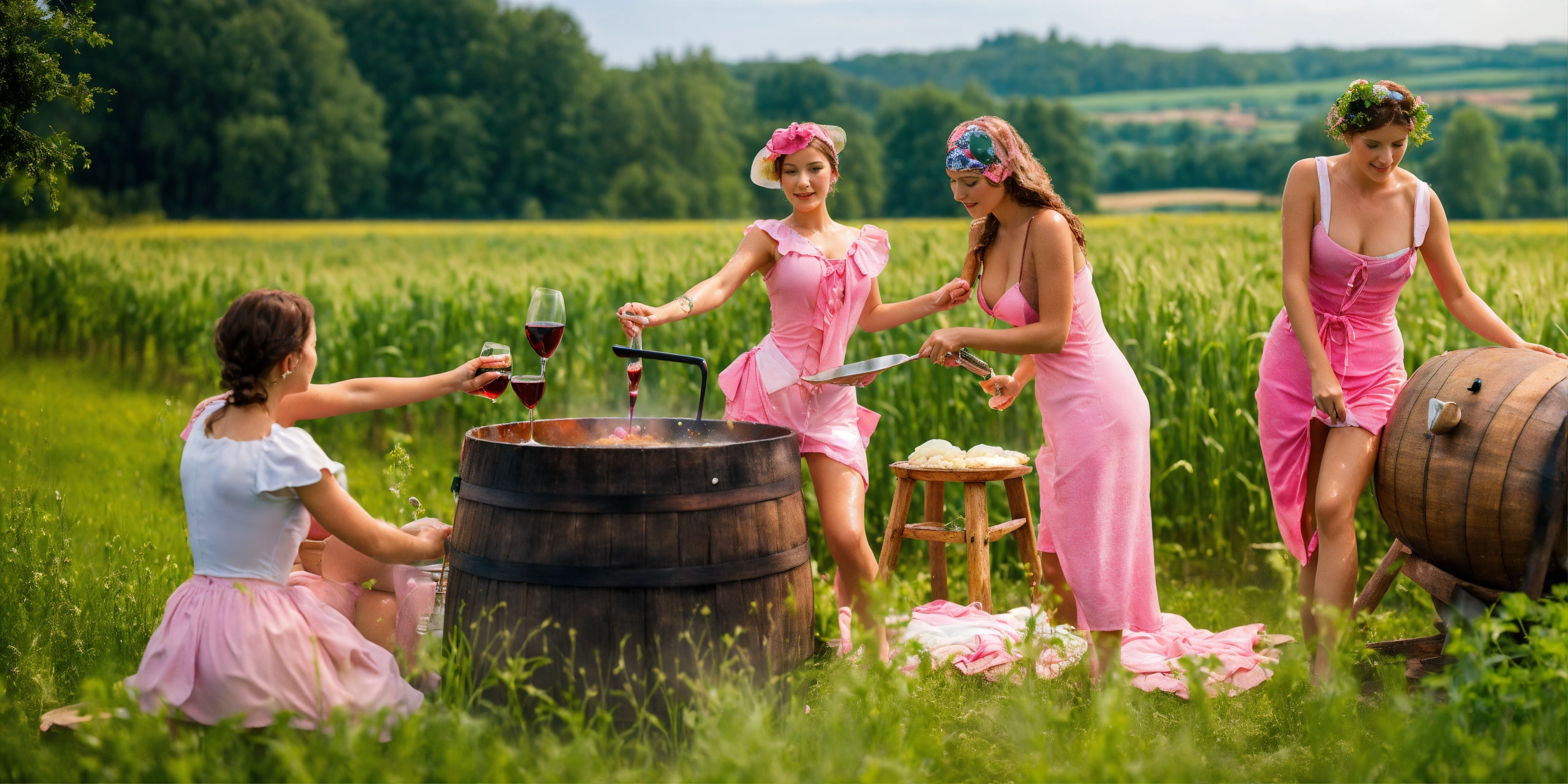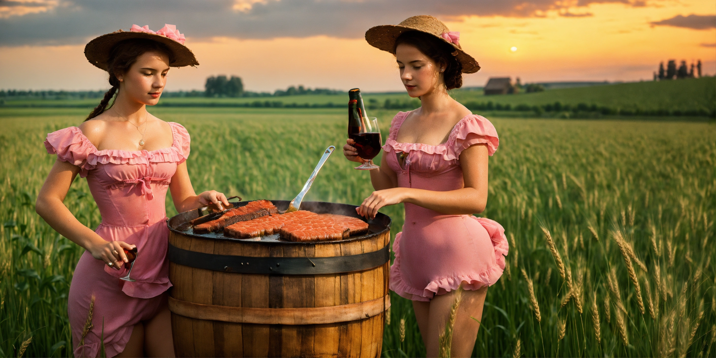 19th century young ladies in a pink swimming suit frying steaks on a wooden barrel, and drinking wine in a field of wheat in ukraine