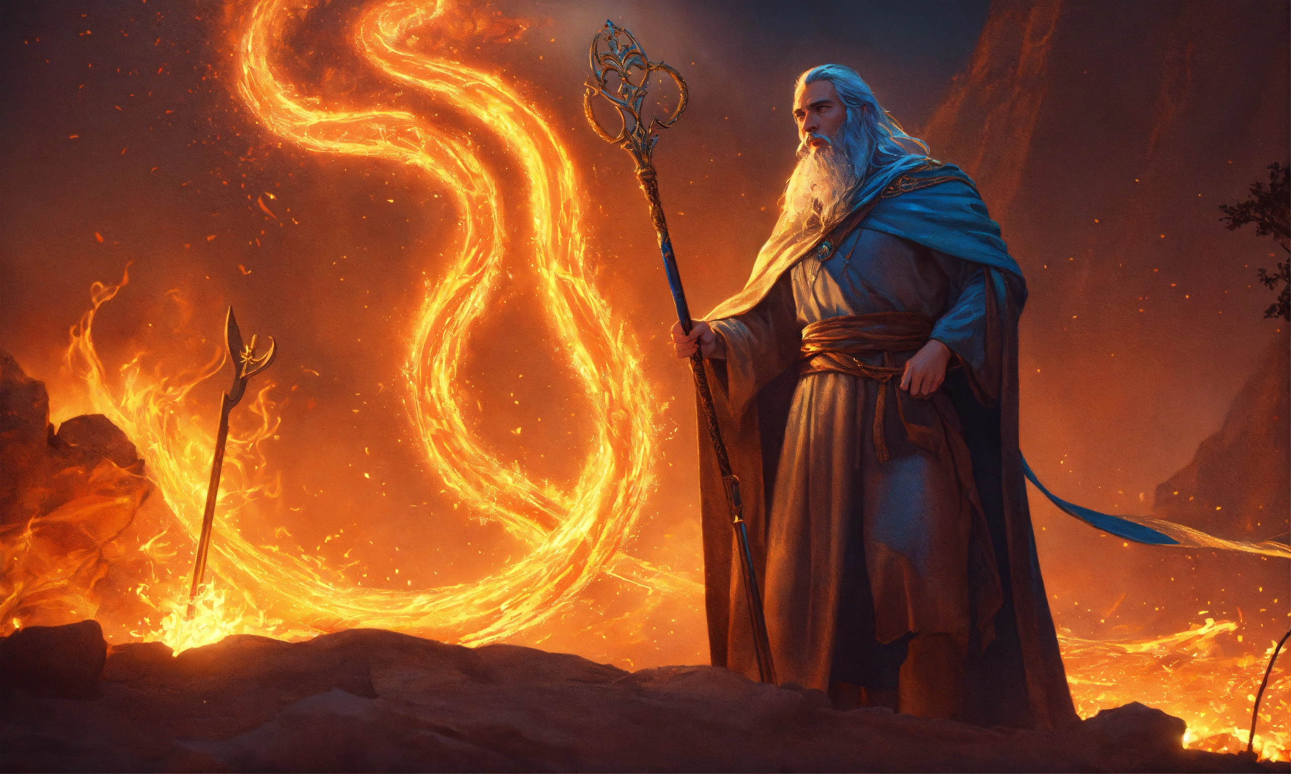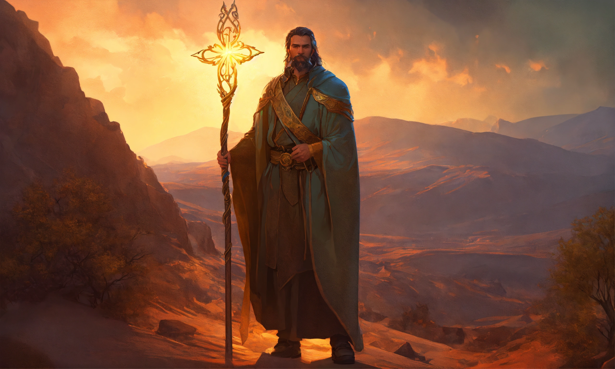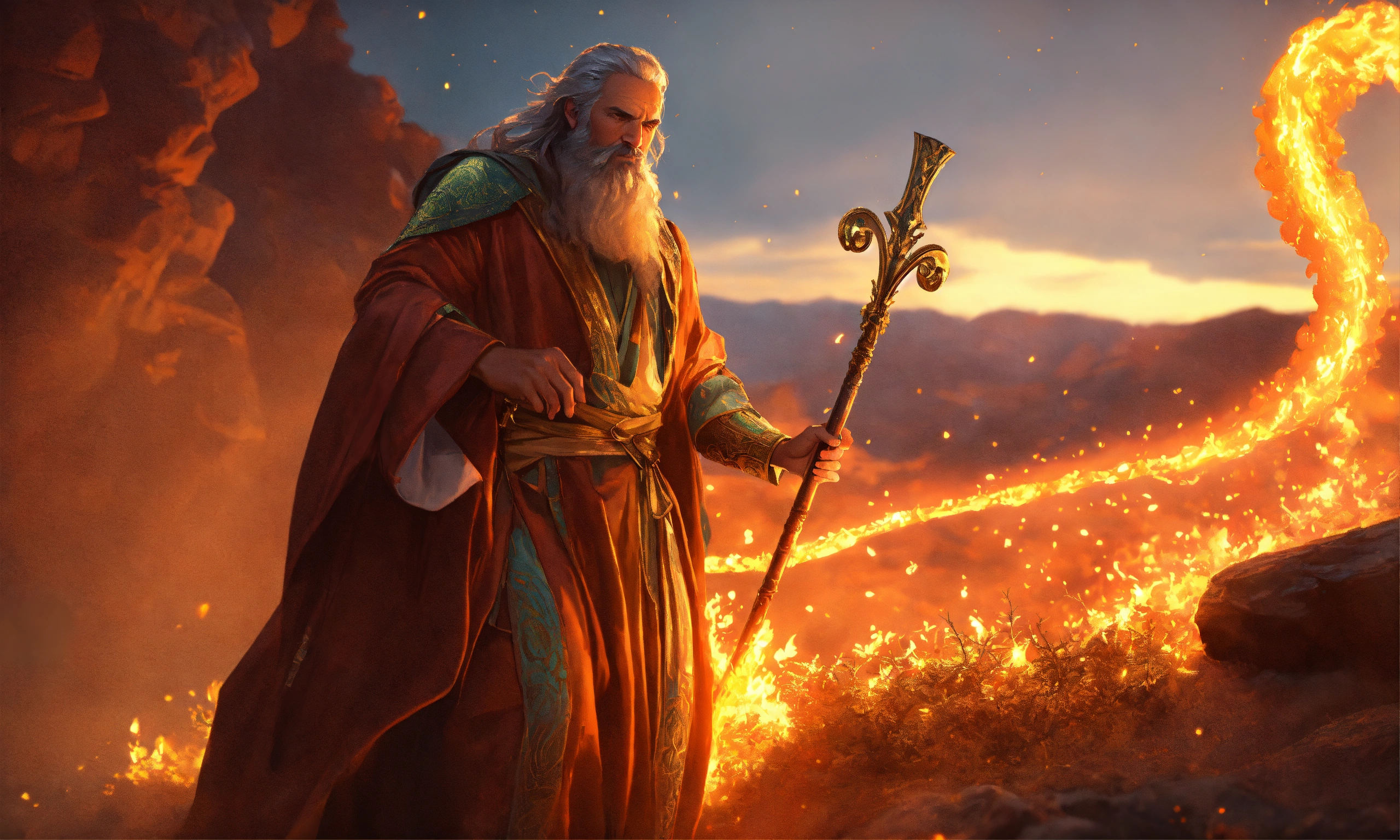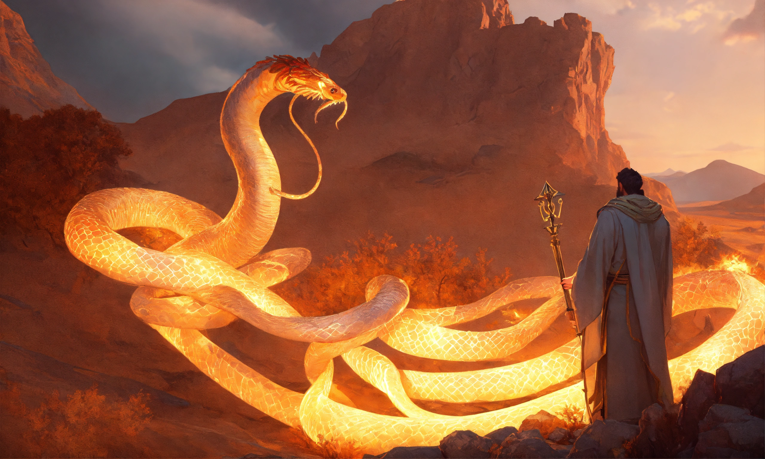 Moses with staff, talks to god in the burning bush, turns his staff into a snake, cinematic lighting, complex, elegant, super detailed, art station, concept art, smooth, sharp focus, no blur, no dof, extreme illustration, unreal engine 5, photorealism, hd quality, 8k resolution, cinema 4d, 3d, beautiful, delicate, art by artgerm and greg rutkowski and alphonse mucha and loish and wlop