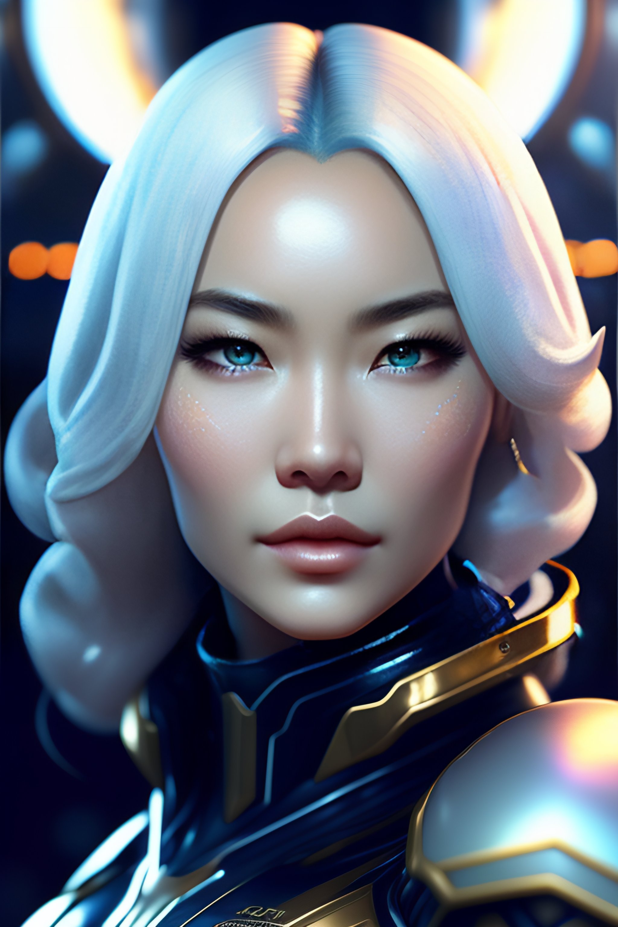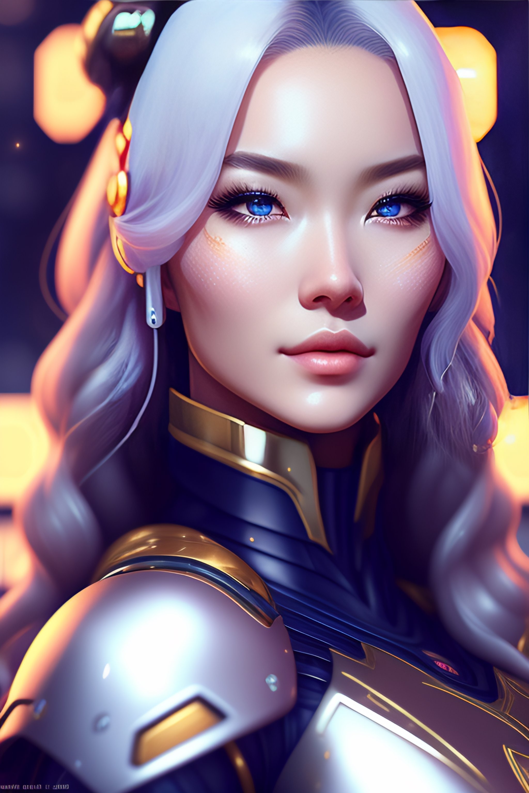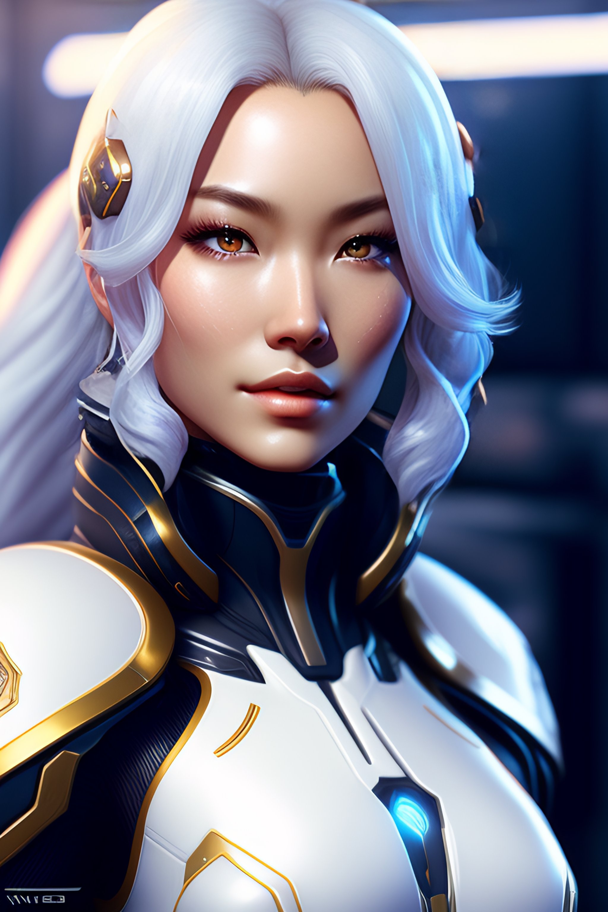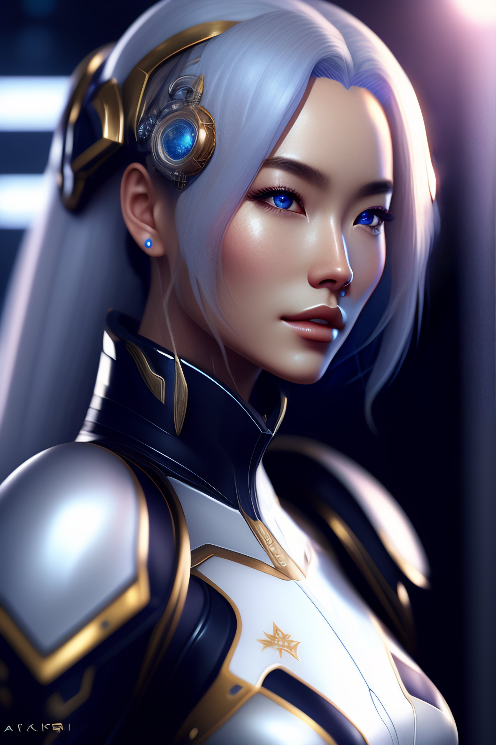Detailed portrait of perfect android girl, warframe armor, beautiful face, scifi, futuristic, space station, laboratory, song hye - kyo, dreamy, long white hair, blue cyborg eyes, cinematic lighting, innocent, highly detailed, sharp focus, smooth, artstation, intricate, award winning, pure aura, divine, by akihiko yoshida