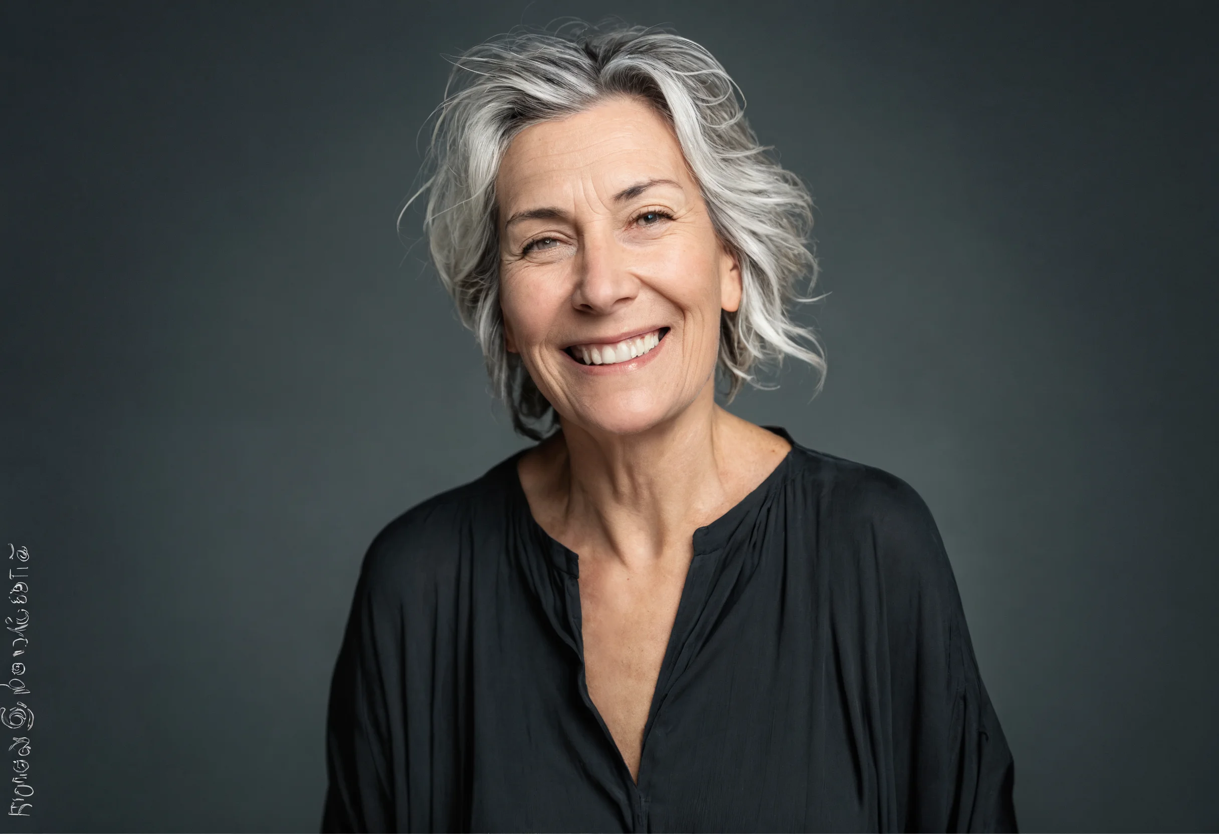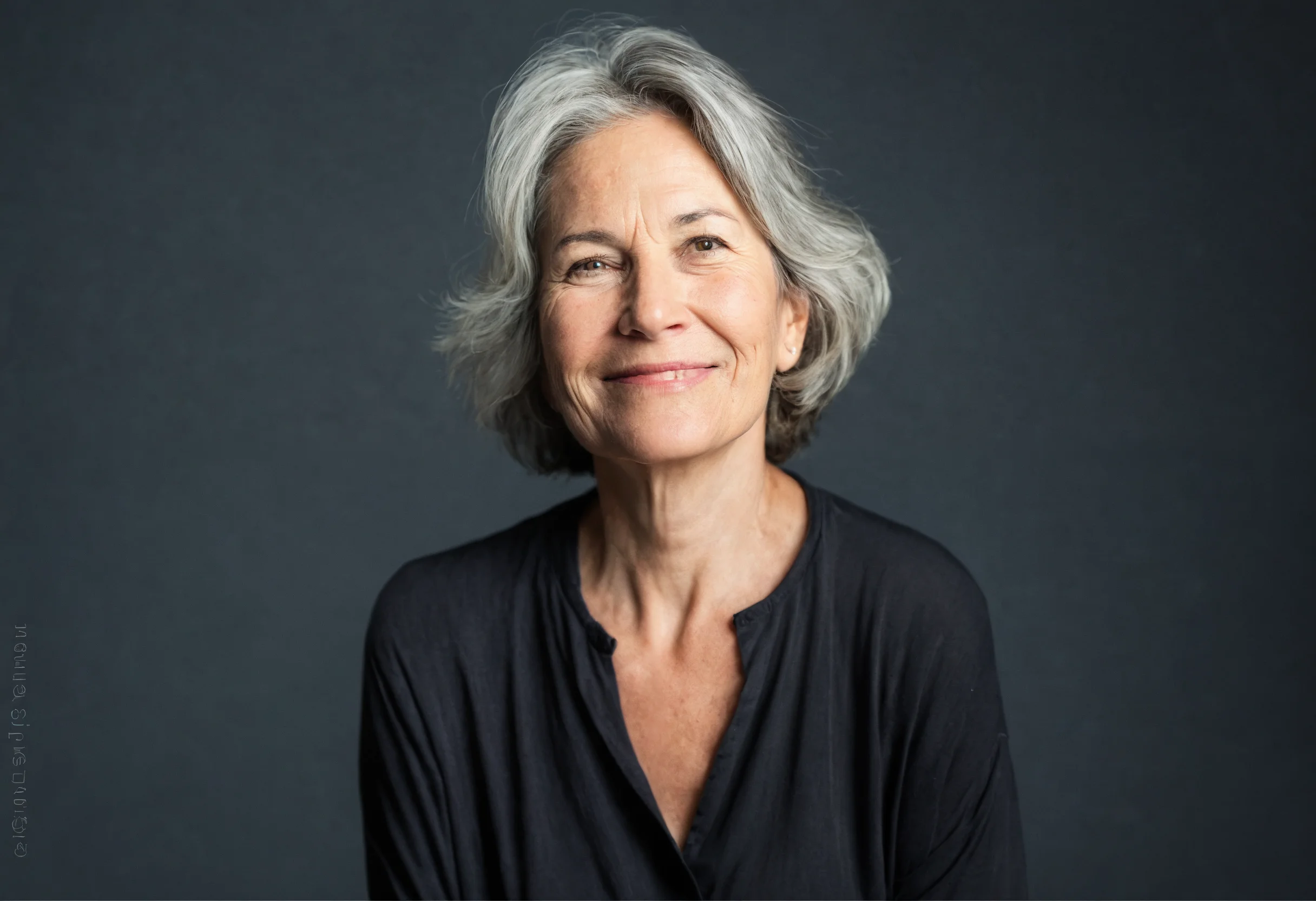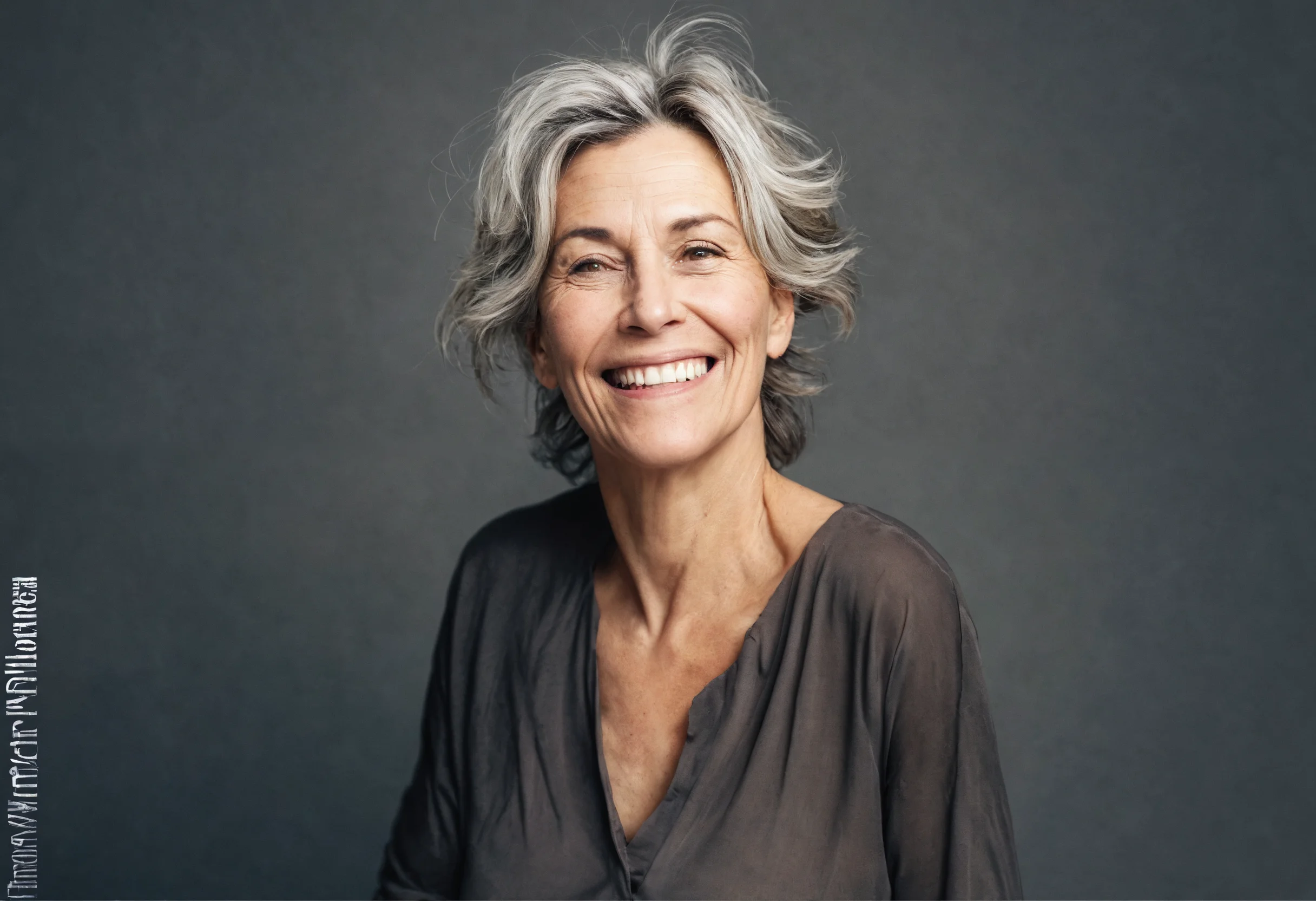 Natural photo of a happy 52-year-old woman on a grey background in a studio with slight wrinkles looking at the camera with a wry smile