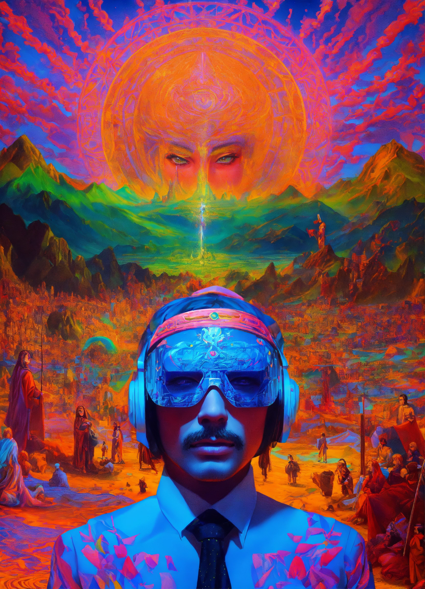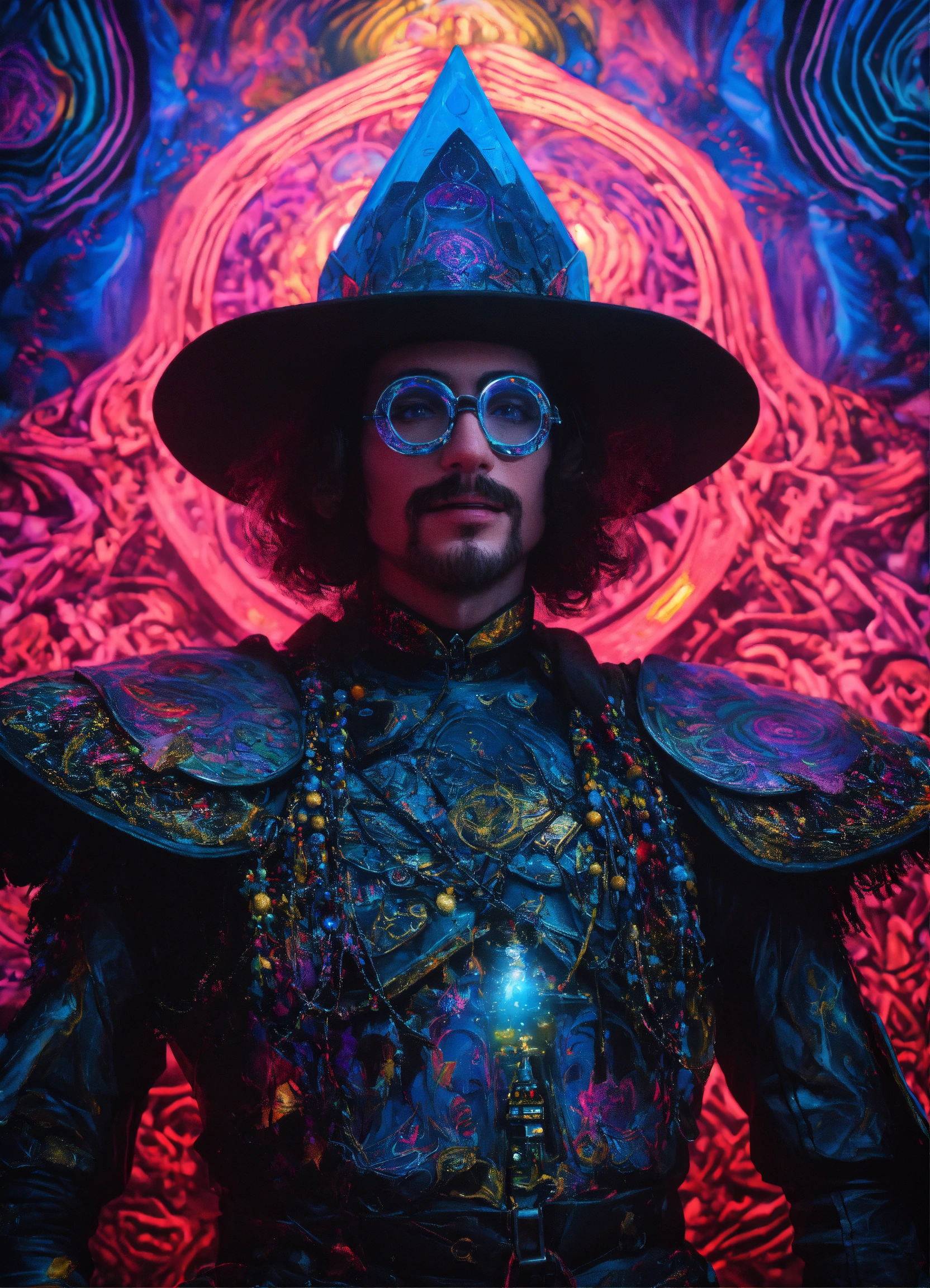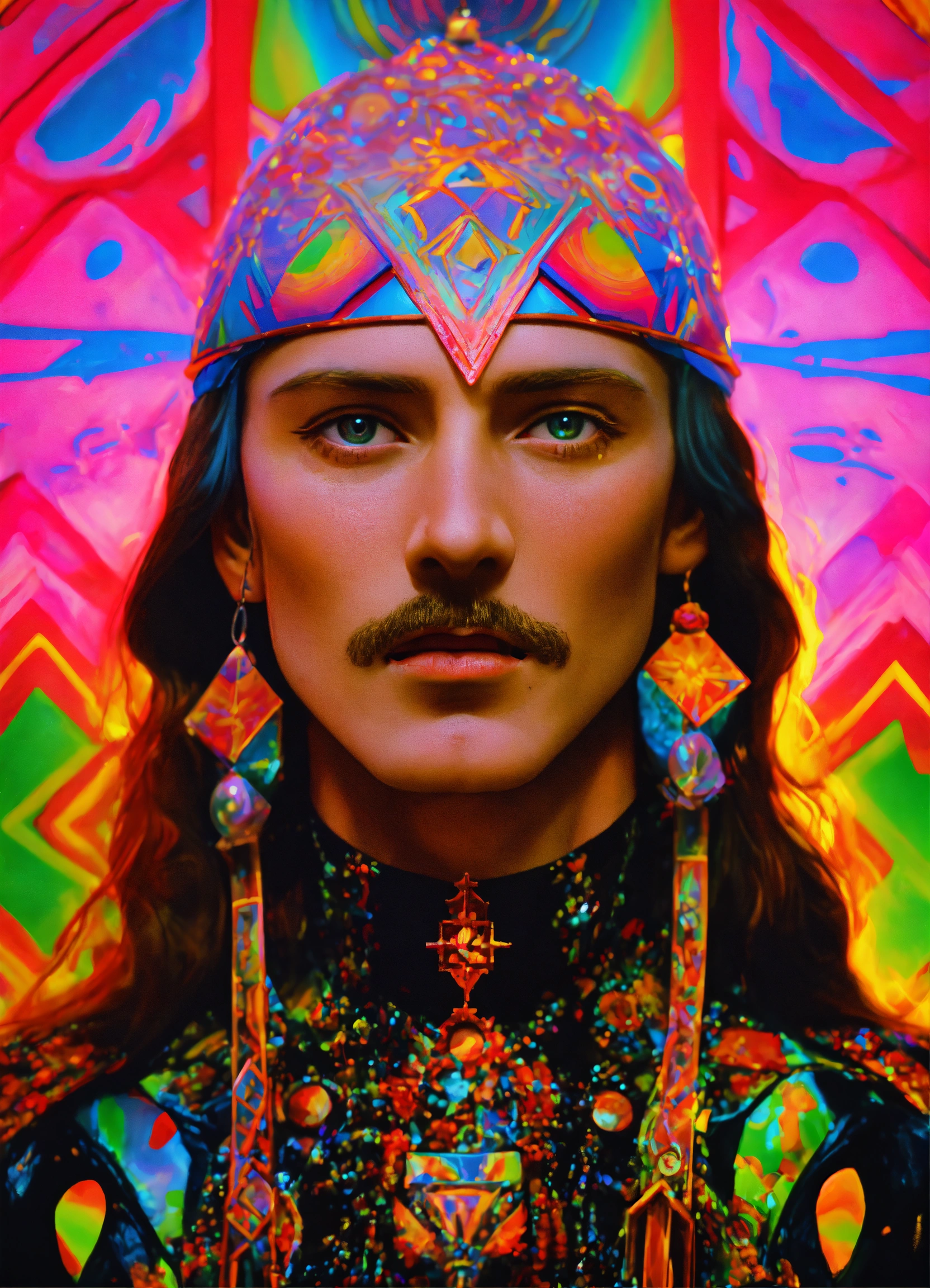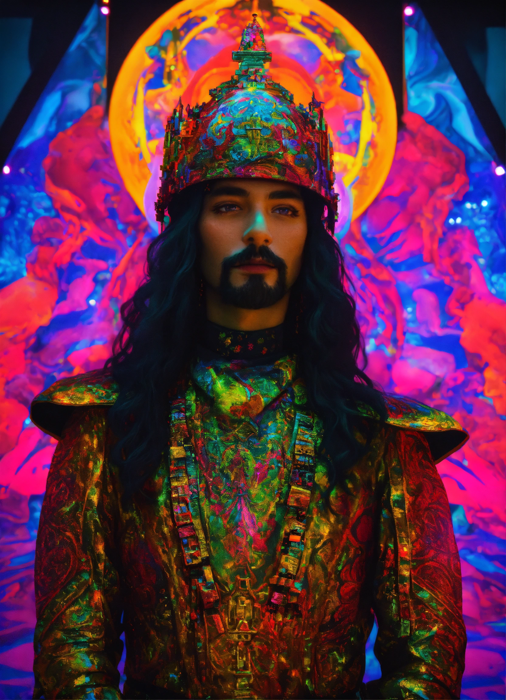 Holy mountain the movie photorealistic 3d 35 mm portrait of gothic male warrior man ai god dmt laughing psytrance grimes punk rock anime haute couture costume, baptized in a cosmic alex grey painting in a dmt black laser light neon black glitter holographic techno club art by salvador dali and holy mountain the movie.