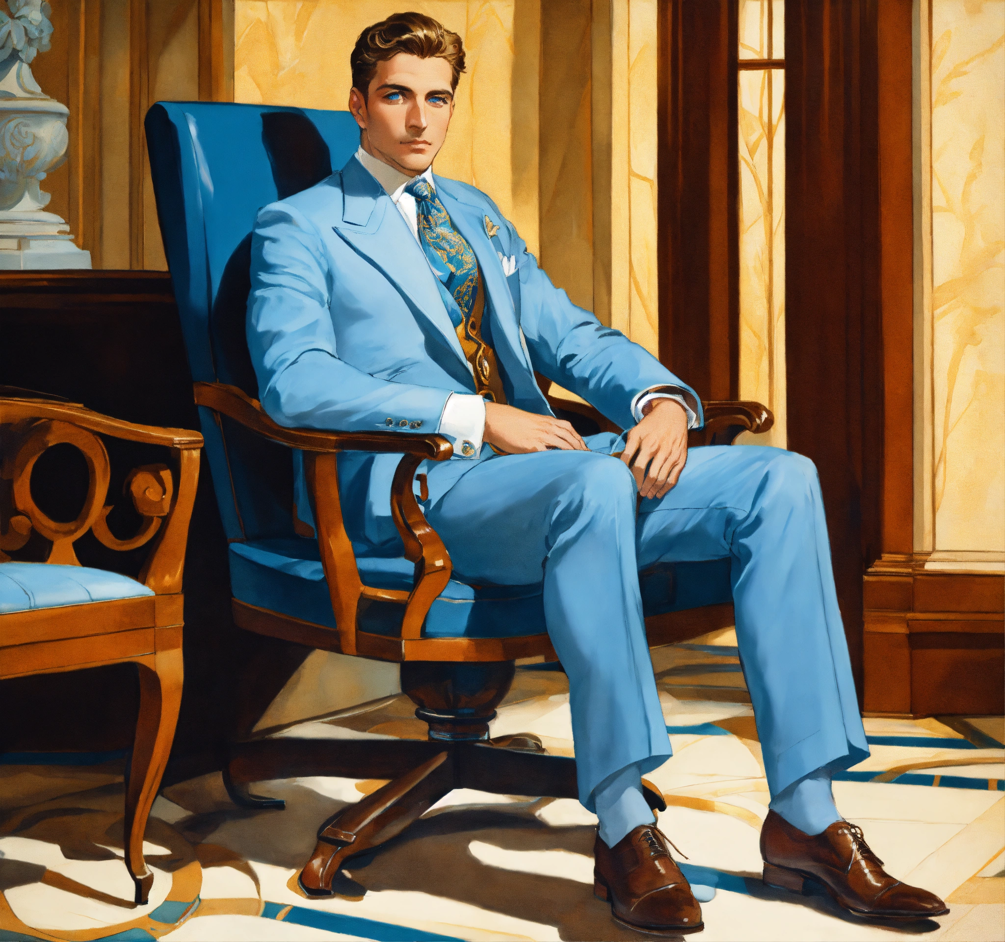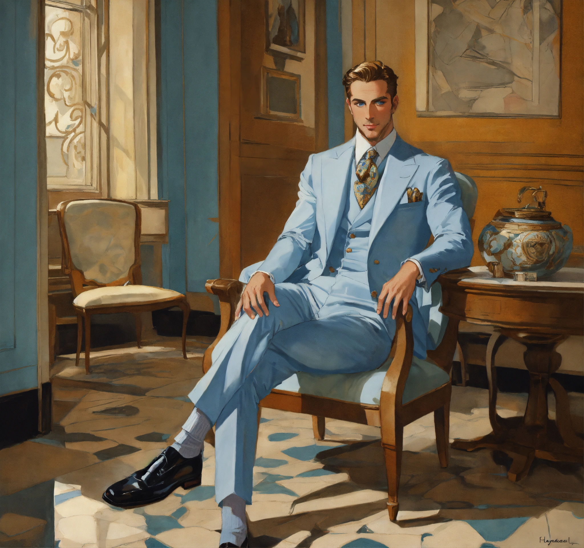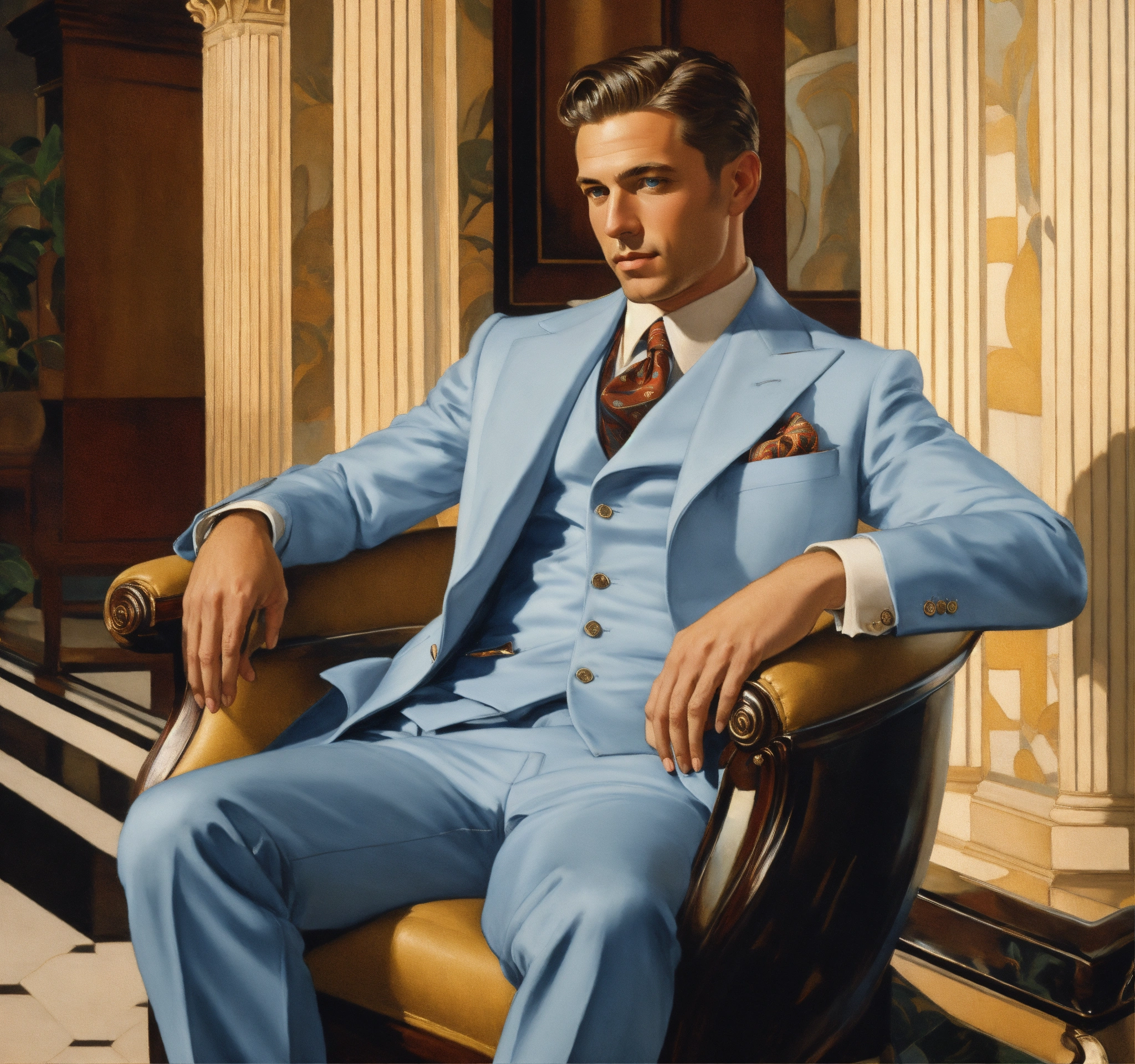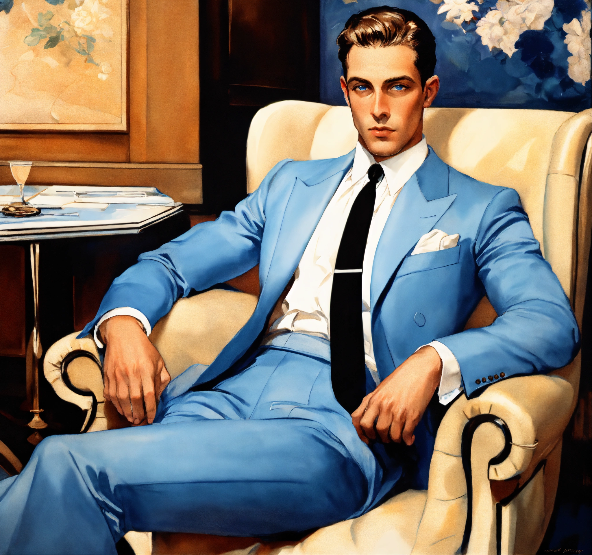An italian businessman, blue eyes, in pale blue suit, large lapels, club tie, brushed hair, stretching legs in a chair in a lobby, leyendecker style