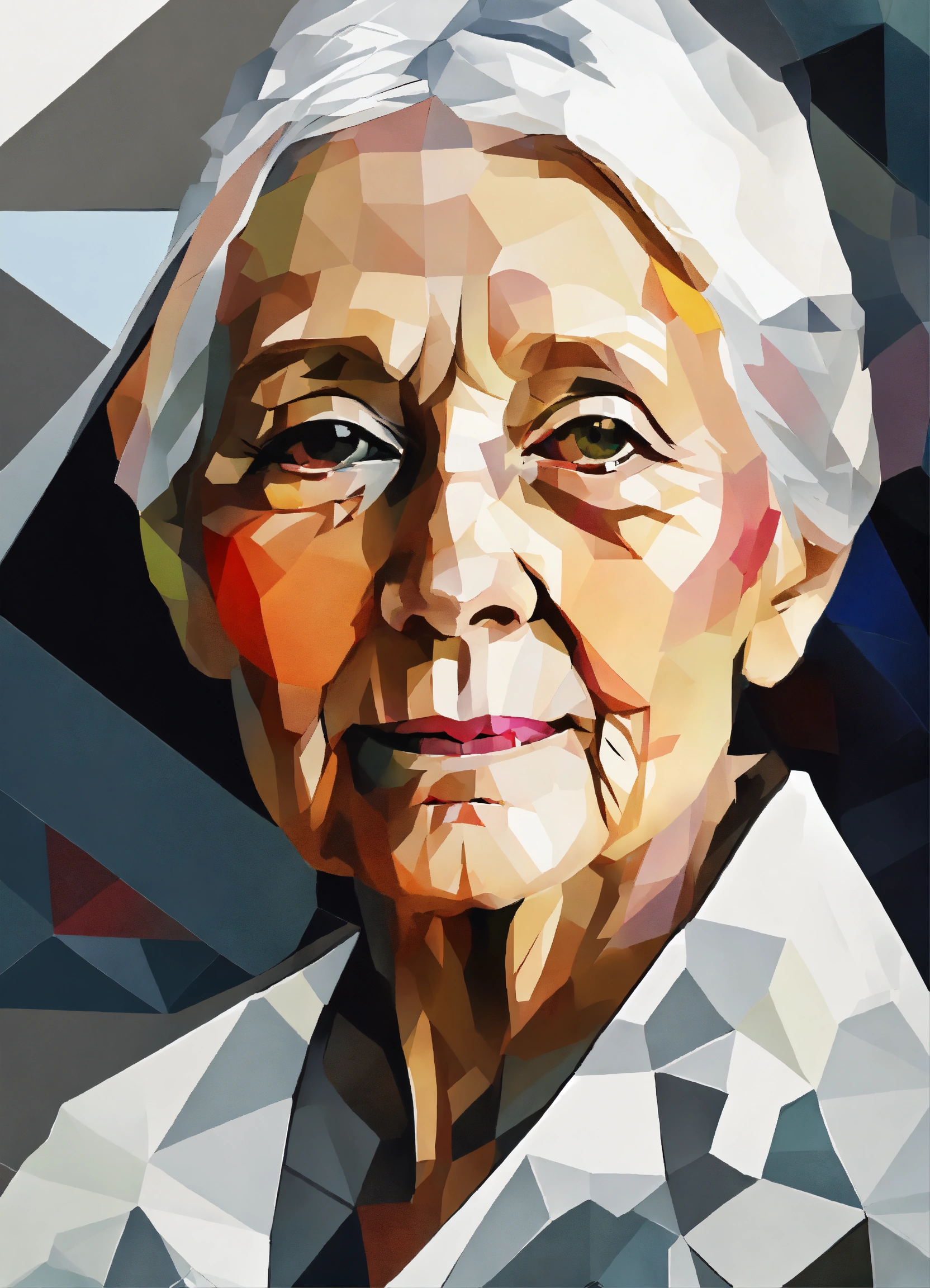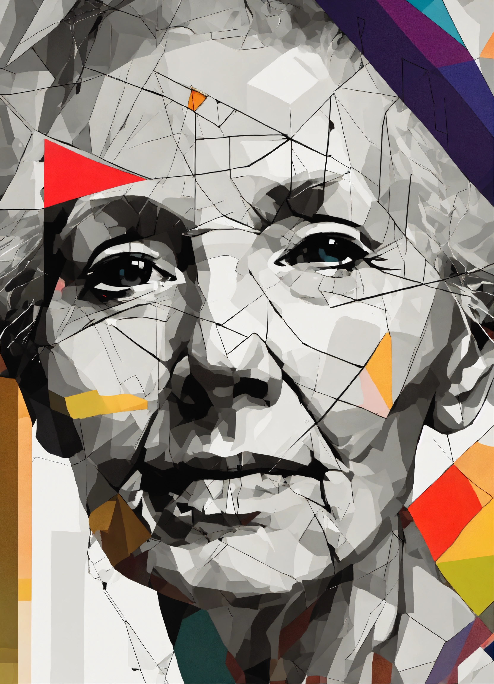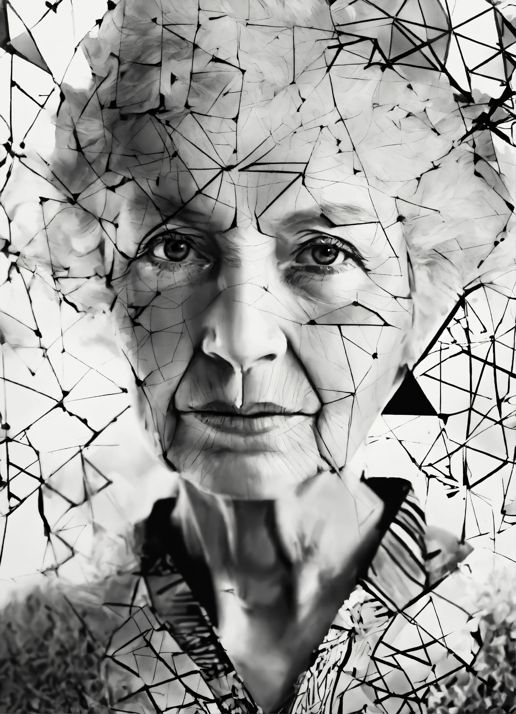 Face of a calm elderly woman, abstraction from geometric figures, black and white, elements colour #b000ea, white background